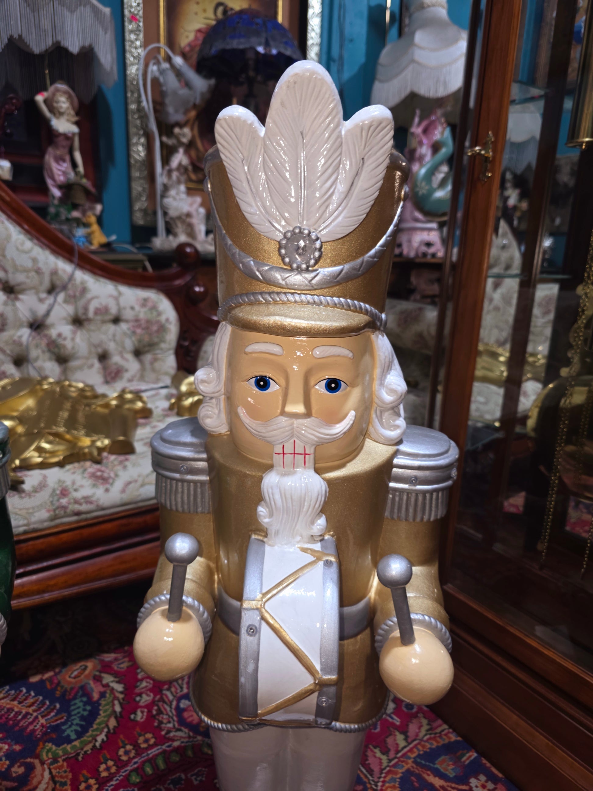 • The white and gold nutcracker wears an ivory outfit with gold and silver details, accompanied by a golden hat with feathers and a silver jewel.