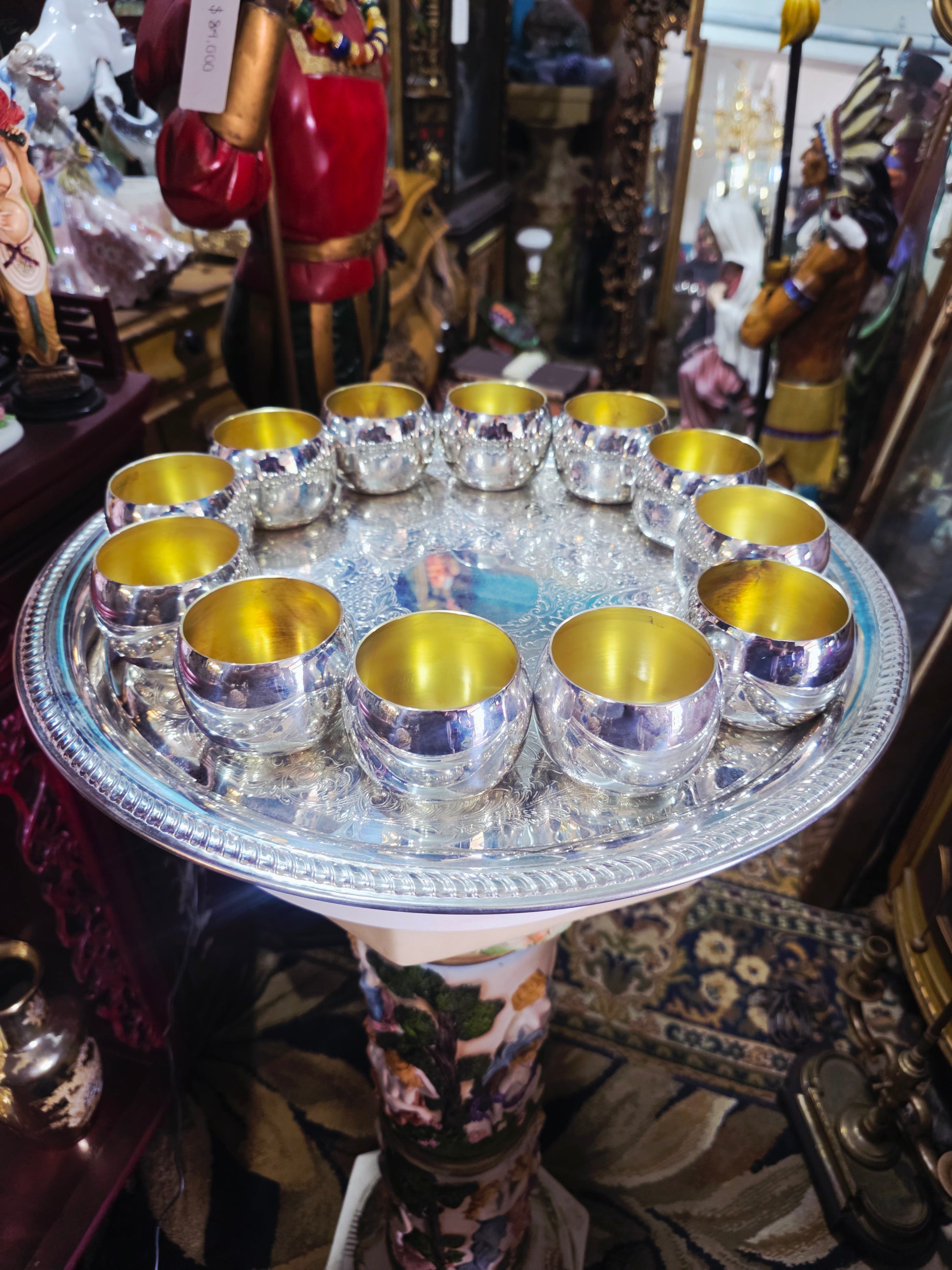 • 12 Vasos (Cups): Exterior plateado con interior dorado, cada uno con ancho 8 cm, altura 6 cm, profundidad 8 cm.