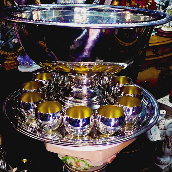 • Pinchera (Punch Bowl): Plata brillante con detalles ornamentales, diámetro 44 cm, altura 27 cm.