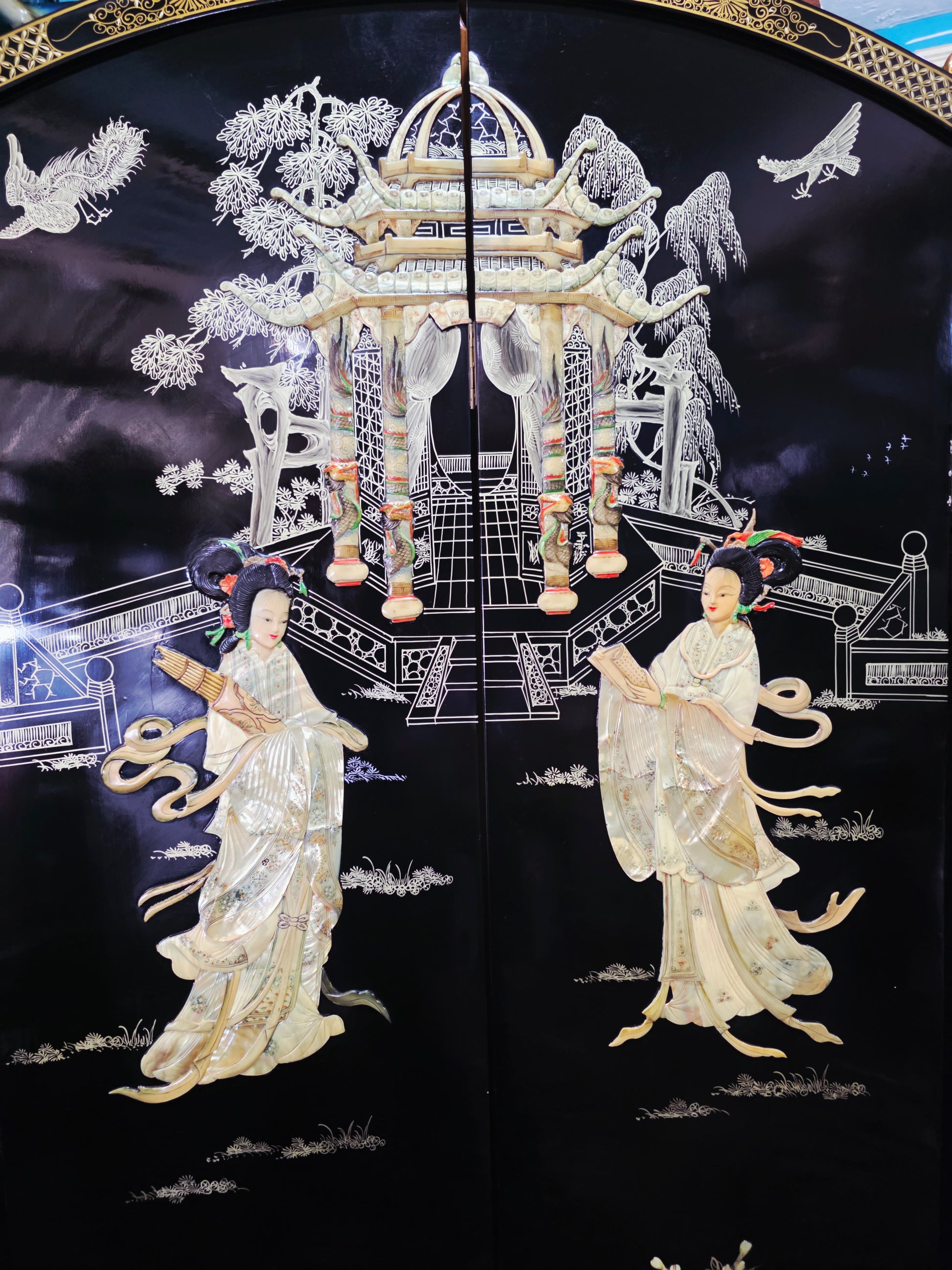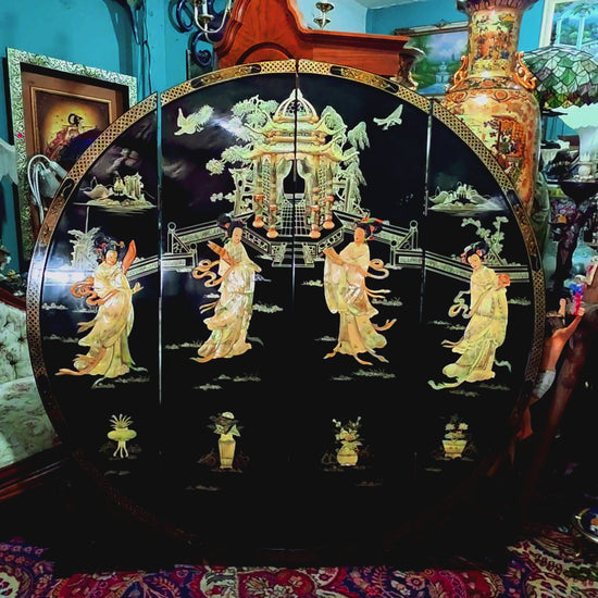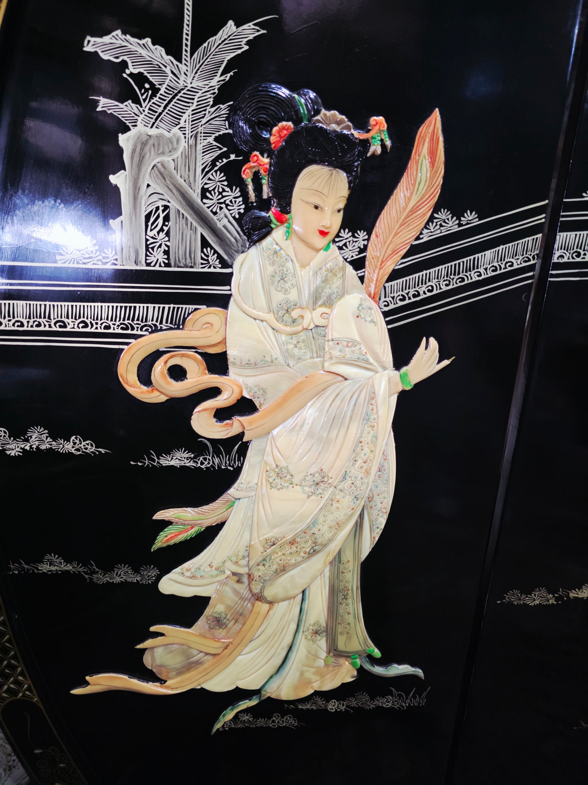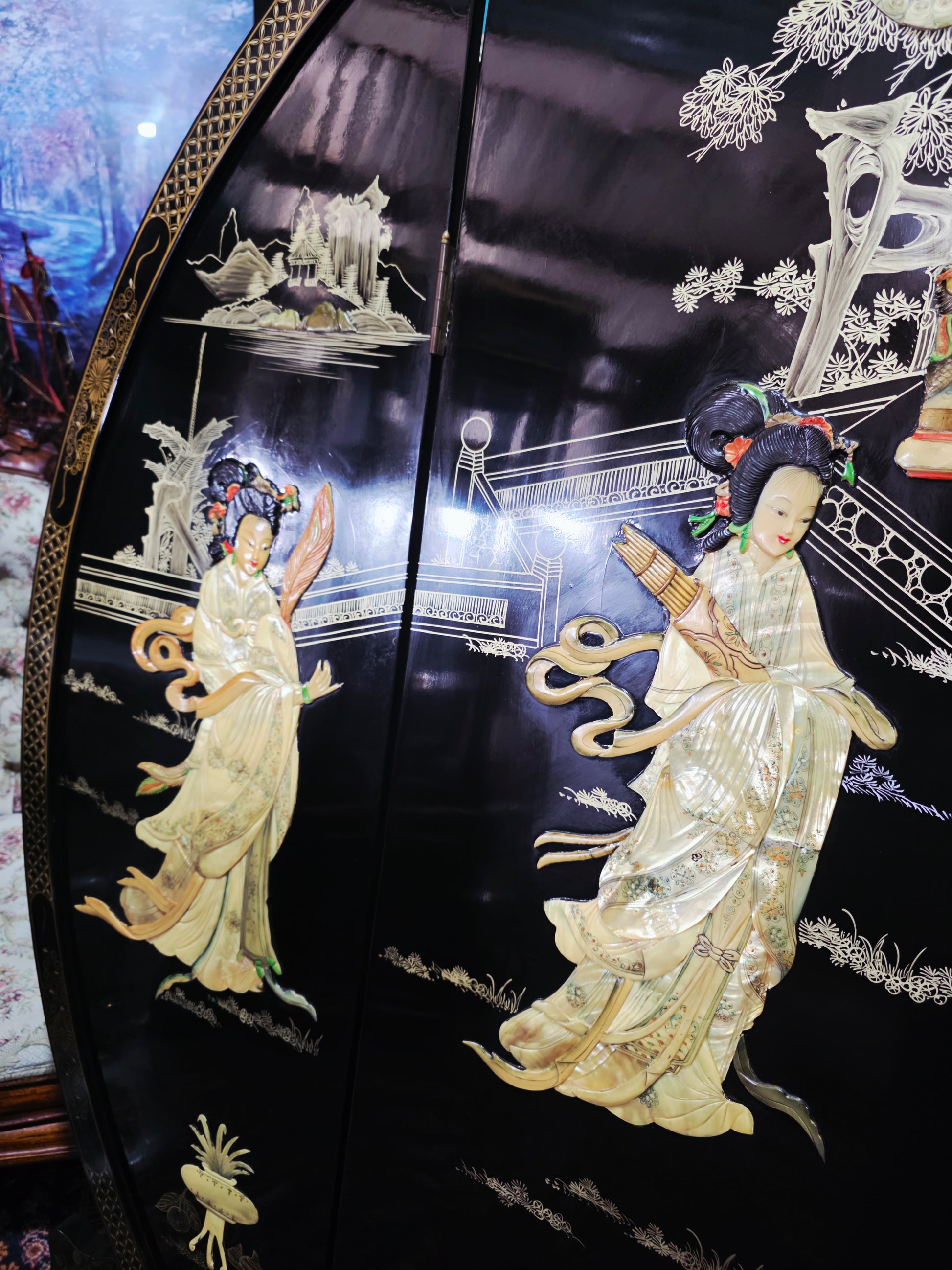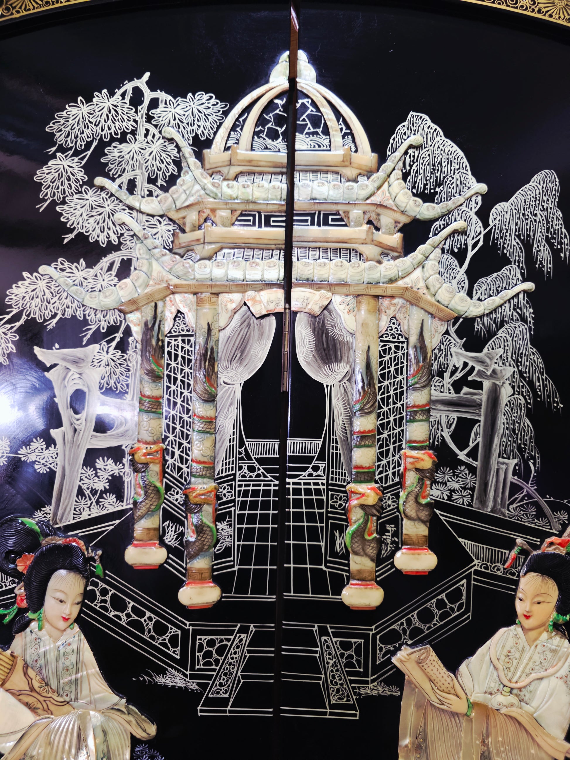 👉 Unique Design: Decorated with a delicate courtyard scene with maidens carved in mother-of-pearl "Mother of Pearl", each panel reflects meticulous attention to detail and traditional oriental beauty. 🌿 Harmony according to Feng Shui: Its unique round shape promotes balance and harmony, making it an ideal decorative element in any environment. 🎨 Hand-Painted Designs: On the back, there is a beautiful hand-painted bamboo design in golden tones, which adds a sophisticated and natural touch to its versatility.