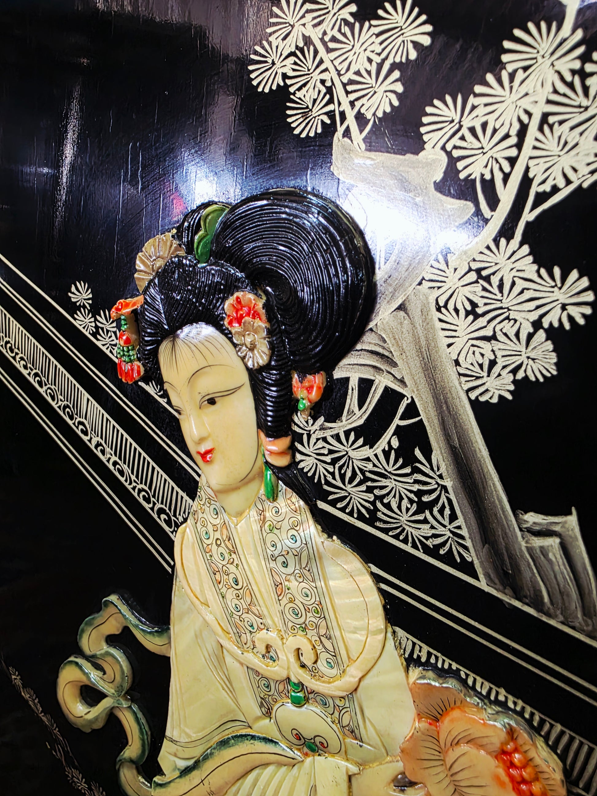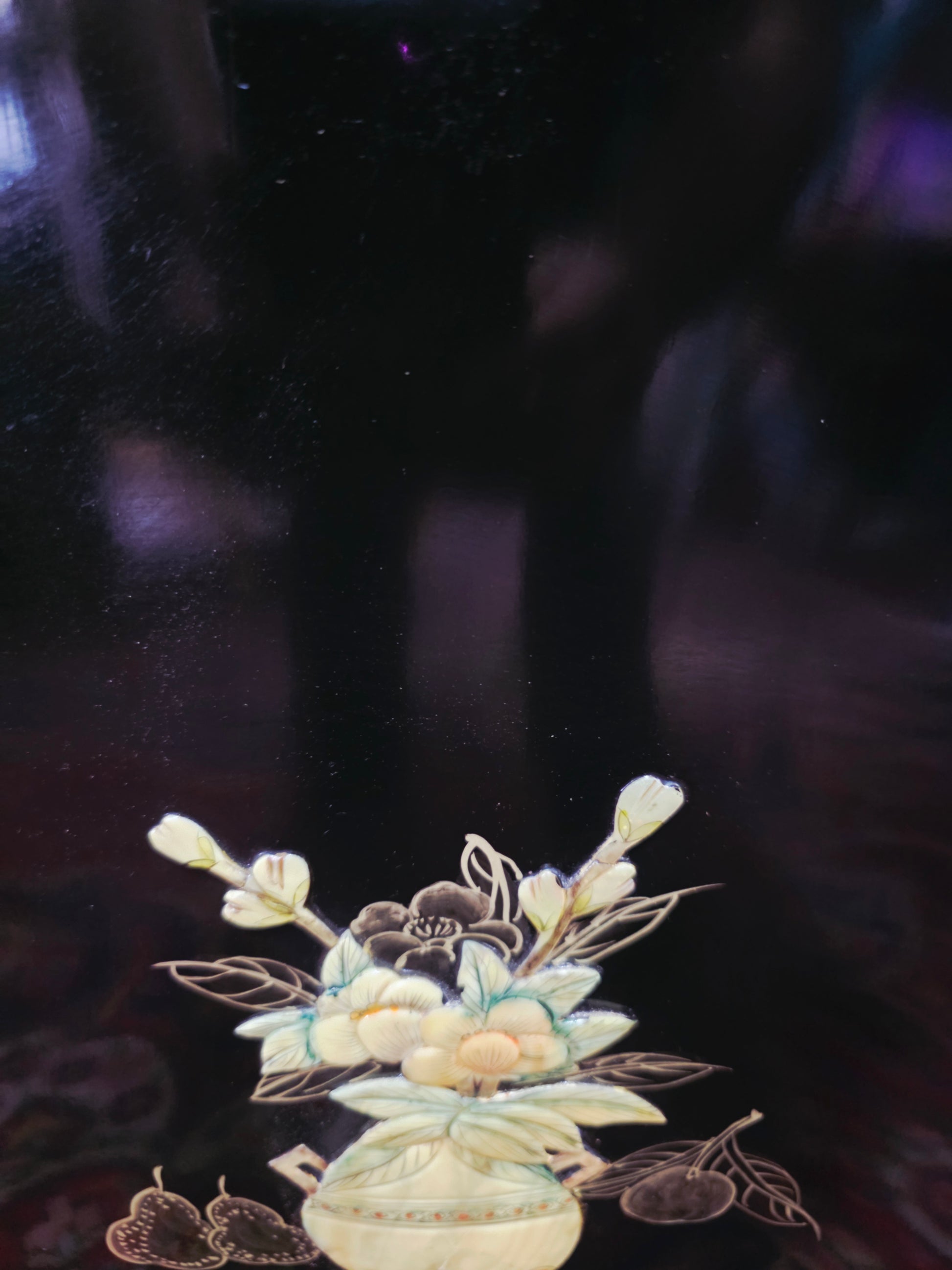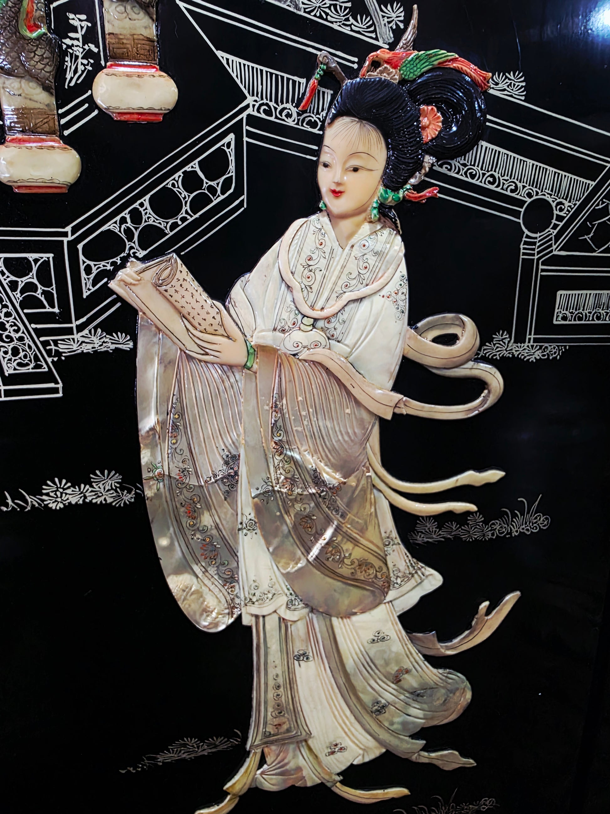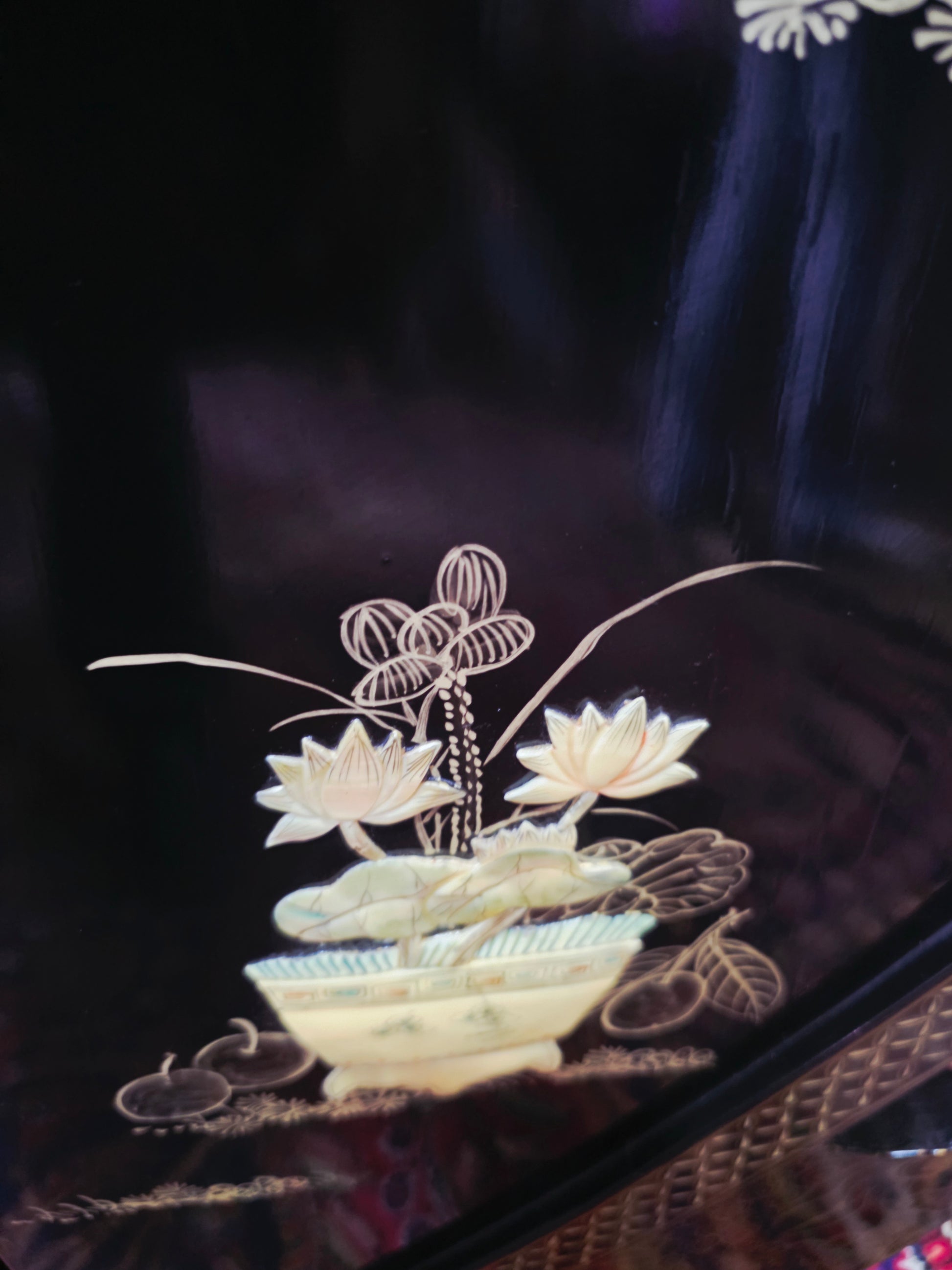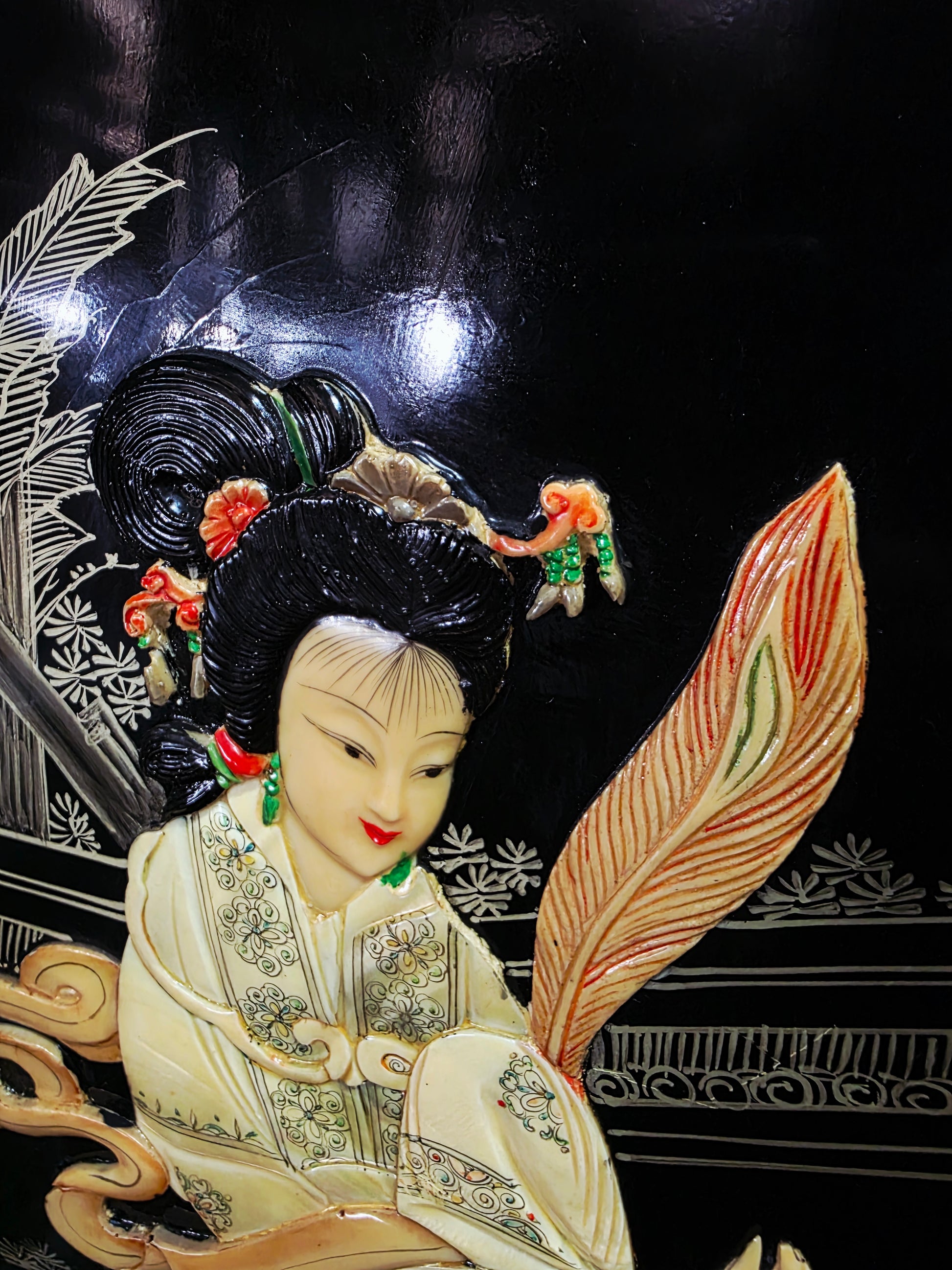 👉 Unique Design: Decorated with a delicate courtyard scene with maidens carved in mother-of-pearl "Mother of Pearl", each panel reflects meticulous attention to detail and traditional oriental beauty. 🌿 Harmony according to Feng Shui: Its unique round shape promotes balance and harmony, making it an ideal decorative element in any environment. 🎨 Hand-Painted Designs: On the back, there is a beautiful hand-painted bamboo design in golden tones, which adds a sophisticated and natural touch to its versatility.