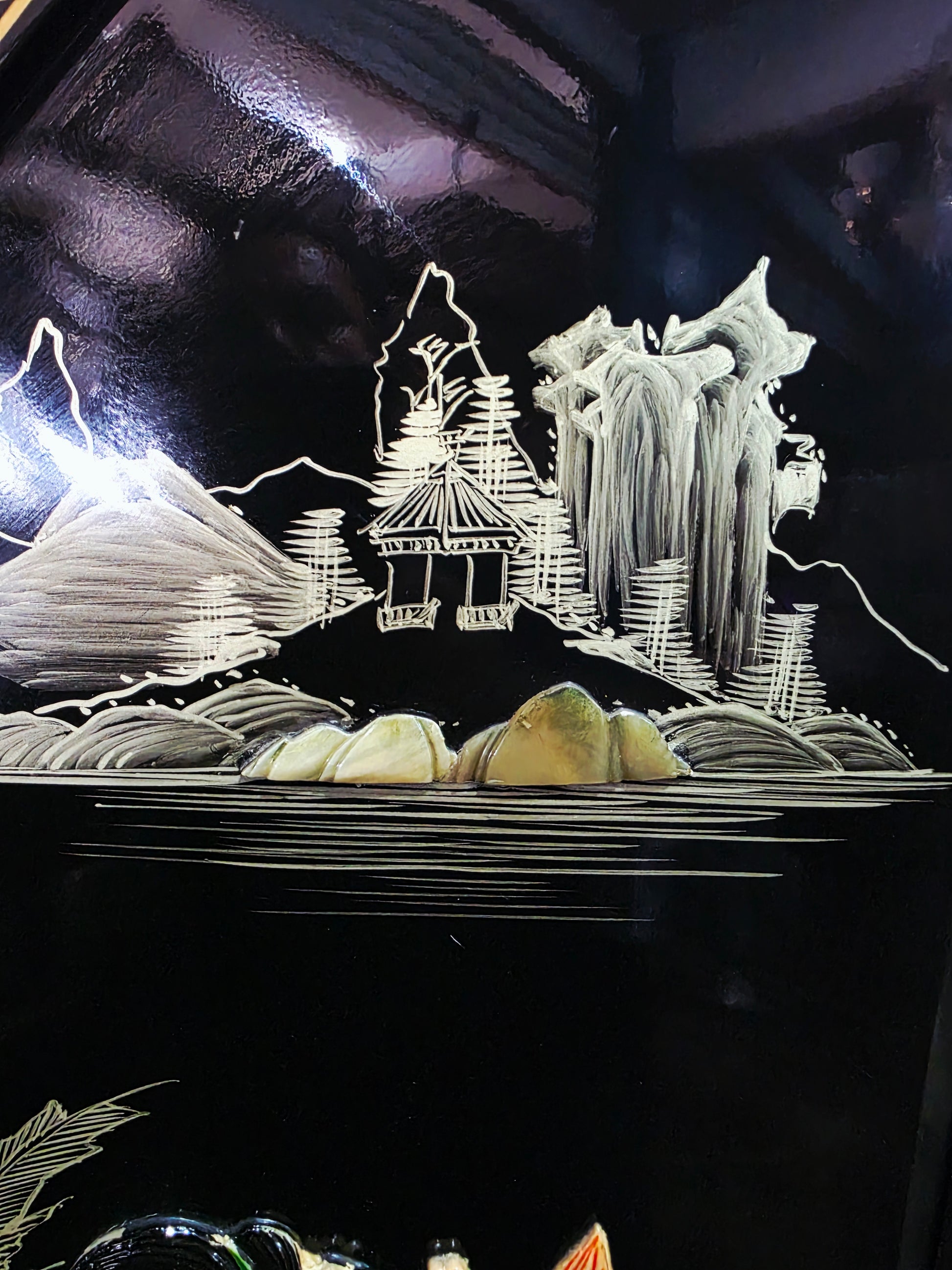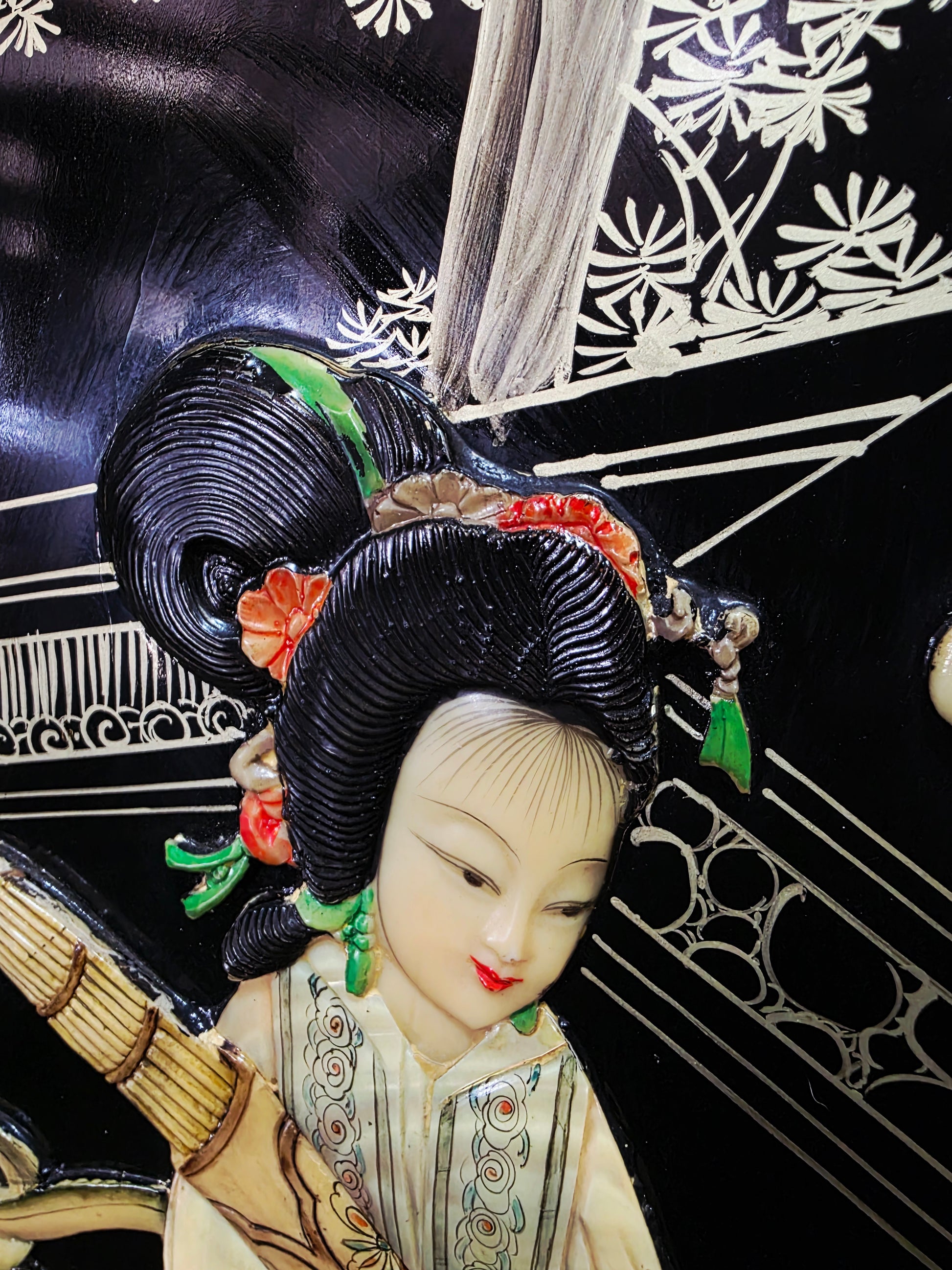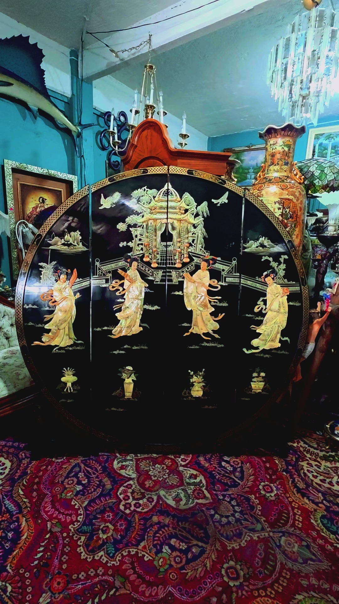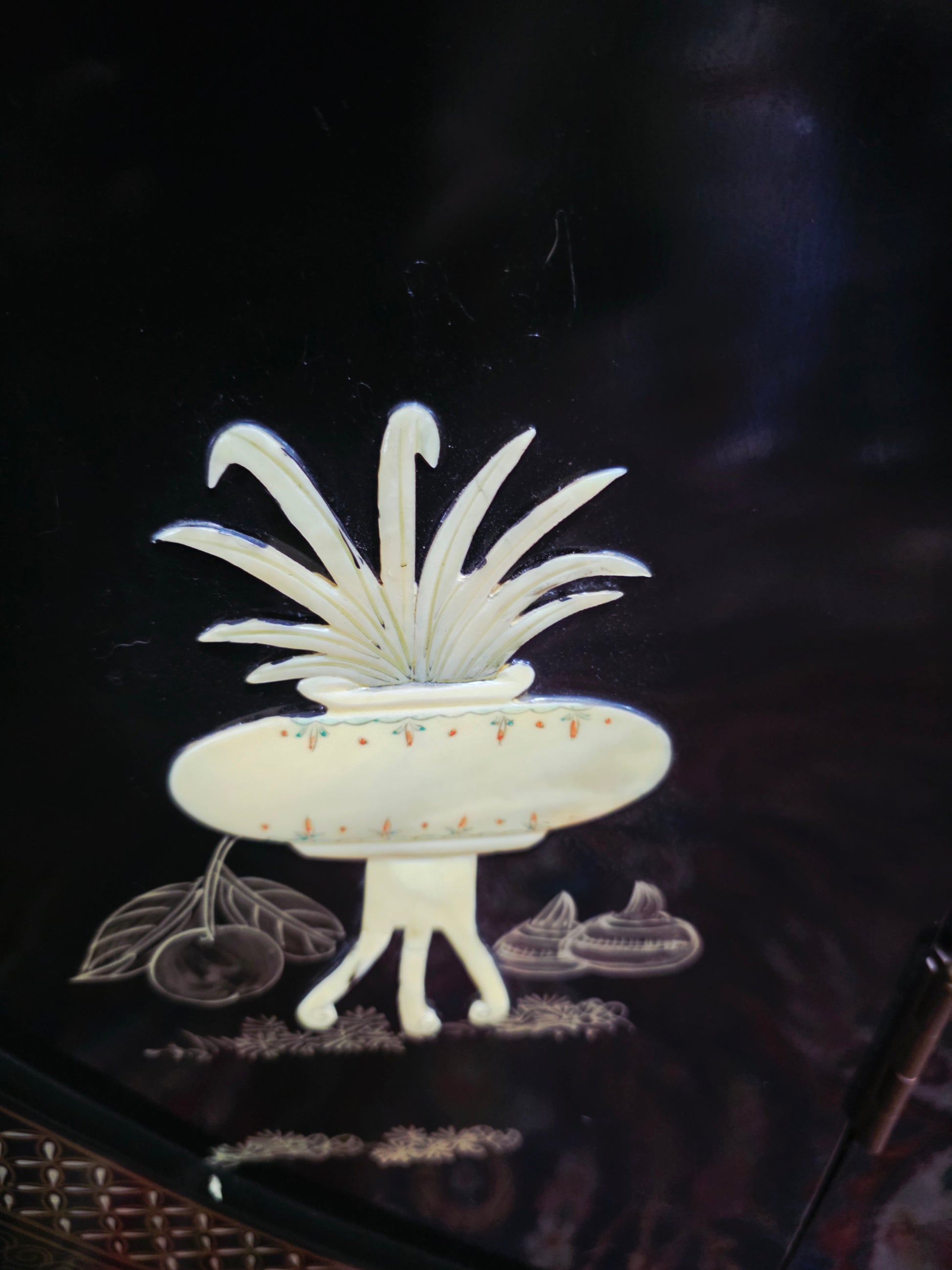 👉 Unique Design: Decorated with a delicate courtyard scene with maidens carved in mother-of-pearl "Mother of Pearl", each panel reflects meticulous attention to detail and traditional oriental beauty. 🌿 Harmony according to Feng Shui: Its unique round shape promotes balance and harmony, making it an ideal decorative element in any environment. 🎨 Hand-Painted Designs: On the back, there is a beautiful hand-painted bamboo design in golden tones, which adds a sophisticated and natural touch to its versatility.