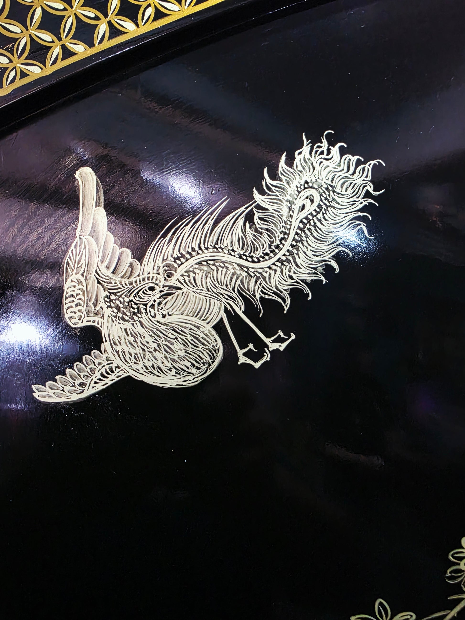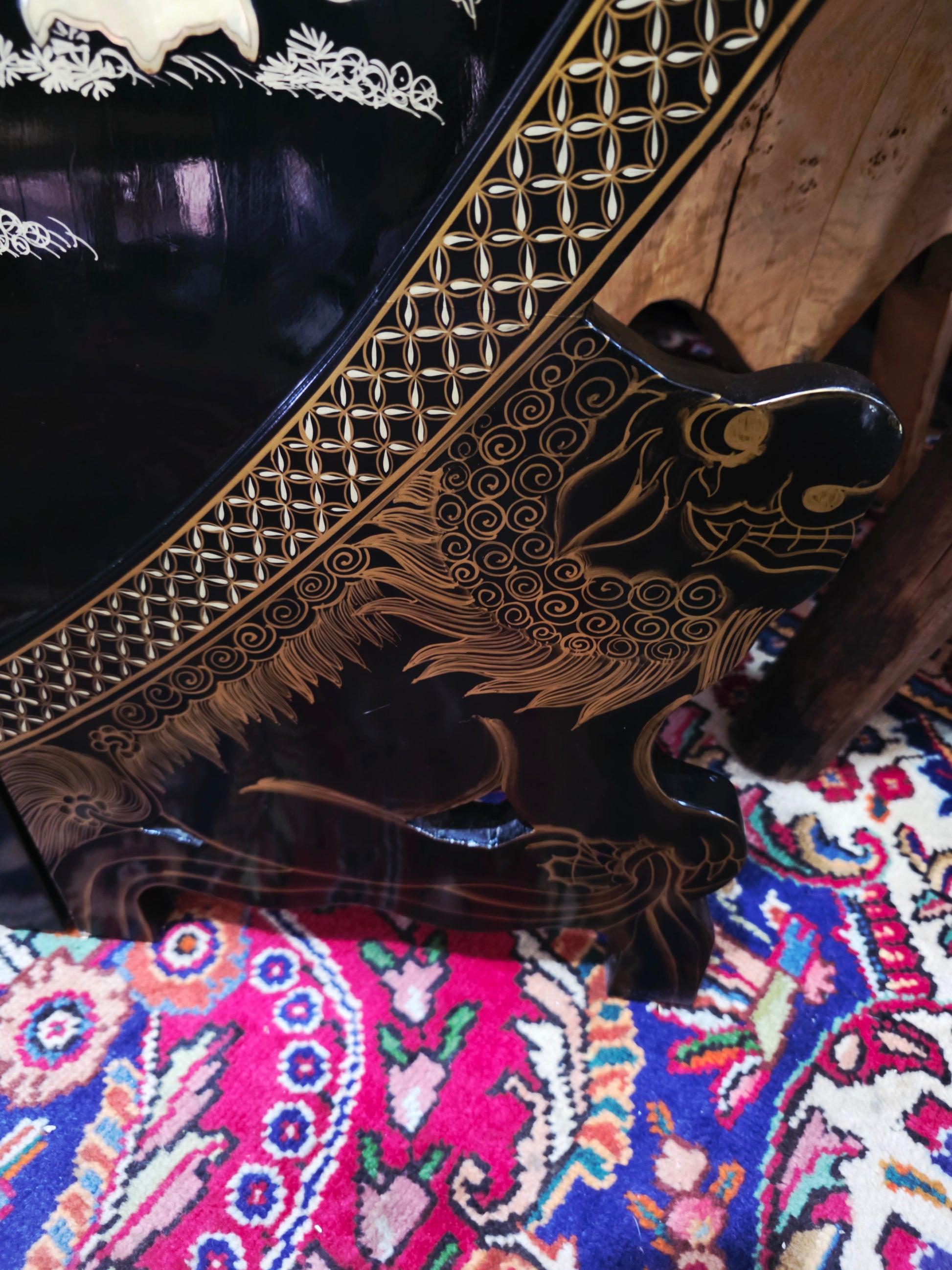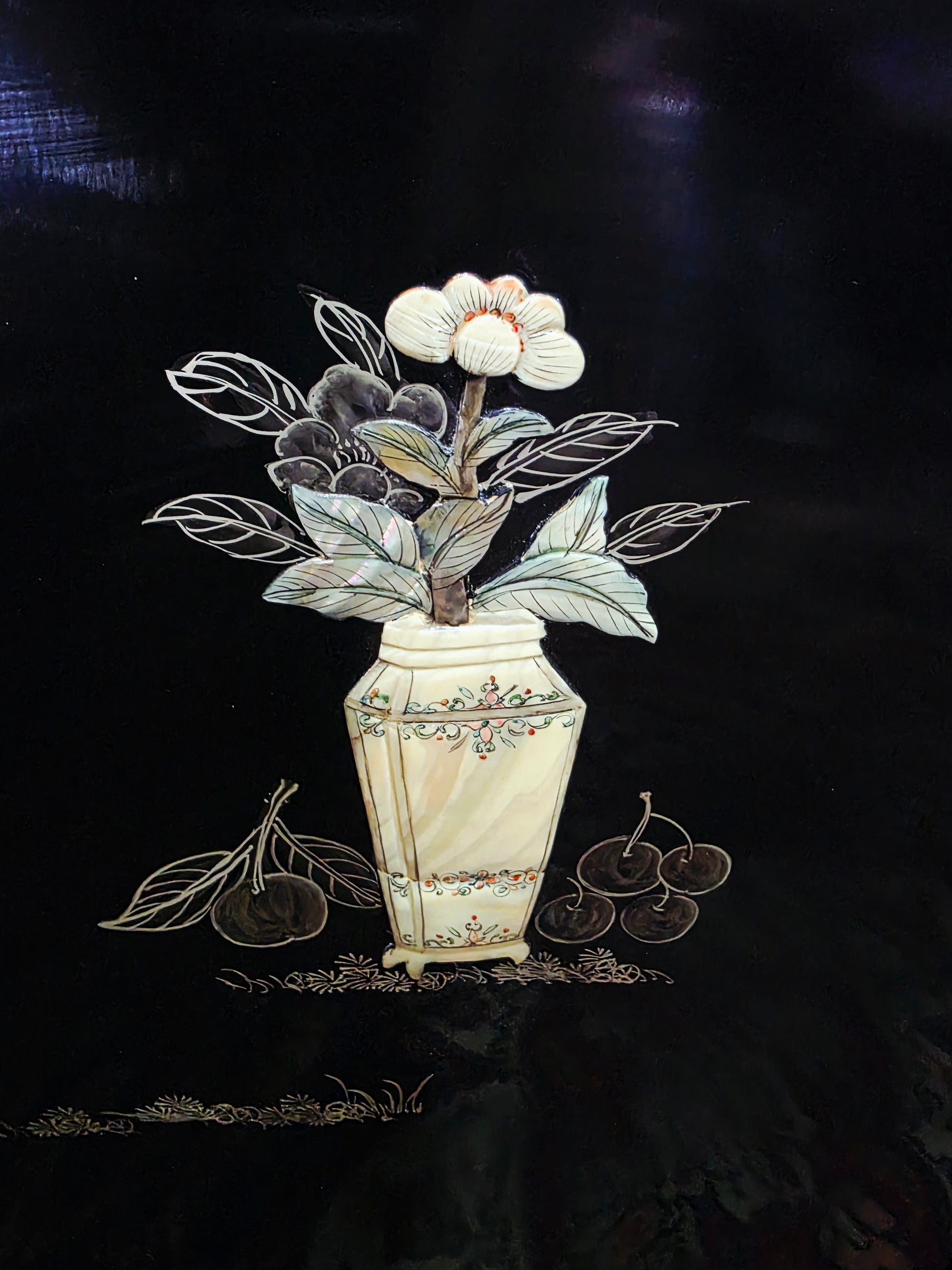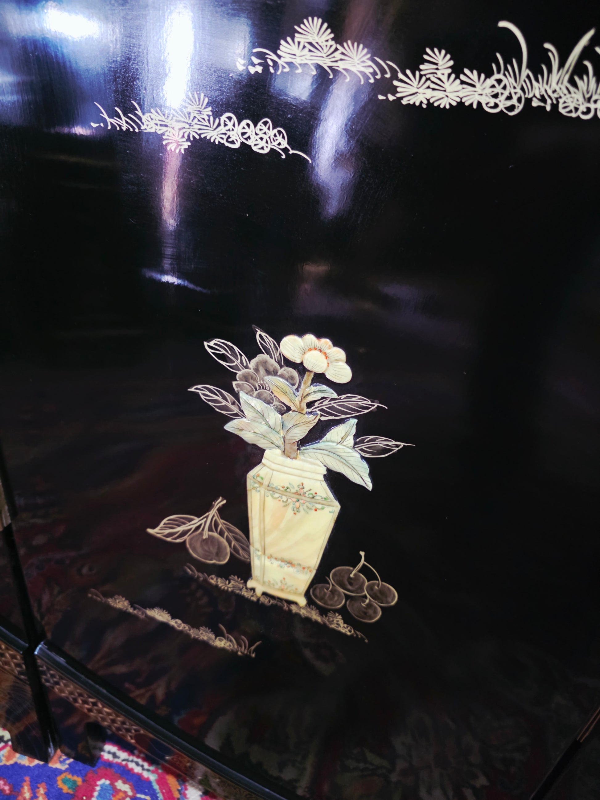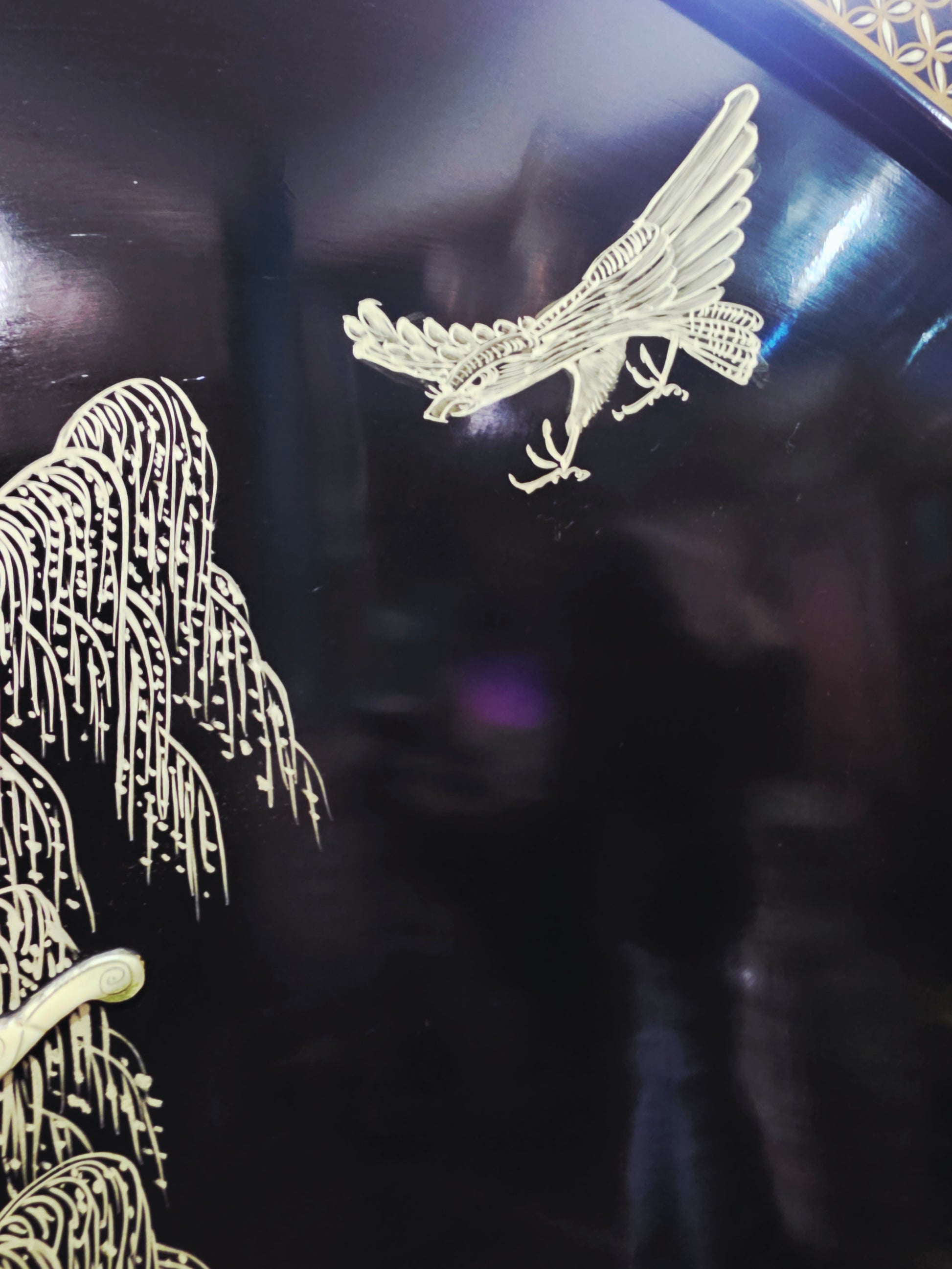 👉 Unique Design: Decorated with a delicate courtyard scene with maidens carved in mother-of-pearl "Mother of Pearl", each panel reflects meticulous attention to detail and traditional oriental beauty. 🌿 Harmony according to Feng Shui: Its unique round shape promotes balance and harmony, making it an ideal decorative element in any environment. 🎨 Hand-Painted Designs: On the back, there is a beautiful hand-painted bamboo design in golden tones, which adds a sophisticated and natural touch to its versatility.