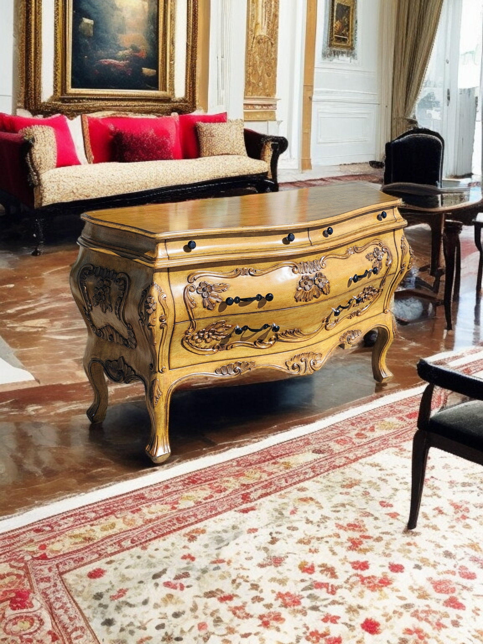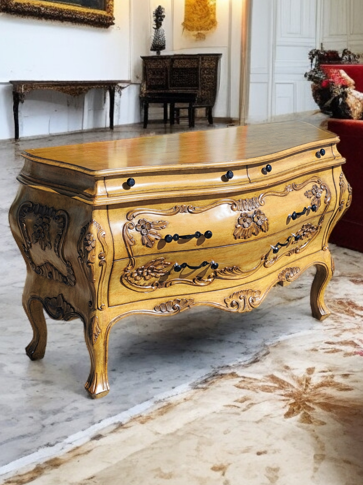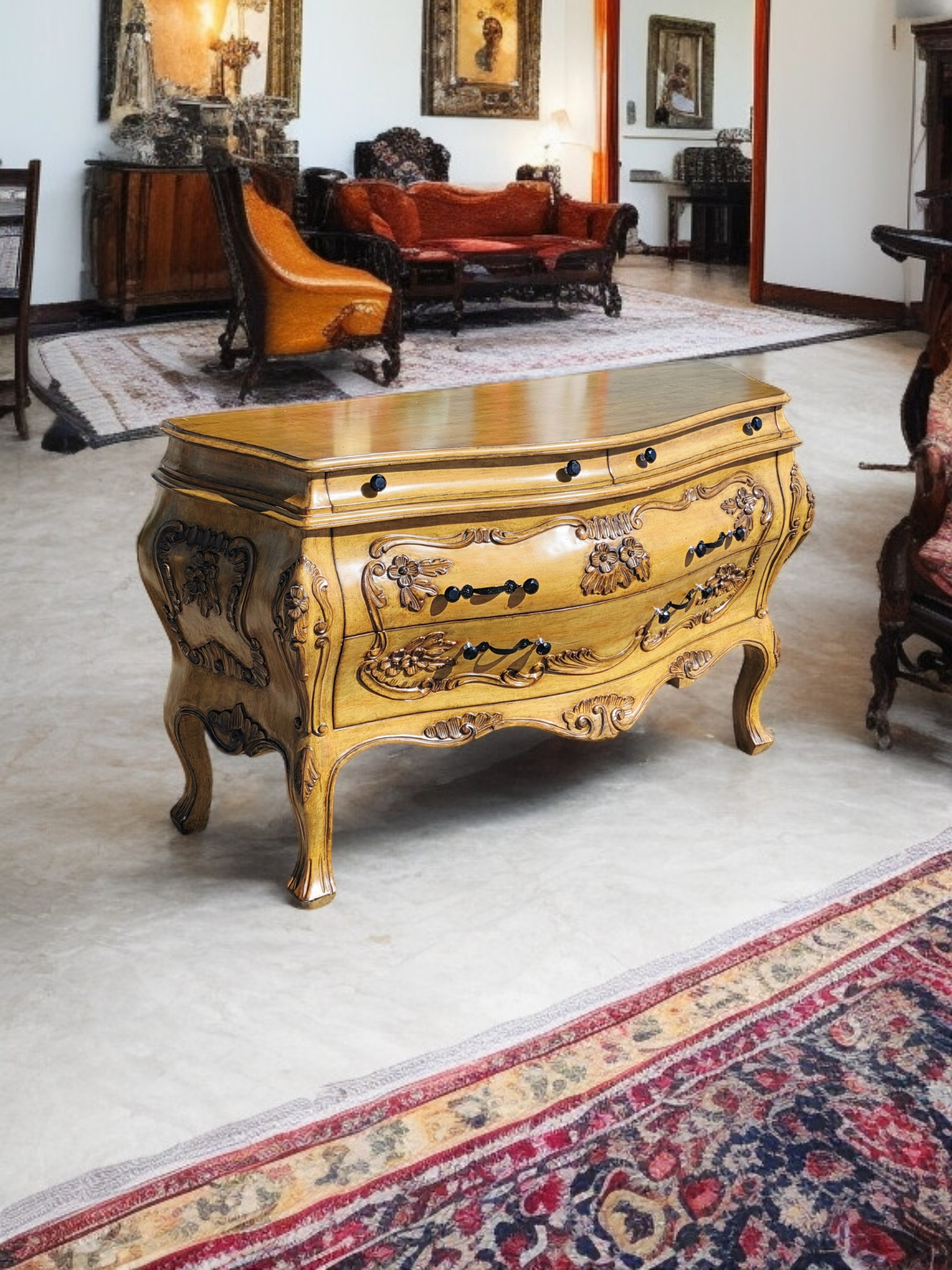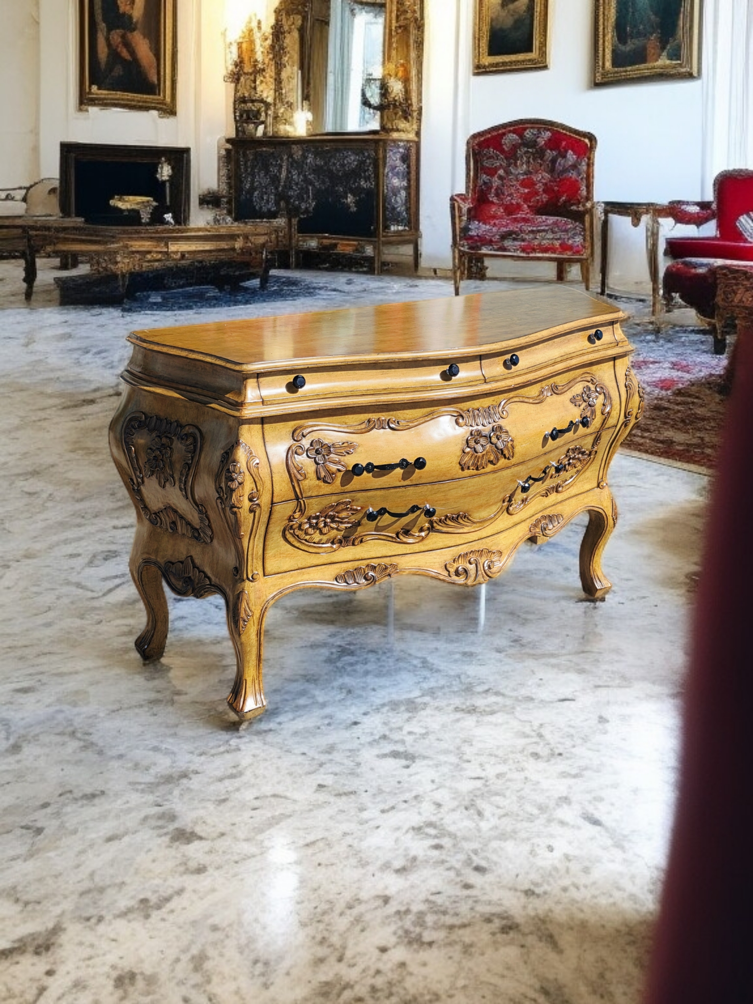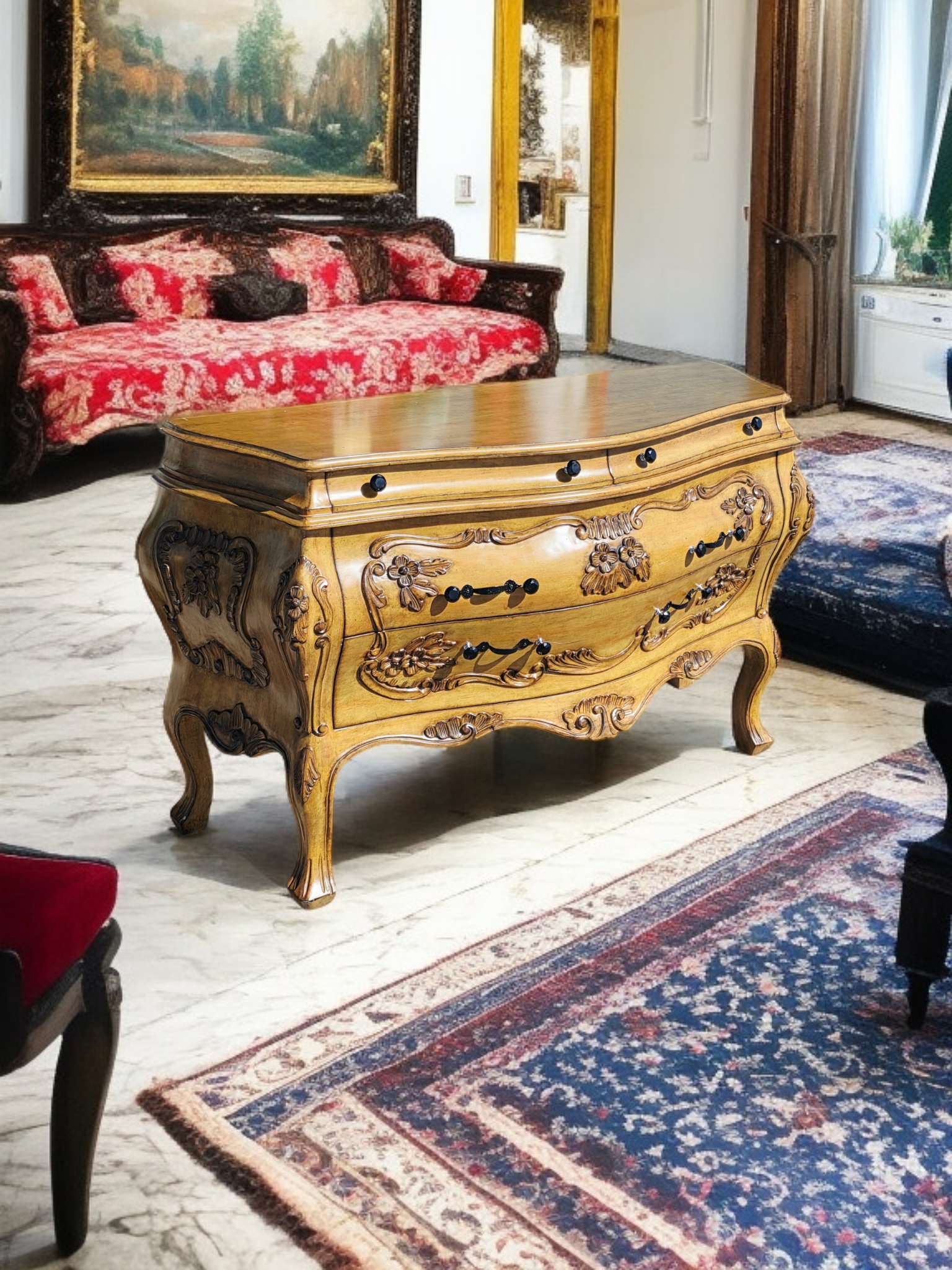 Presentamos este Bombe Italiano de excepcional belleza y presencia escultórica. Tallado en madera maciza y acabado con un pulido cálido que realza sus vetas naturales, esta pieza encarna el esplendor del diseño barroco con una silueta voluptuosa y elegante. Su frente curvo y sus laterales ondulados evocan el movimiento de la danza clásica, mientras que los motivos florales tallados a mano celebran la tradición ornamental italiana con delicadeza y profundidad.