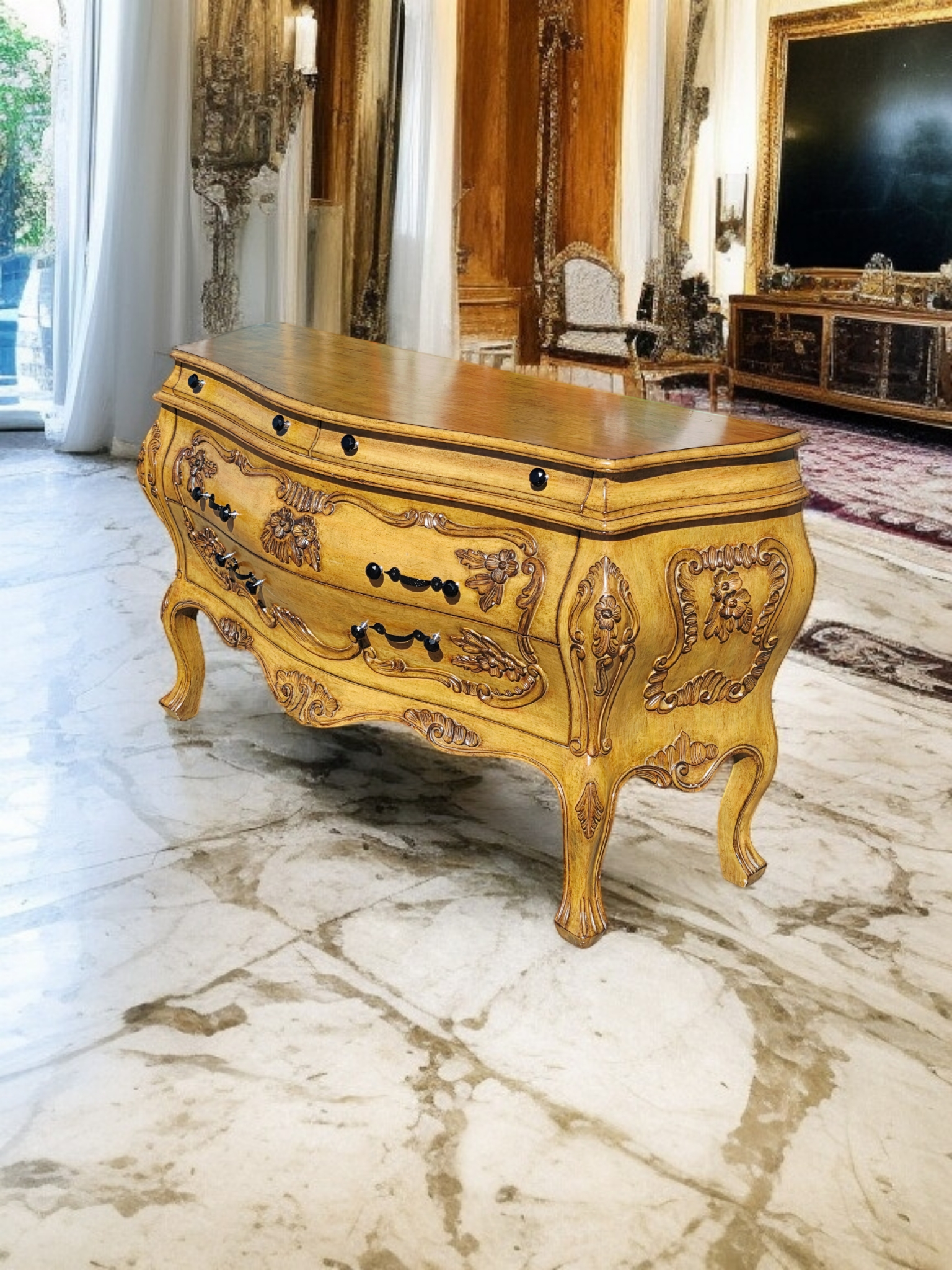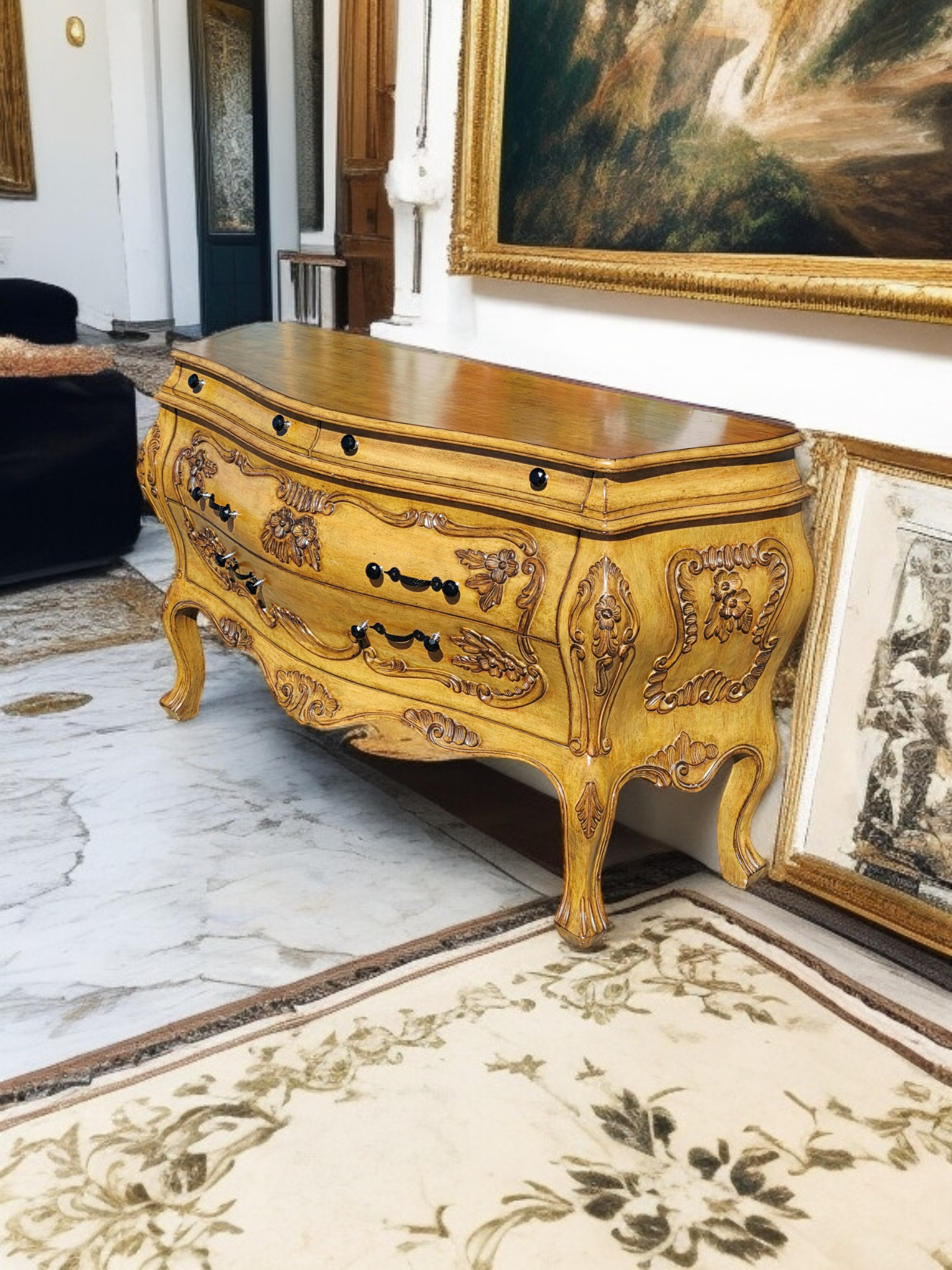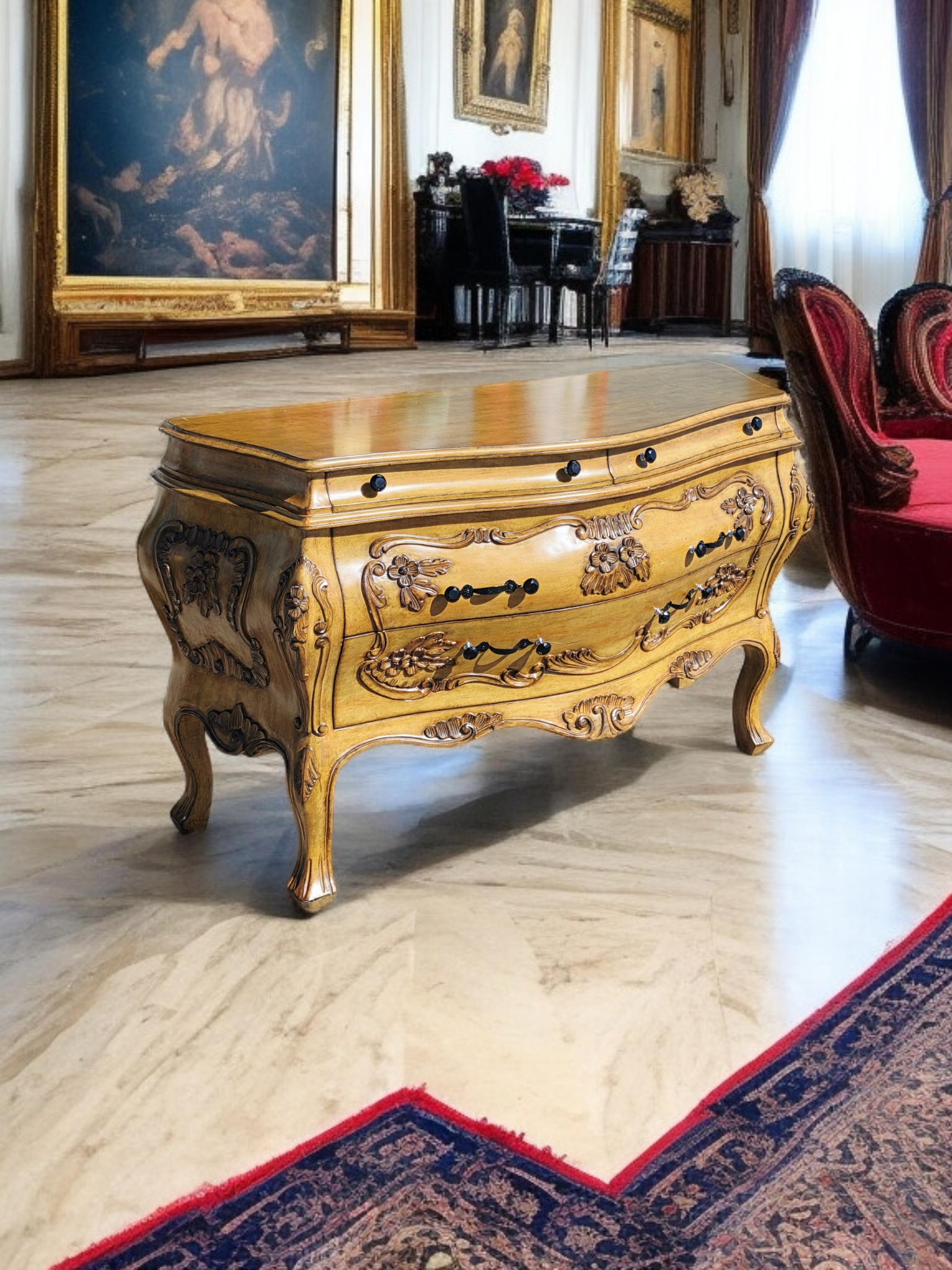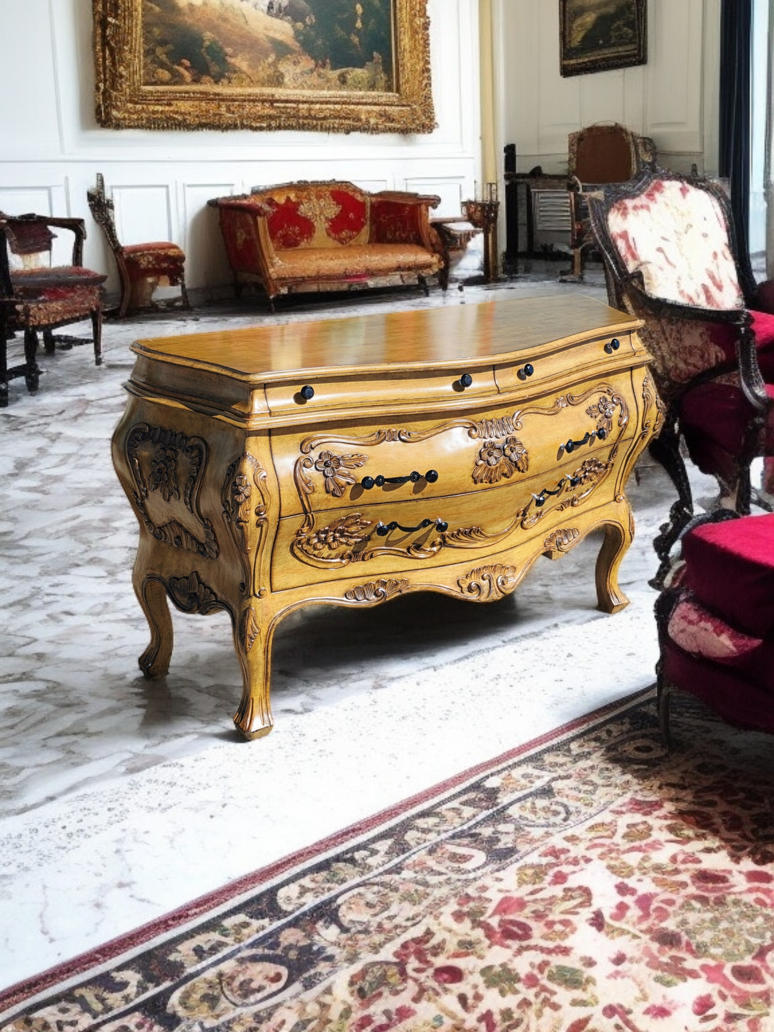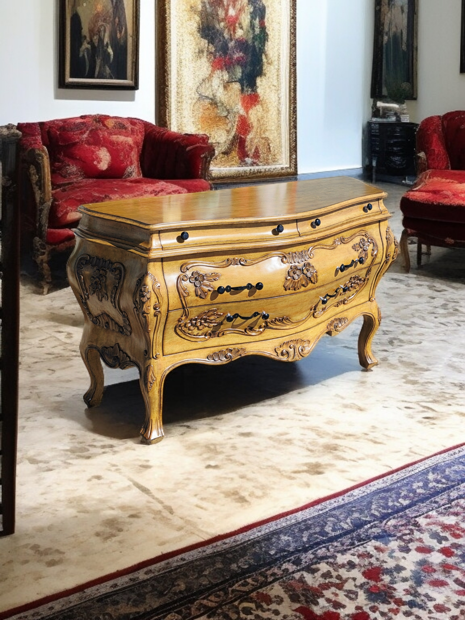 Presentamos este Bombe Italiano de excepcional belleza y presencia escultórica. Tallado en madera maciza y acabado con un pulido cálido que realza sus vetas naturales, esta pieza encarna el esplendor del diseño barroco con una silueta voluptuosa y elegante. Su frente curvo y sus laterales ondulados evocan el movimiento de la danza clásica, mientras que los motivos florales tallados a mano celebran la tradición ornamental italiana con delicadeza y profundidad.
