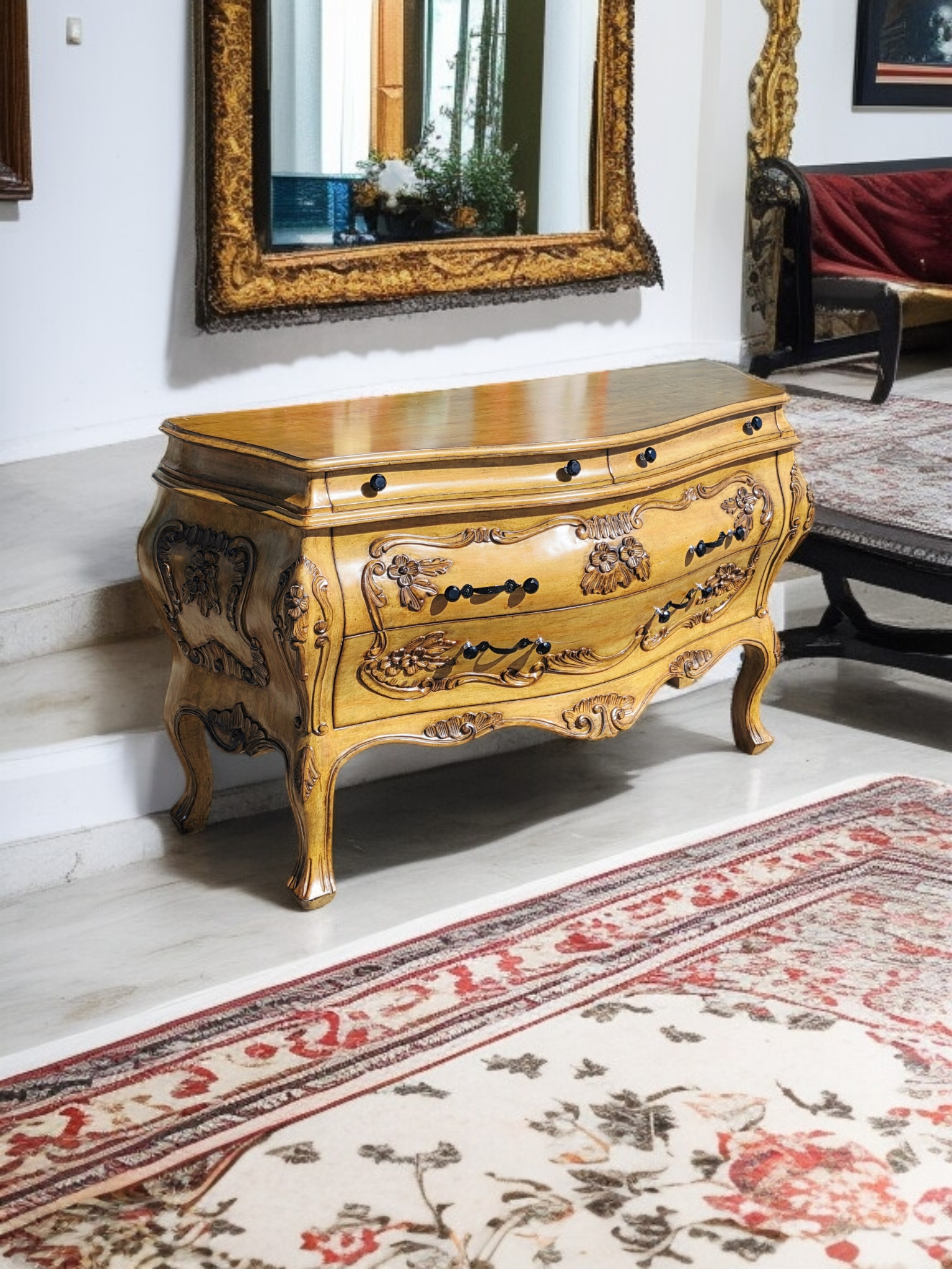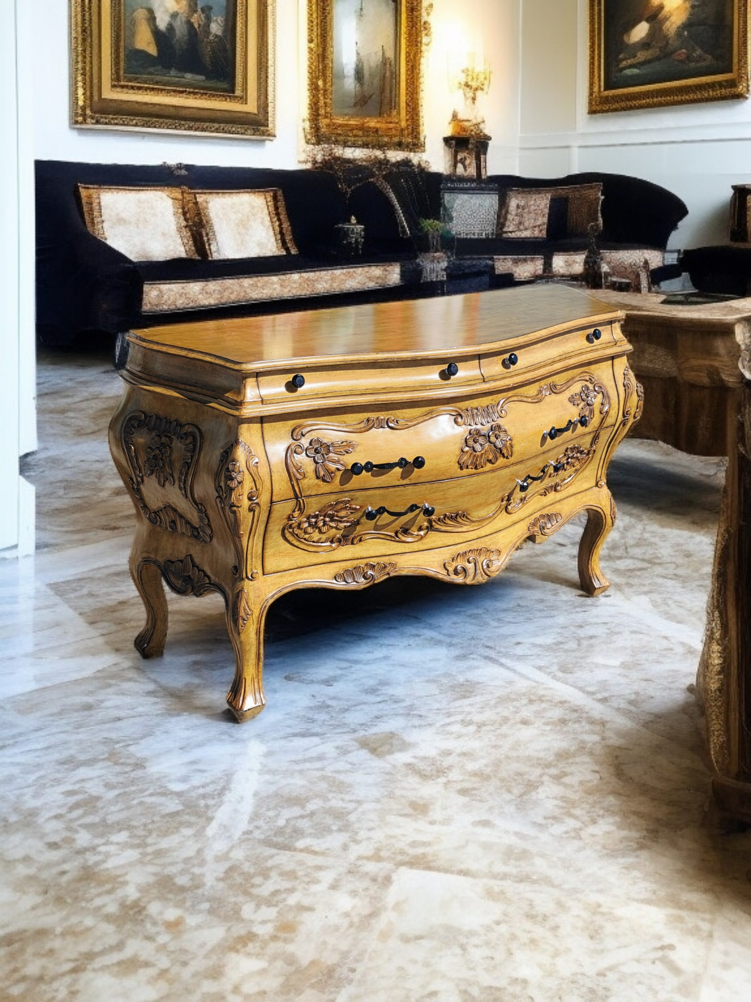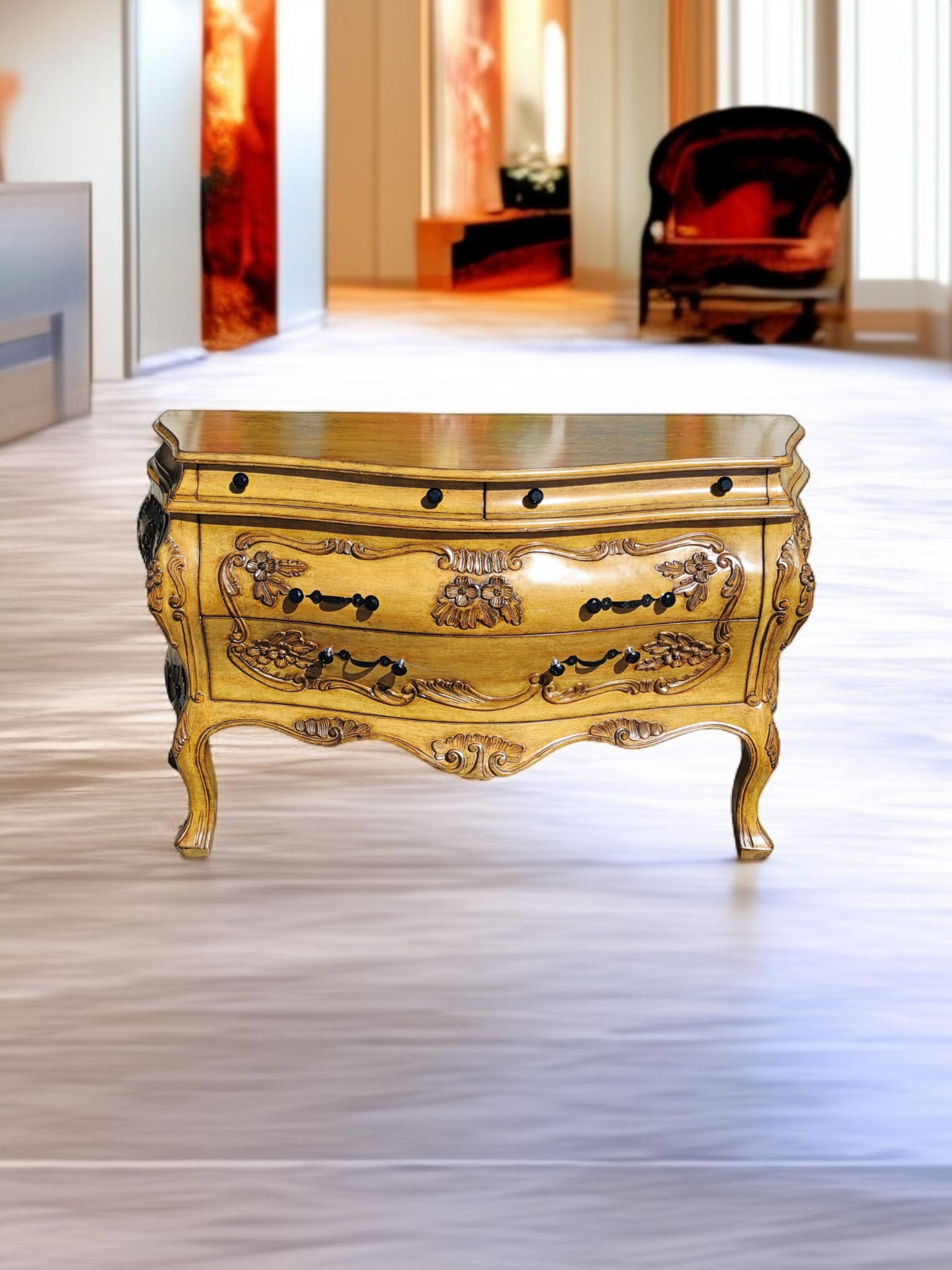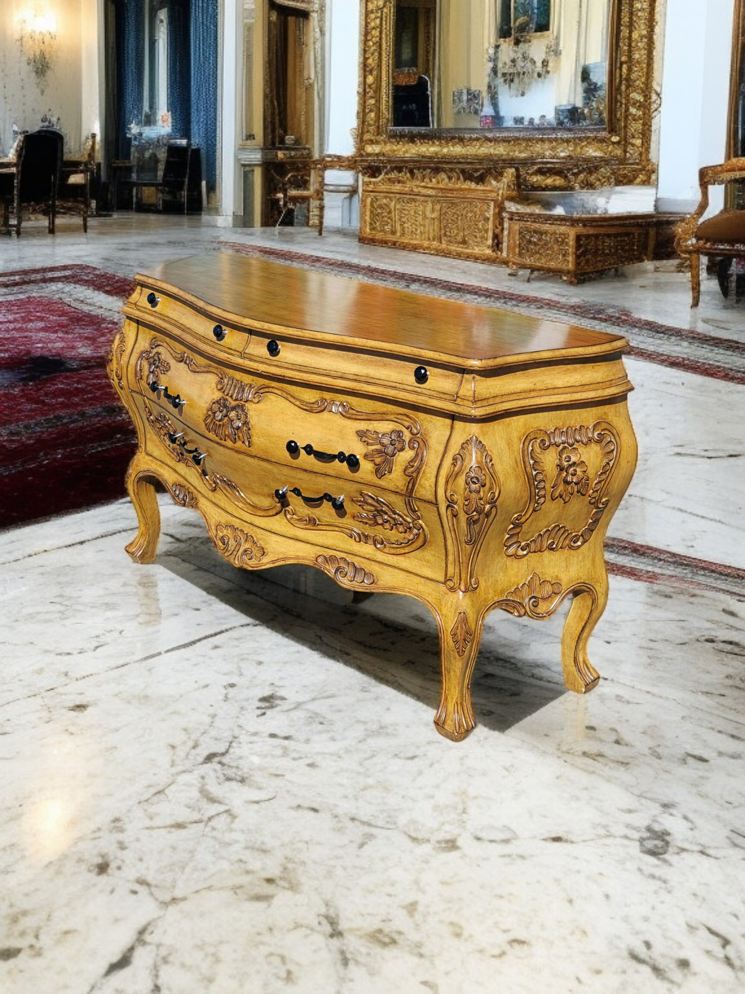 Presentamos este Bombe Italiano de excepcional belleza y presencia escultórica. Tallado en madera maciza y acabado con un pulido cálido que realza sus vetas naturales, esta pieza encarna el esplendor del diseño barroco con una silueta voluptuosa y elegante. Su frente curvo y sus laterales ondulados evocan el movimiento de la danza clásica, mientras que los motivos florales tallados a mano celebran la tradición ornamental italiana con delicadeza y profundidad.