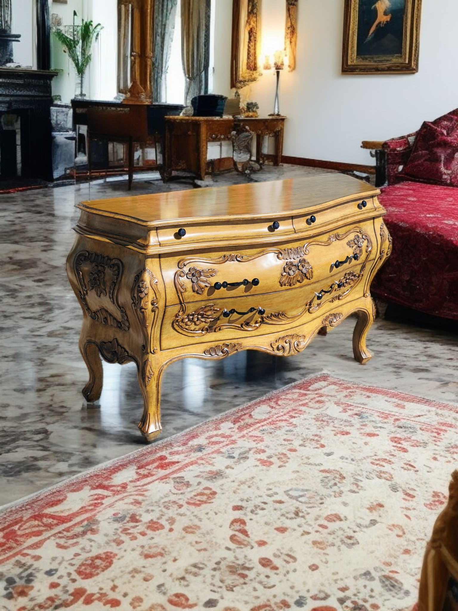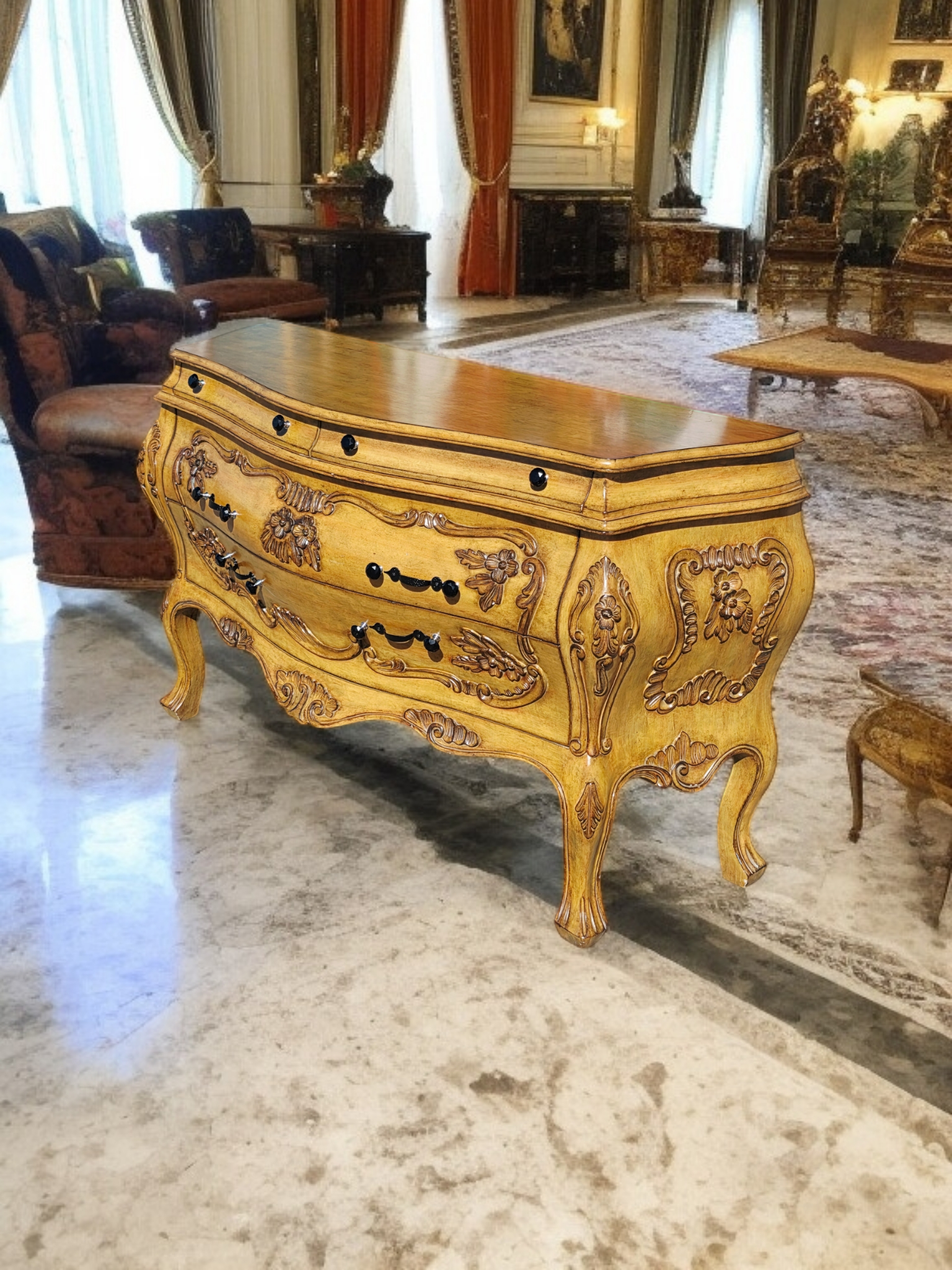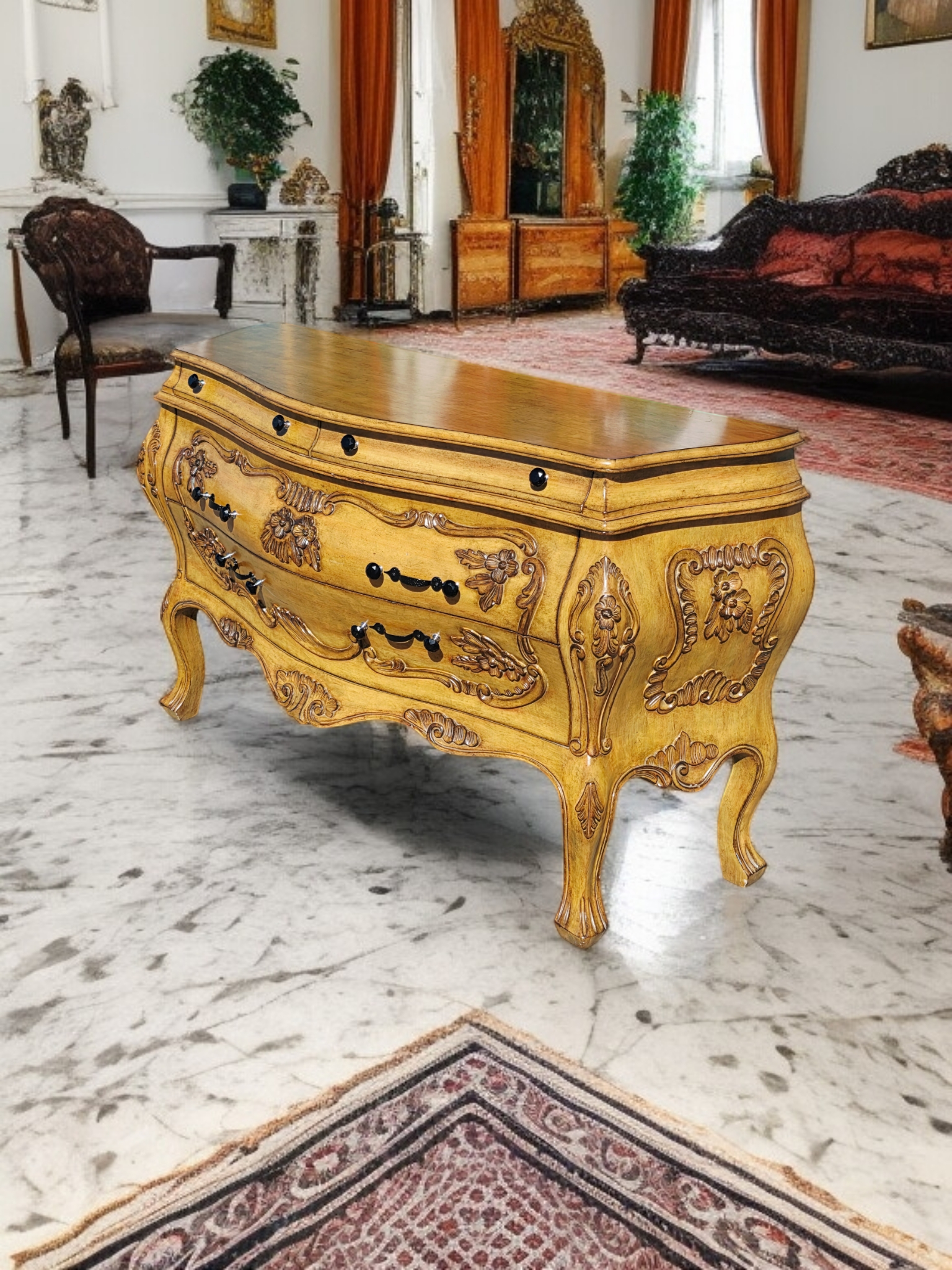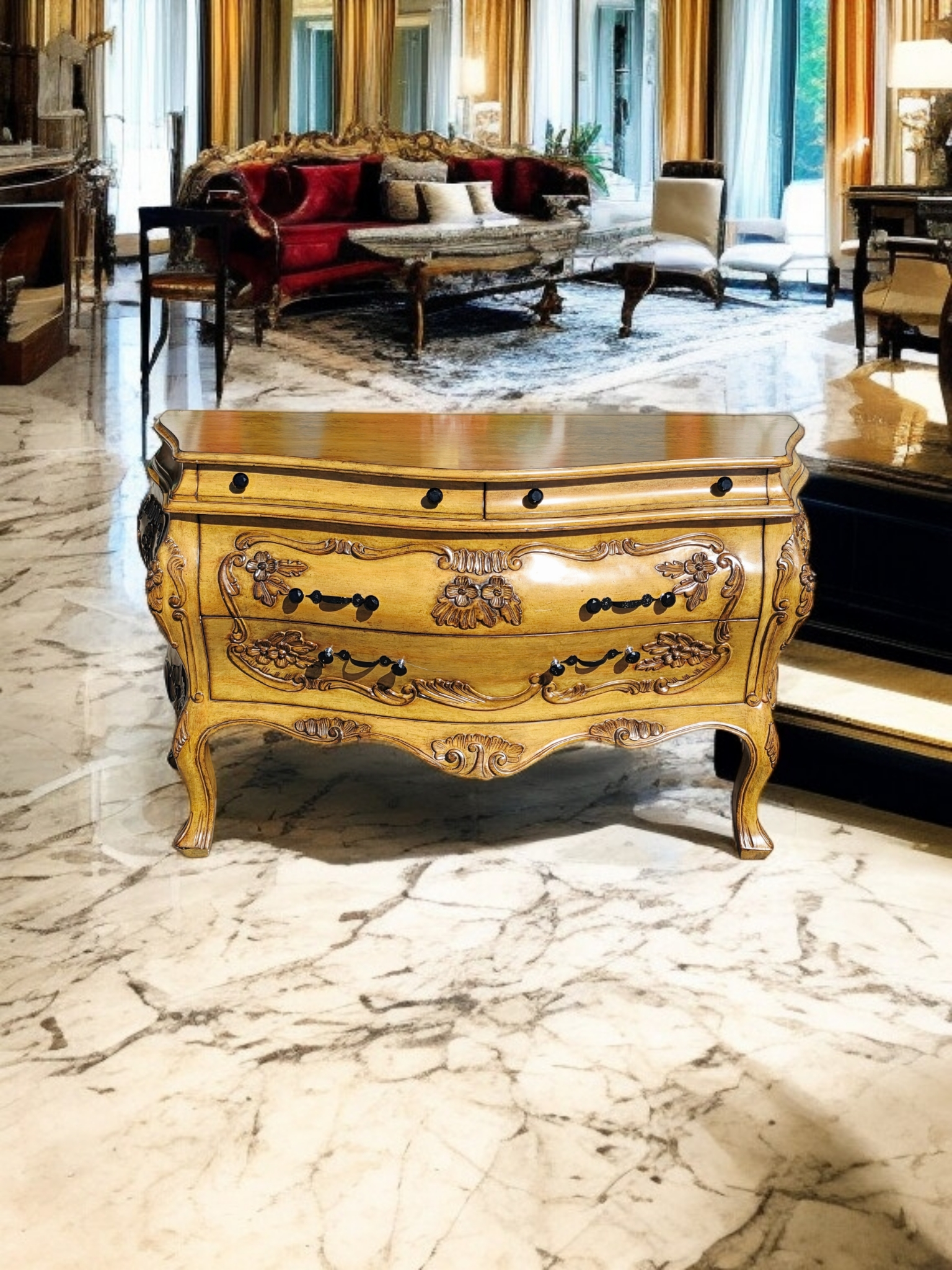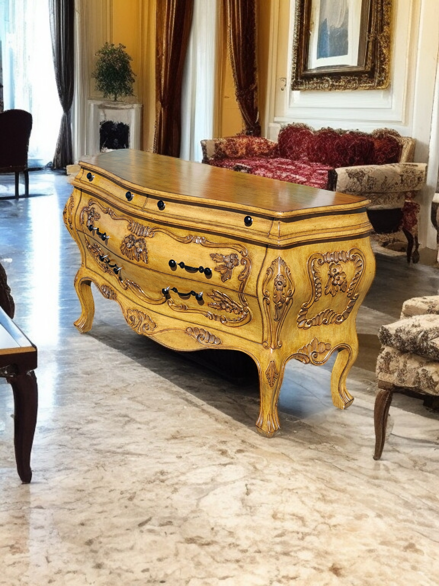 Presentamos este Bombe Italiano de excepcional belleza y presencia escultórica. Tallado en madera maciza y acabado con un pulido cálido que realza sus vetas naturales, esta pieza encarna el esplendor del diseño barroco con una silueta voluptuosa y elegante. Su frente curvo y sus laterales ondulados evocan el movimiento de la danza clásica, mientras que los motivos florales tallados a mano celebran la tradición ornamental italiana con delicadeza y profundidad.