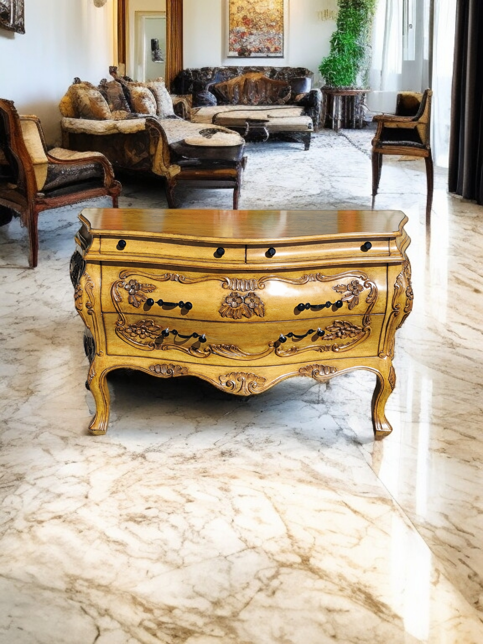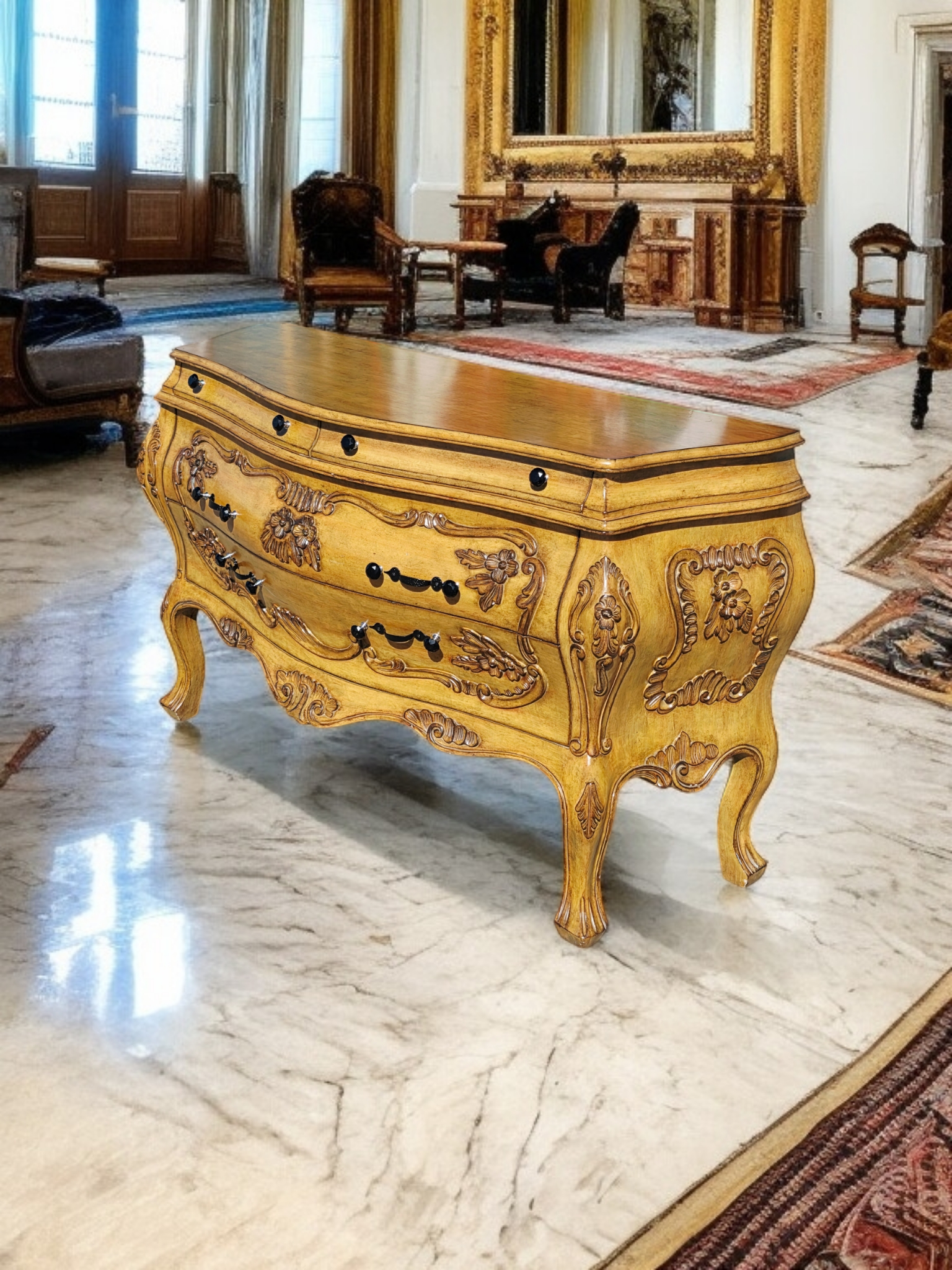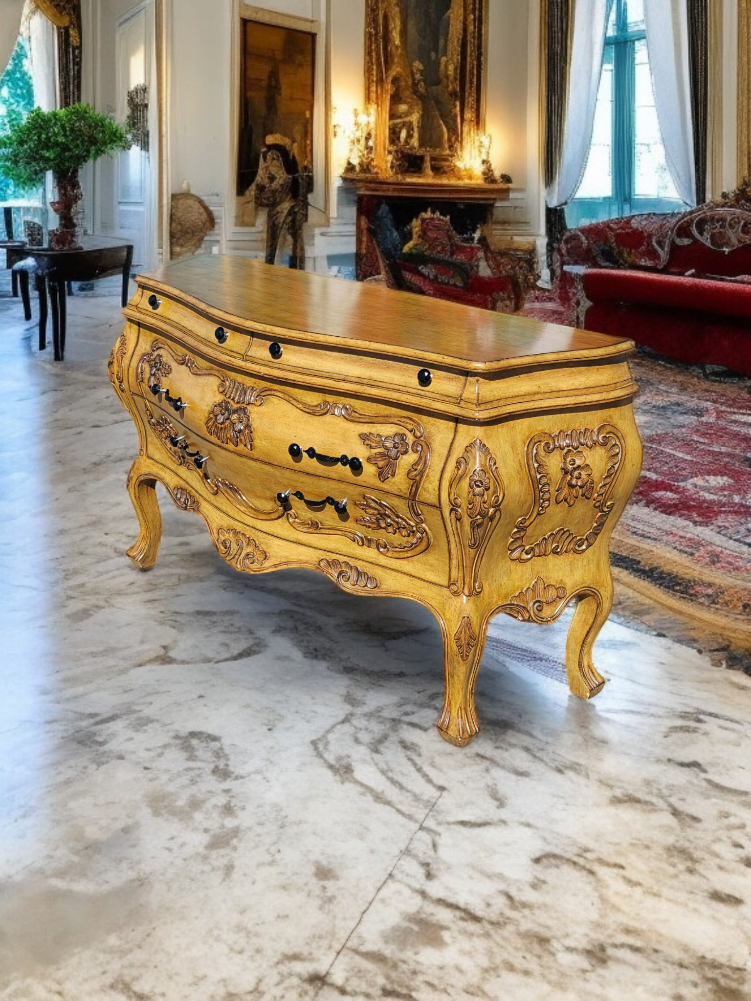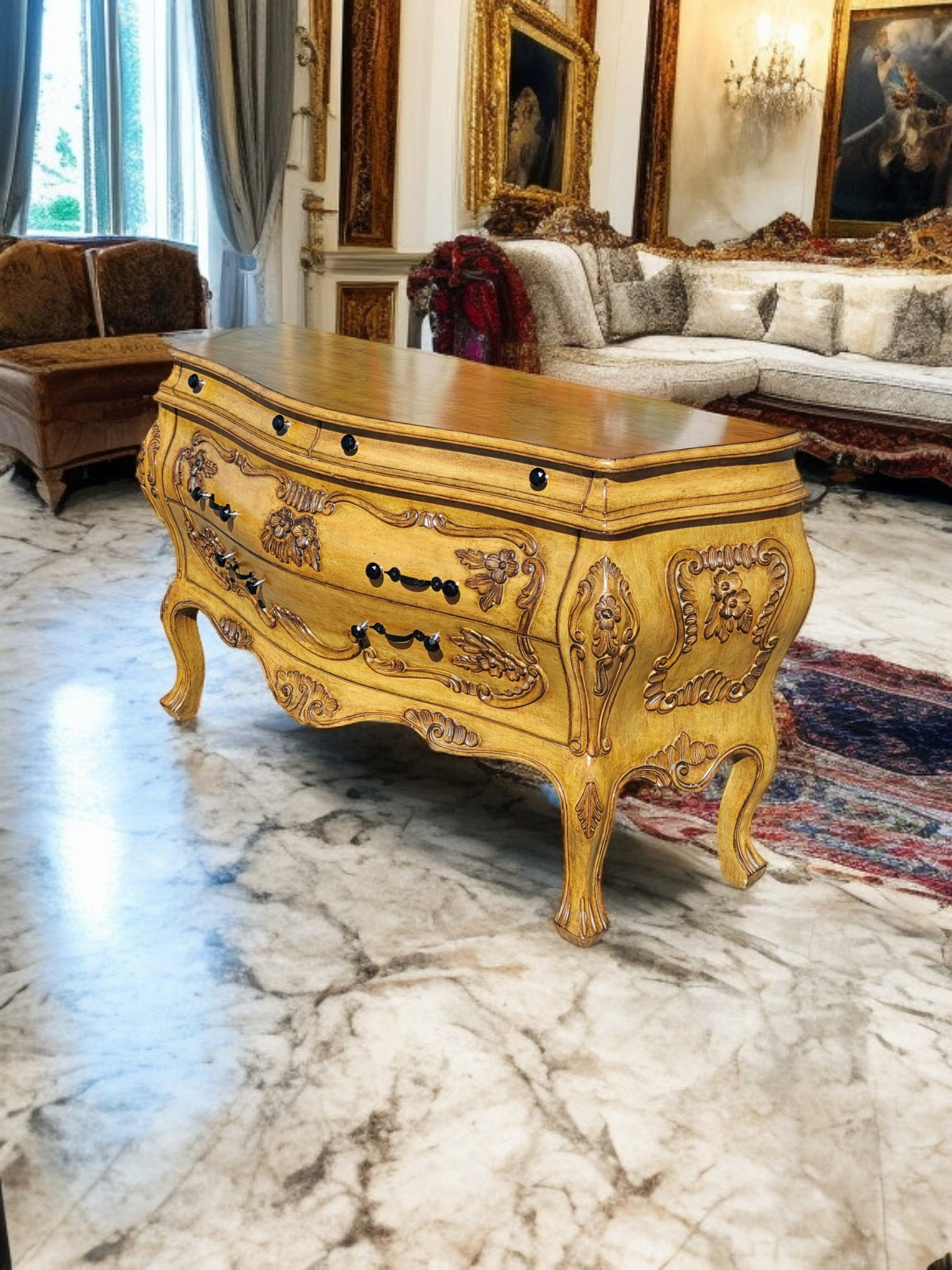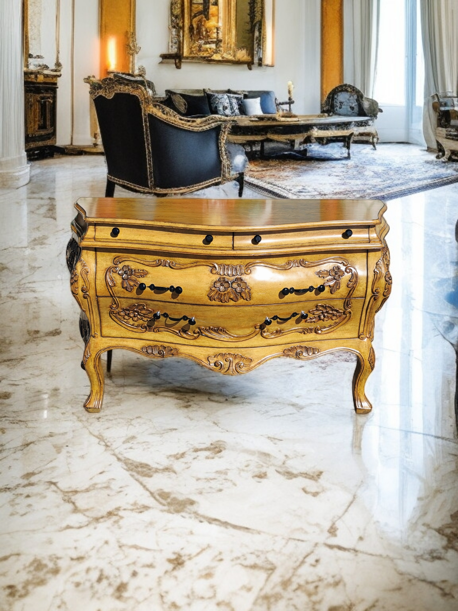 Presentamos este Bombe Italiano de excepcional belleza y presencia escultórica. Tallado en madera maciza y acabado con un pulido cálido que realza sus vetas naturales, esta pieza encarna el esplendor del diseño barroco con una silueta voluptuosa y elegante. Su frente curvo y sus laterales ondulados evocan el movimiento de la danza clásica, mientras que los motivos florales tallados a mano celebran la tradición ornamental italiana con delicadeza y profundidad.