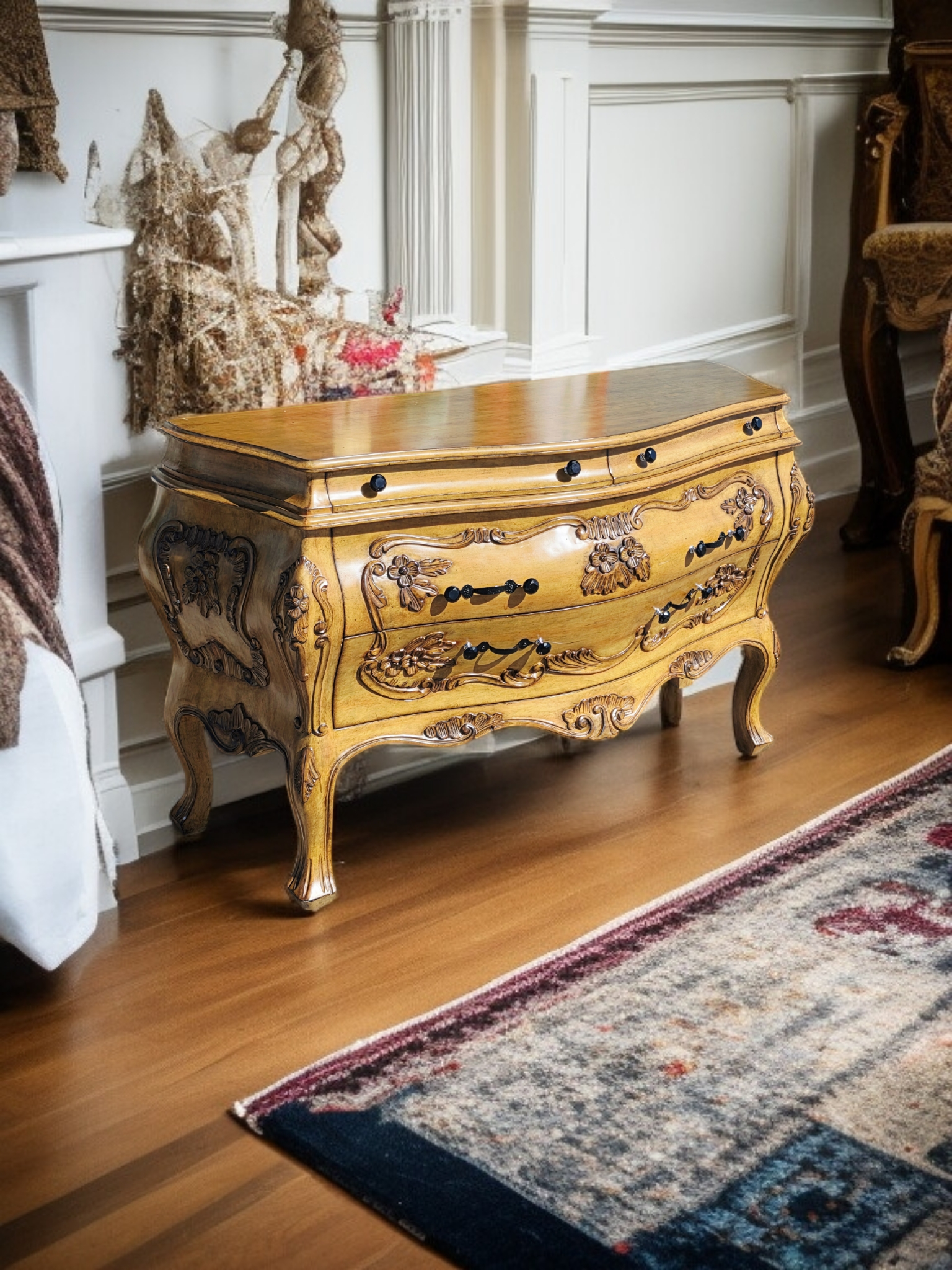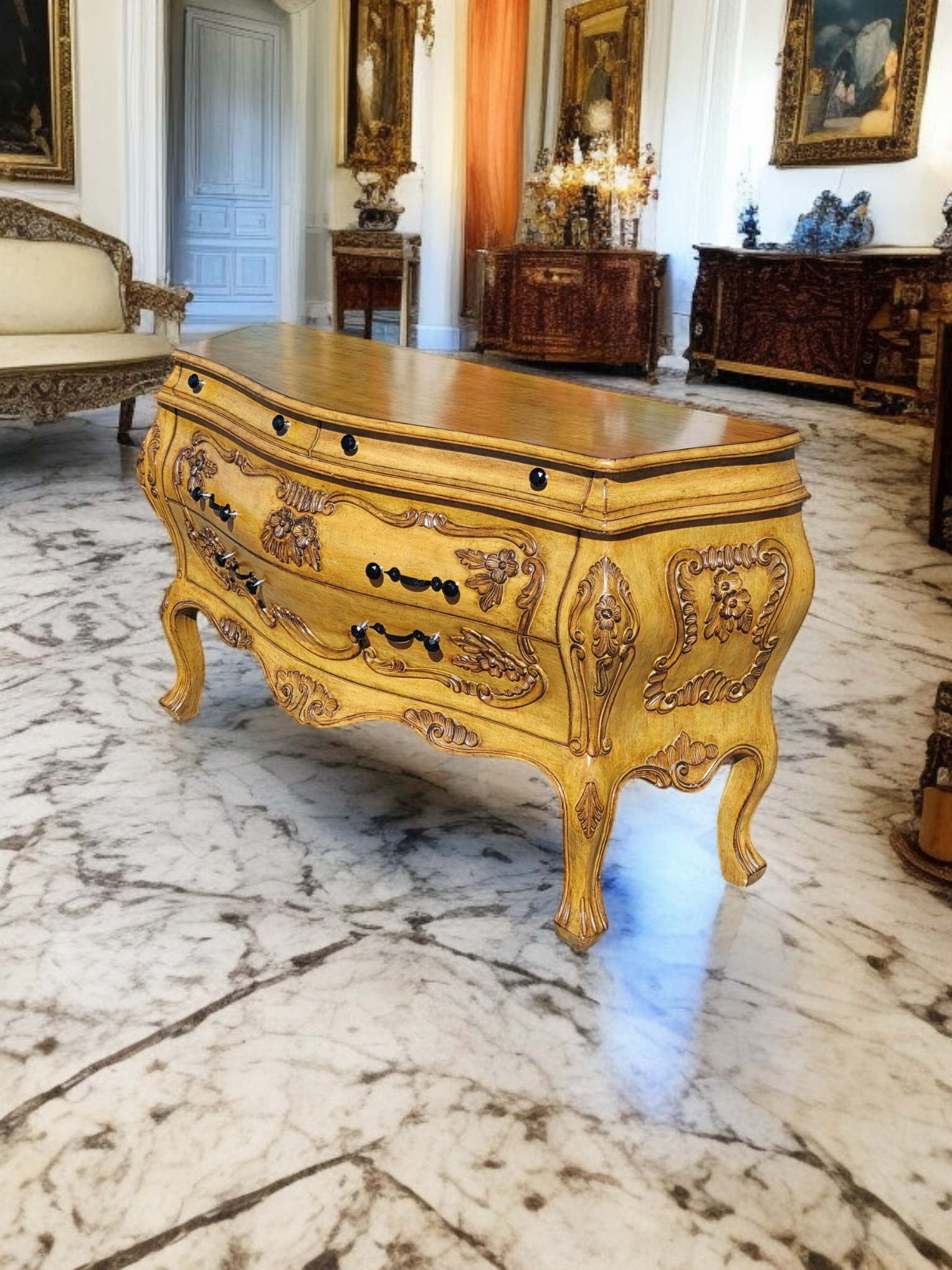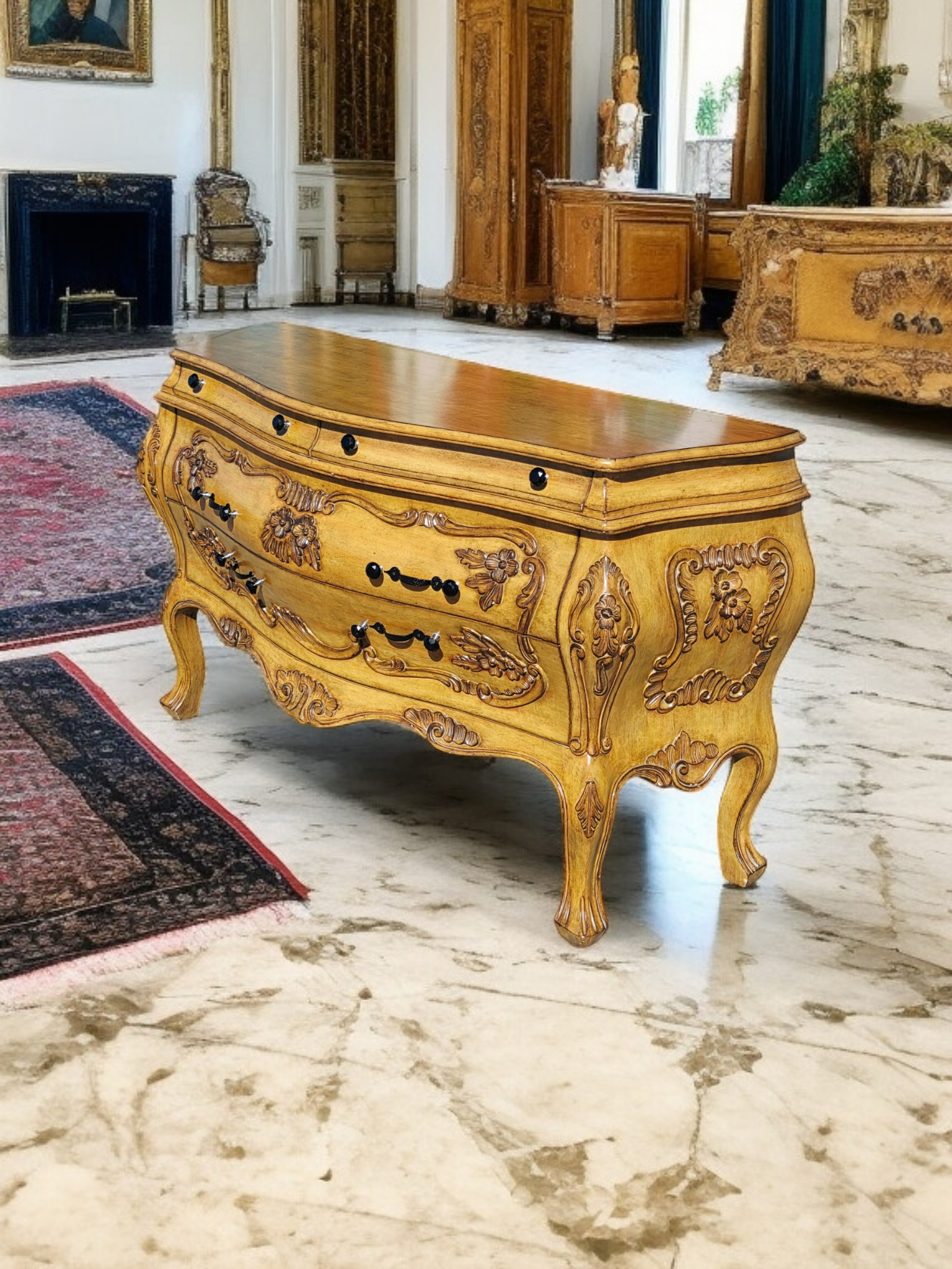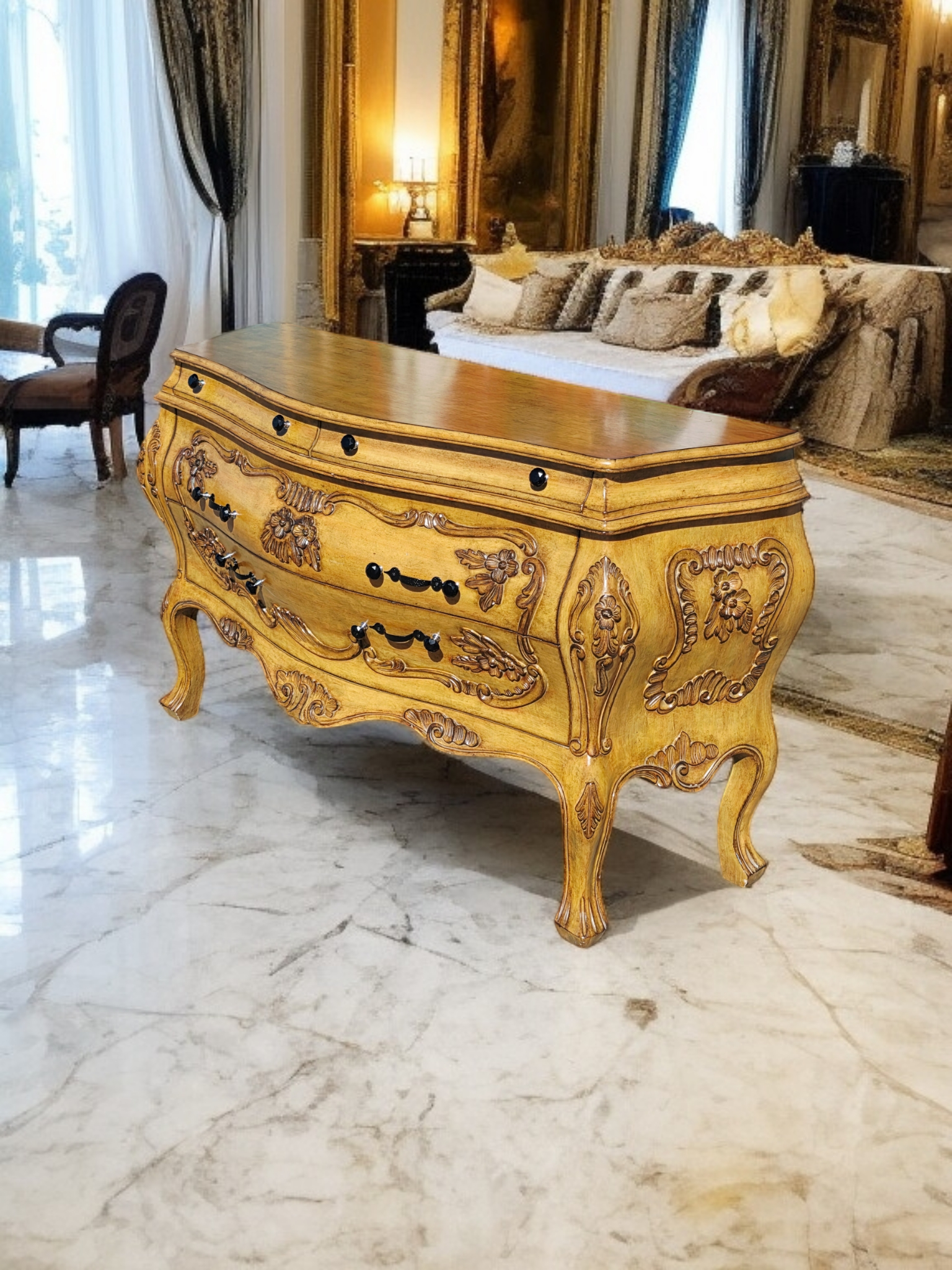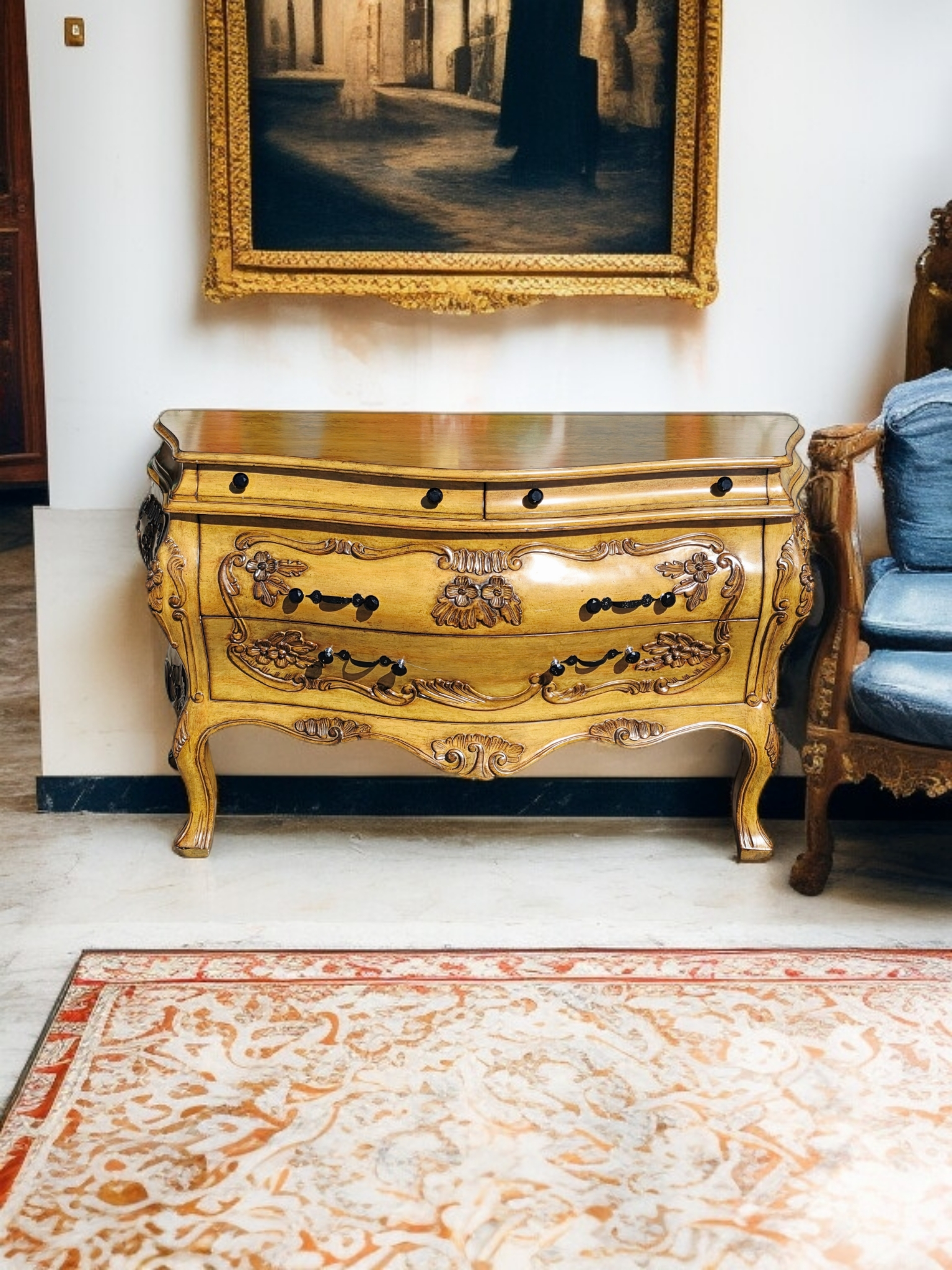 Presentamos este Bombe Italiano de excepcional belleza y presencia escultórica. Tallado en madera maciza y acabado con un pulido cálido que realza sus vetas naturales, esta pieza encarna el esplendor del diseño barroco con una silueta voluptuosa y elegante. Su frente curvo y sus laterales ondulados evocan el movimiento de la danza clásica, mientras que los motivos florales tallados a mano celebran la tradición ornamental italiana con delicadeza y profundidad.