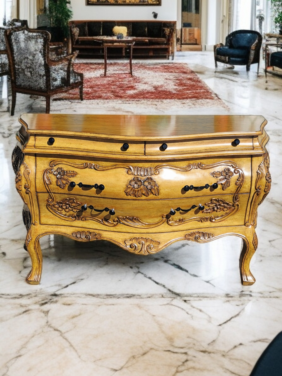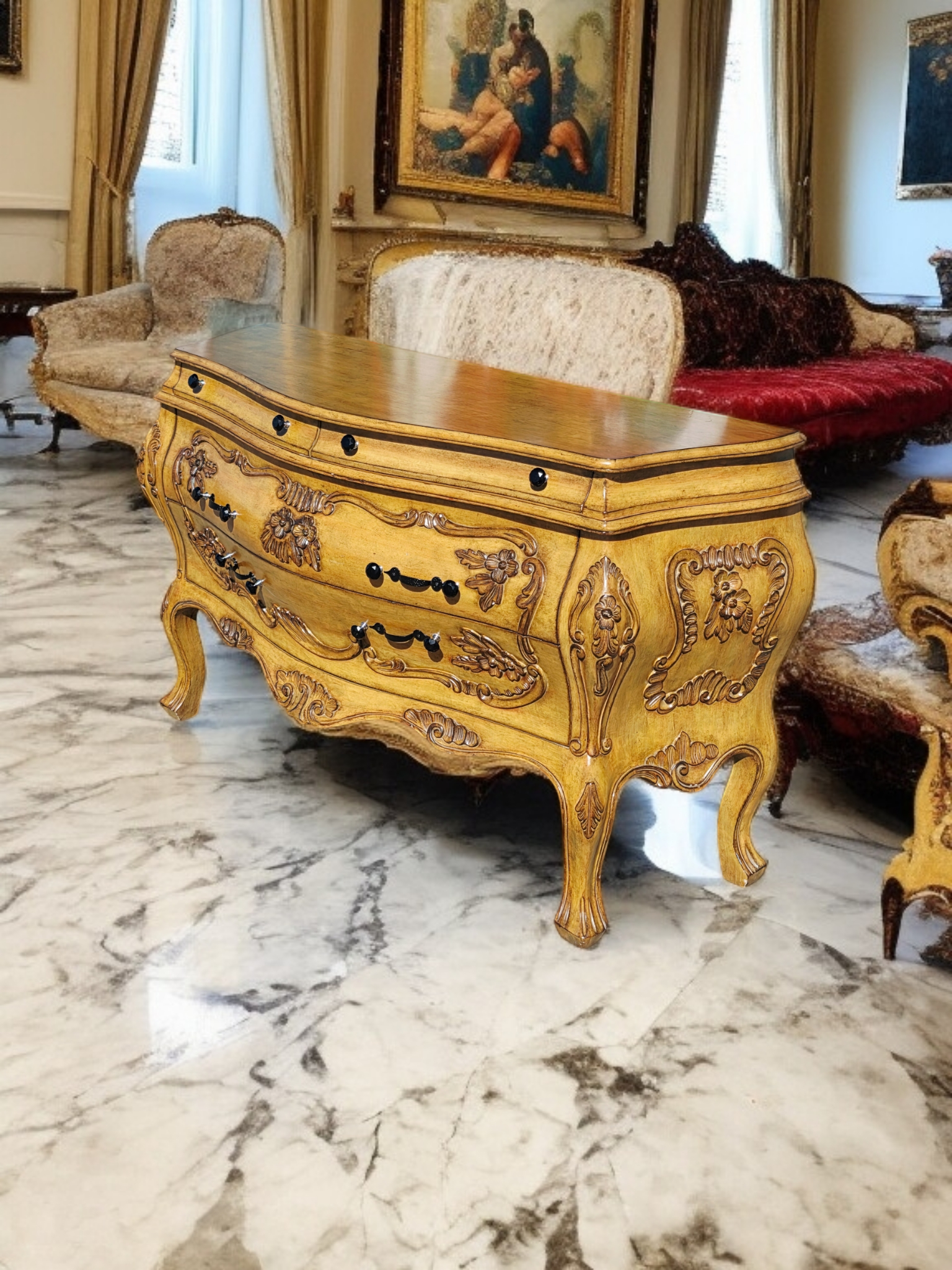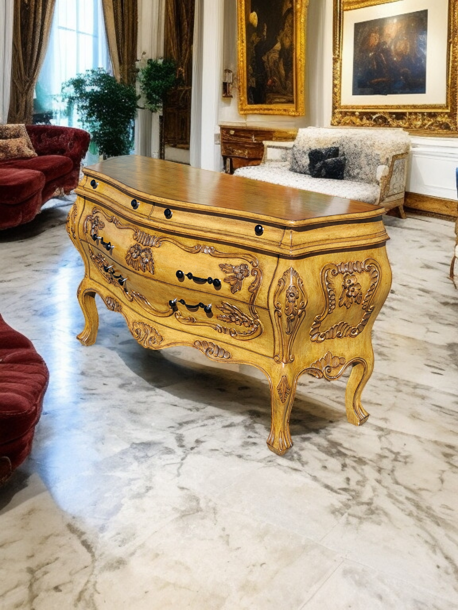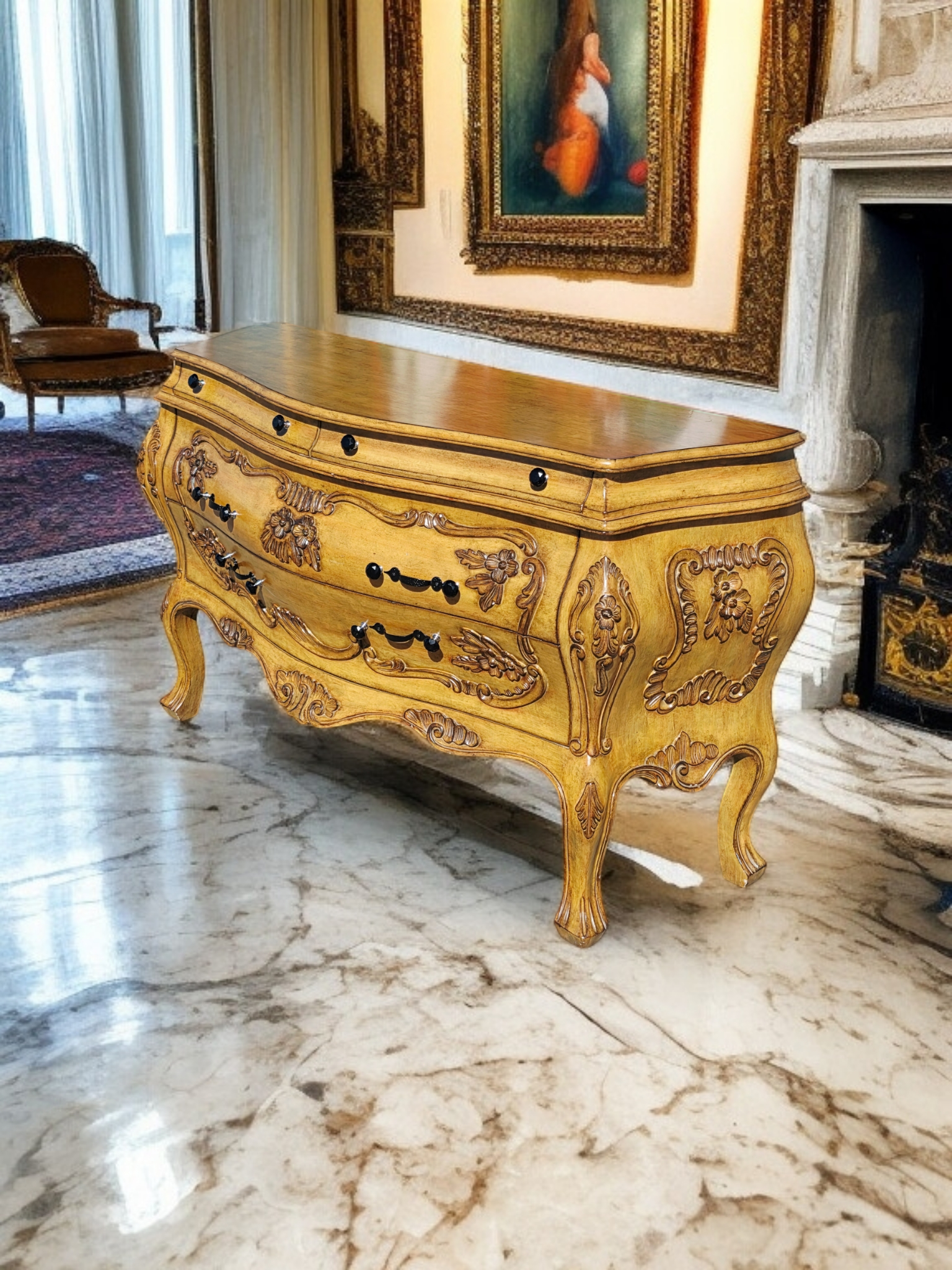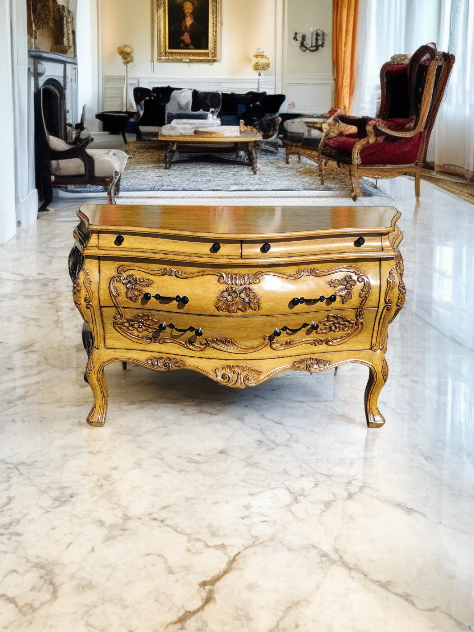 Presentamos este Bombe Italiano de excepcional belleza y presencia escultórica. Tallado en madera maciza y acabado con un pulido cálido que realza sus vetas naturales, esta pieza encarna el esplendor del diseño barroco con una silueta voluptuosa y elegante. Su frente curvo y sus laterales ondulados evocan el movimiento de la danza clásica, mientras que los motivos florales tallados a mano celebran la tradición ornamental italiana con delicadeza y profundidad.