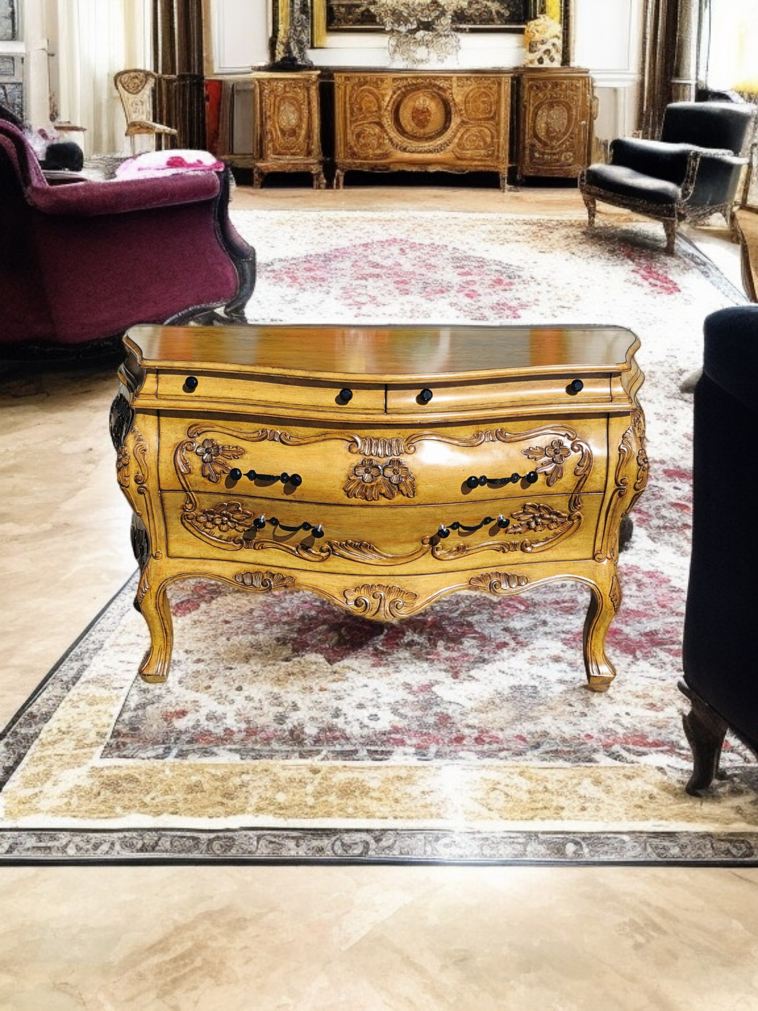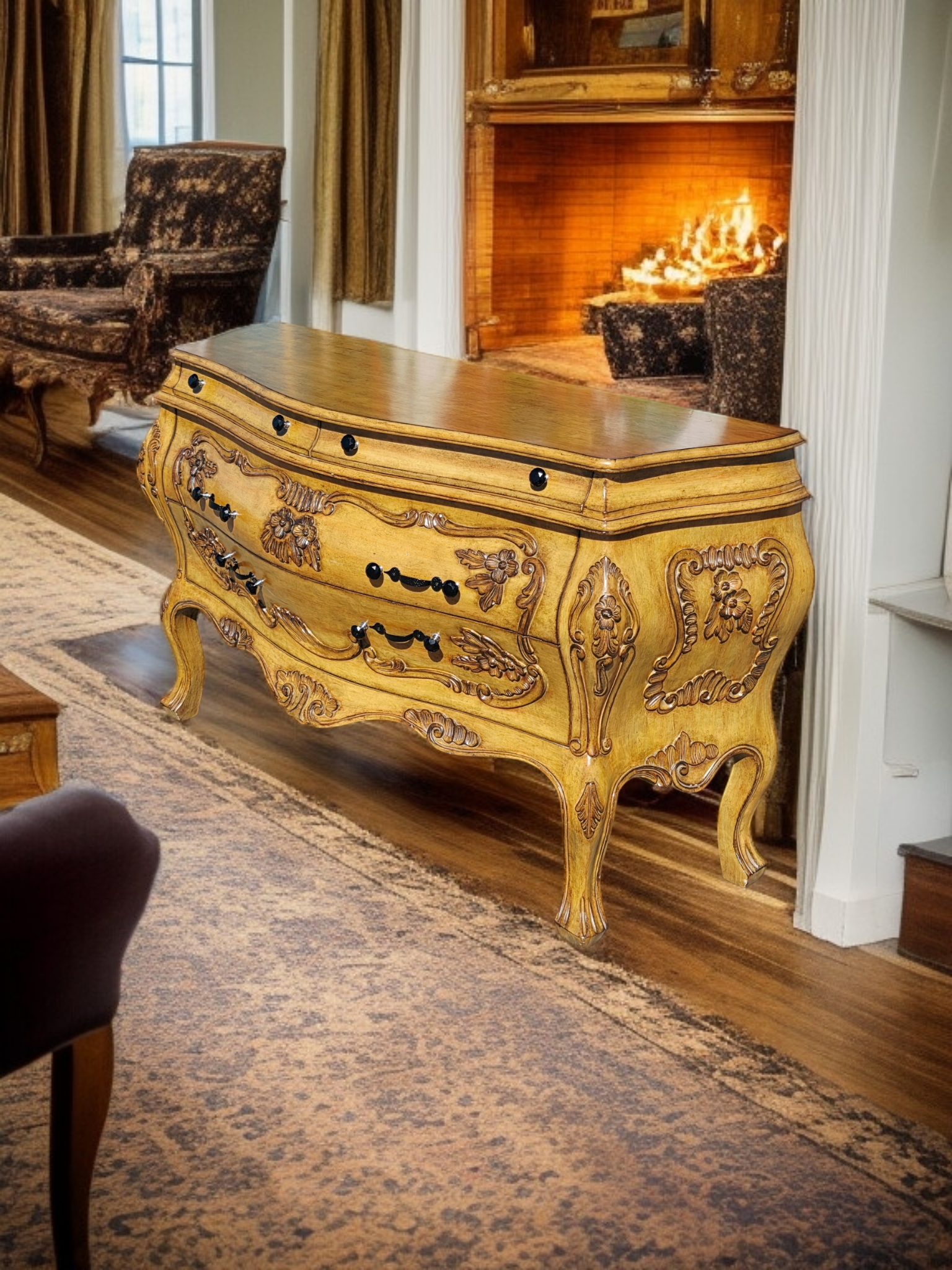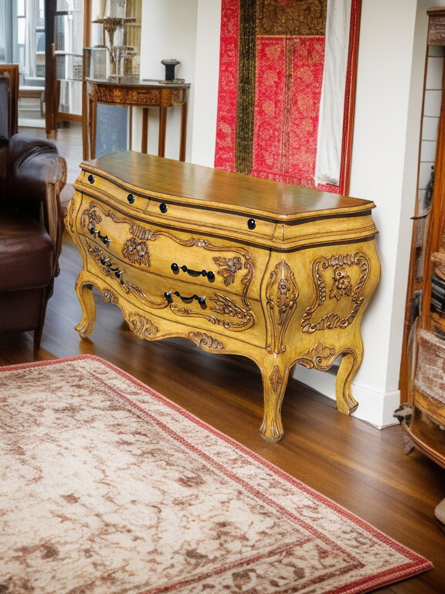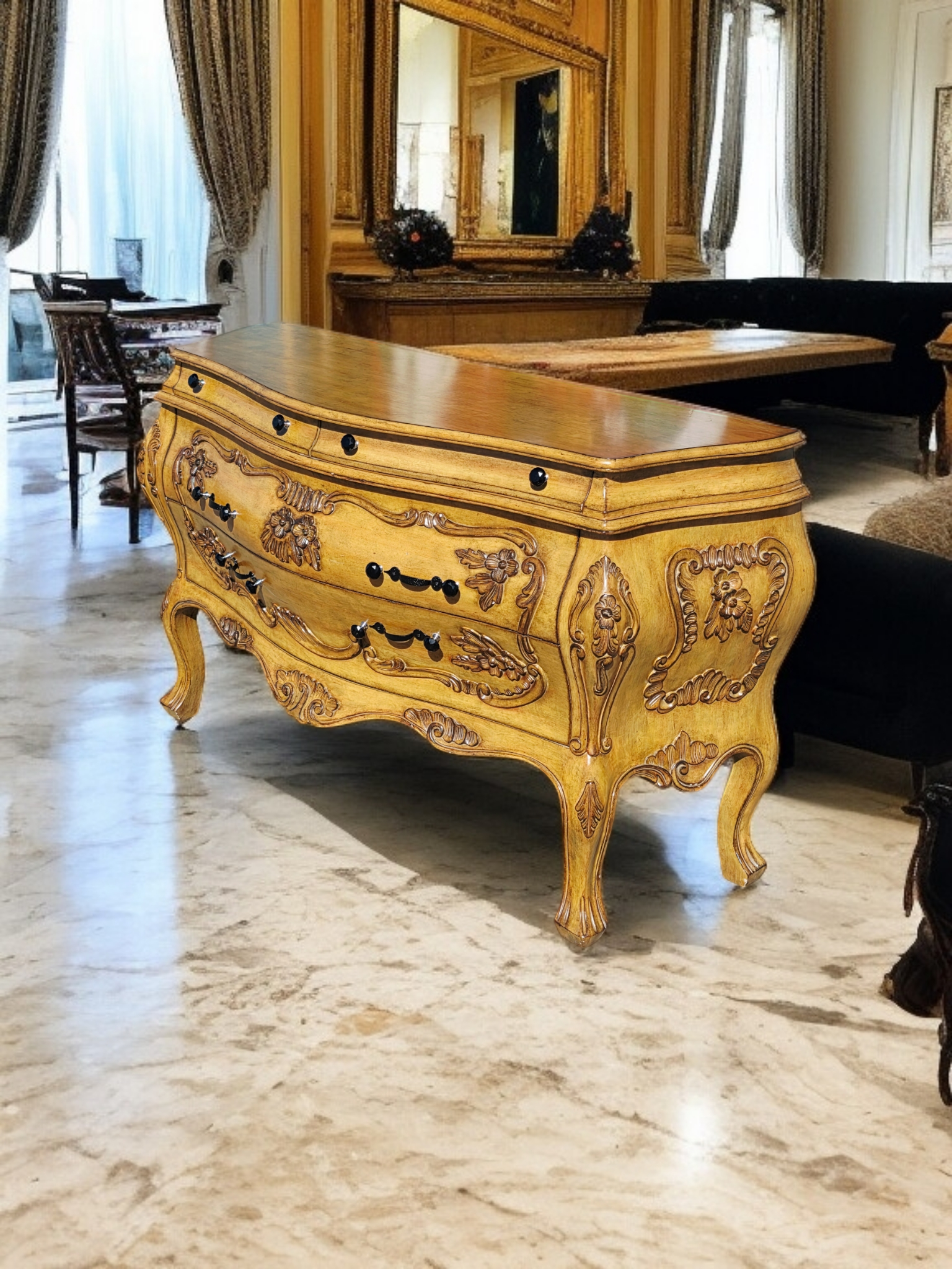 Presentamos este Bombe Italiano de excepcional belleza y presencia escultórica. Tallado en madera maciza y acabado con un pulido cálido que realza sus vetas naturales, esta pieza encarna el esplendor del diseño barroco con una silueta voluptuosa y elegante. Su frente curvo y sus laterales ondulados evocan el movimiento de la danza clásica, mientras que los motivos florales tallados a mano celebran la tradición ornamental italiana con delicadeza y profundidad.