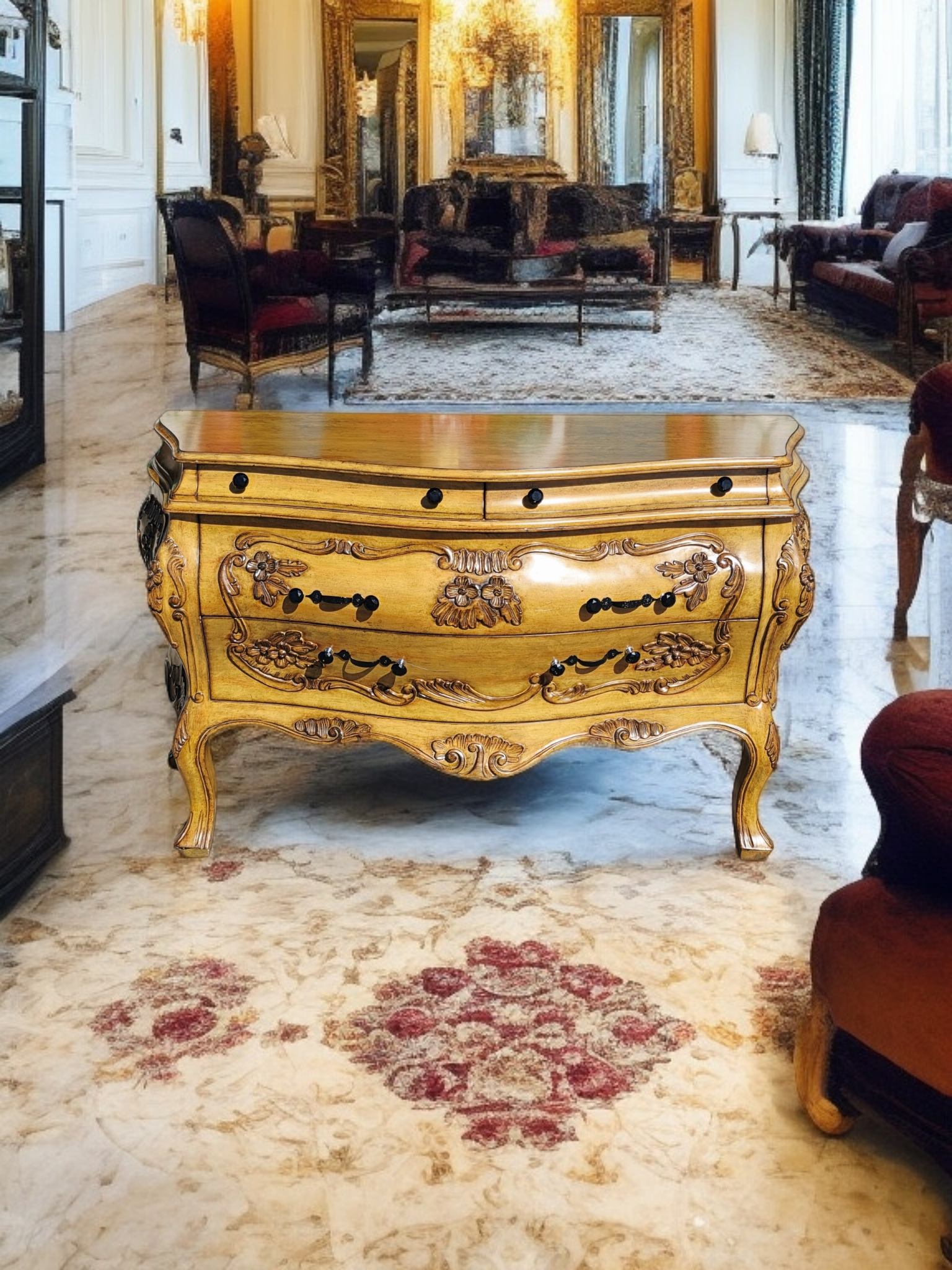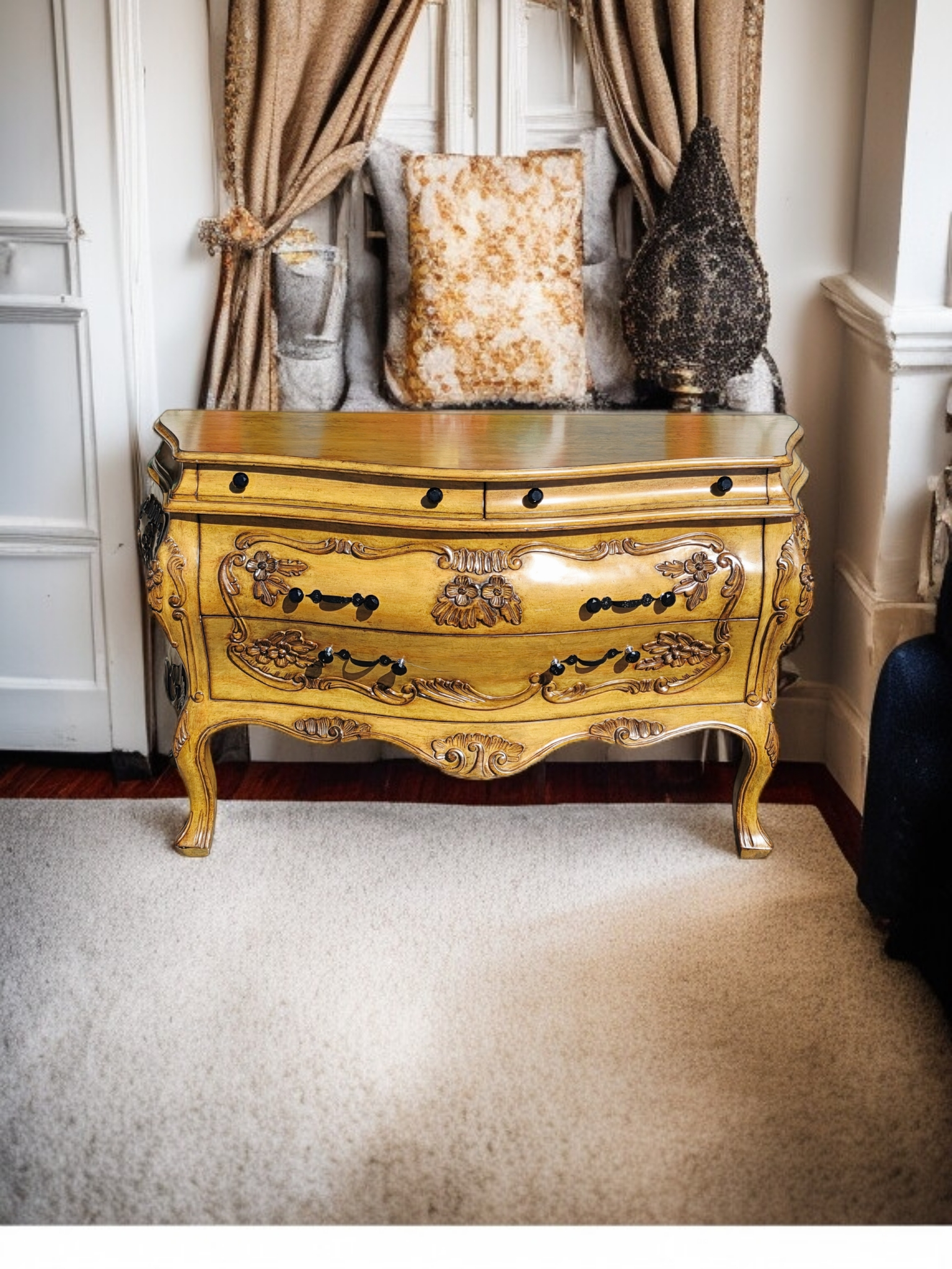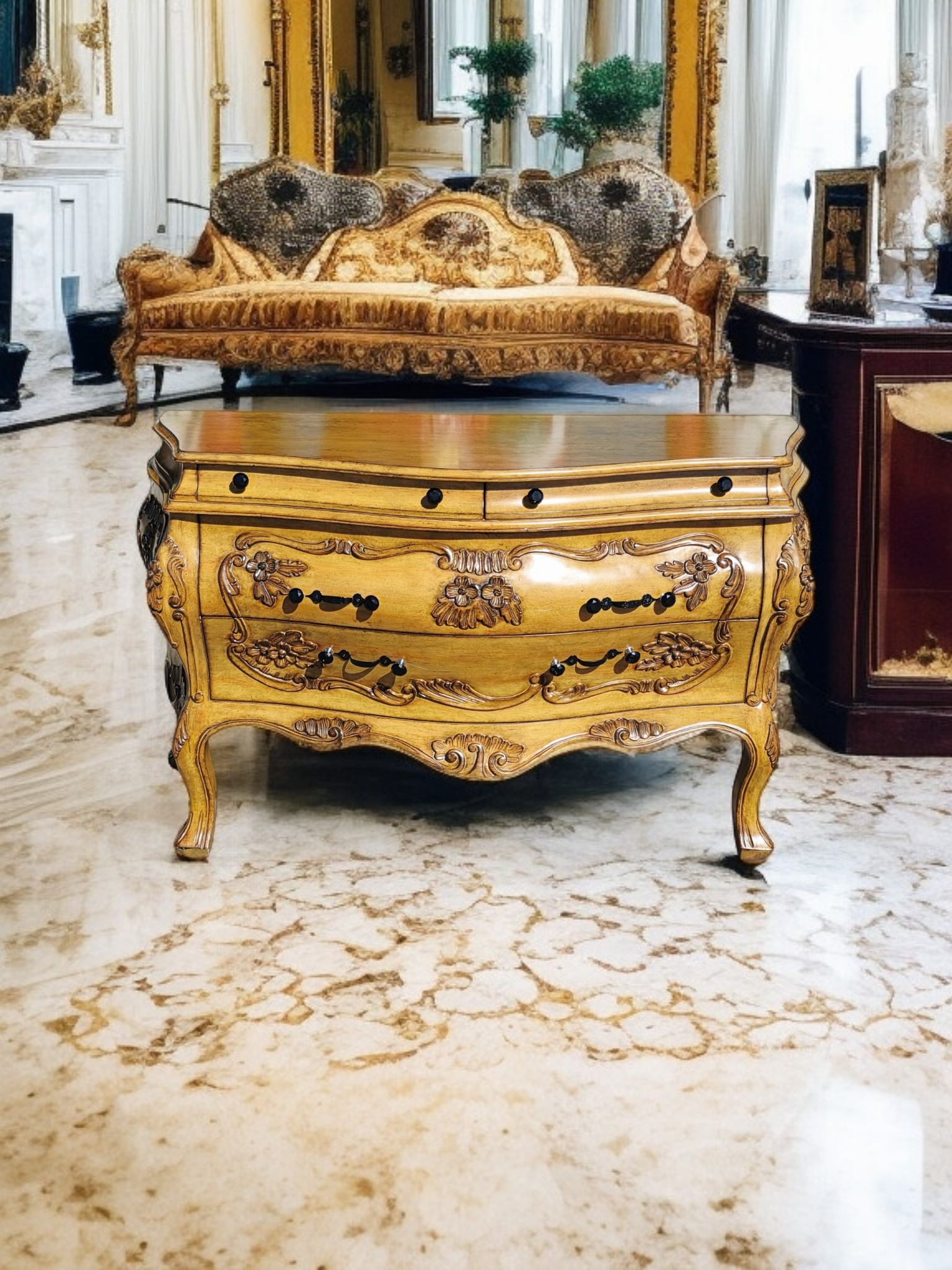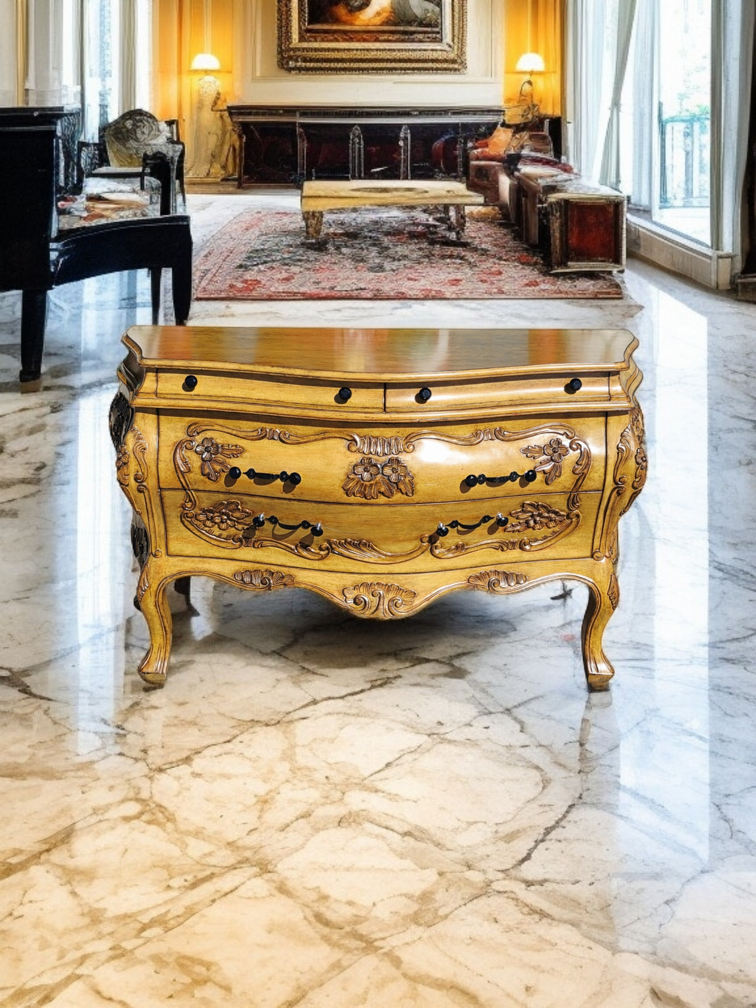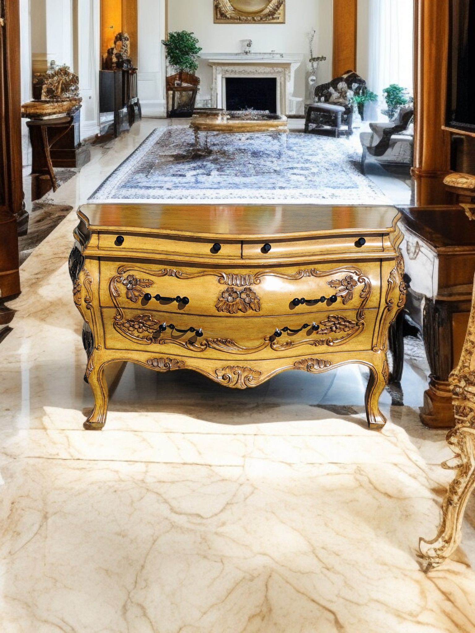 Presentamos este Bombe Italiano de excepcional belleza y presencia escultórica. Tallado en madera maciza y acabado con un pulido cálido que realza sus vetas naturales, esta pieza encarna el esplendor del diseño barroco con una silueta voluptuosa y elegante. Su frente curvo y sus laterales ondulados evocan el movimiento de la danza clásica, mientras que los motivos florales tallados a mano celebran la tradición ornamental italiana con delicadeza y profundidad.