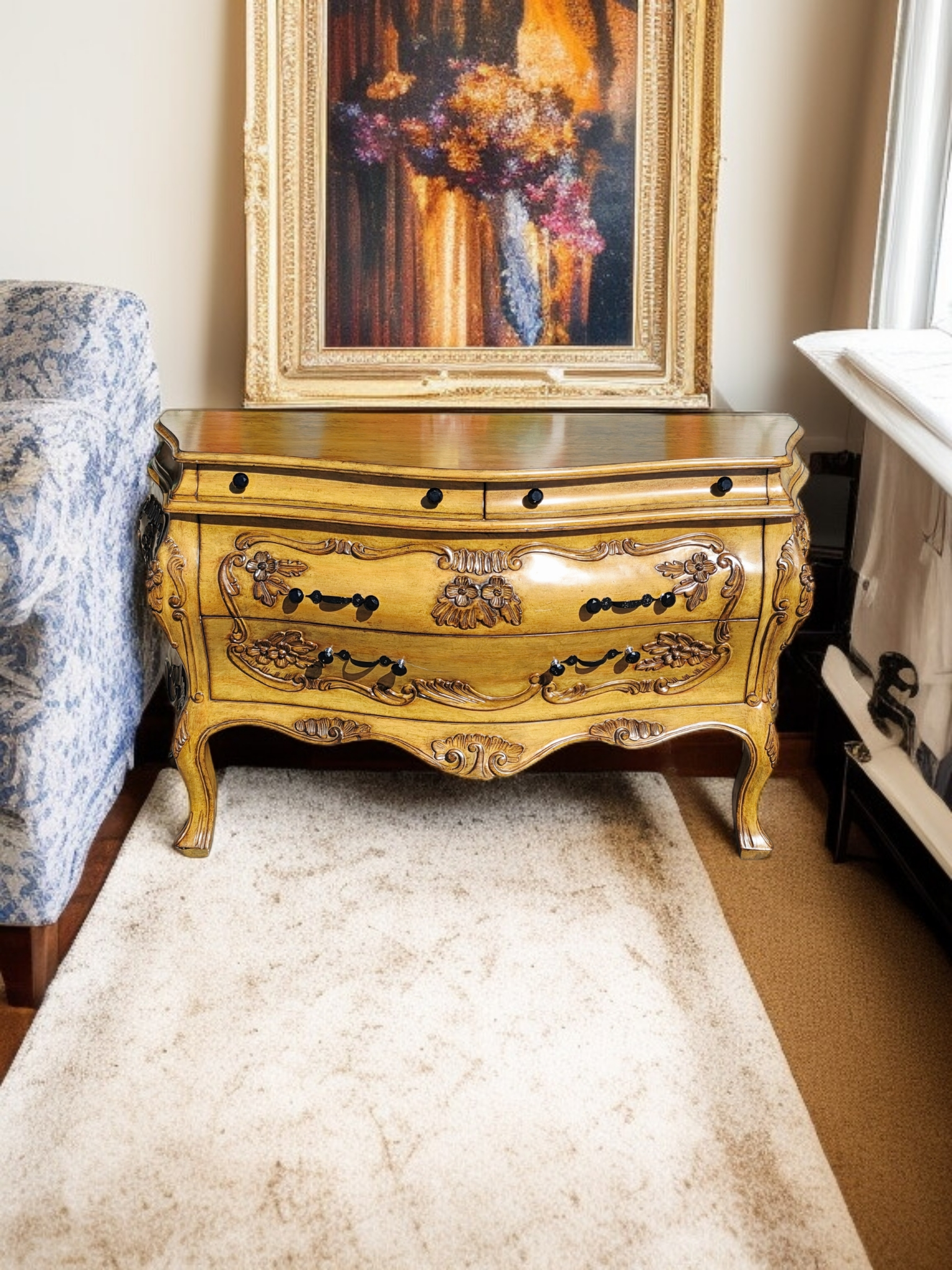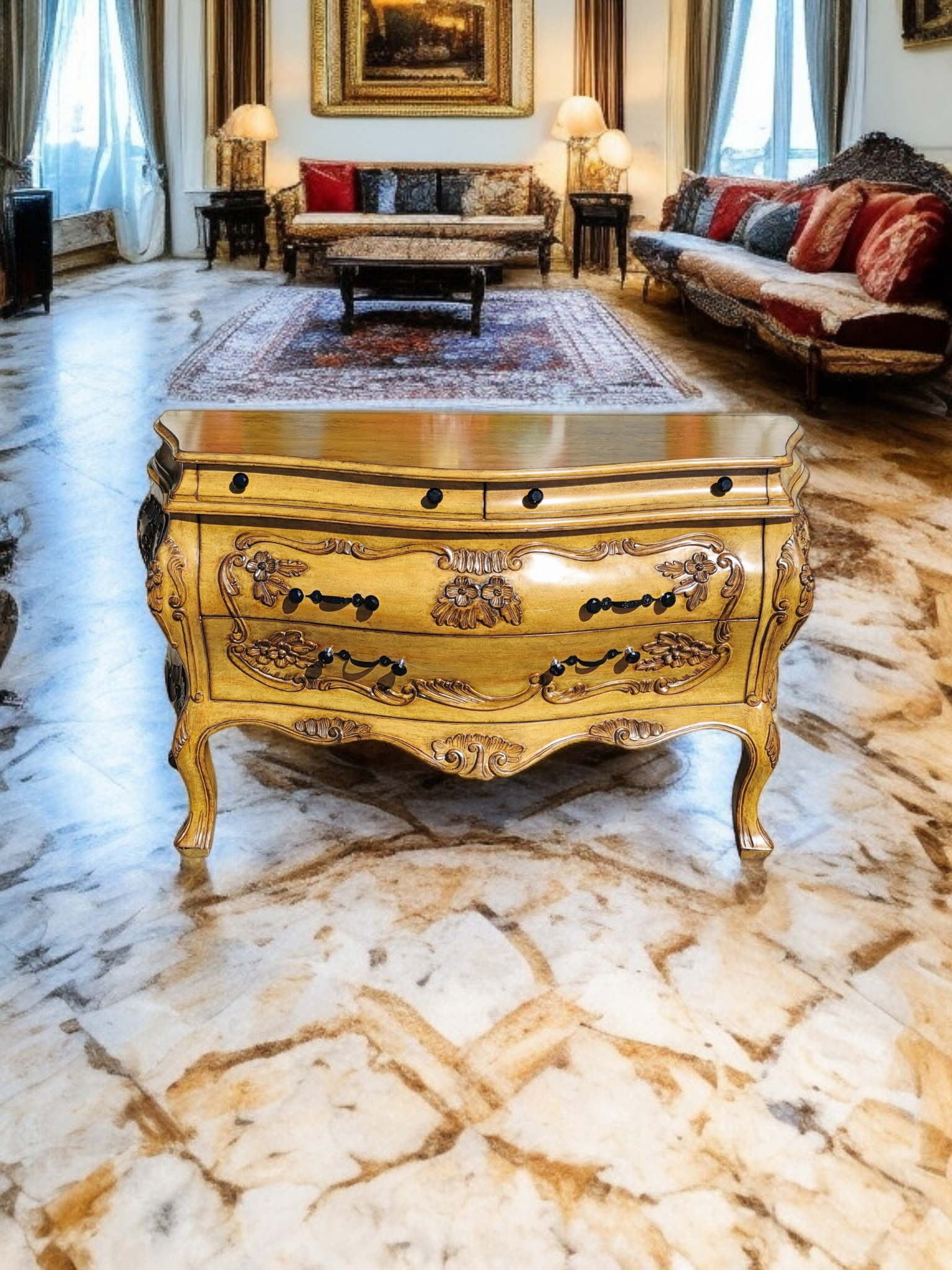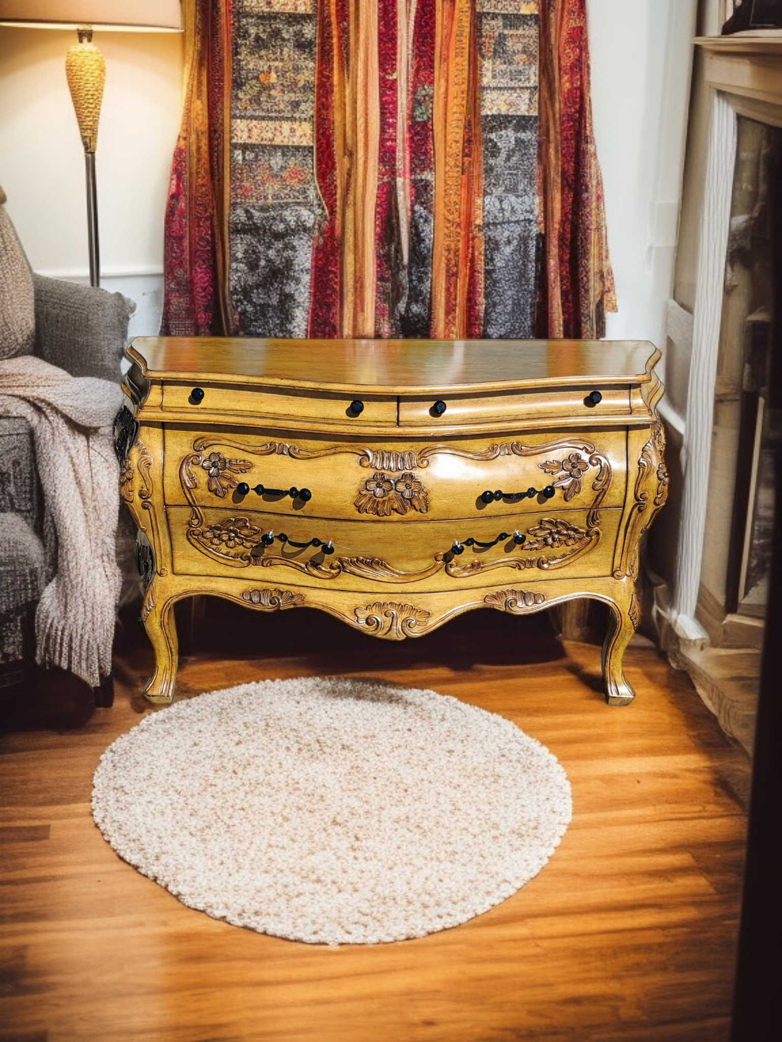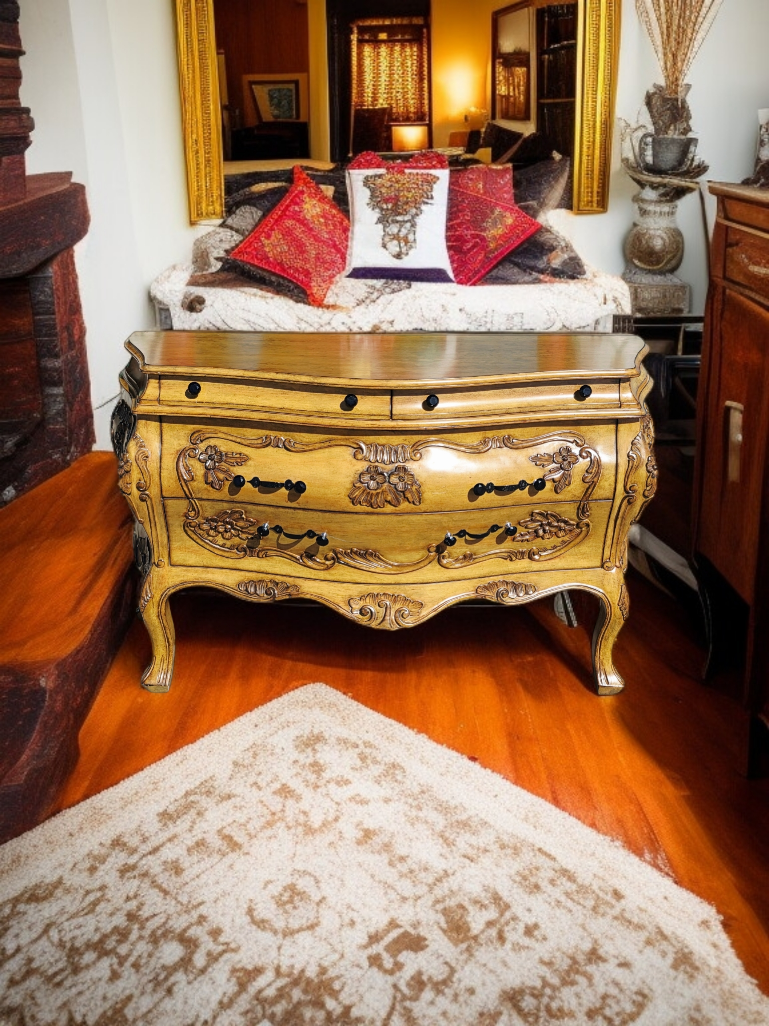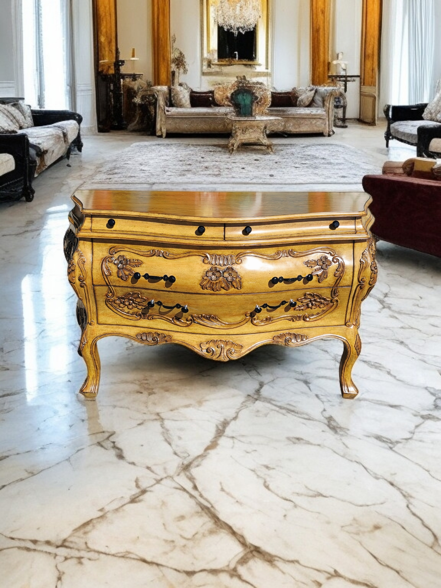 Presentamos este Bombe Italiano de excepcional belleza y presencia escultórica. Tallado en madera maciza y acabado con un pulido cálido que realza sus vetas naturales, esta pieza encarna el esplendor del diseño barroco con una silueta voluptuosa y elegante. Su frente curvo y sus laterales ondulados evocan el movimiento de la danza clásica, mientras que los motivos florales tallados a mano celebran la tradición ornamental italiana con delicadeza y profundidad.
