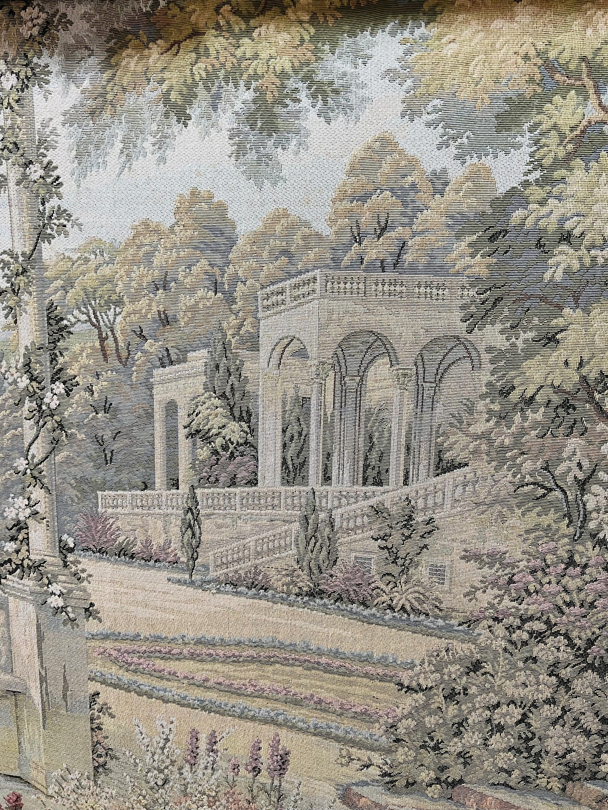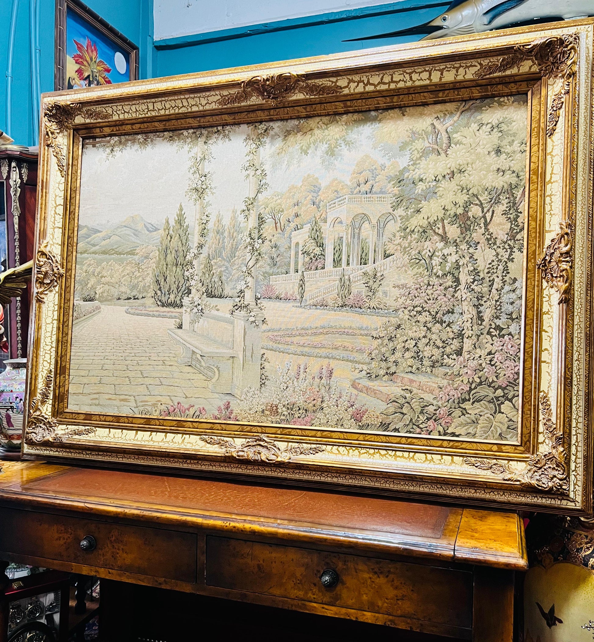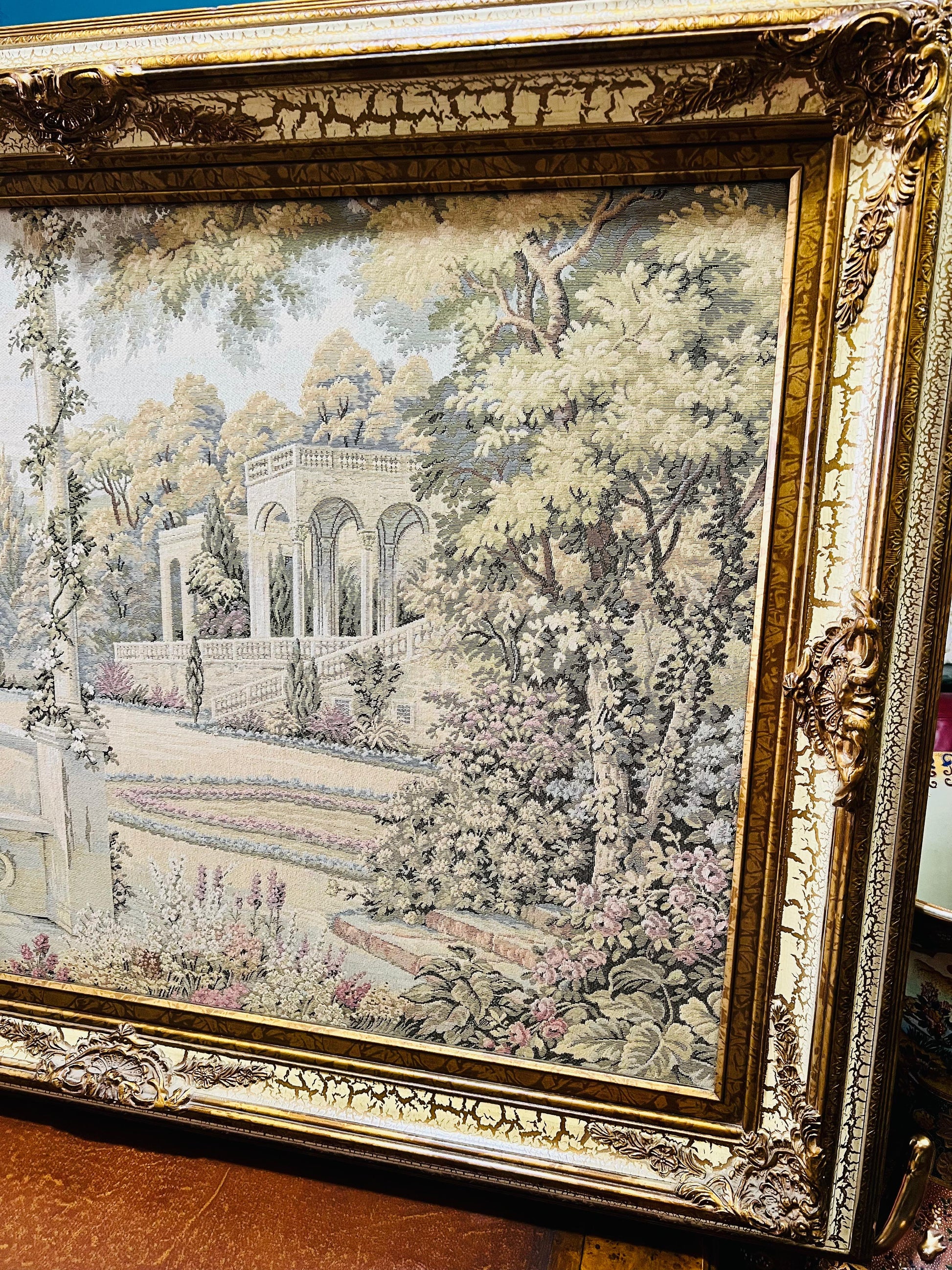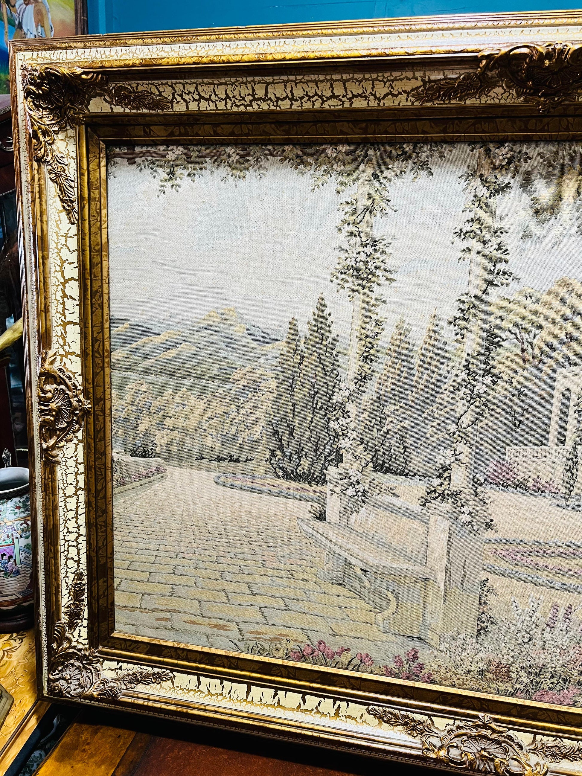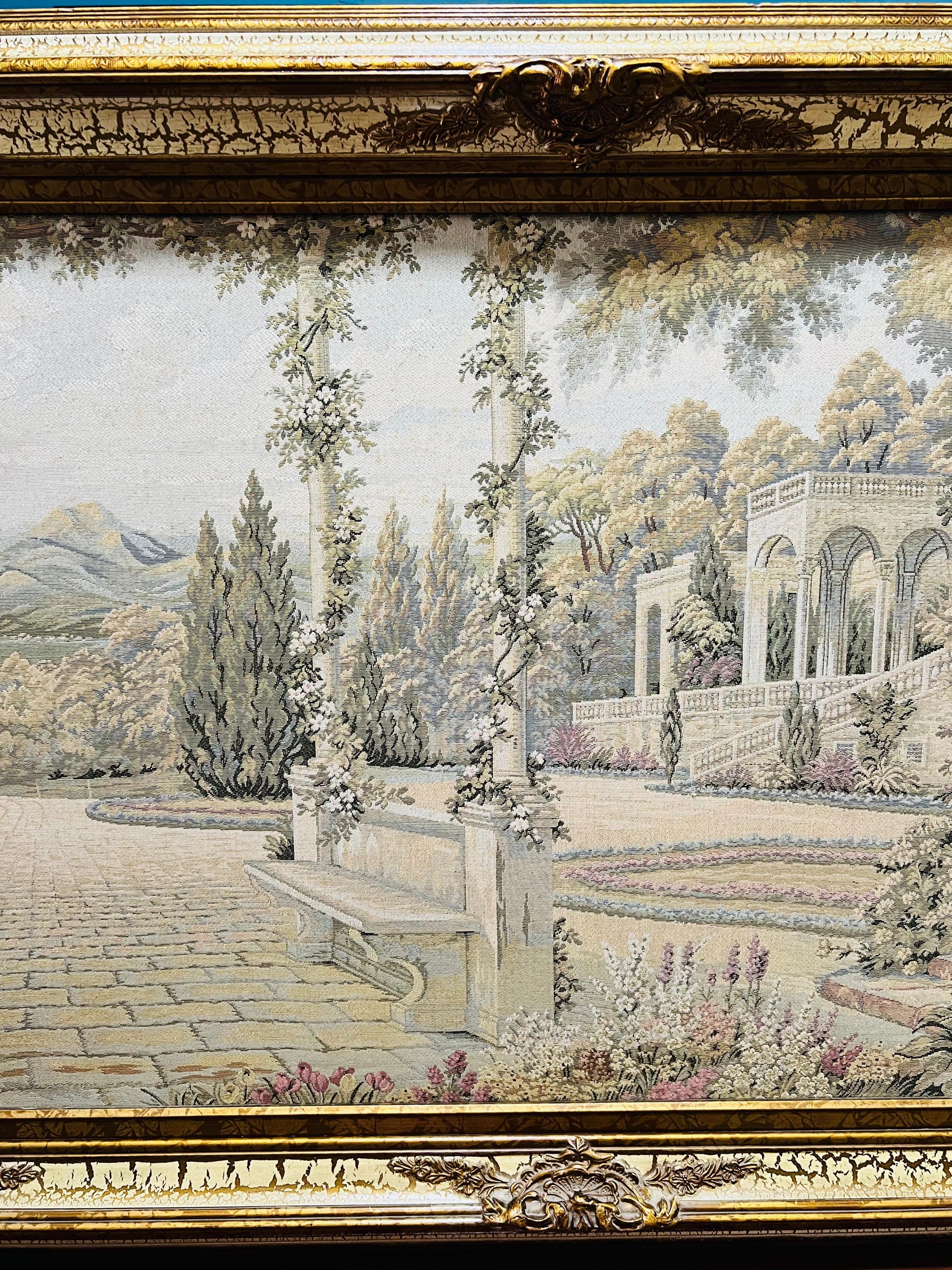 En Rosarito Antiques, cada pieza cuenta una historia. Este majestuoso gobelino representa una escena serena de arquitectura clásica y naturaleza mediterránea: una terraza empedrada rodeada de cipreses, columnas y flores, con colinas suaves al fondo y un cielo que invita al sosiego.