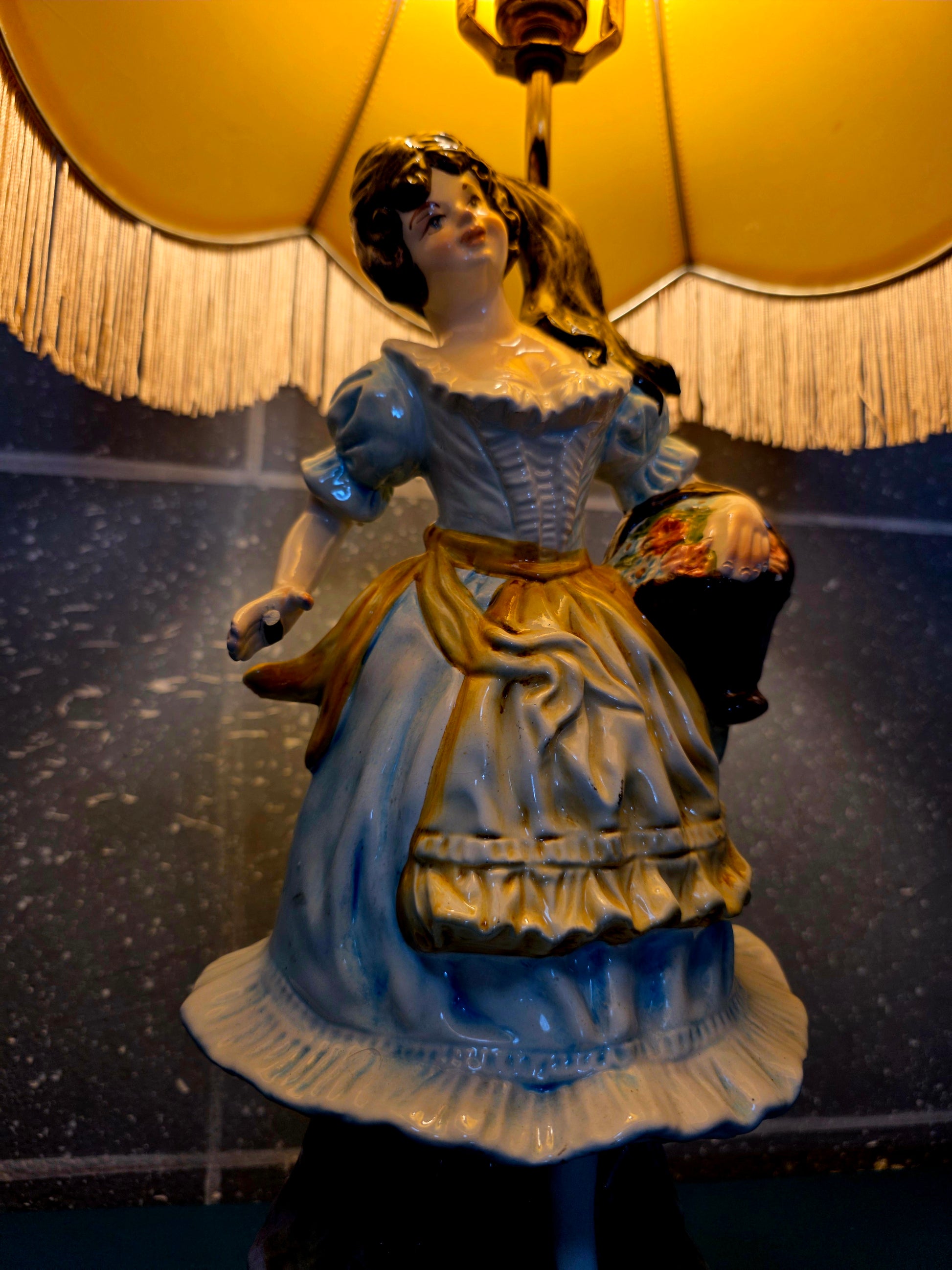 La figura, esculpida con precisión, representa a una dama en pose gentil, vestida con un vestido de época ricamente detallado en tonos pastel. Su gesto, la textura de las flores, y el movimiento del vestido revelan la maestría artesanal que distingue a Capodimonte. La pantalla, con su contorno ondulado y flecos suaves, proyecta una luz cálida que realza los matices de la porcelana y crea una atmósfera acogedora.