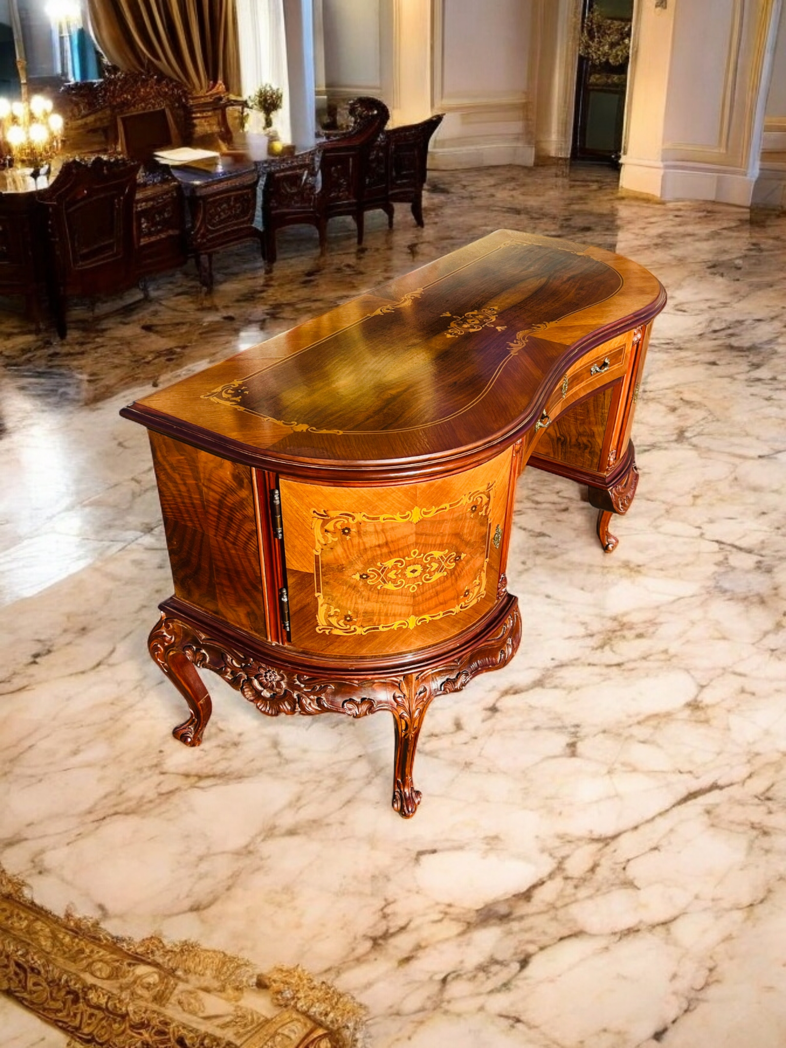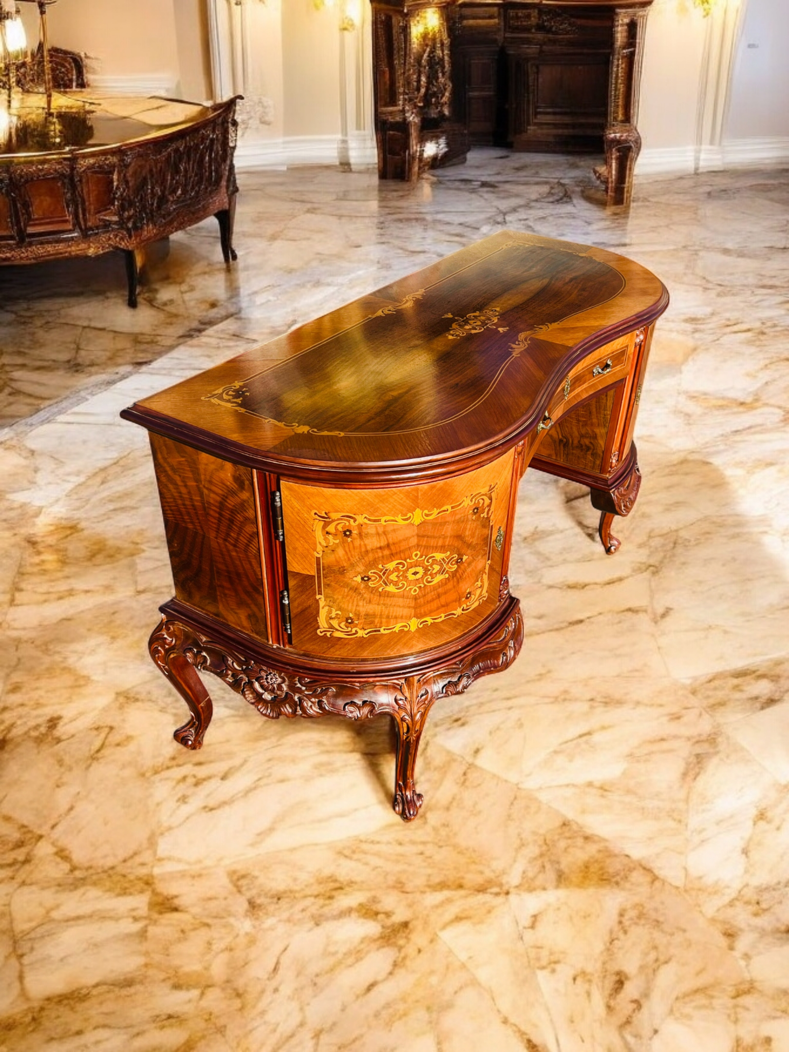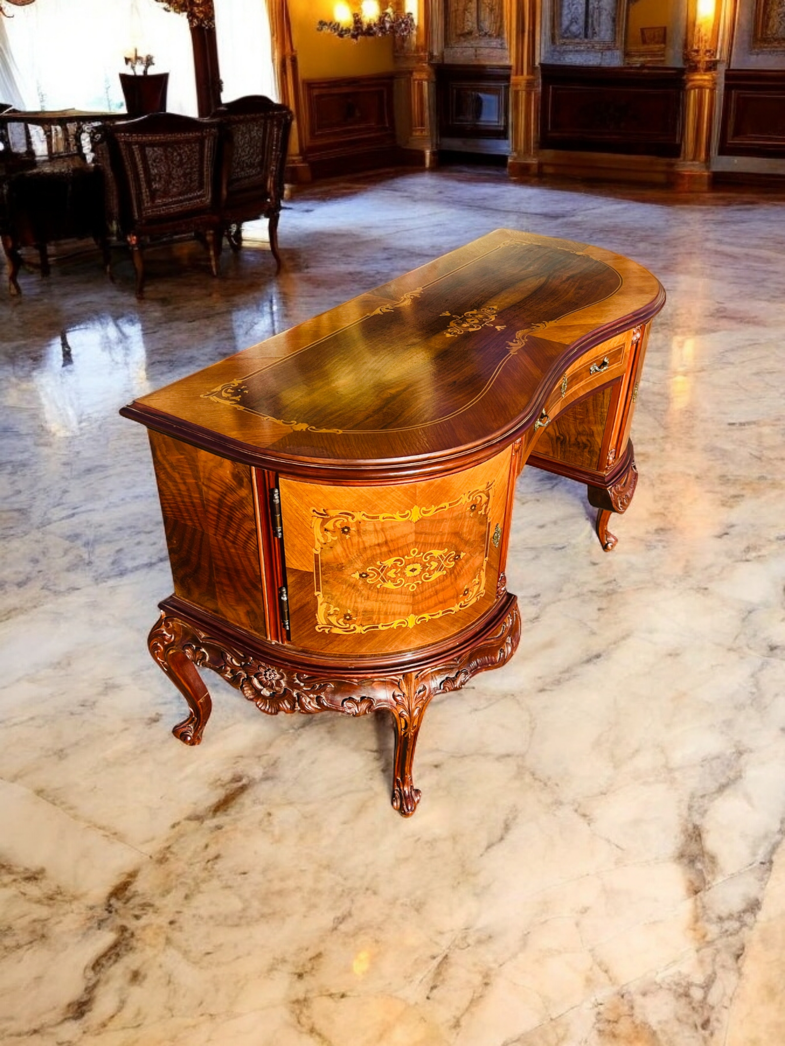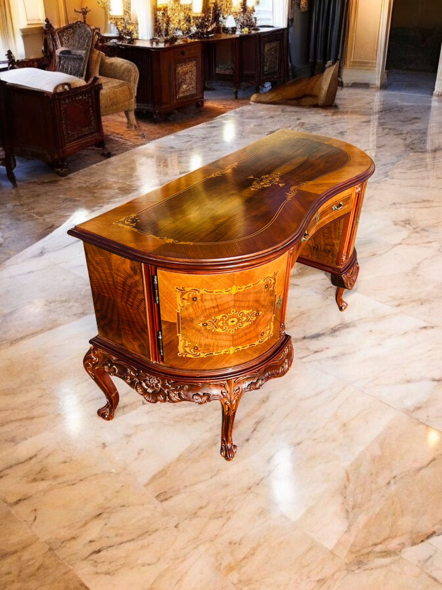 Descripción: Este escritorio no solo es una pieza funcional, sino también una obra de arte que añadirá un toque de distinción a cualquier espacio. Su diseño detallado y sus acabados finos lo convierten en una adición impresionante a oficinas, estudios o como una pieza decorativa en su hogar. Los cajones amplios y los compartimentos laterales ofrecen un almacenamiento práctico sin sacrificar el estilo.
