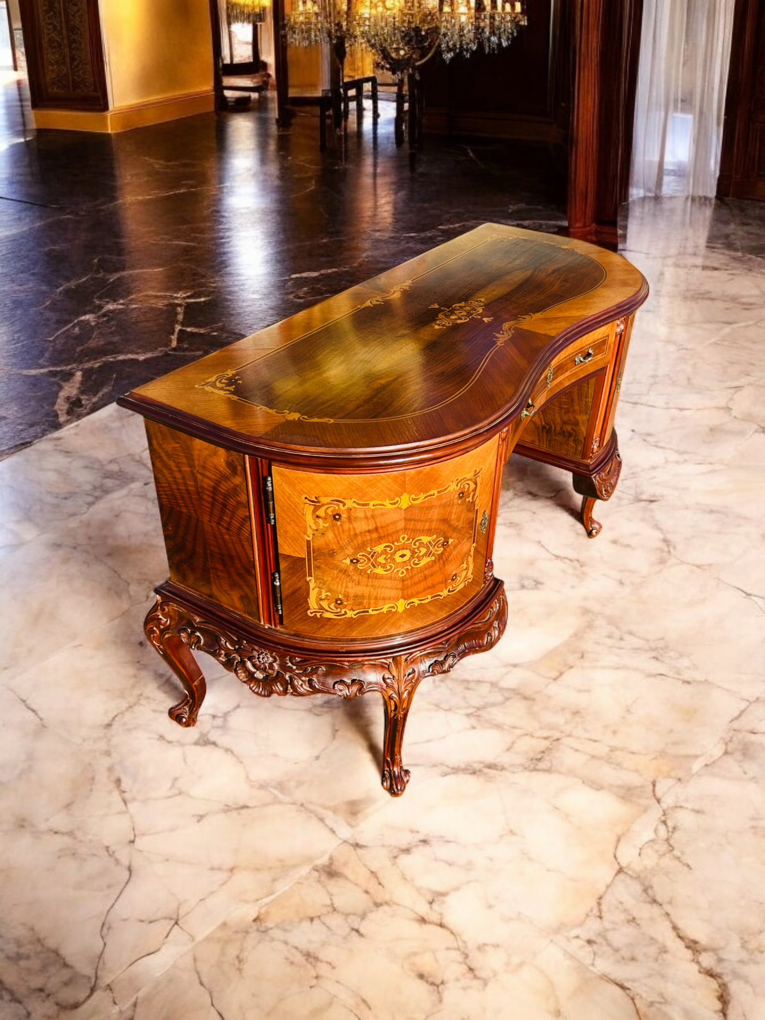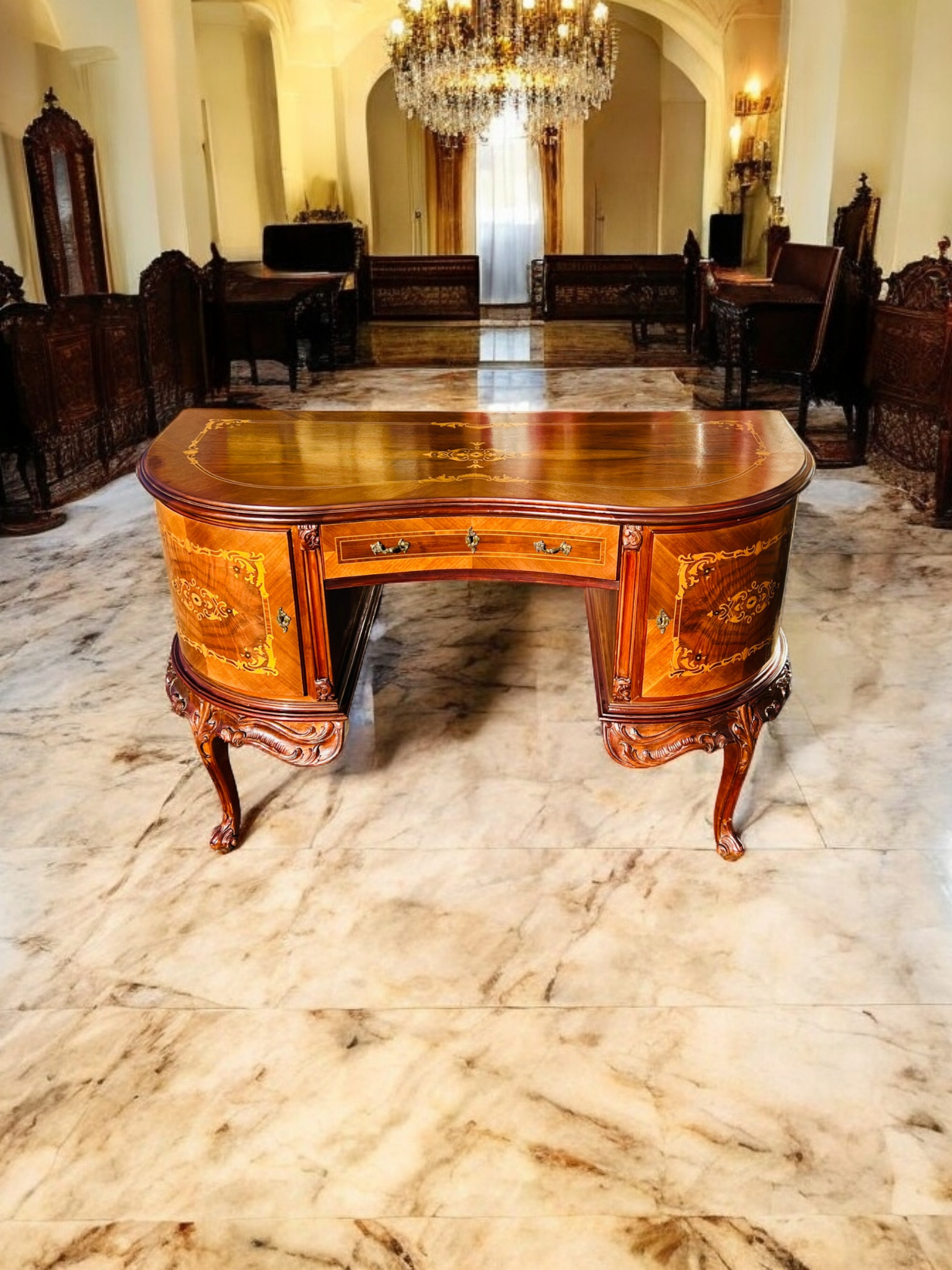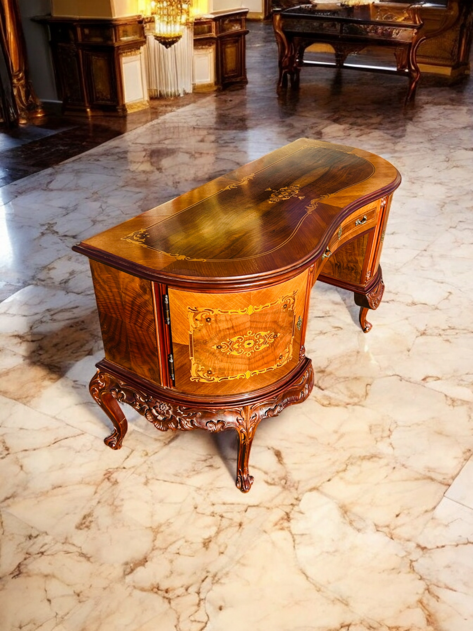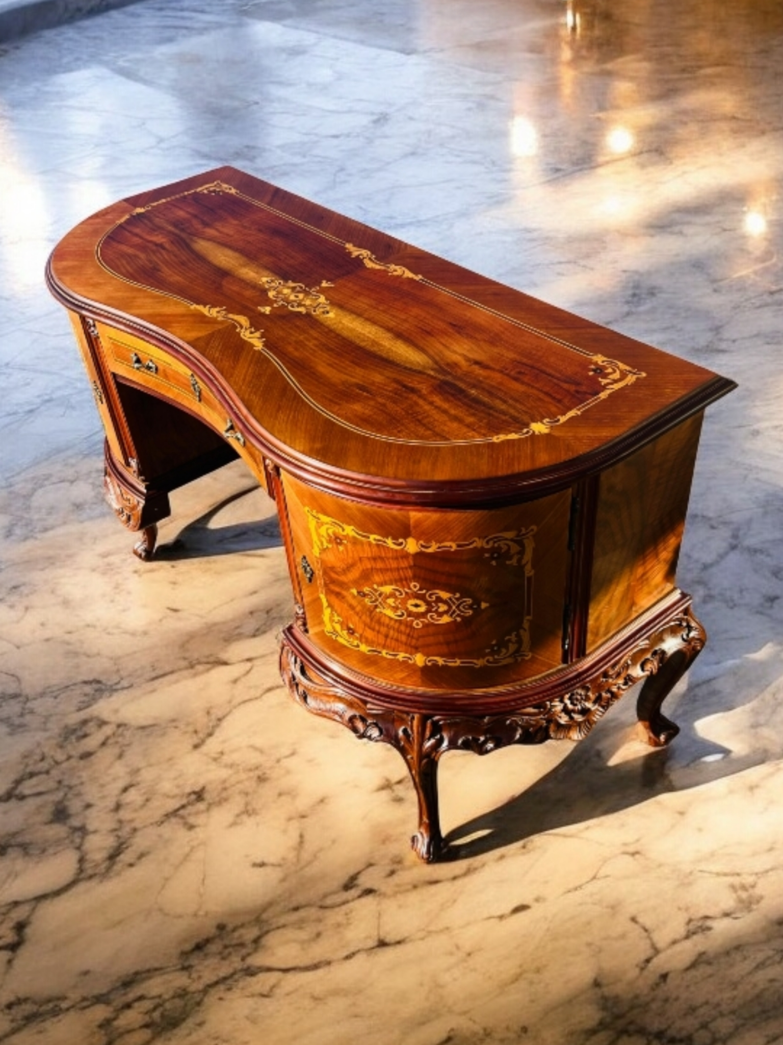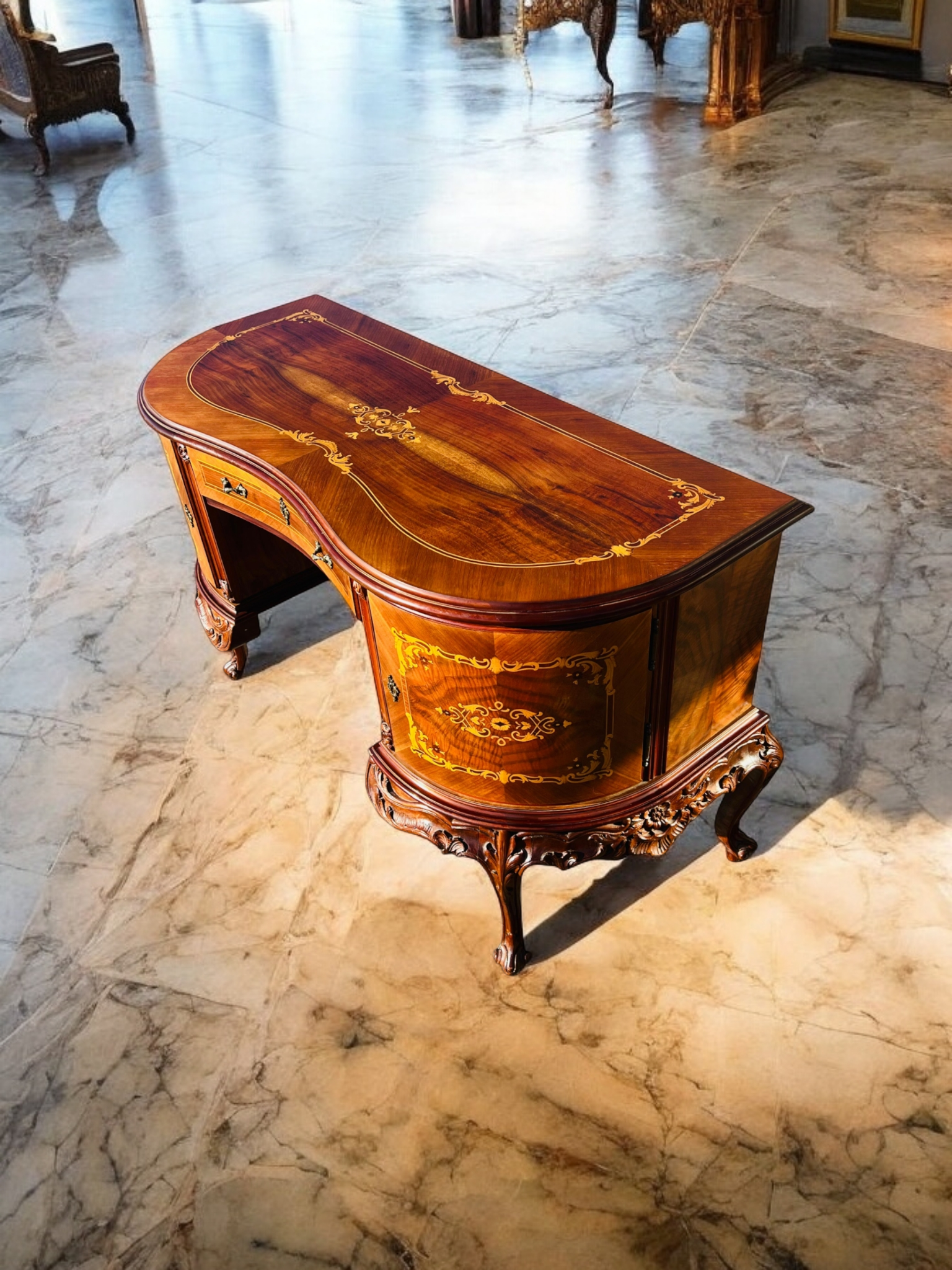 Descripción: Este escritorio no solo es una pieza funcional, sino también una obra de arte que añadirá un toque de distinción a cualquier espacio. Su diseño detallado y sus acabados finos lo convierten en una adición impresionante a oficinas, estudios o como una pieza decorativa en su hogar. Los cajones amplios y los compartimentos laterales ofrecen un almacenamiento práctico sin sacrificar el estilo.
