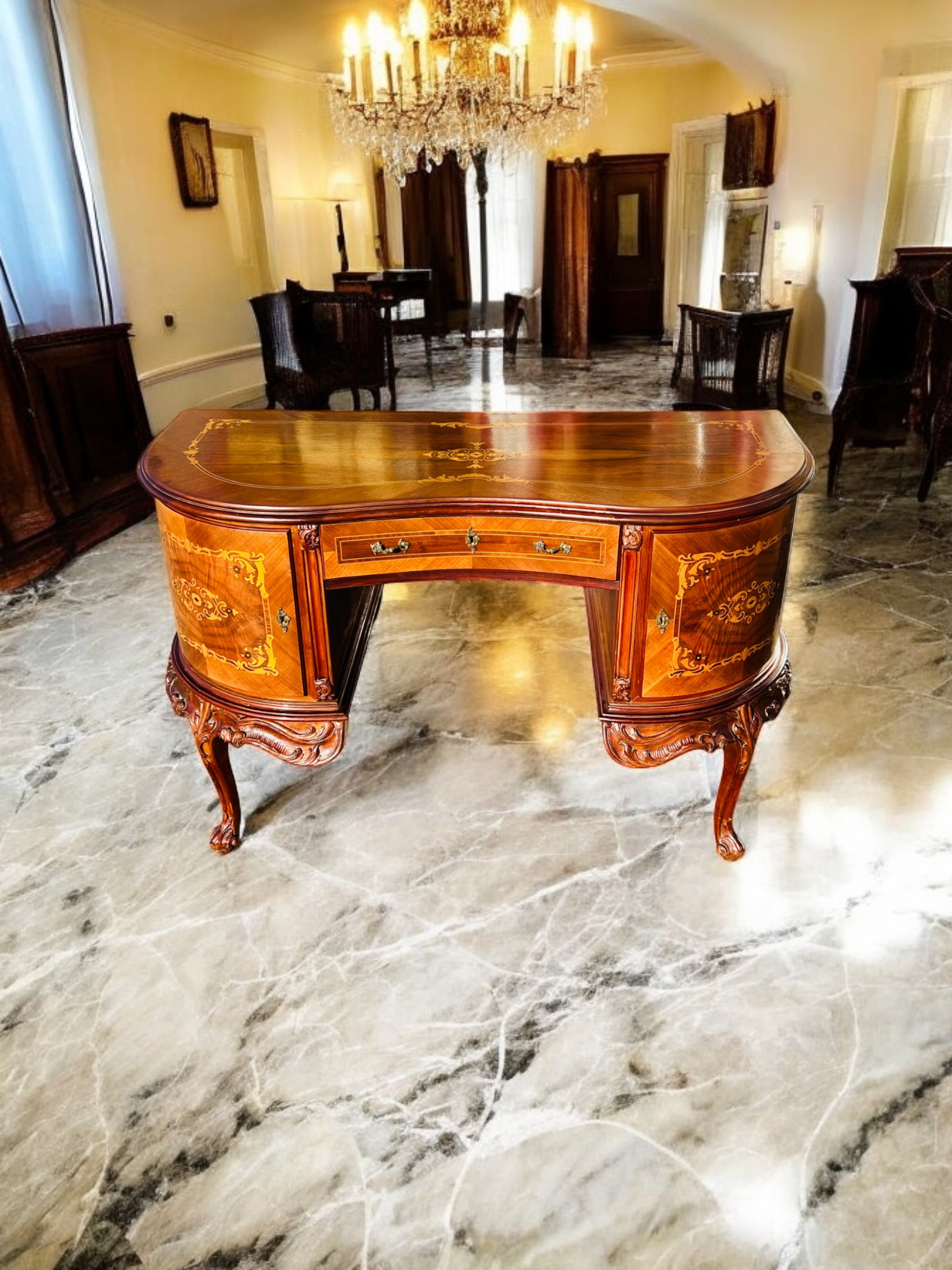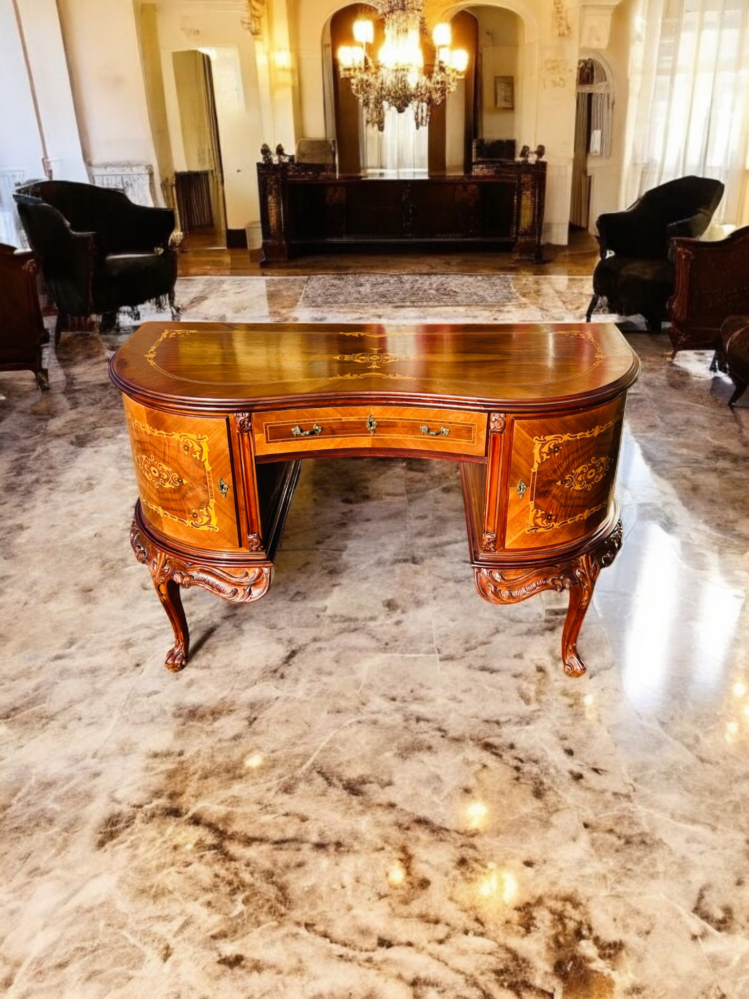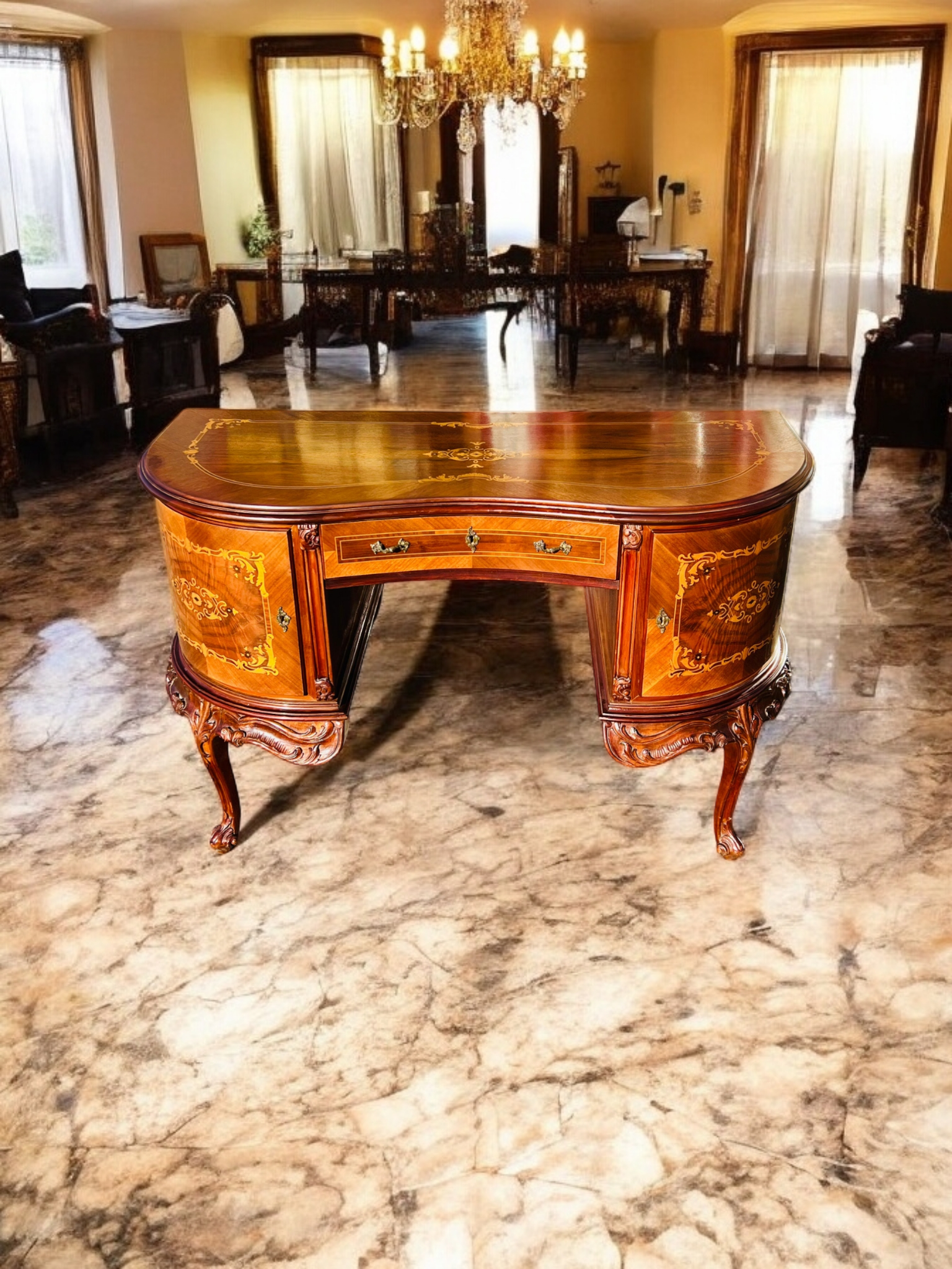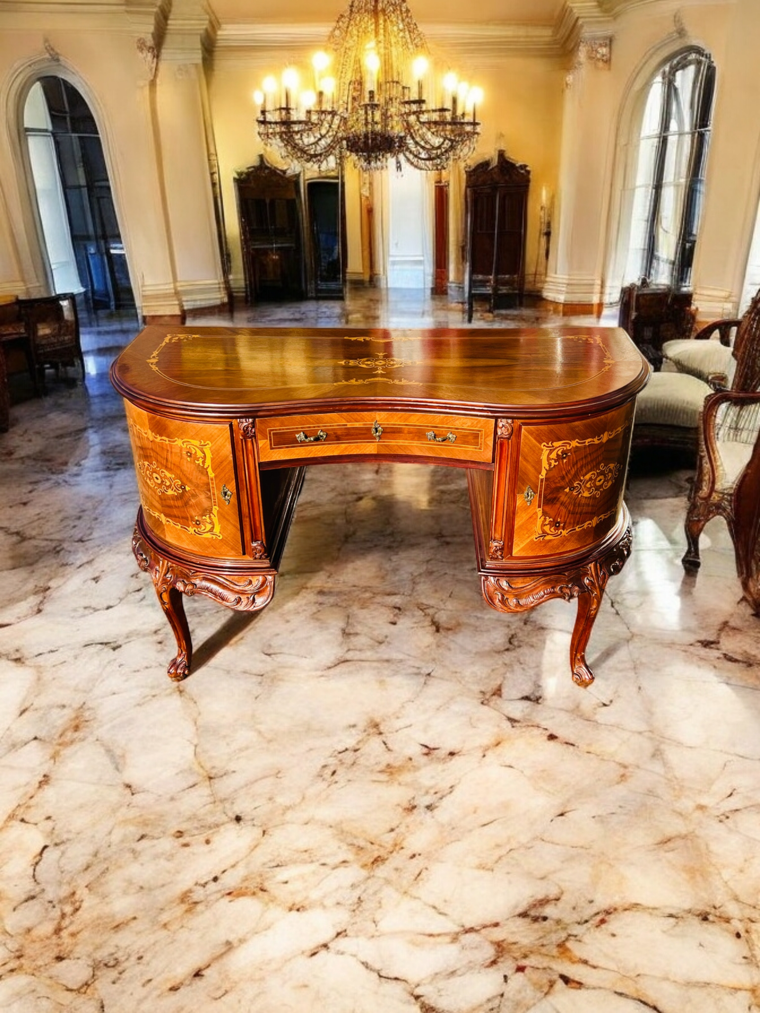 Descripción: Este escritorio no solo es una pieza funcional, sino también una obra de arte que añadirá un toque de distinción a cualquier espacio. Su diseño detallado y sus acabados finos lo convierten en una adición impresionante a oficinas, estudios o como una pieza decorativa en su hogar. Los cajones amplios y los compartimentos laterales ofrecen un almacenamiento práctico sin sacrificar el estilo.