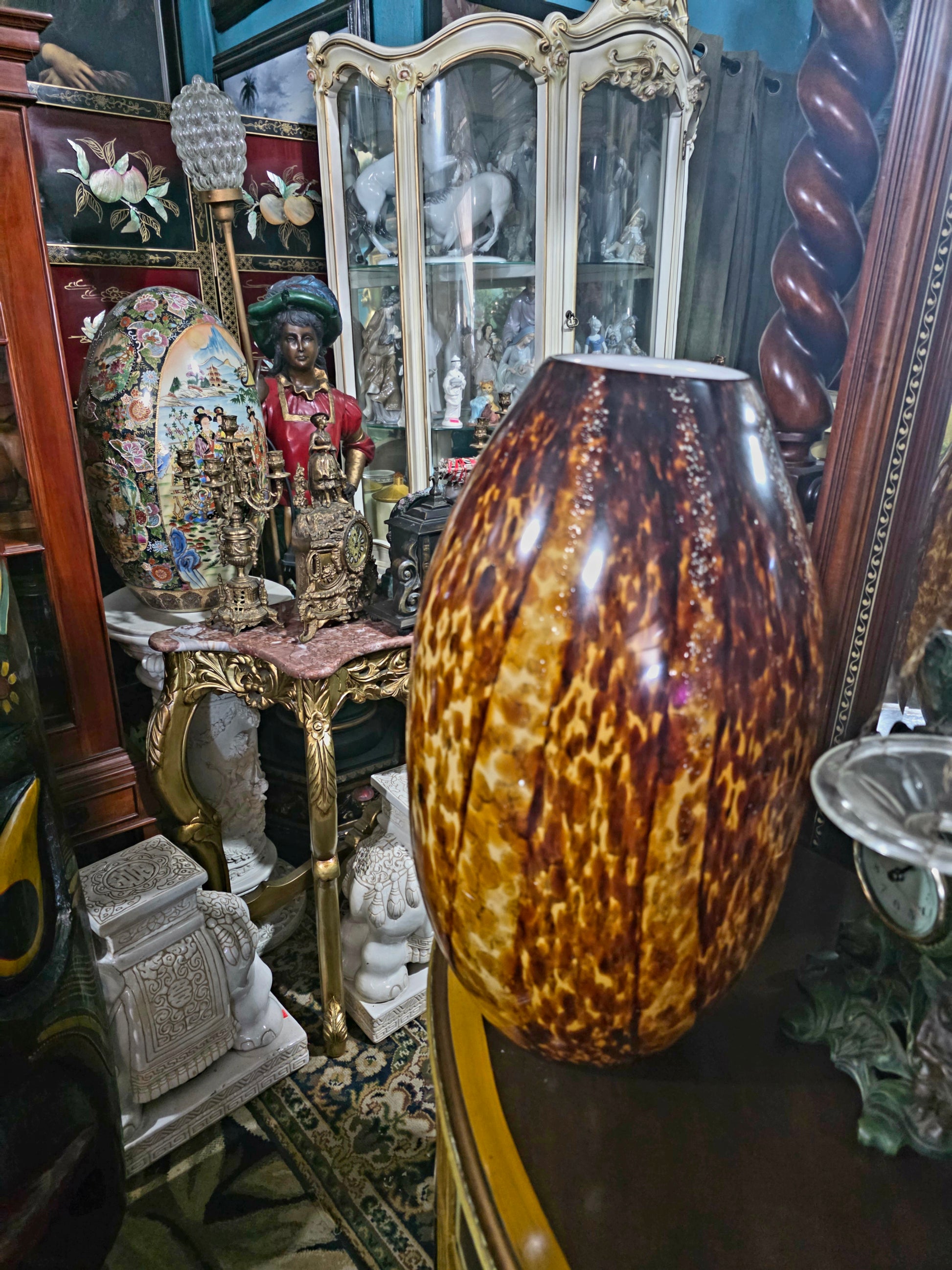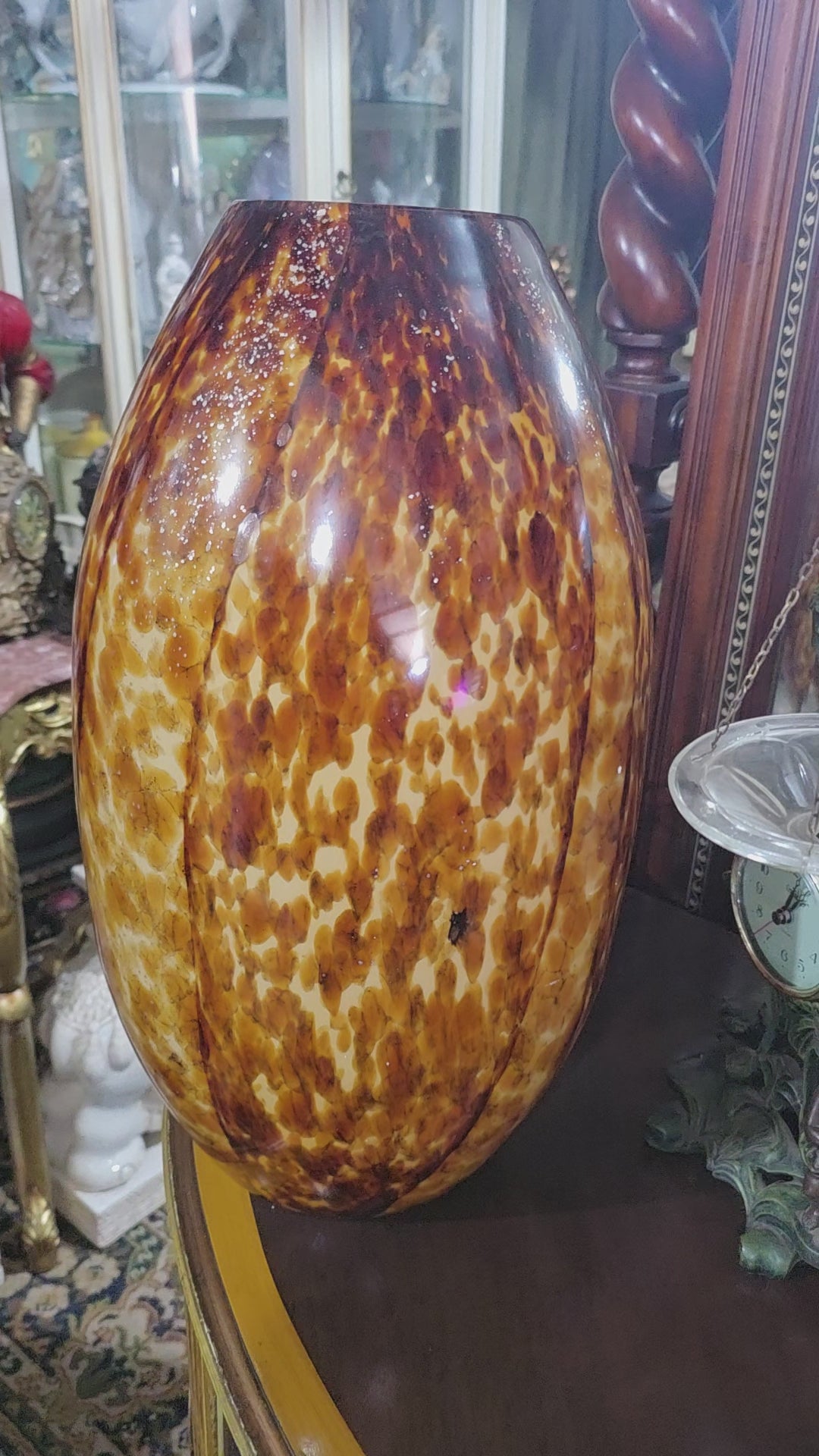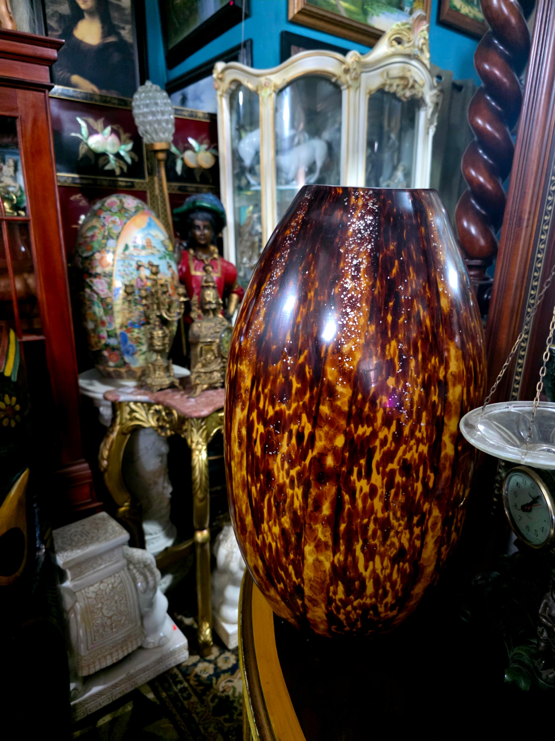 Presentamos un imponente jarrón Murano de gran formato, elaborado artesanalmente en vidrio soplado con acabado tipo carey. Su superficie brillante revela una danza de tonos ámbar, marrón profundo y destellos dorados, creando un efecto visual que recuerda la nobleza del cristal antiguo y la riqueza de las texturas naturales. Cada curva y matiz refleja la maestría de los artesanos italianos, fusionando tradición y sofisticación.