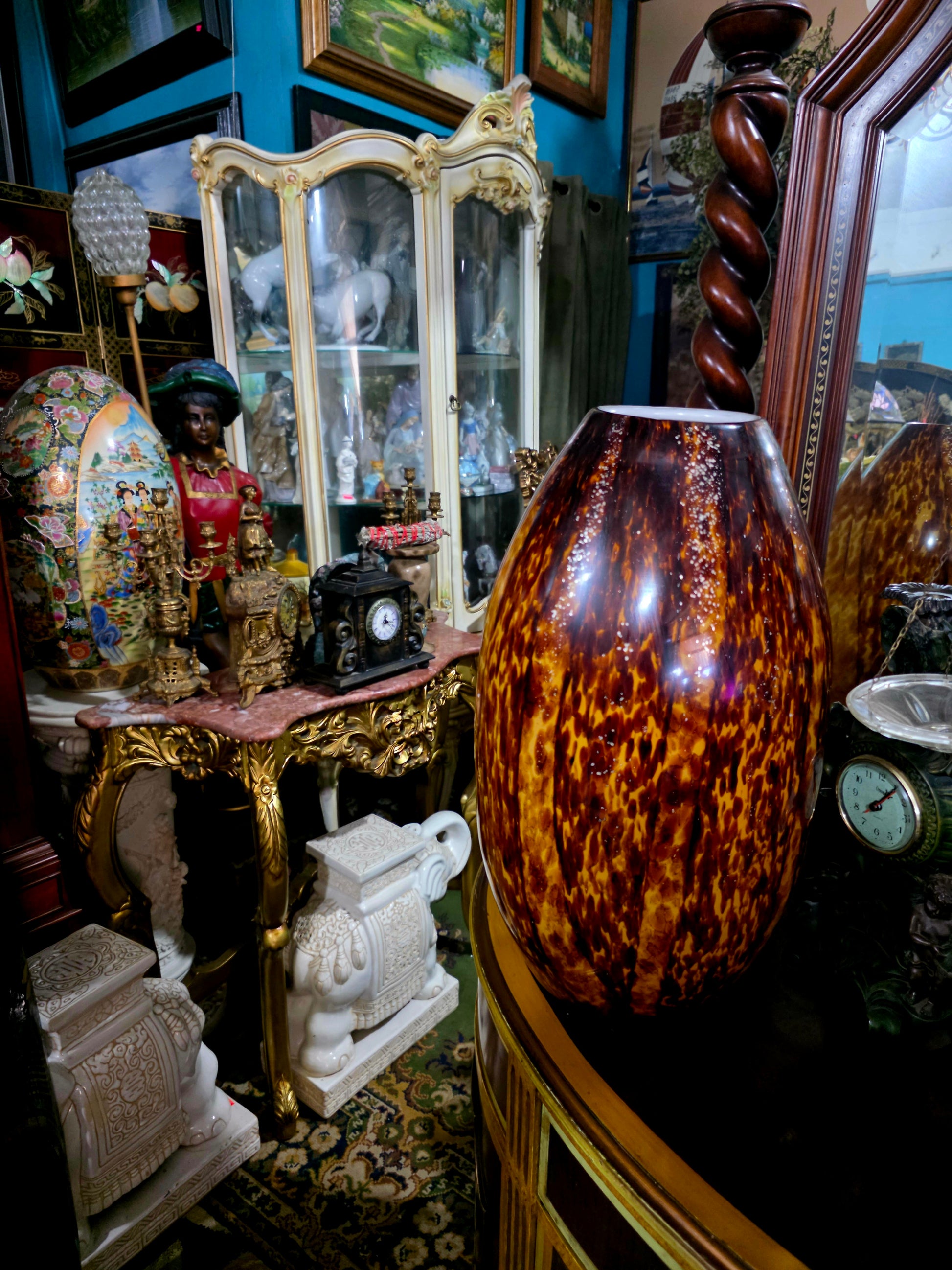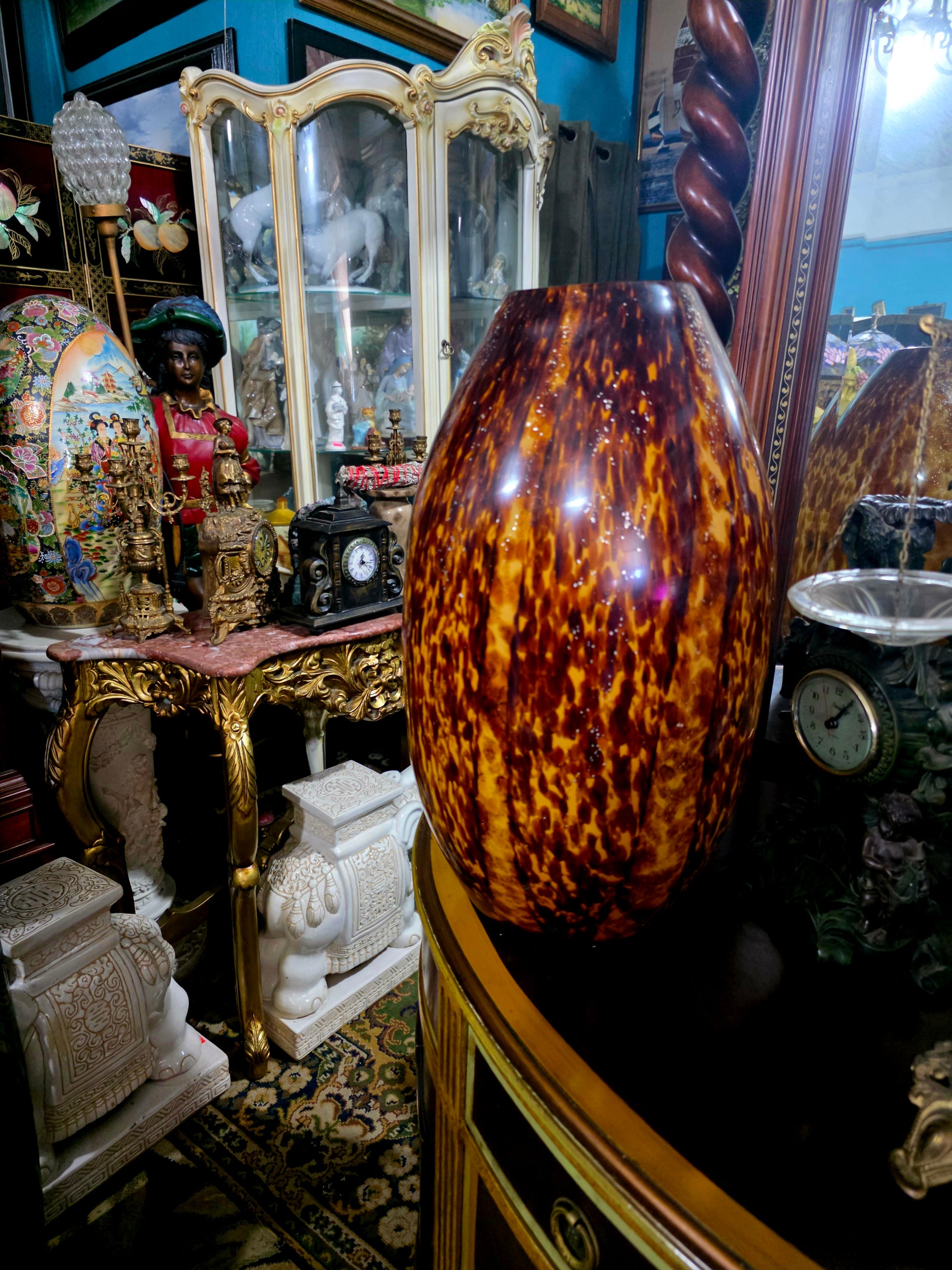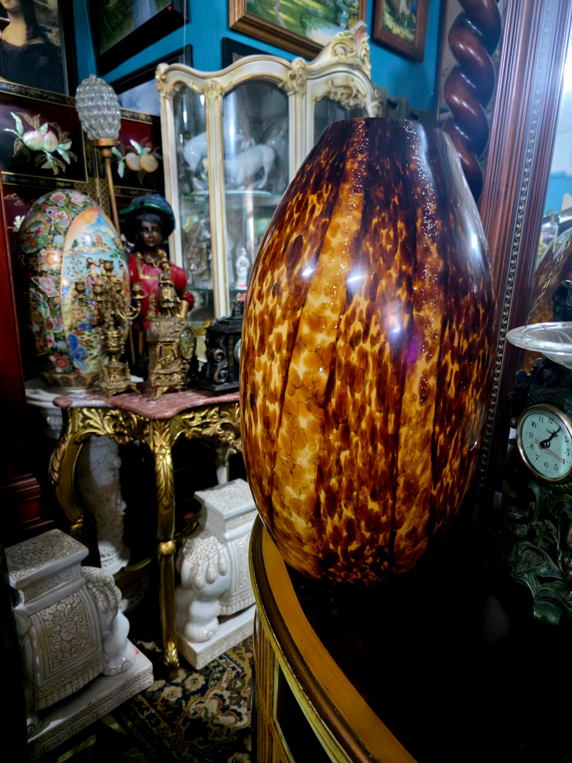 Presentamos un imponente jarrón Murano de gran formato, elaborado artesanalmente en vidrio soplado con acabado tipo carey. Su superficie brillante revela una danza de tonos ámbar, marrón profundo y destellos dorados, creando un efecto visual que recuerda la nobleza del cristal antiguo y la riqueza de las texturas naturales. Cada curva y matiz refleja la maestría de los artesanos italianos, fusionando tradición y sofisticación.
