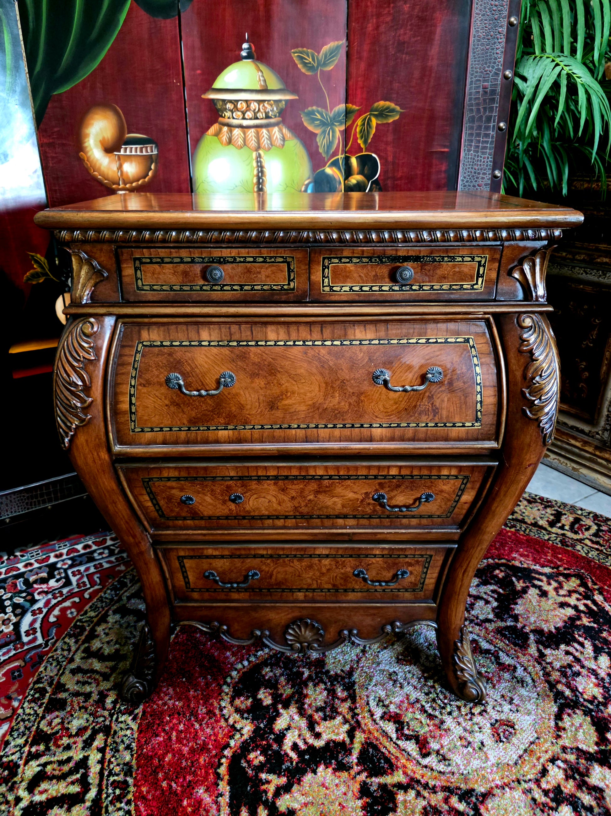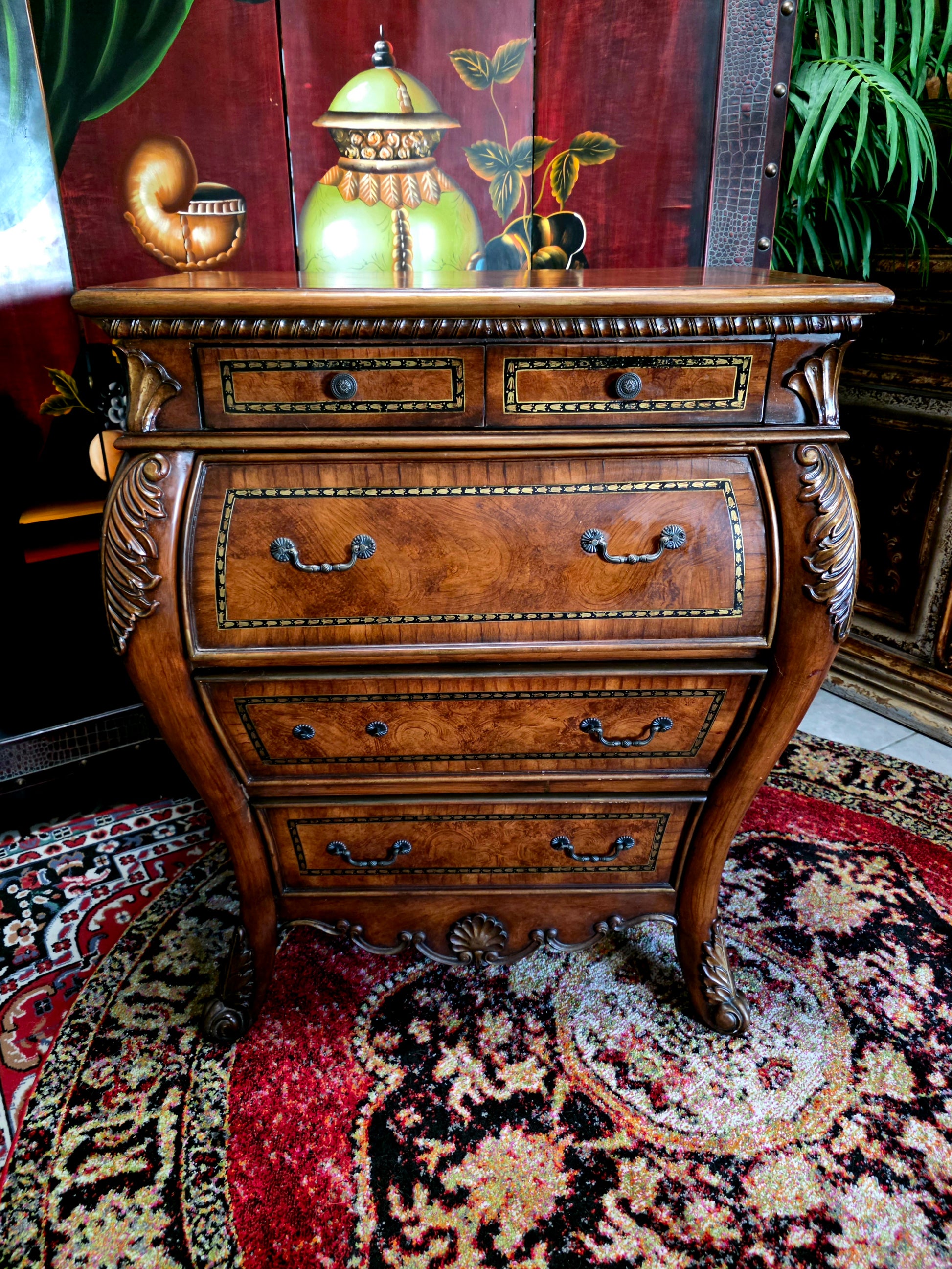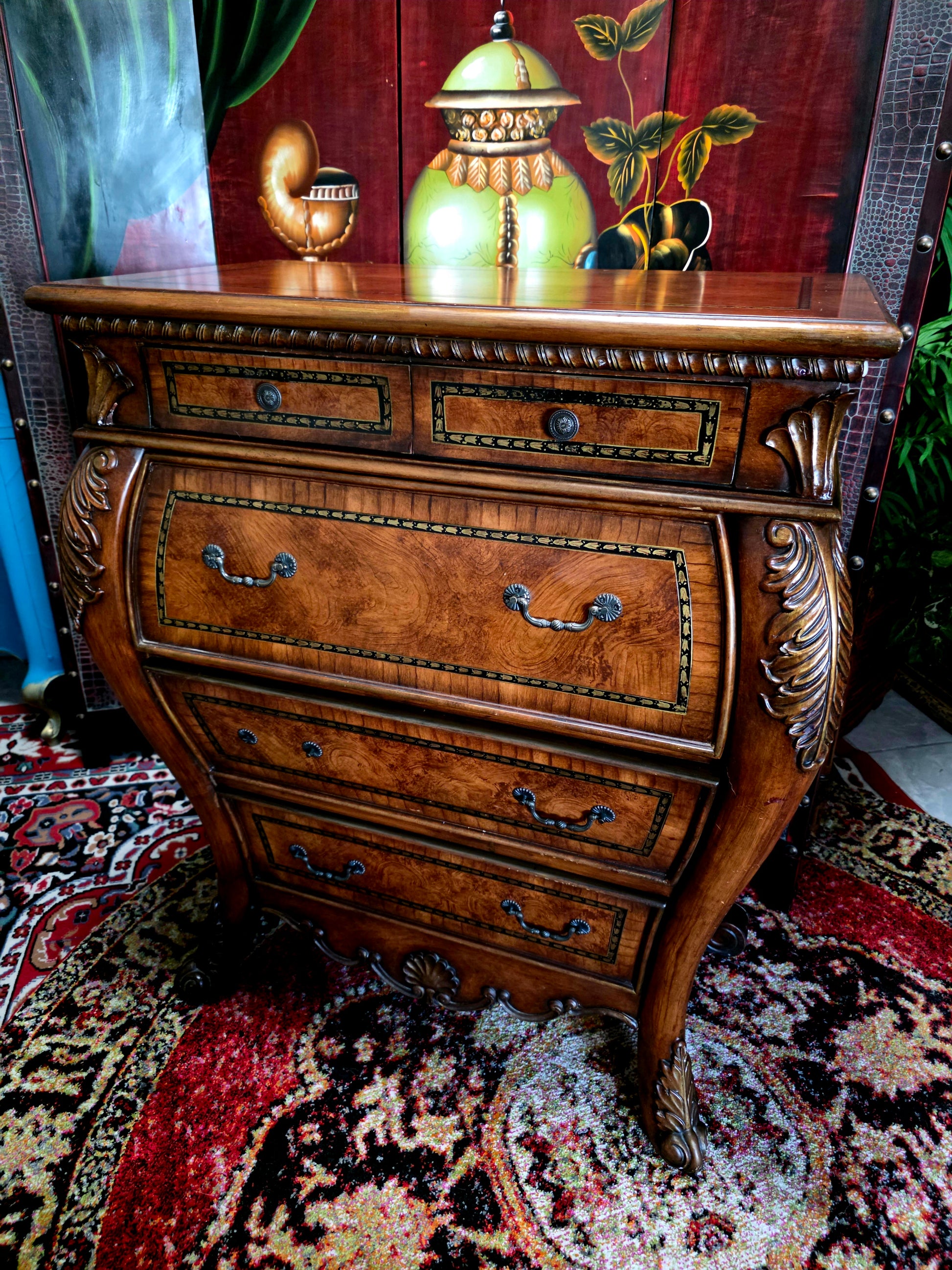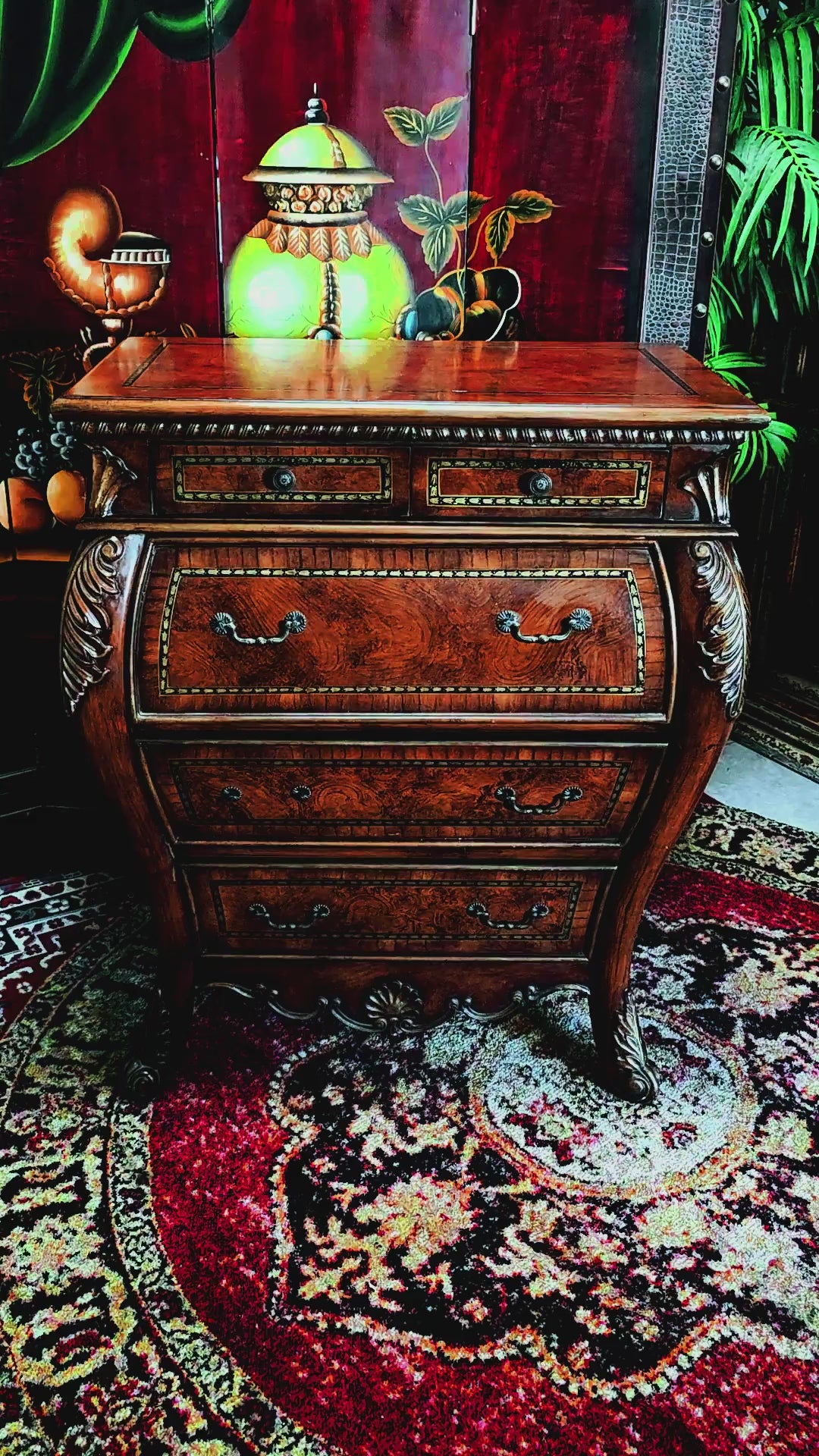 Estructura bombé: El cuerpo sinuoso, con frente y costados curvados, evoca la tradición del mobiliario europeo del siglo XVIII, combinando sensualidad visual con presencia escultural.