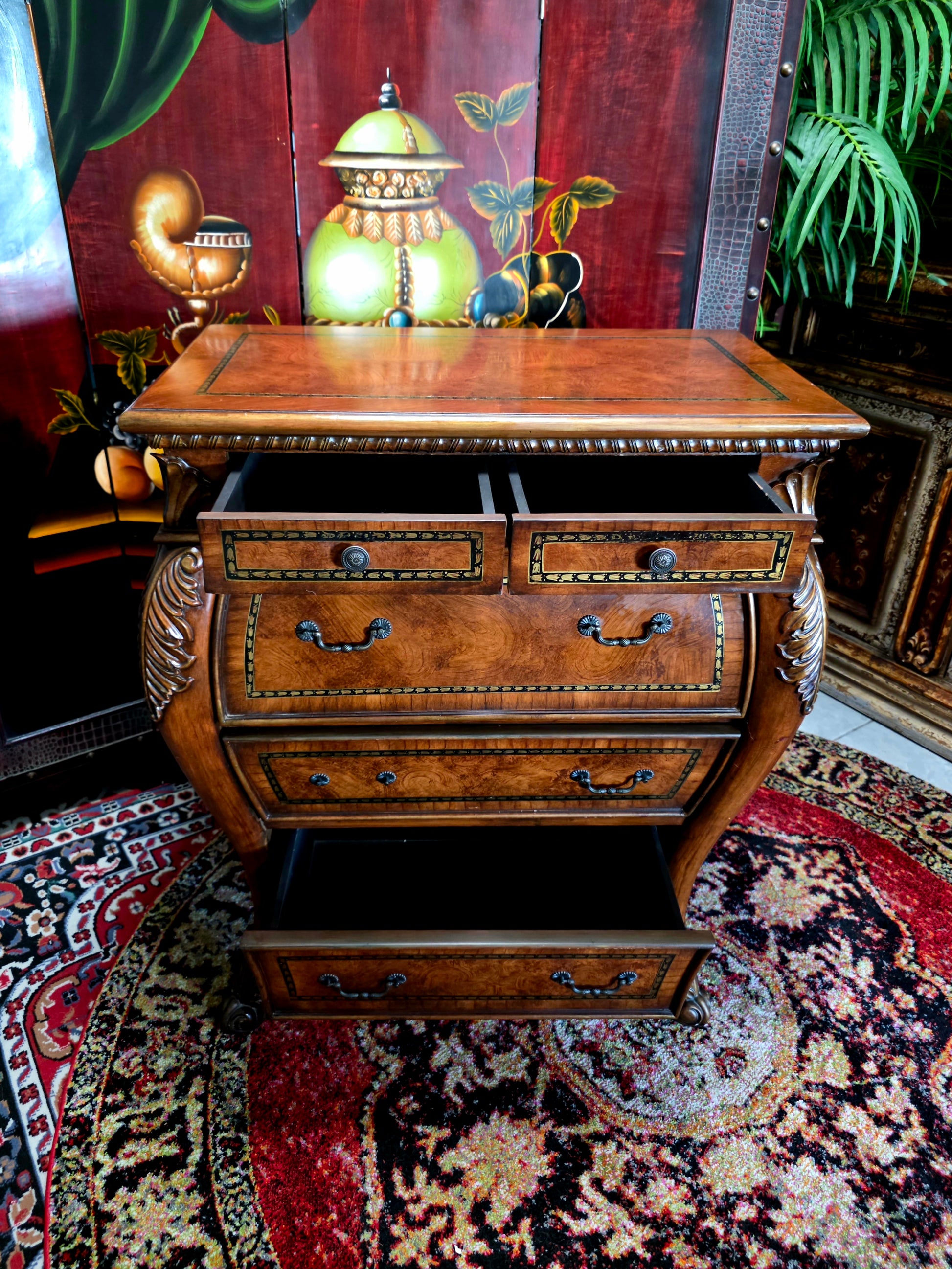 Rosarito Antiques presenta una pieza de distinción funcional y estética: un secreter bombé de cuatro cajones, cuya silueta curvada y tapa abatible revelan un universo interior de organización y elegancia.