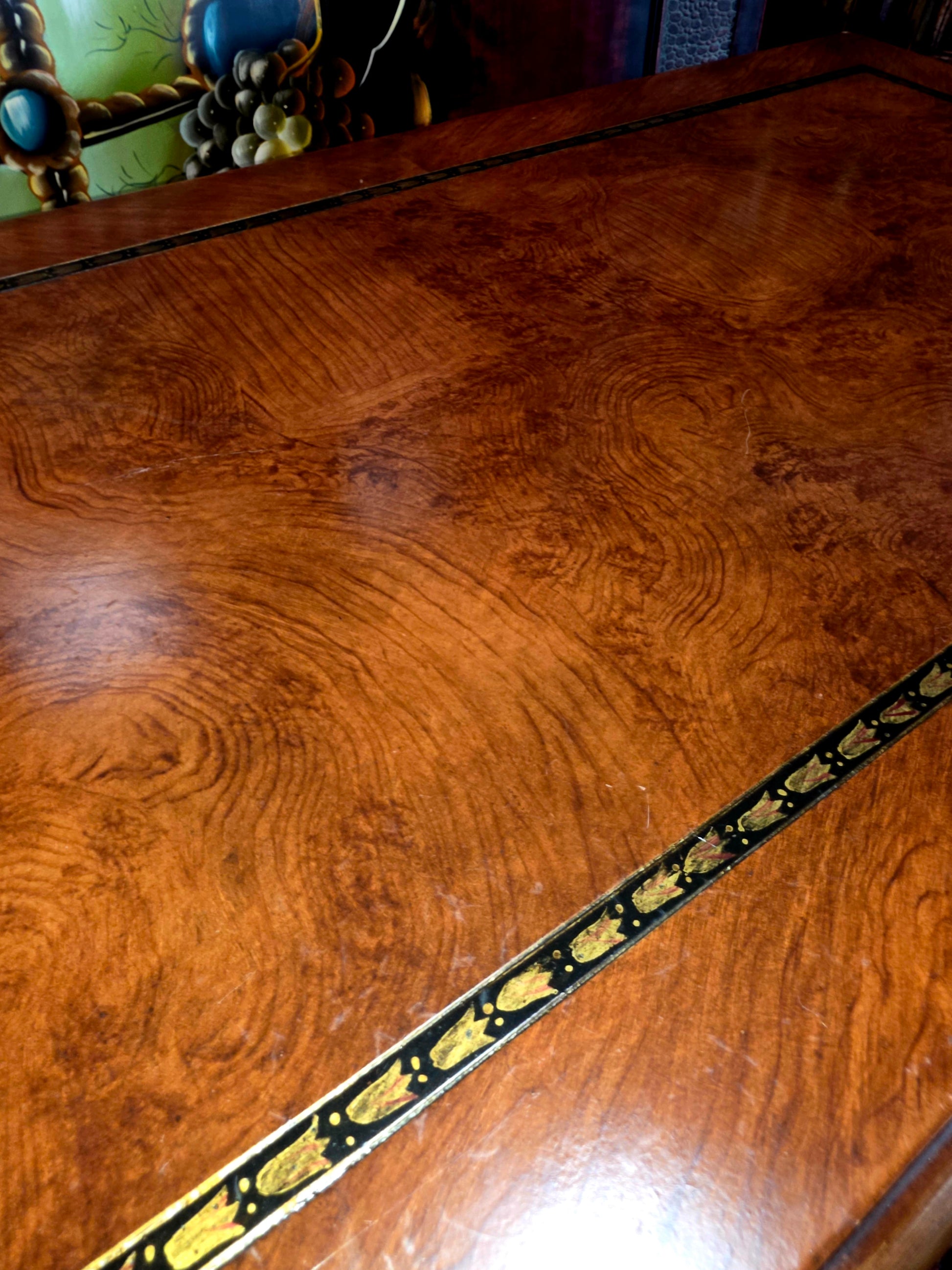 Incrustaciones en fresno burl: Cada panel está realzado con marquetería en fresno burl, cuyos matices dorados y plateados aportan profundidad y luminosidad al acabado envejecido.
