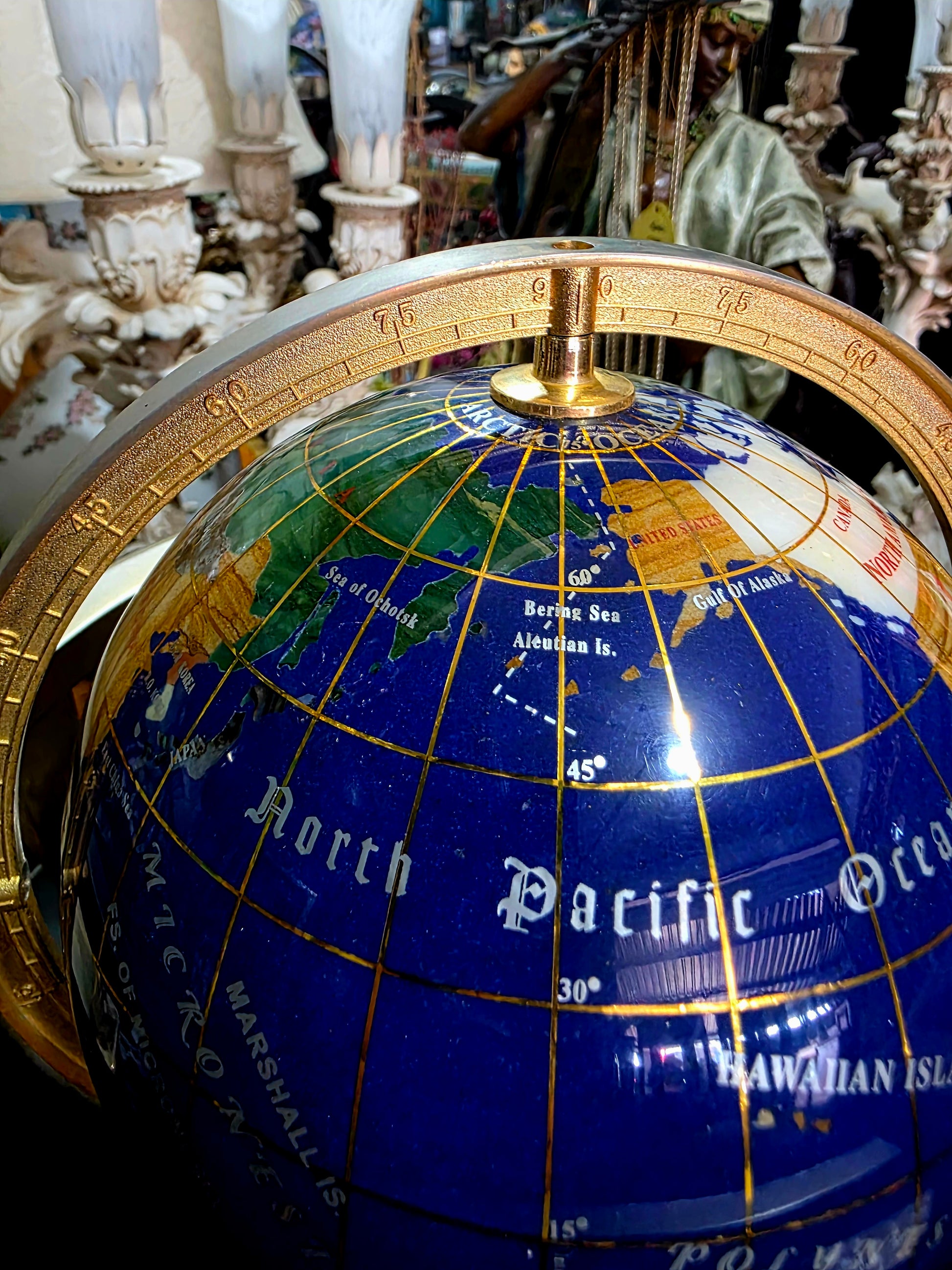 Con una presencia que evoca los salones de estudio de antaño, este globo decorativo se alza sobre una base circular de metal color oro, irradiando calidez, sofisticación y un aire de exploración noble. La esfera, detallada con precisión cartográfica, muestra el hemisferio oriental con países como India, China, Rusia y Arabia Saudita, acompañados por los vastos océanos que los rodean. Las líneas doradas de latitud y longitud trazan rutas imaginarias, mientras la tipografía clásica añade un toque de distinción.  Minimos detalles de antiguedad.