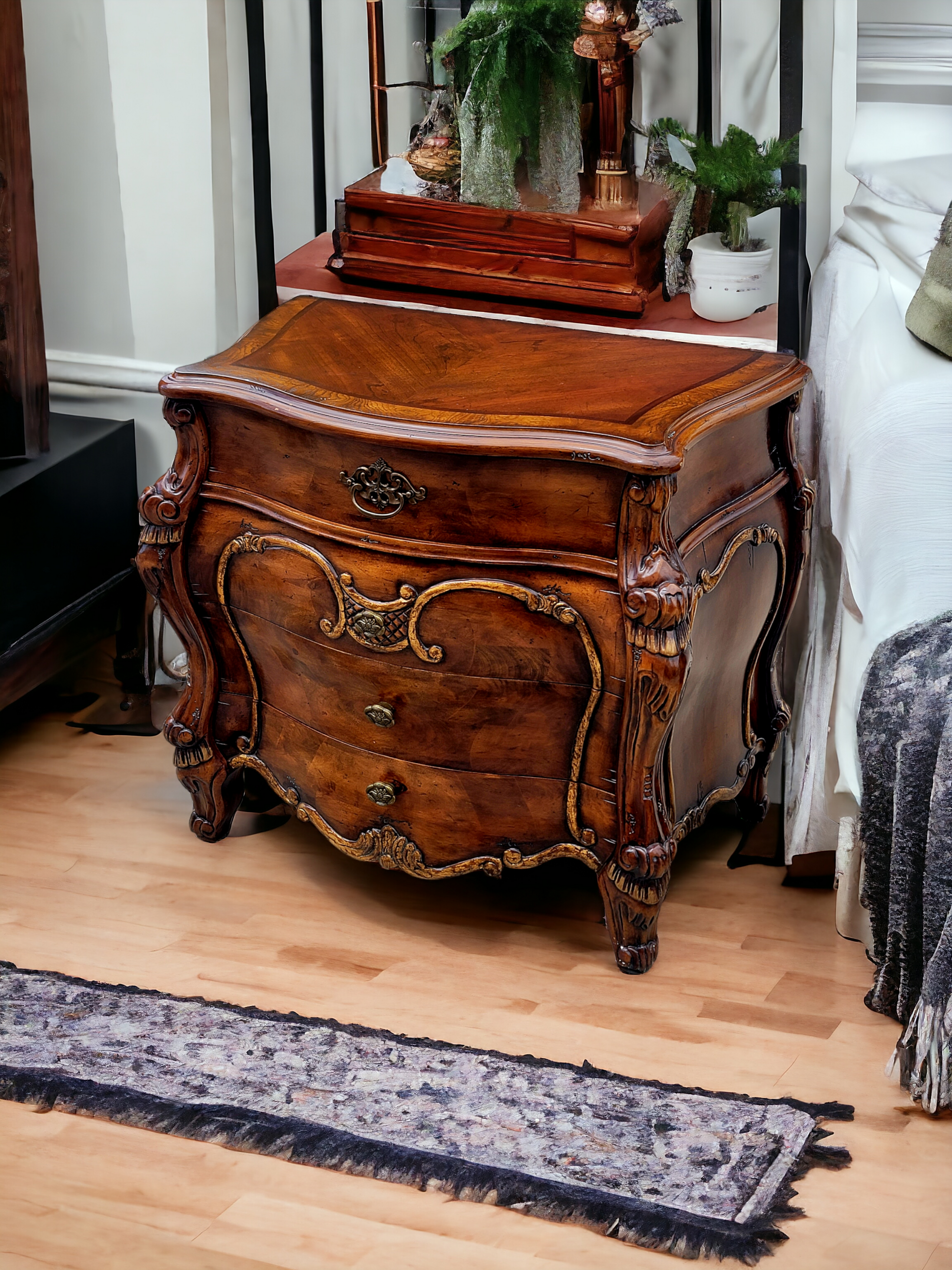 Amplio almacenamiento: Cada buró cuenta con cuatro cajones espaciosos y elegantes tiradores ornamentados, perfectos para mantener tu espacio organizado con estilo.