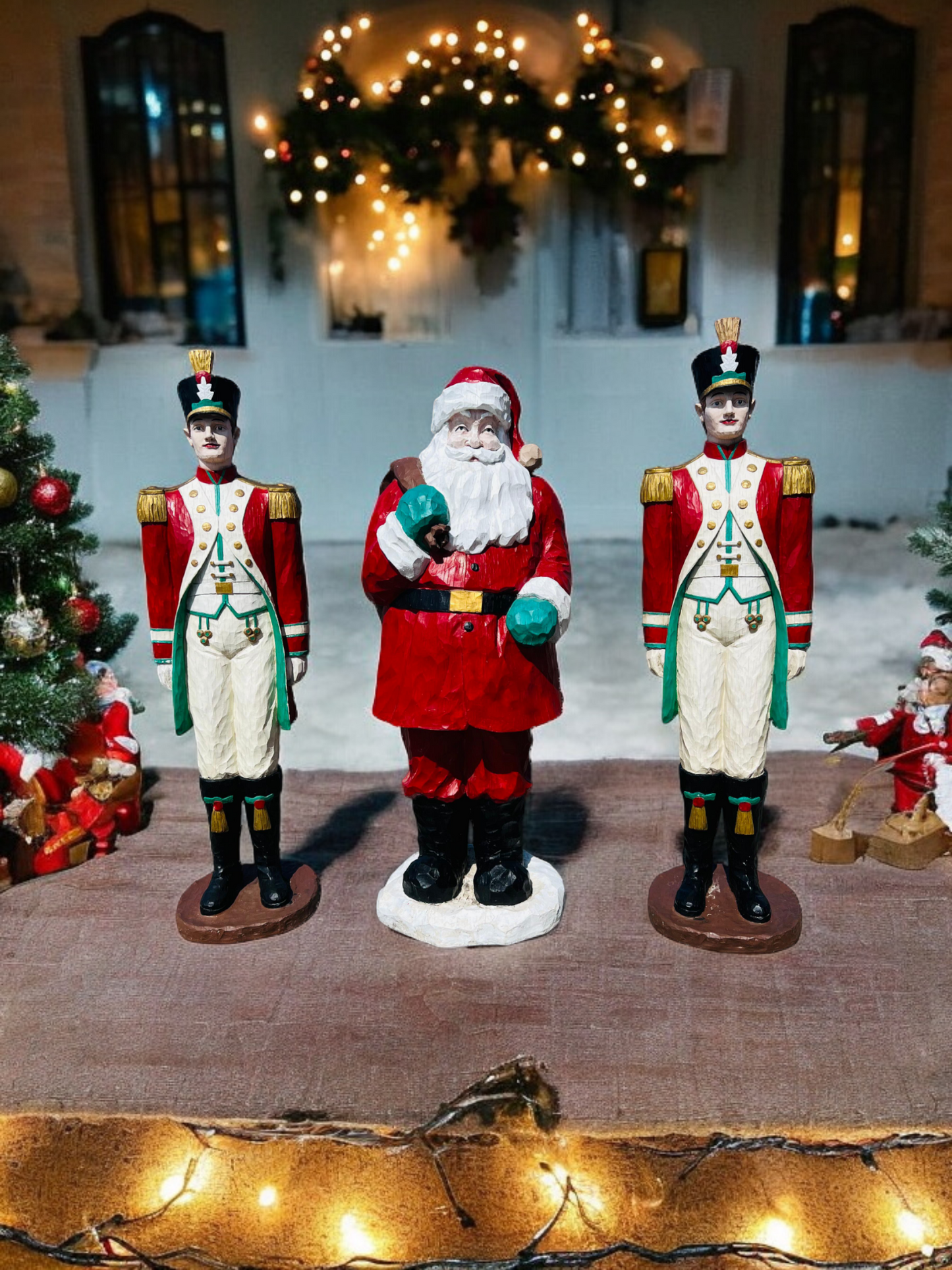 Soldados: Dos soldados con uniformes detallados en colores tradicionales navideños (rojo, blanco y verde), adornados con detalles dorados y sombreros altos que evocan la nostalgia y elegancia de la época festiva.
