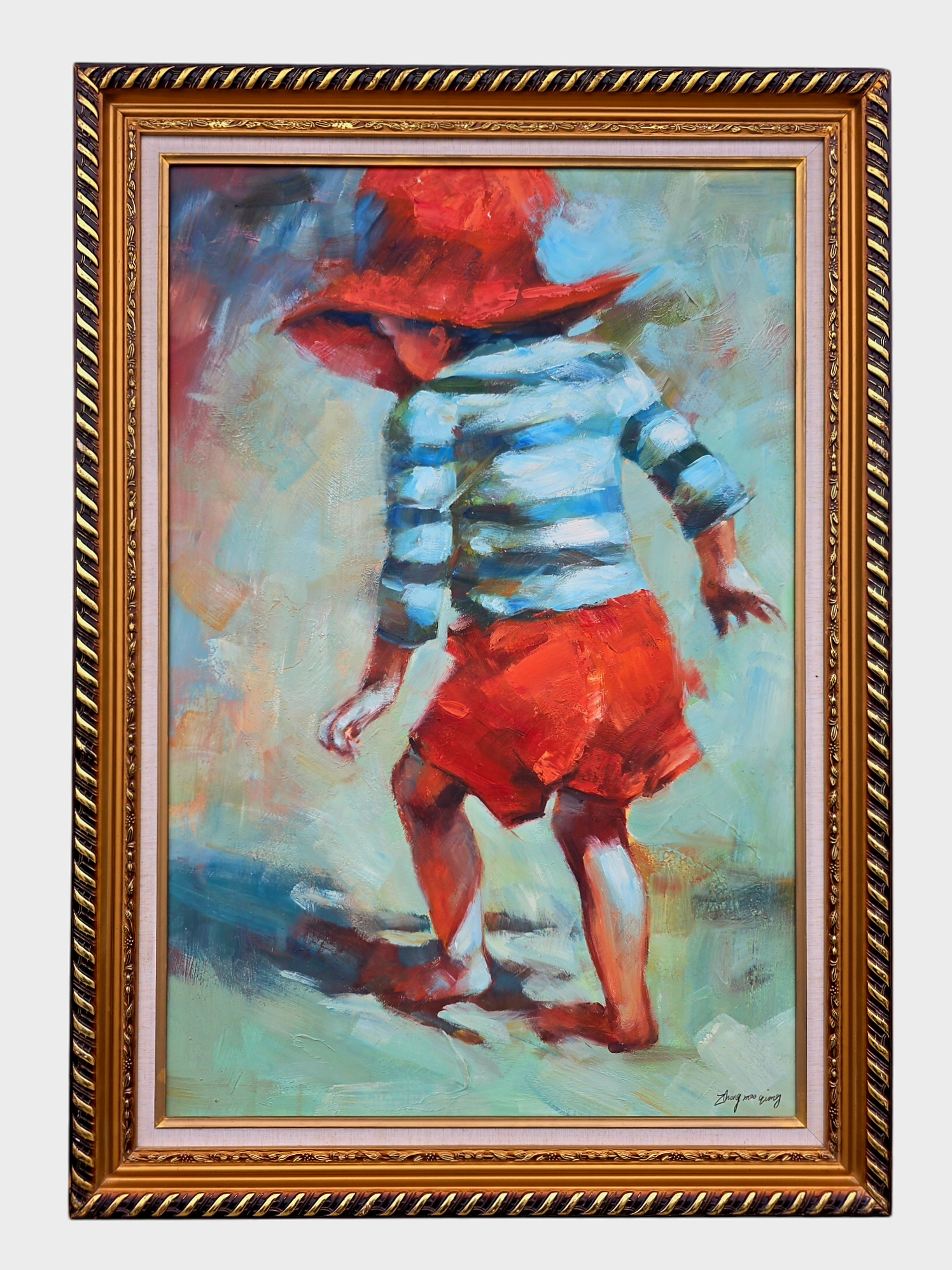 Esta pintura al óleo, firmada por el artista Zhong Mao Qing, captura la fugacidad de la infancia con una ternura que trasciende el lienzo. La figura de un niño visto desde atrás —con sombrero rojo, camisa a rayas y pantalones cortos— se convierte en símbolo de libertad, juego y memoria. El fondo, abstracto y luminoso, sugiere un paisaje emocional más que físico, donde los colores se funden como recuerdos en movimiento.