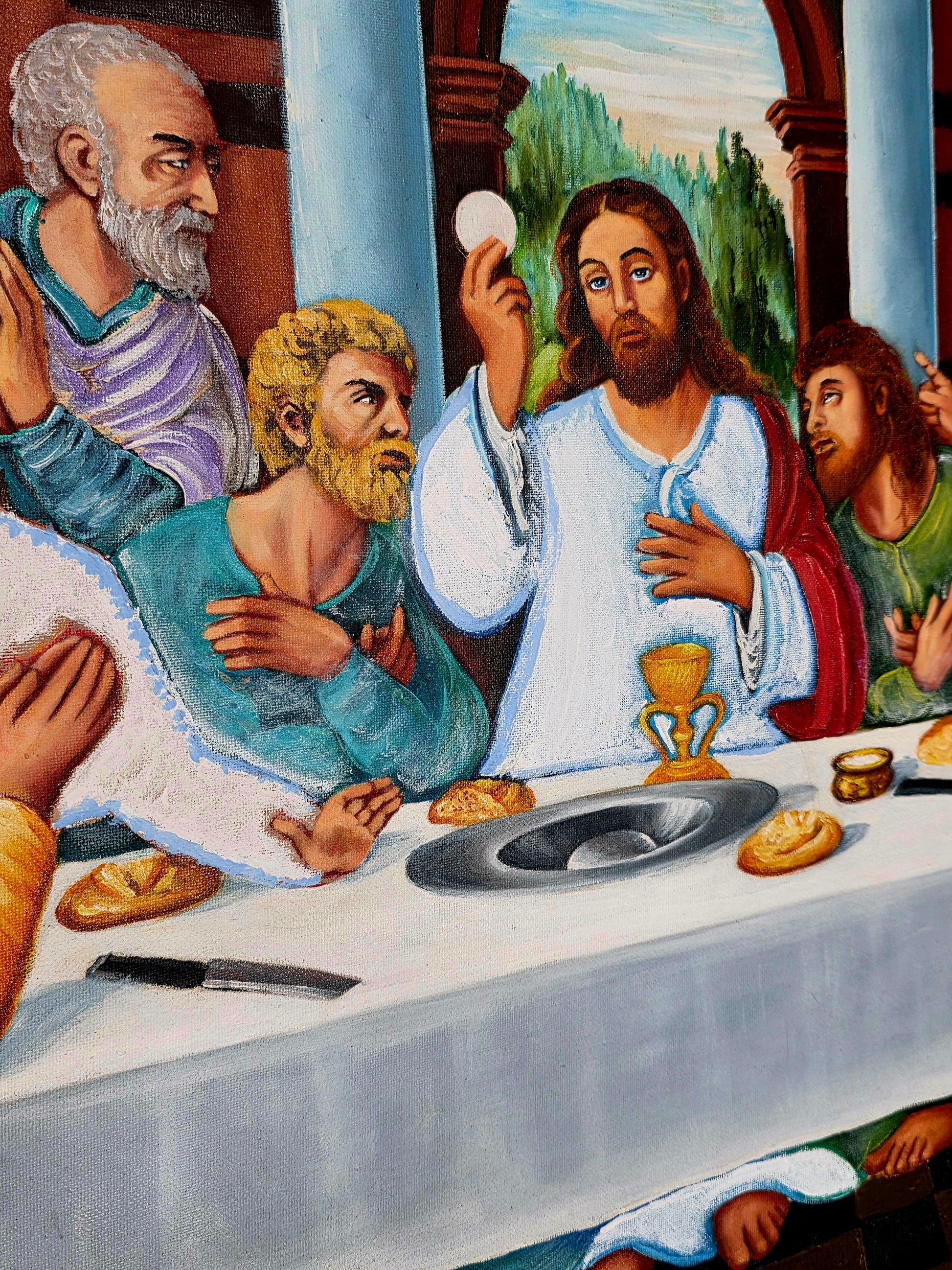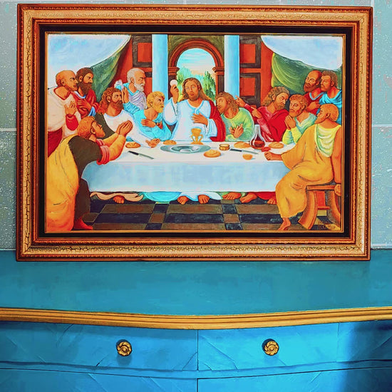 Una obra que trasciende el arte decorativo para convertirse en símbolo de fe, contemplación y legado. Esta representación de La Última Cena, pintada al óleo sobre lienzo, captura con maestría el momento sagrado en que Jesucristo comparte su última comida con los doce apóstoles. Cada rostro, cada gesto, cada sombra está impregnado de emoción y significado.