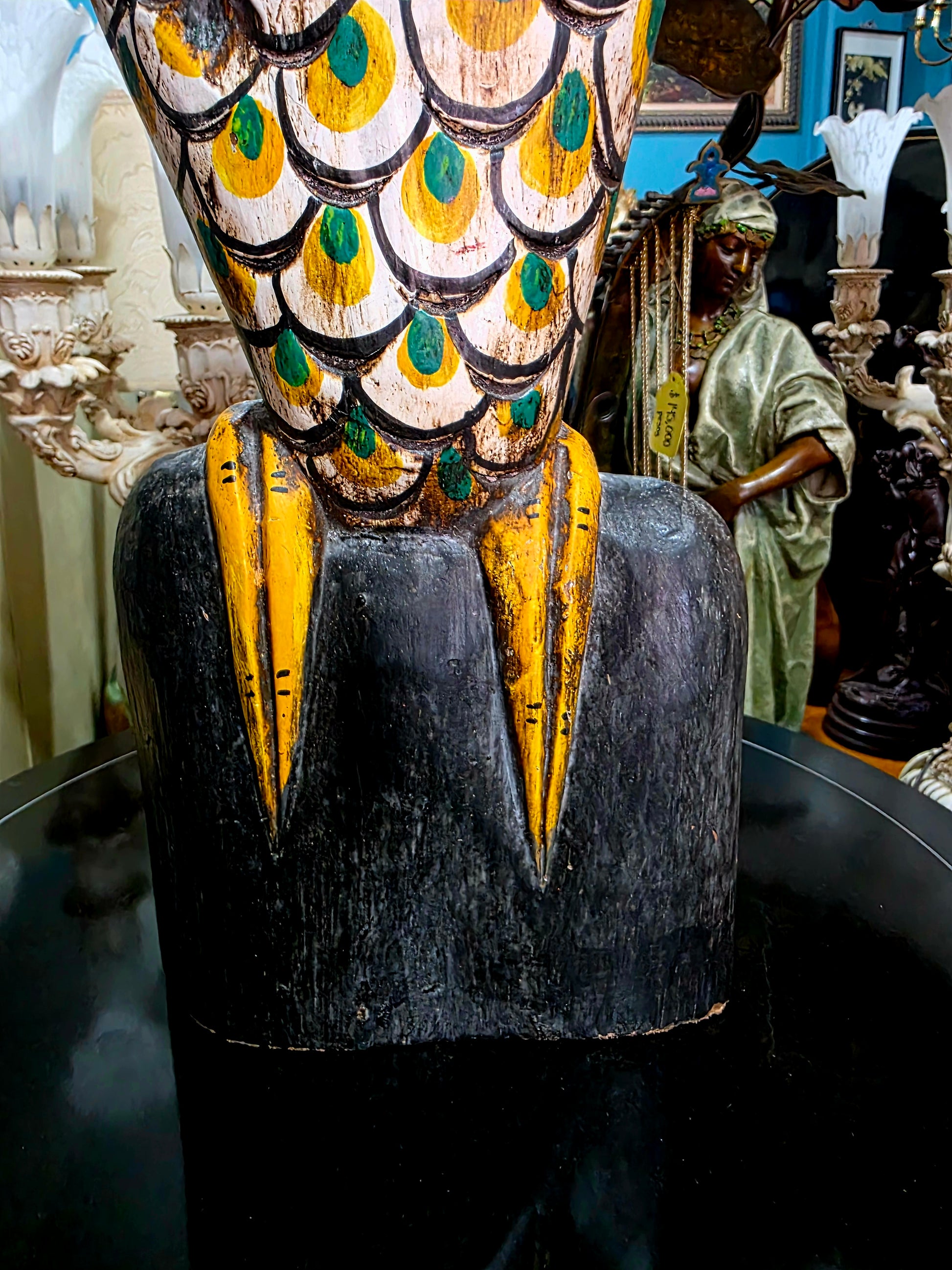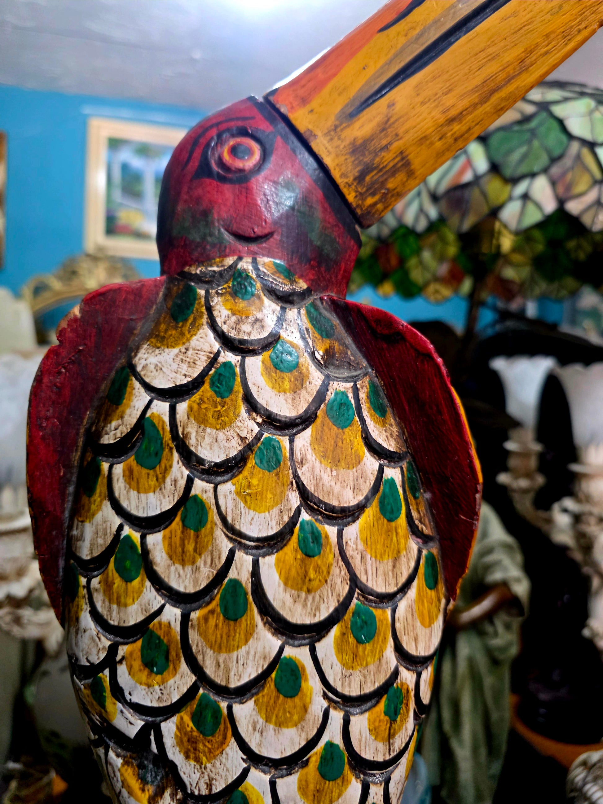 Esta escultura no representa solo un ave exótica, sino una visión: la fusión entre naturaleza estilizada y arte devocional. Su mirada fija y su postura erguida evocan respeto, alegría y carácter. Ideal para coleccionistas, amantes del arte popular o quienes buscan una pieza con alma.