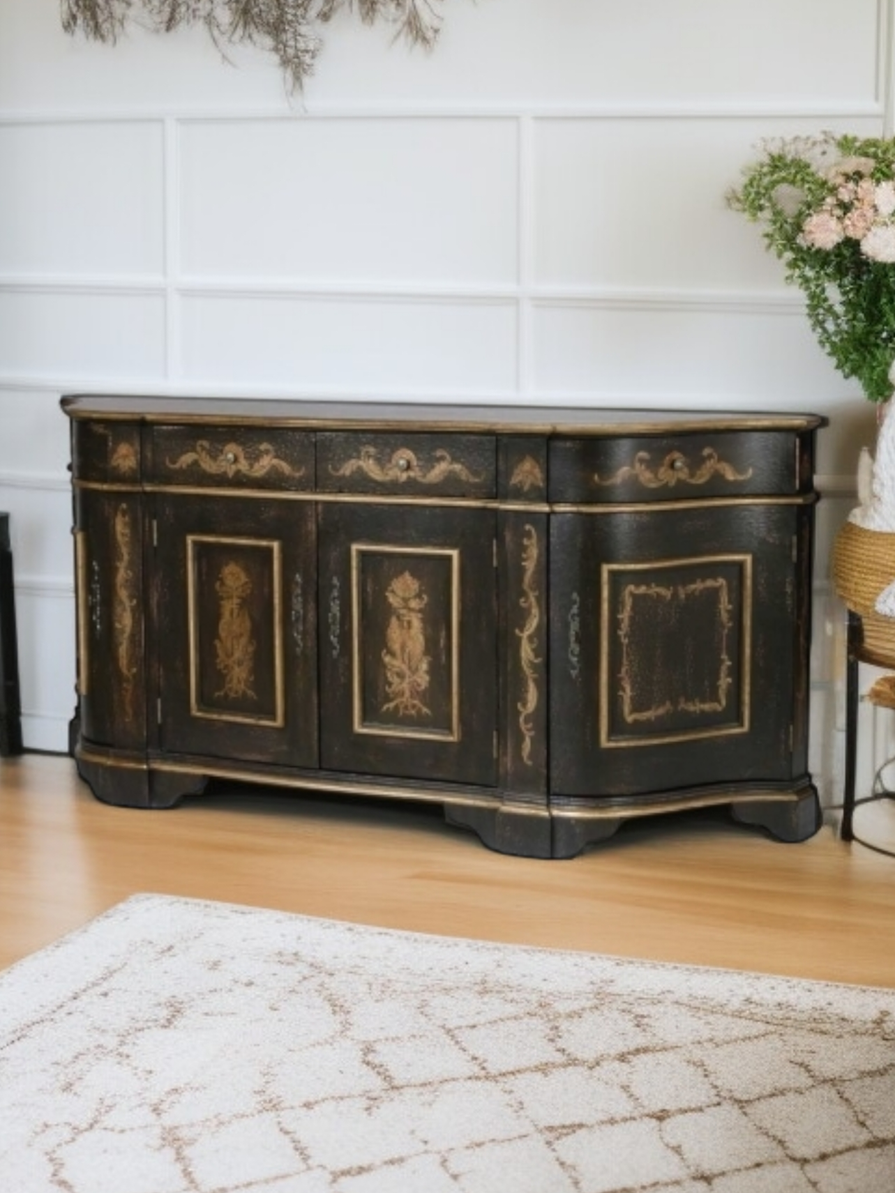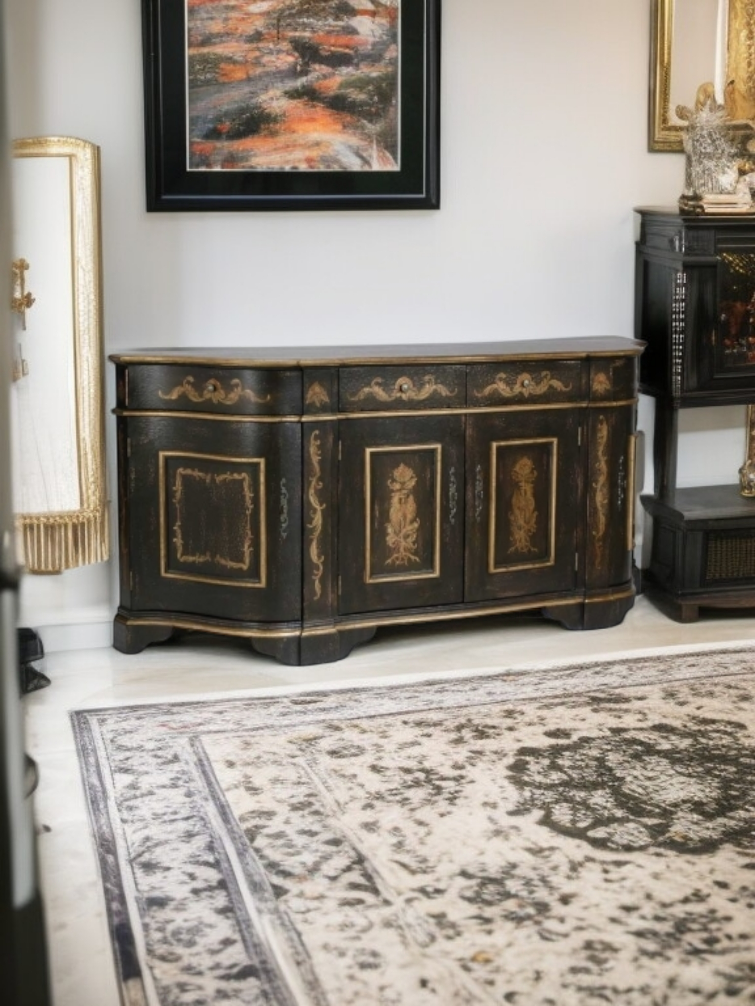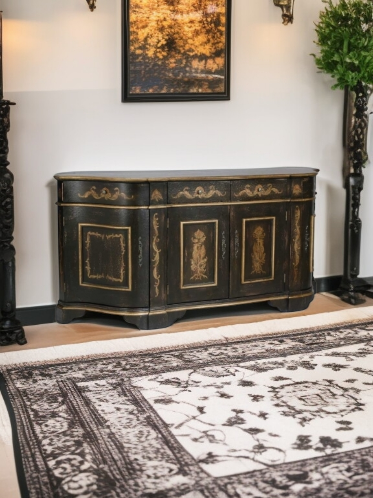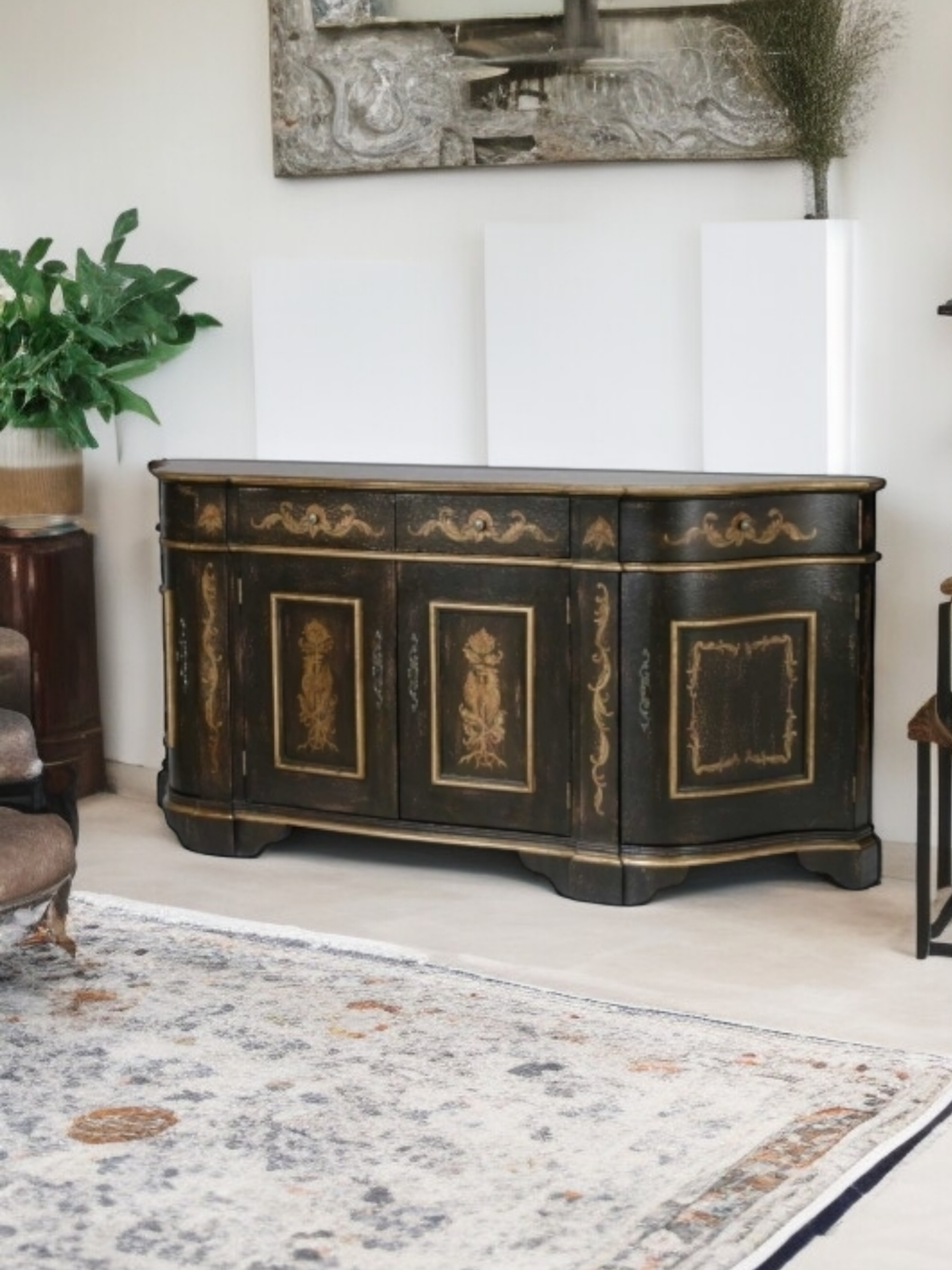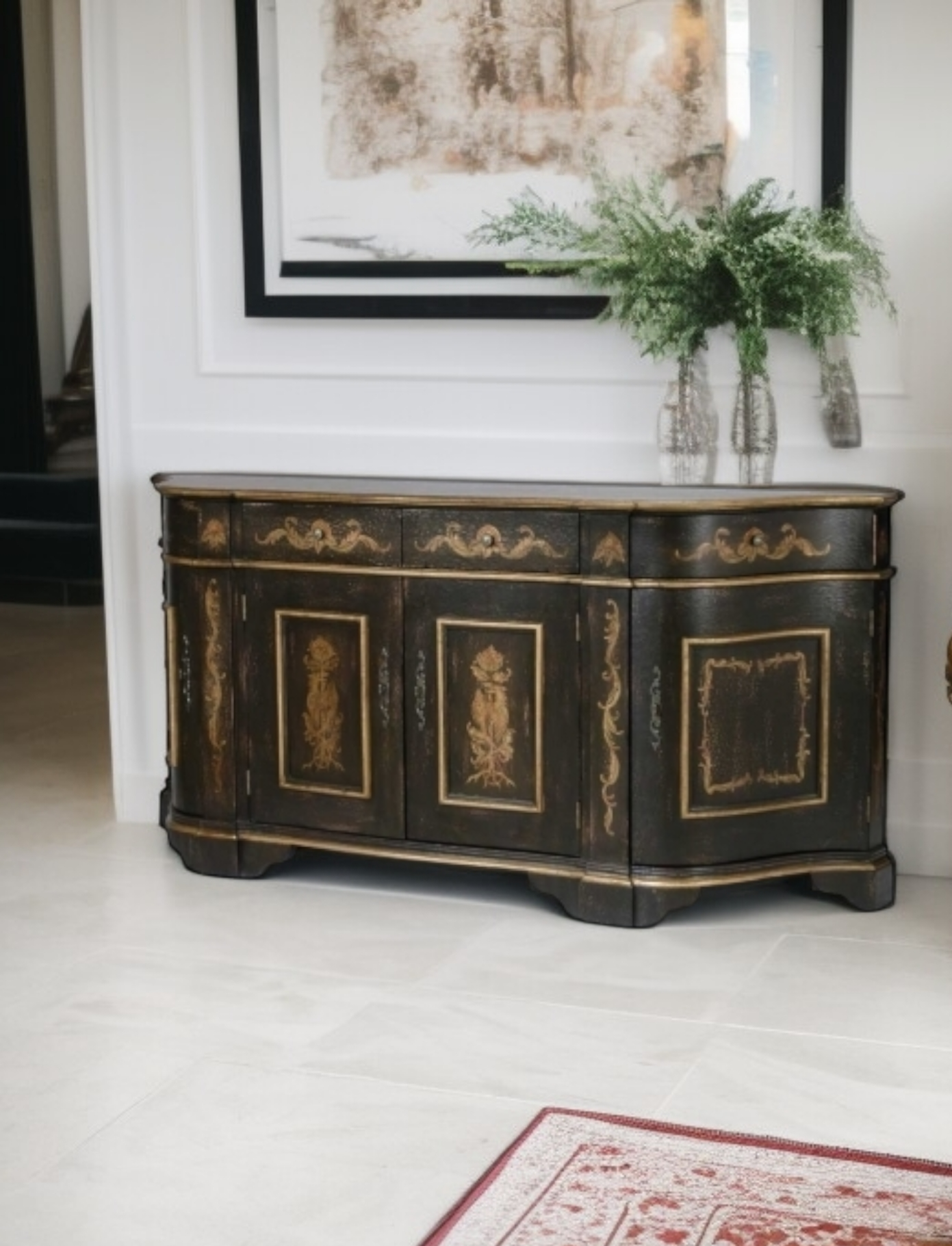 Este imponente bufetero es mucho más que un mueble: es una declaración de arte y distinción. Elaborado por Ultimate Accents, su silueta curvada tipo demilune se realza con una decoración pintada a mano que representa majestuosas figuras de ave Fénix, símbolo eterno de renacimiento y poder. Cada panel evoca una narrativa mitológica, con trazos dorados que contrastan sobre un fondo envejecido, creando una atmósfera de nobleza y misterio.