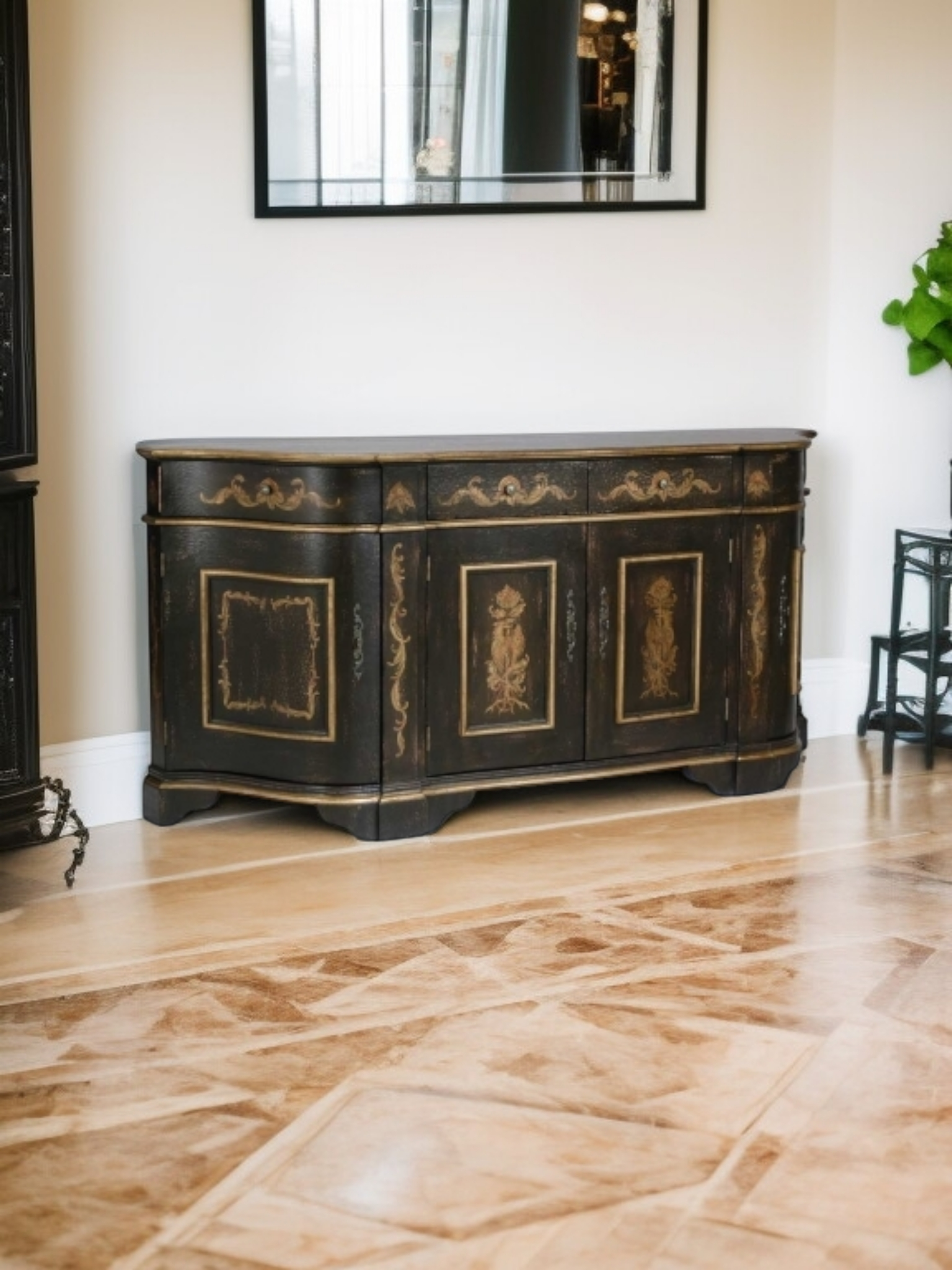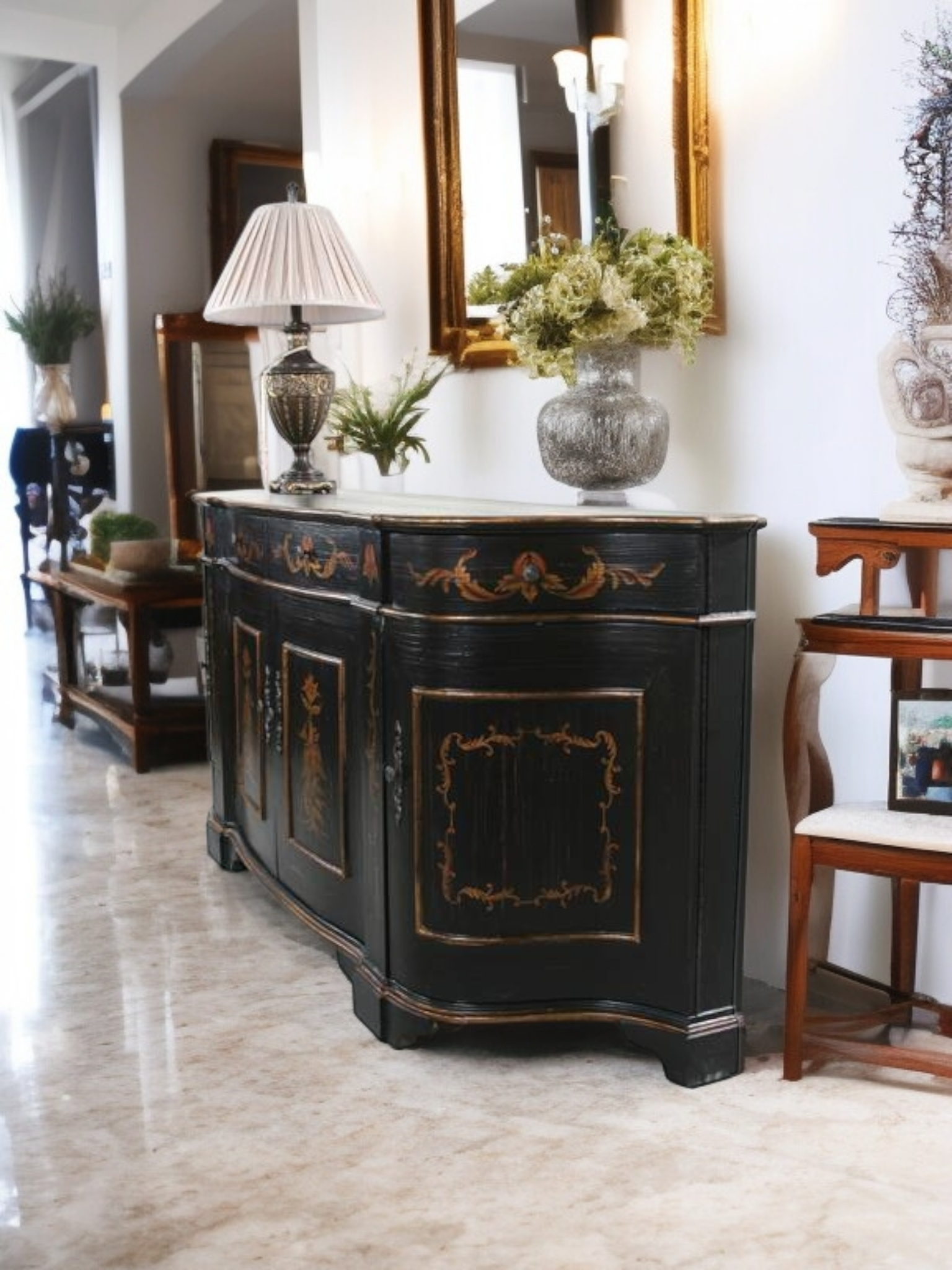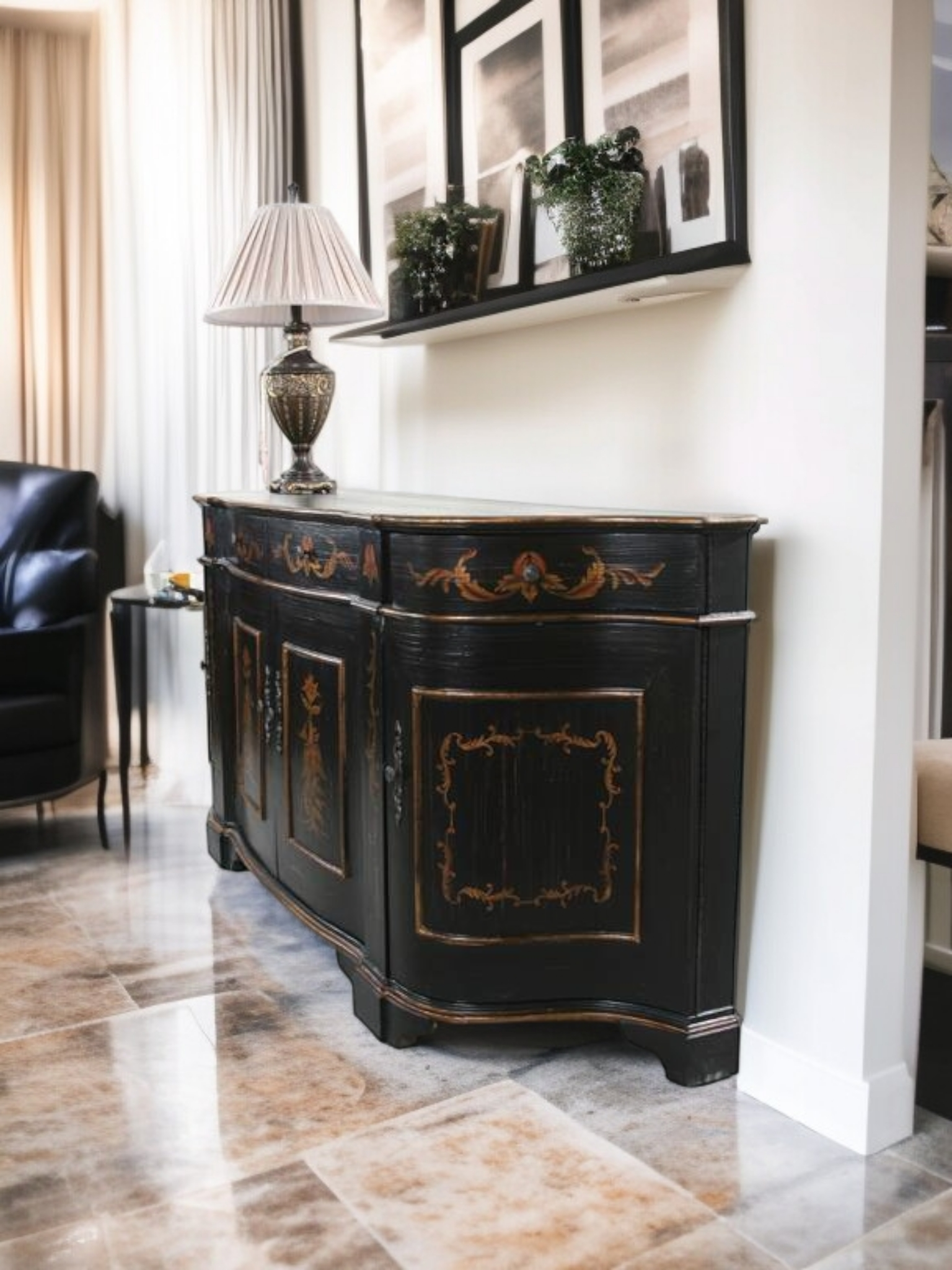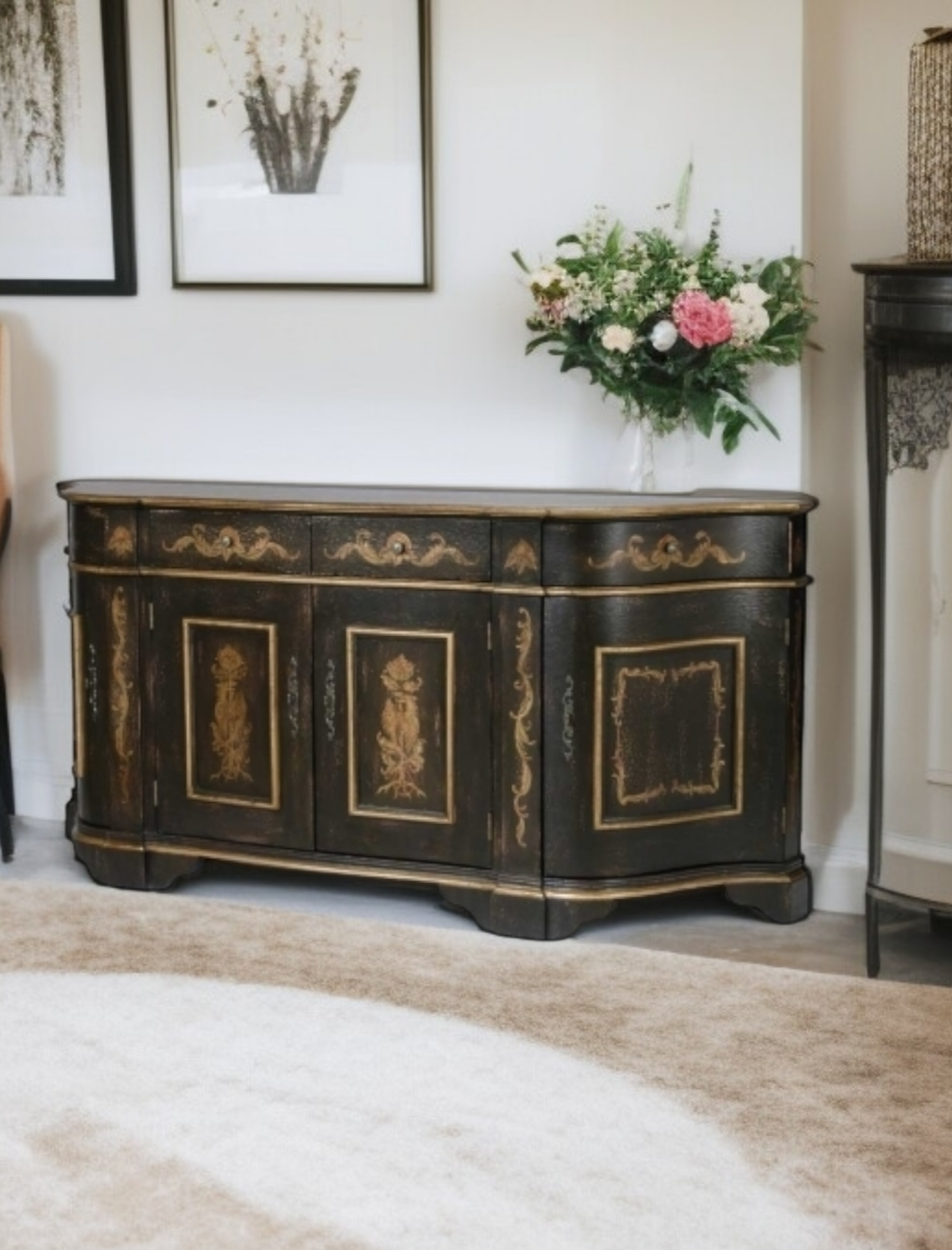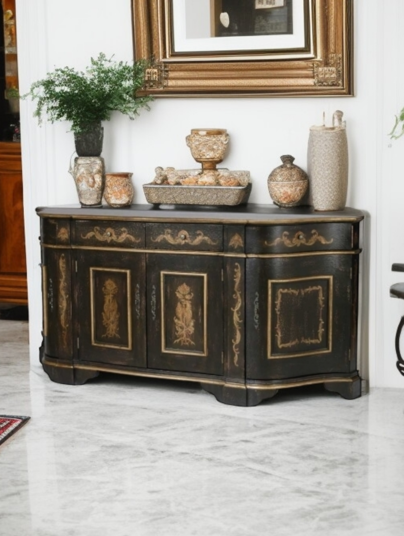 Este imponente bufetero es mucho más que un mueble: es una declaración de arte y distinción. Elaborado por Ultimate Accents, su silueta curvada tipo demilune se realza con una decoración pintada a mano que representa majestuosas figuras de ave Fénix, símbolo eterno de renacimiento y poder. Cada panel evoca una narrativa mitológica, con trazos dorados que contrastan sobre un fondo envejecido, creando una atmósfera de nobleza y misterio.