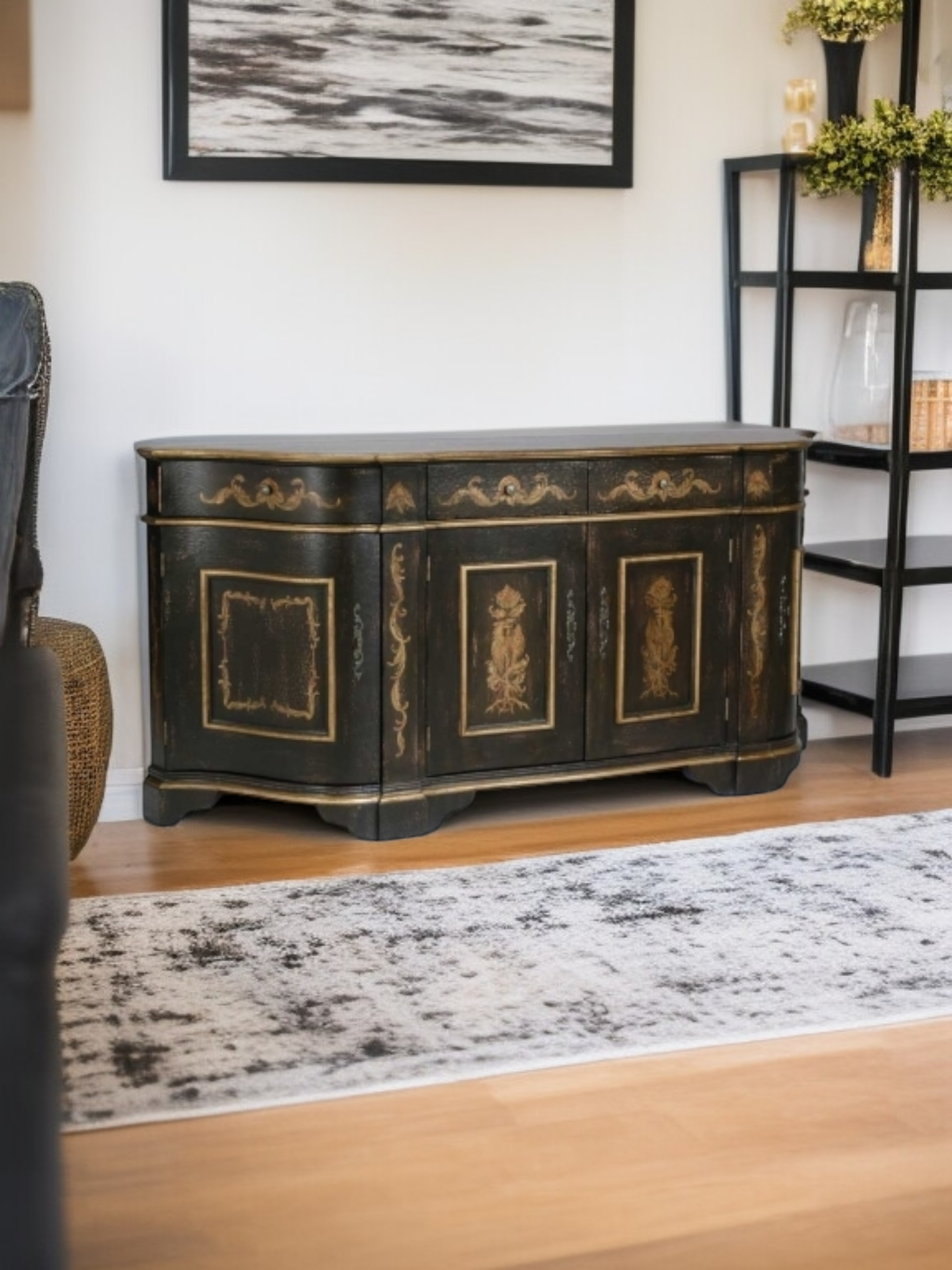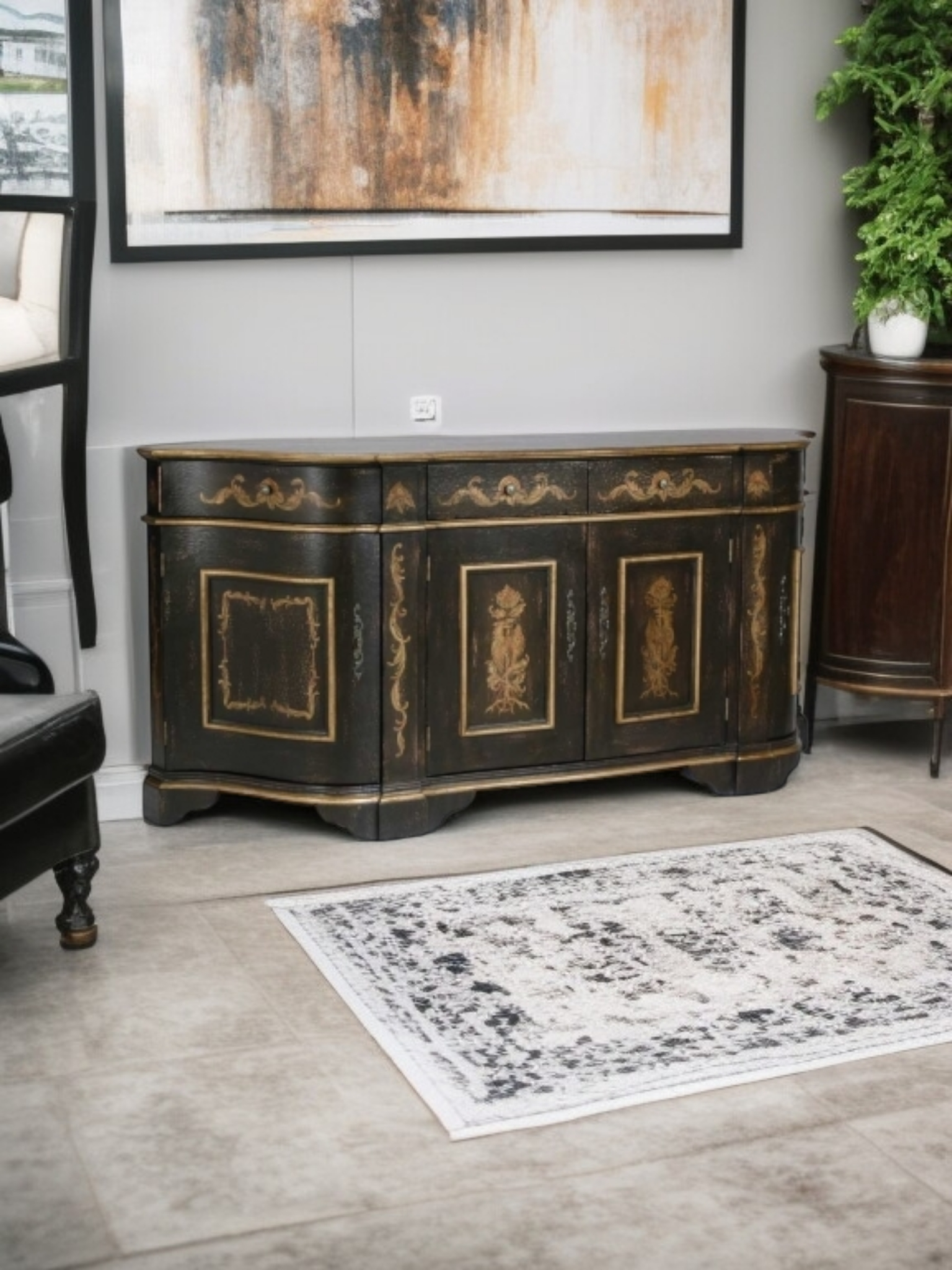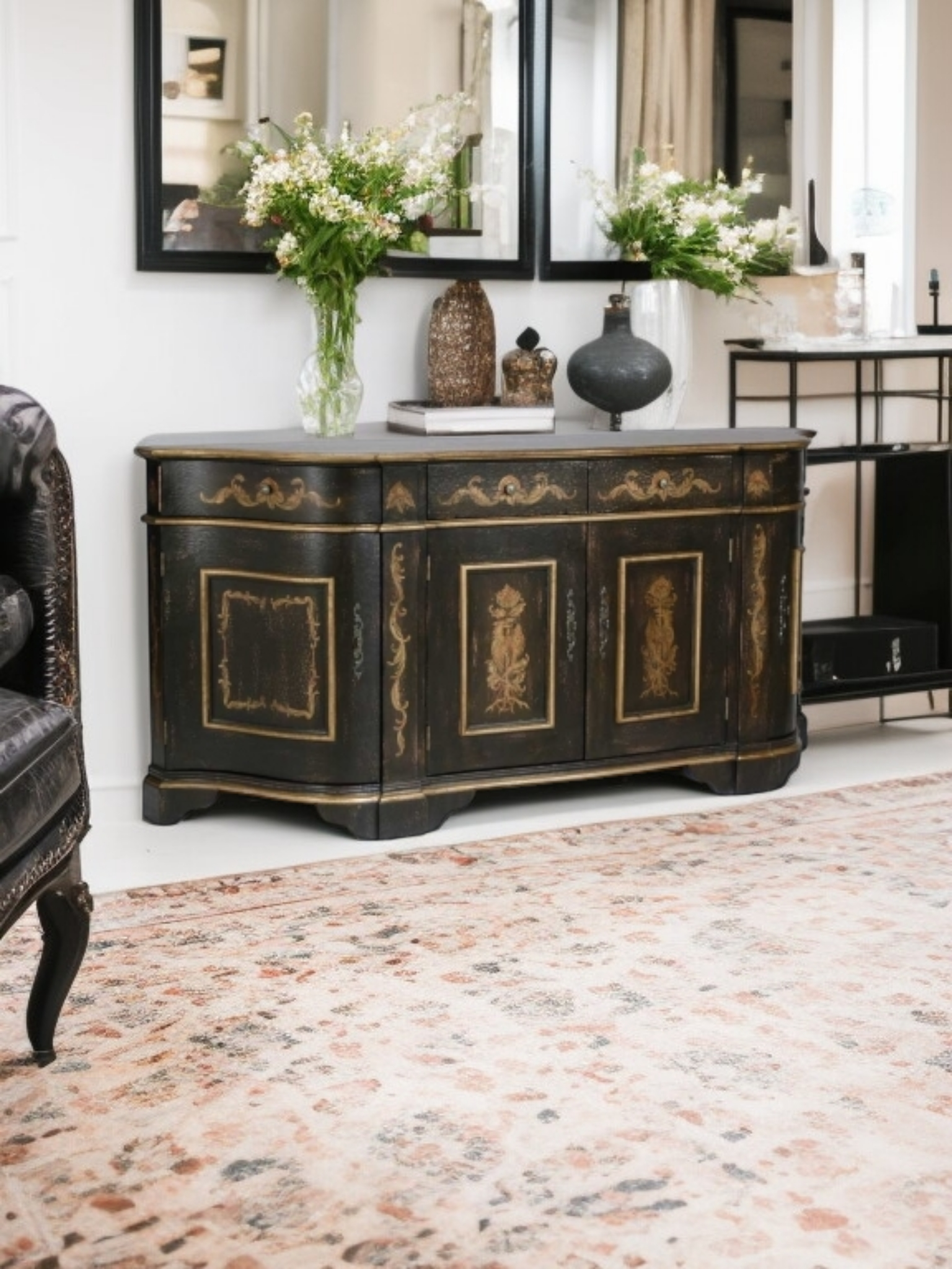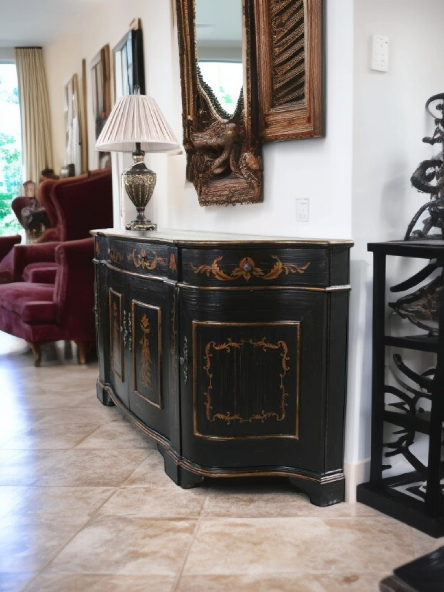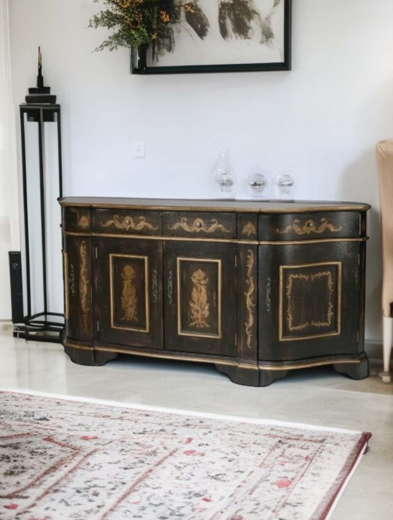 Este imponente bufetero es mucho más que un mueble: es una declaración de arte y distinción. Elaborado por Ultimate Accents, su silueta curvada tipo demilune se realza con una decoración pintada a mano que representa majestuosas figuras de ave Fénix, símbolo eterno de renacimiento y poder. Cada panel evoca una narrativa mitológica, con trazos dorados que contrastan sobre un fondo envejecido, creando una atmósfera de nobleza y misterio.