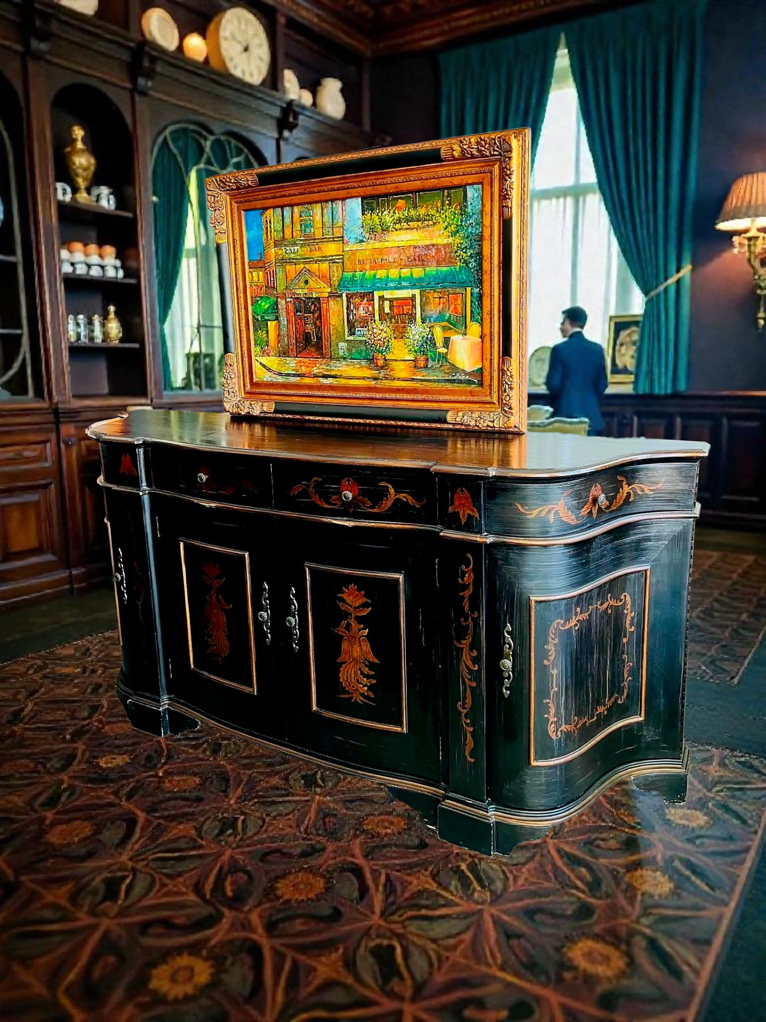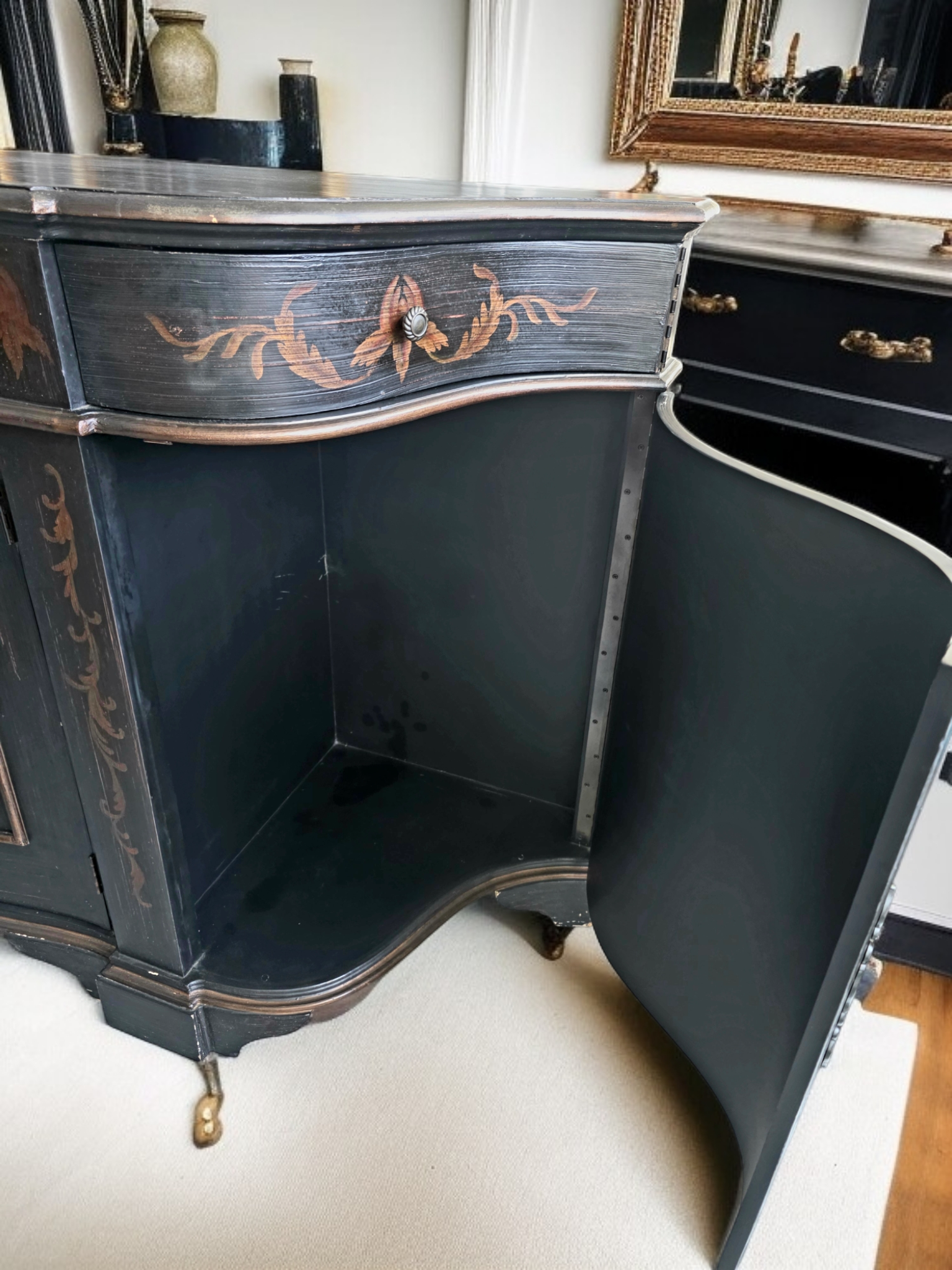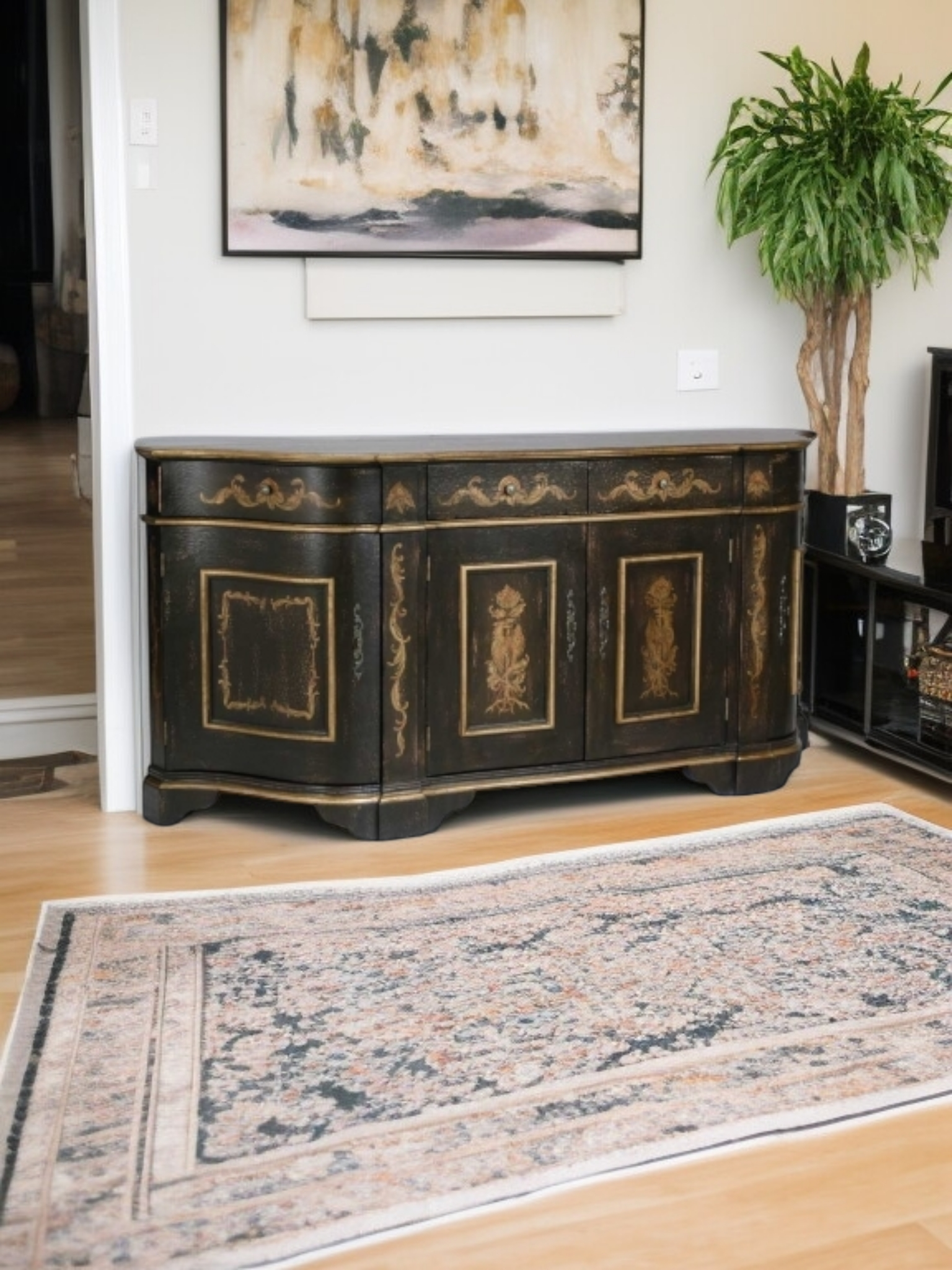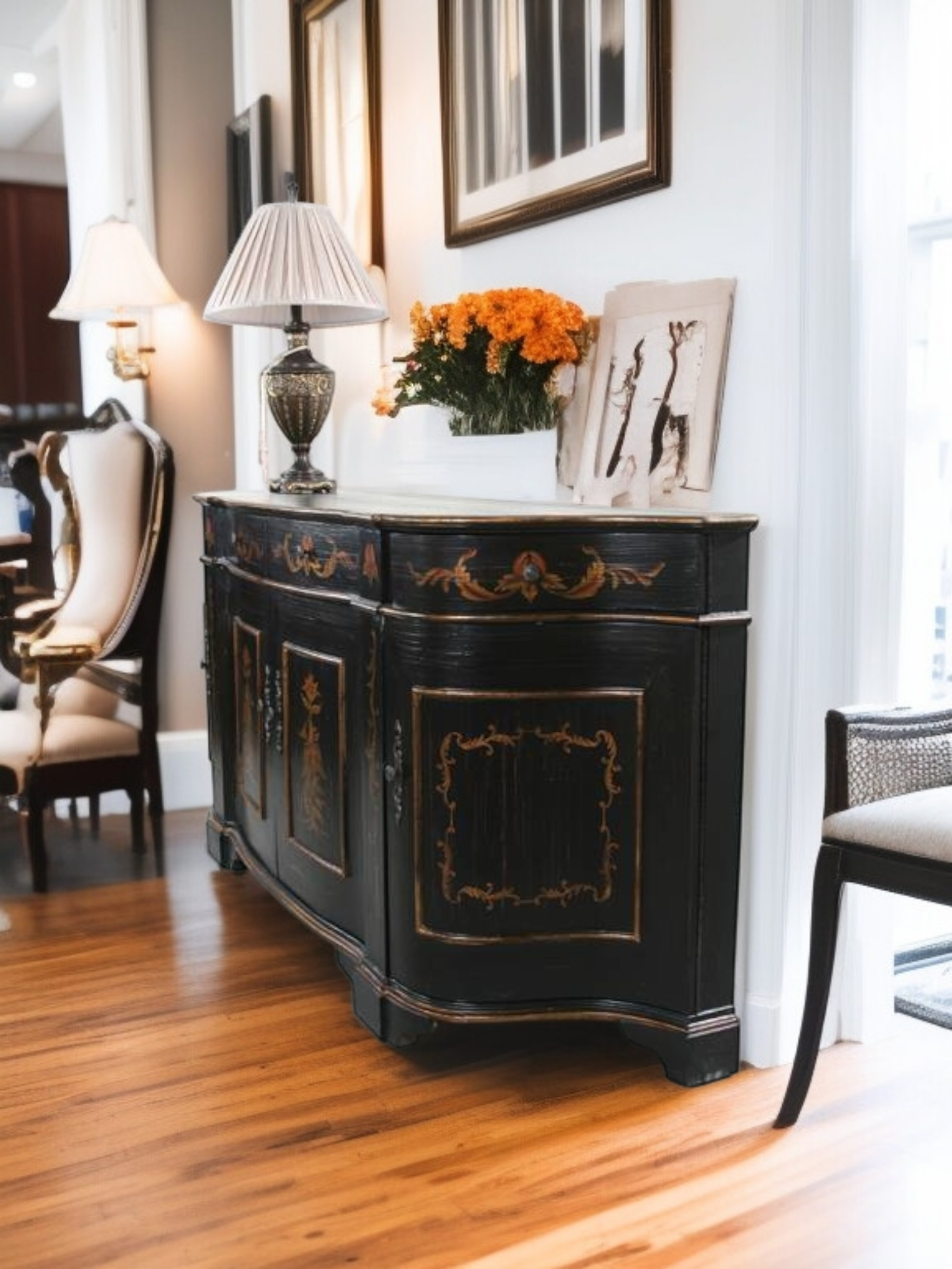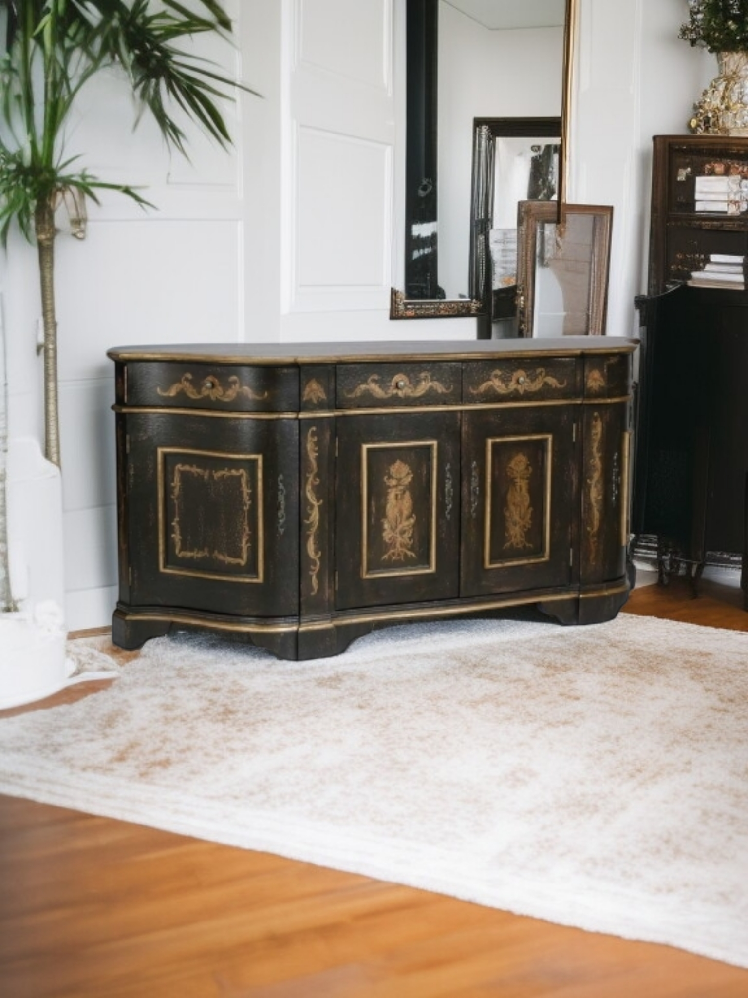 Este imponente bufetero es mucho más que un mueble: es una declaración de arte y distinción. Elaborado por Ultimate Accents, su silueta curvada tipo demilune se realza con una decoración pintada a mano que representa majestuosas figuras de ave Fénix, símbolo eterno de renacimiento y poder. Cada panel evoca una narrativa mitológica, con trazos dorados que contrastan sobre un fondo envejecido, creando una atmósfera de nobleza y misterio.