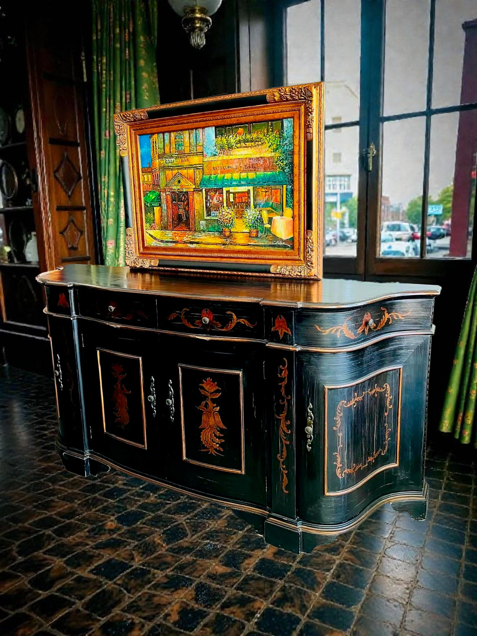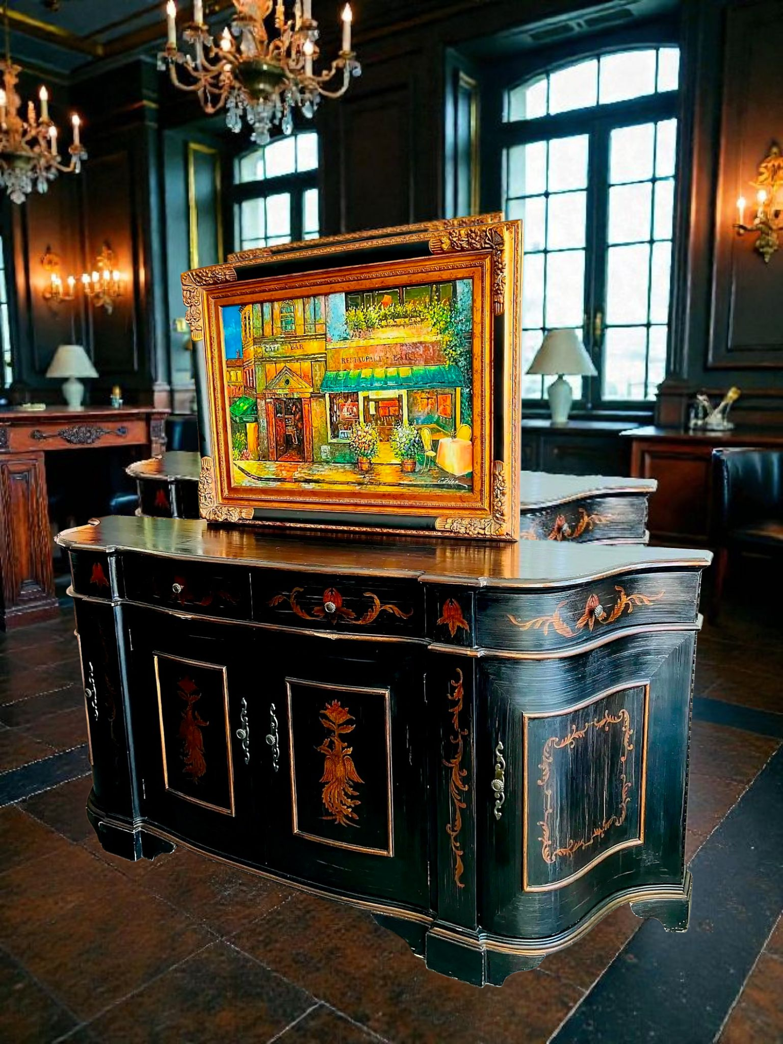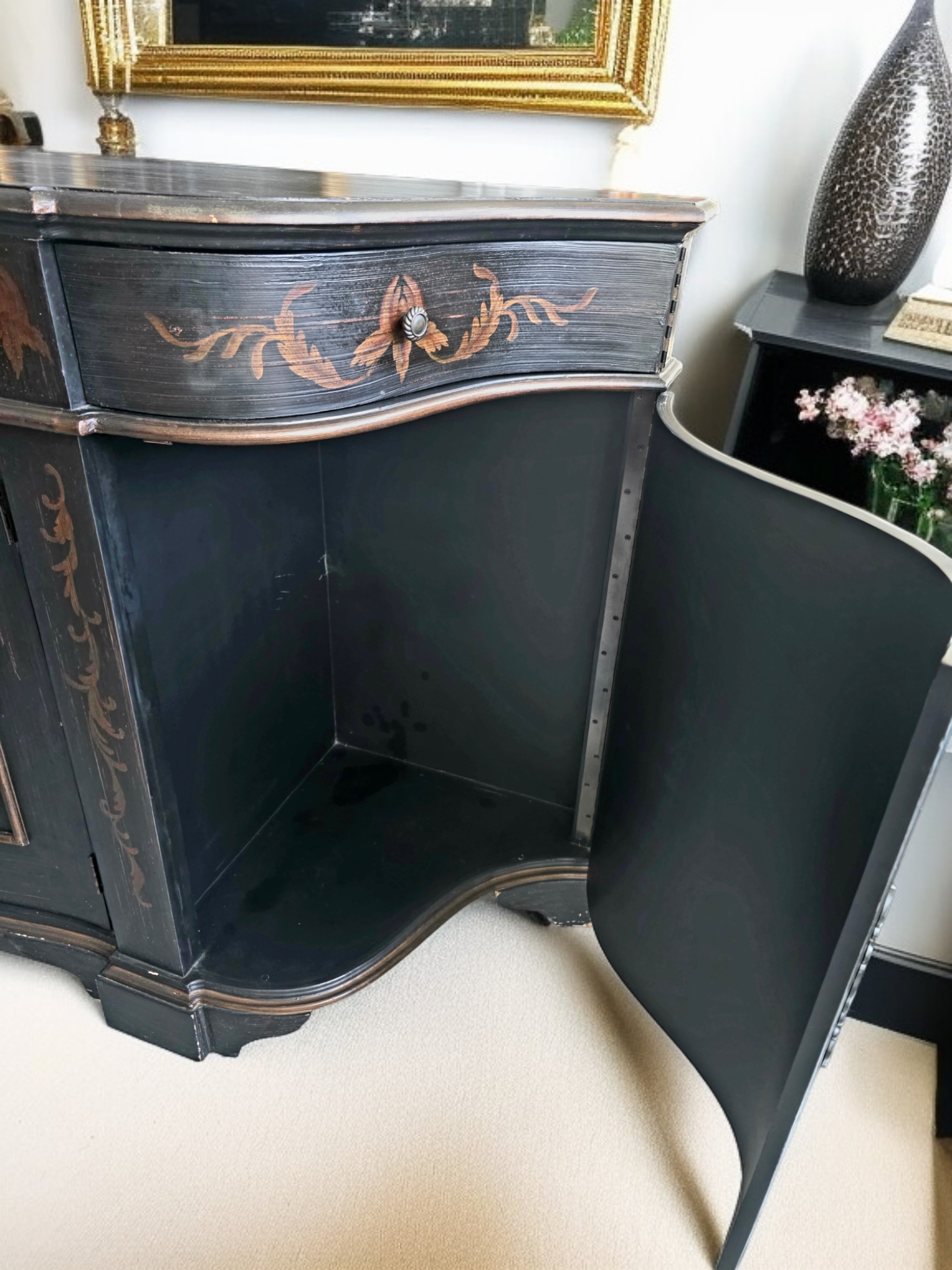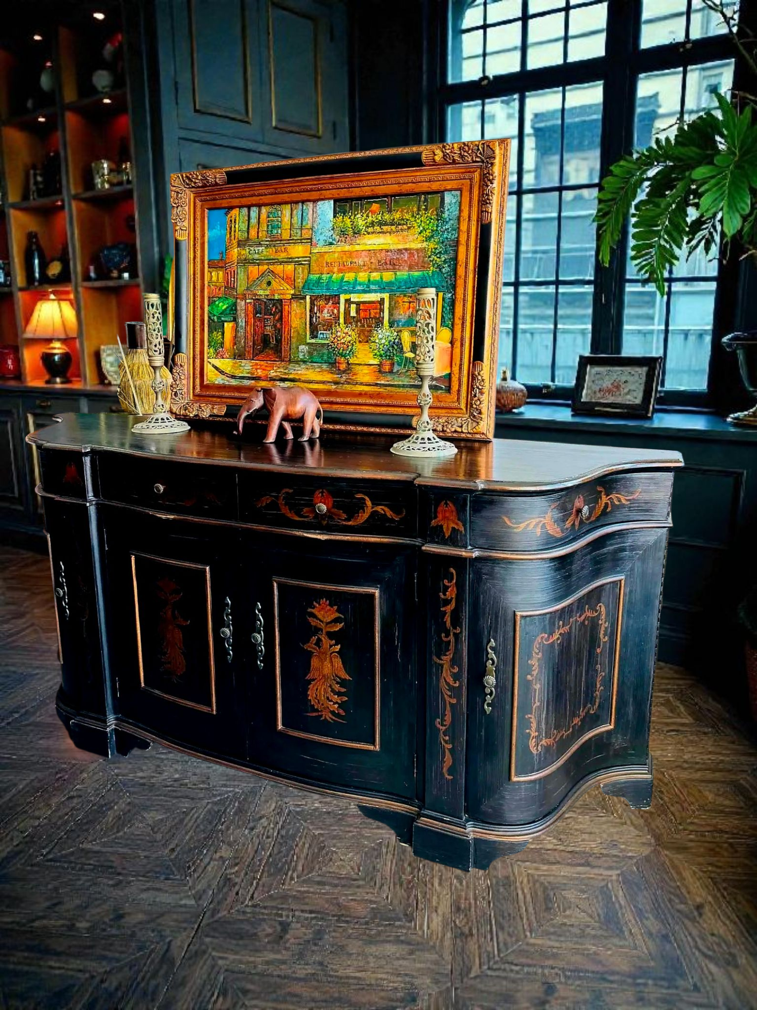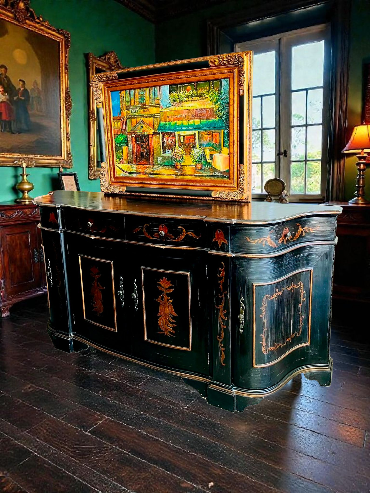Este imponente bufetero es mucho más que un mueble: es una declaración de arte y distinción. Elaborado por Ultimate Accents, su silueta curvada tipo demilune se realza con una decoración pintada a mano que representa majestuosas figuras de ave Fénix, símbolo eterno de renacimiento y poder. Cada panel evoca una narrativa mitológica, con trazos dorados que contrastan sobre un fondo envejecido, creando una atmósfera de nobleza y misterio.
