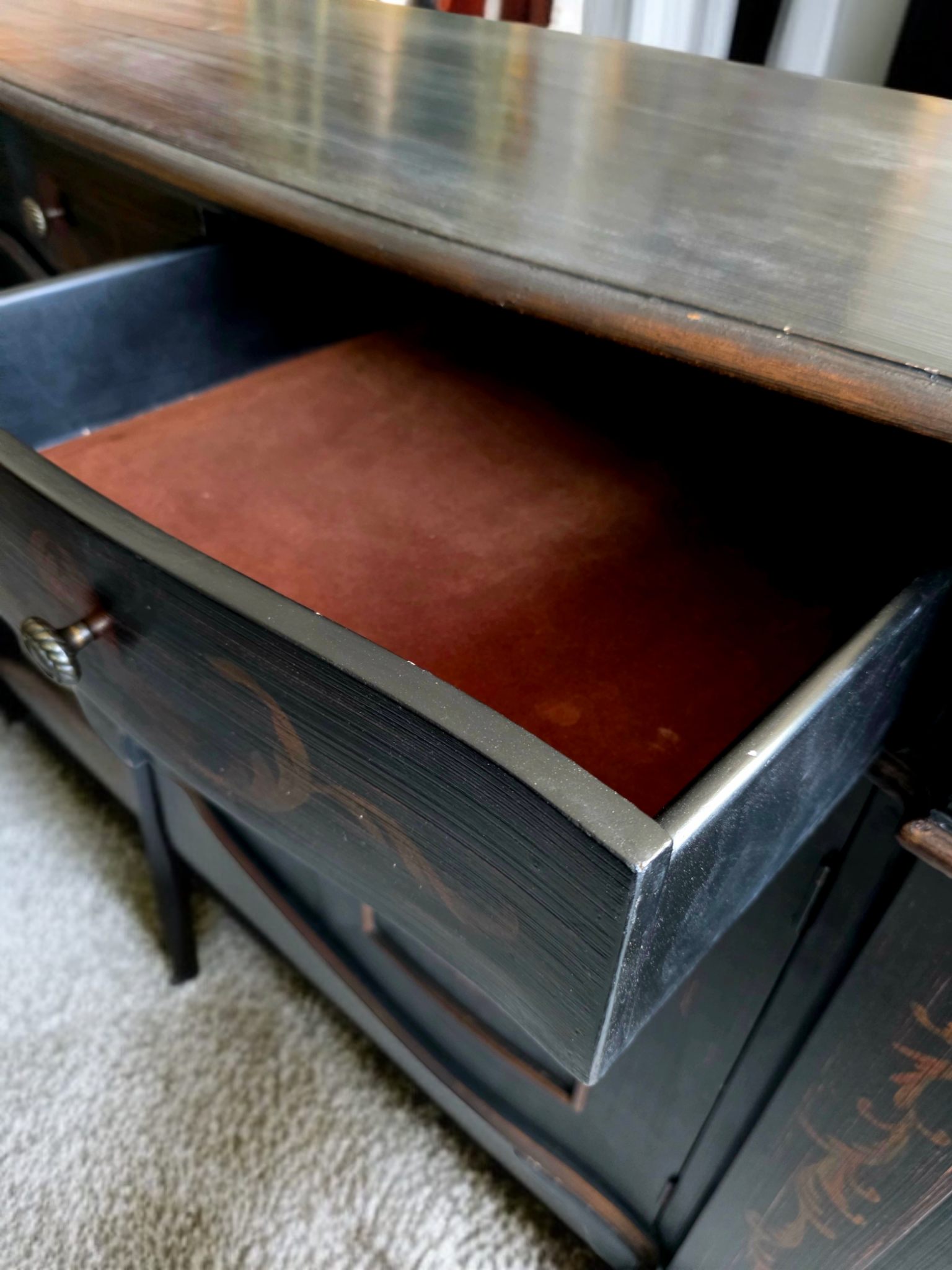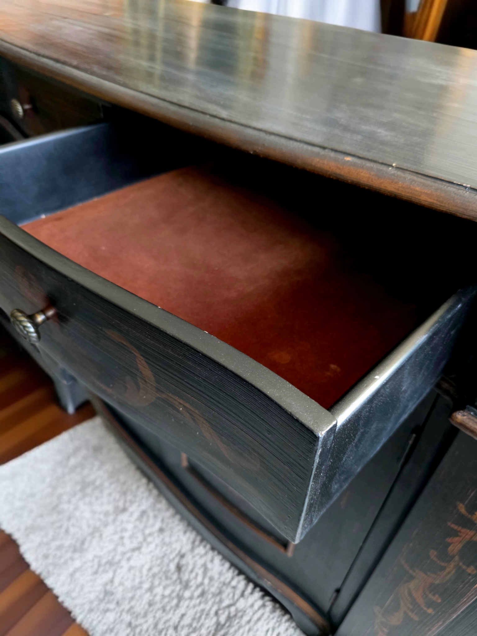 • ✔ 4 cajones y 4 puertas de madera con herrajes de bronce, que revelan 3 estantes internos para organización refinada.