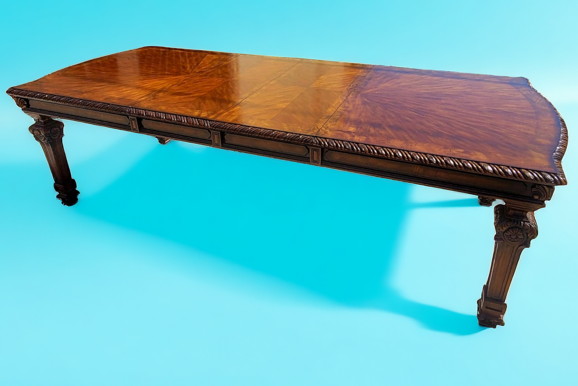 Material de Alta Calidad: Hecho con madera robusta, presenta un acabado en madera oscura que resalta los detalles tallados a mano en los bordes de la mesa.