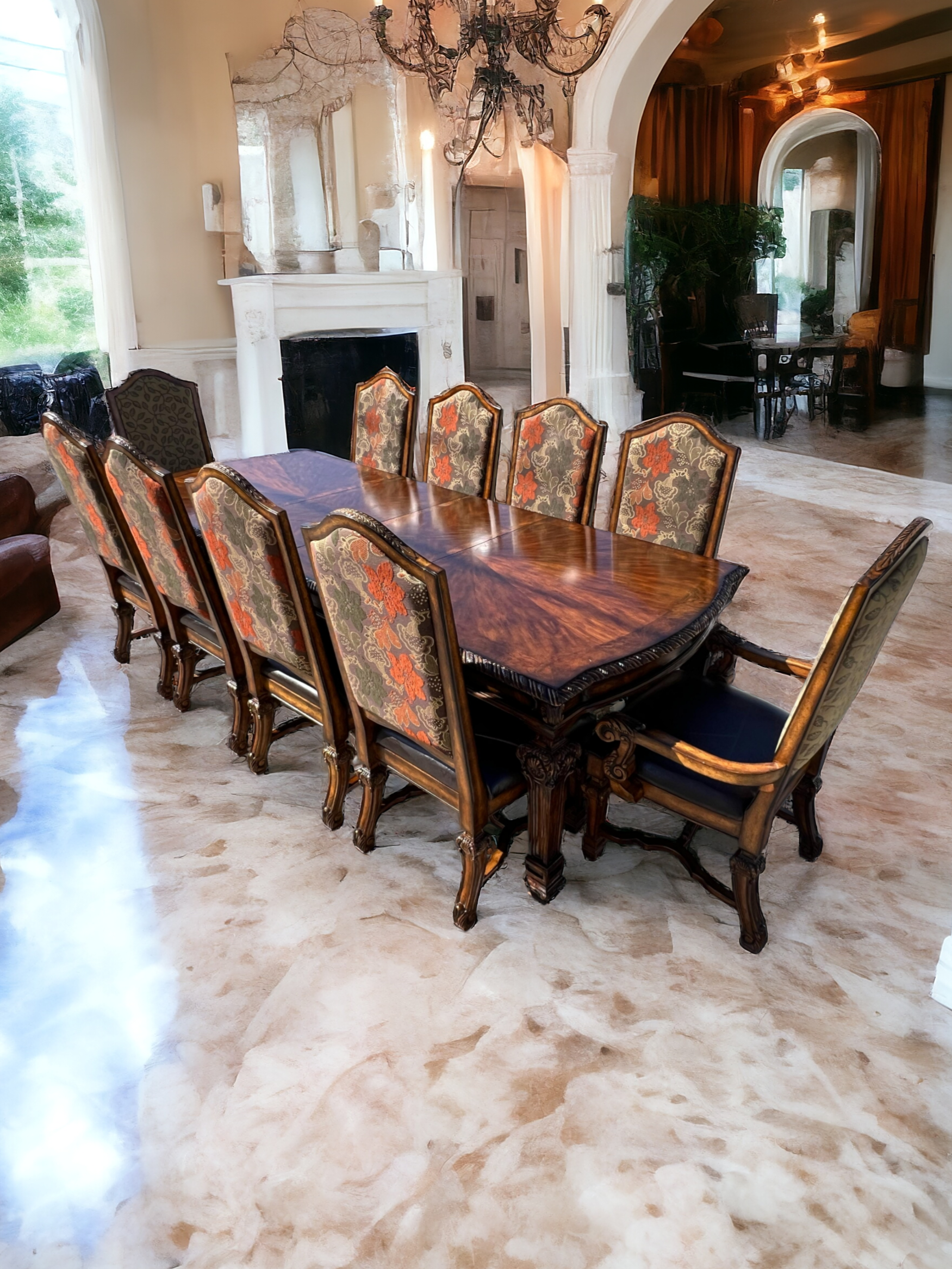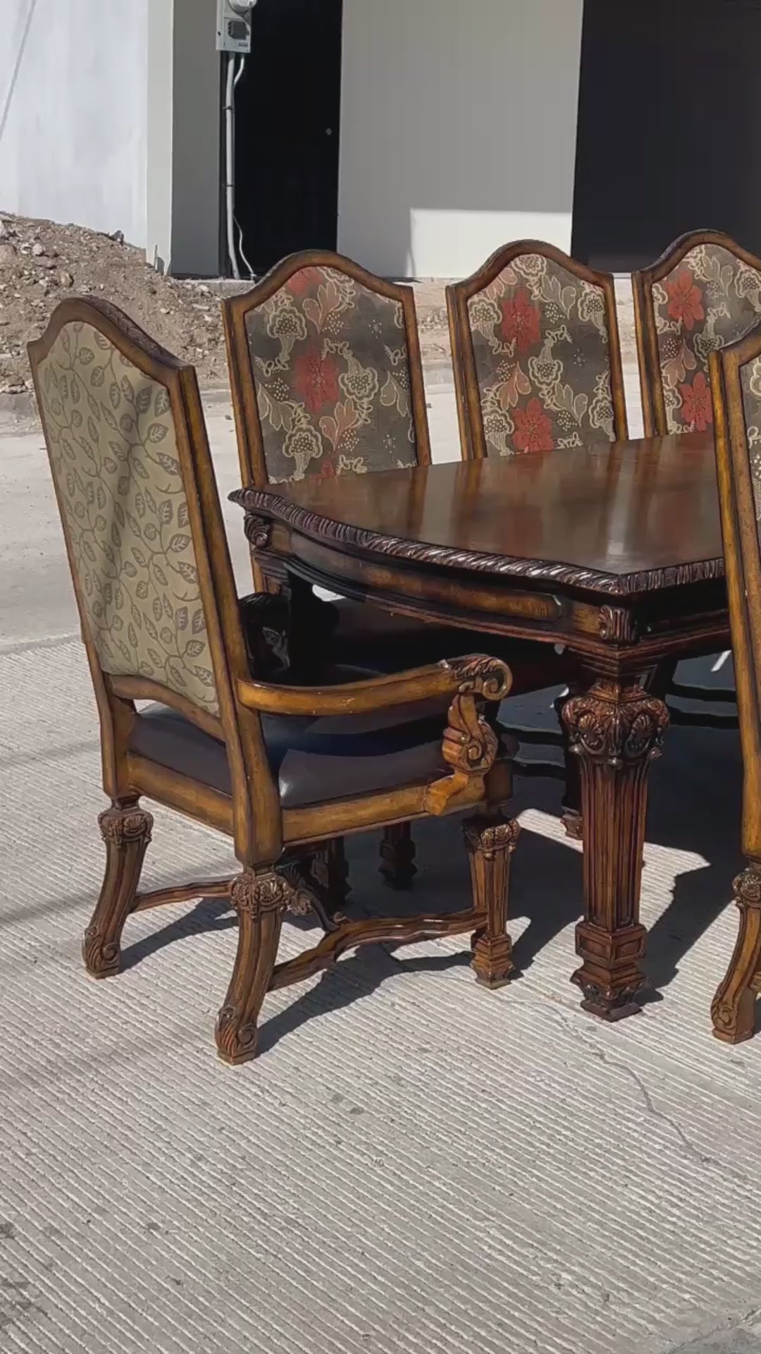 Sillas Comodísimas: El conjunto incluye 10 sillas a juego, tapizadas con un tejido de motivos florales en tonos cálidos, añadiendo un toque de sofisticación y confort. Asientos grandes y comodos tapizados en vinipiel suave y elegante en color chocolate obscuro.