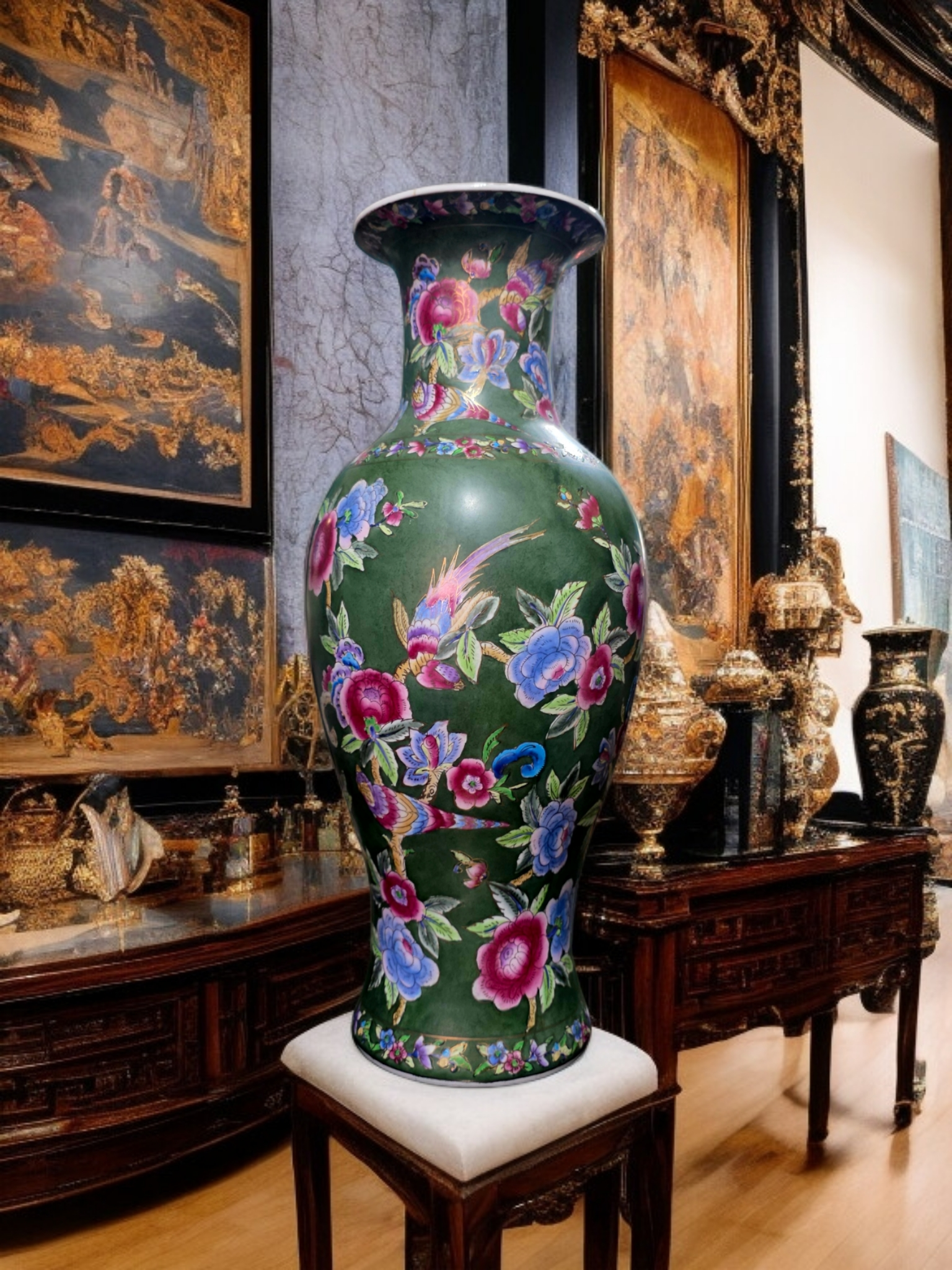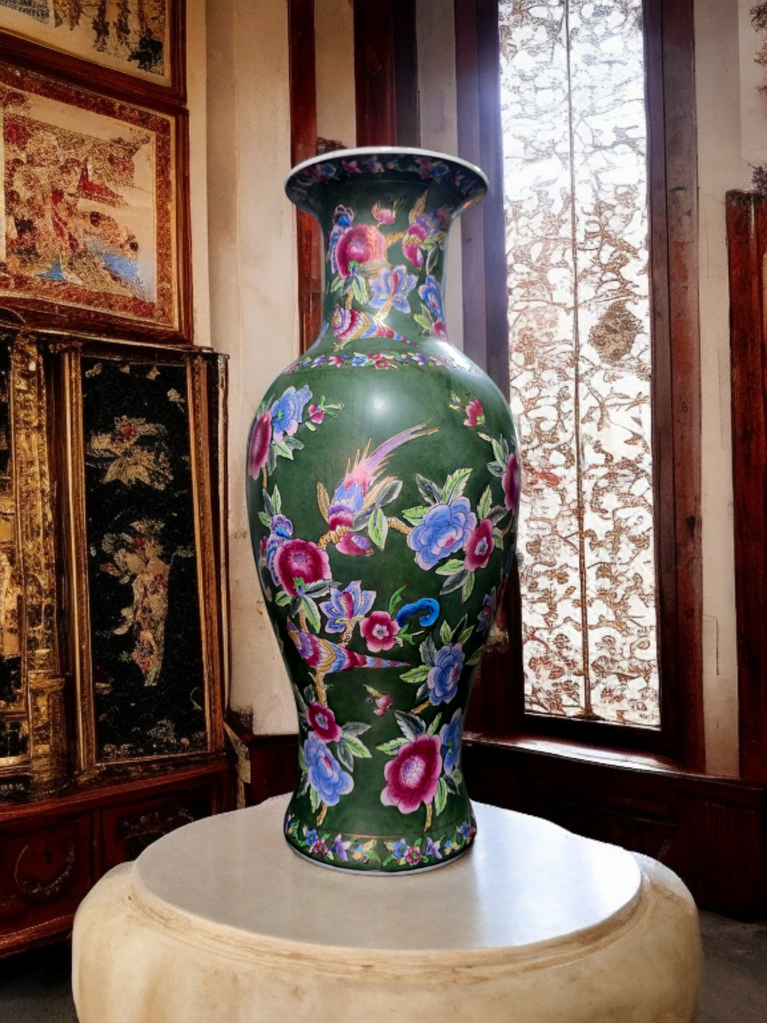 Presentamos una pieza de formato mediano y exquisita ejecución: un jarrón oriental de 63 cm de altura, elaborado en porcelana esmaltada y decorado a mano con motivos florales y aviares de gran riqueza cromática. Cada detalle revela una sensibilidad artística refinada, donde flores en tonos rojo, rosa, azul y púrpura se entrelazan con la figura de un ave en pleno vuelo, evocando la armonía entre naturaleza y contemplación.