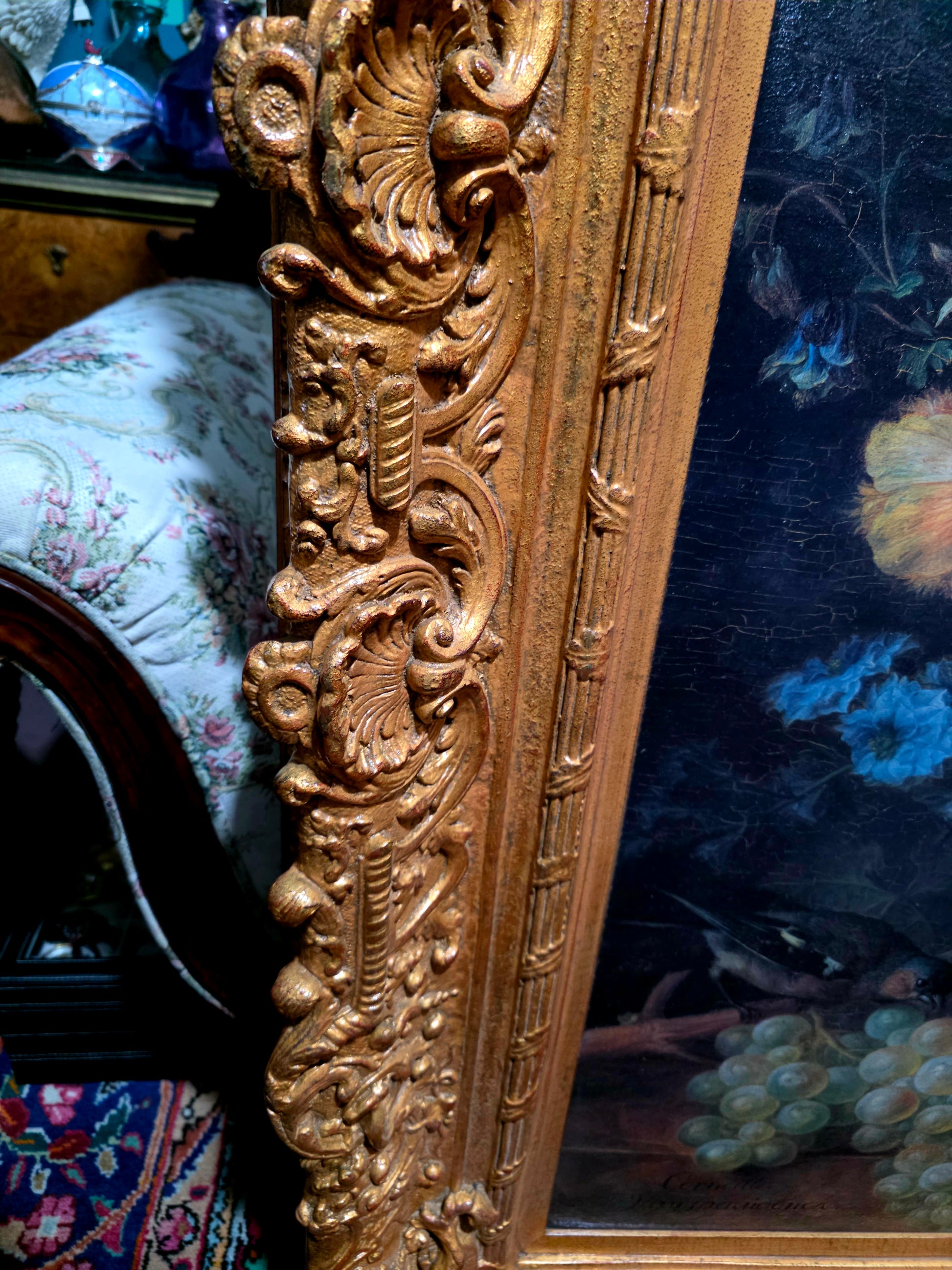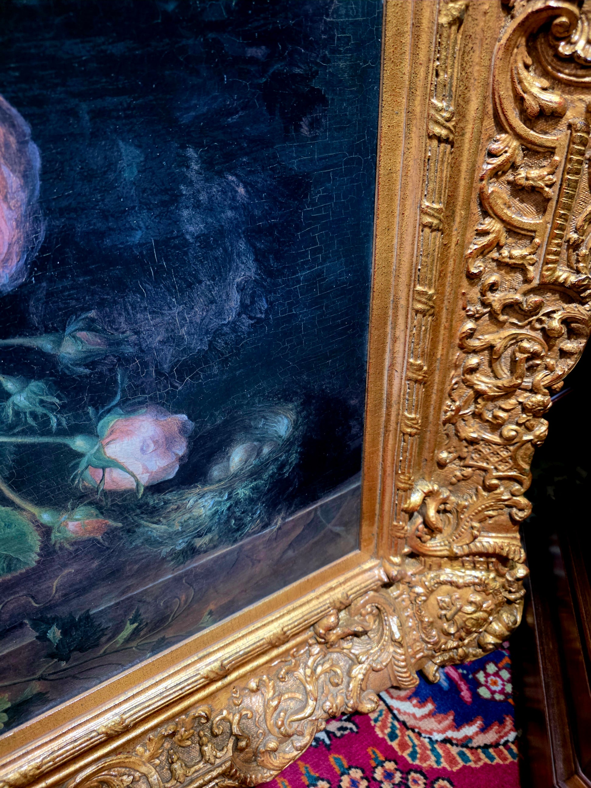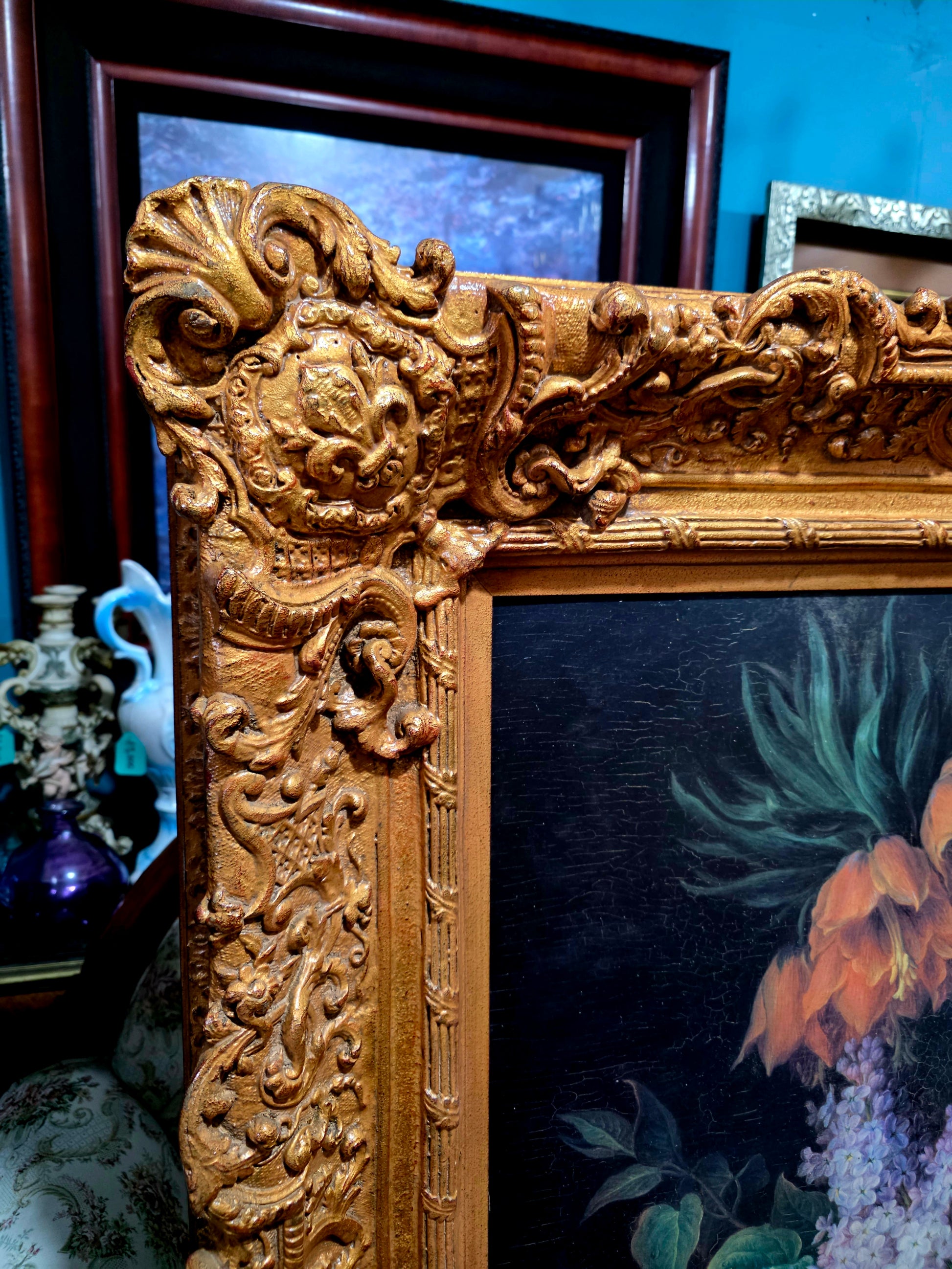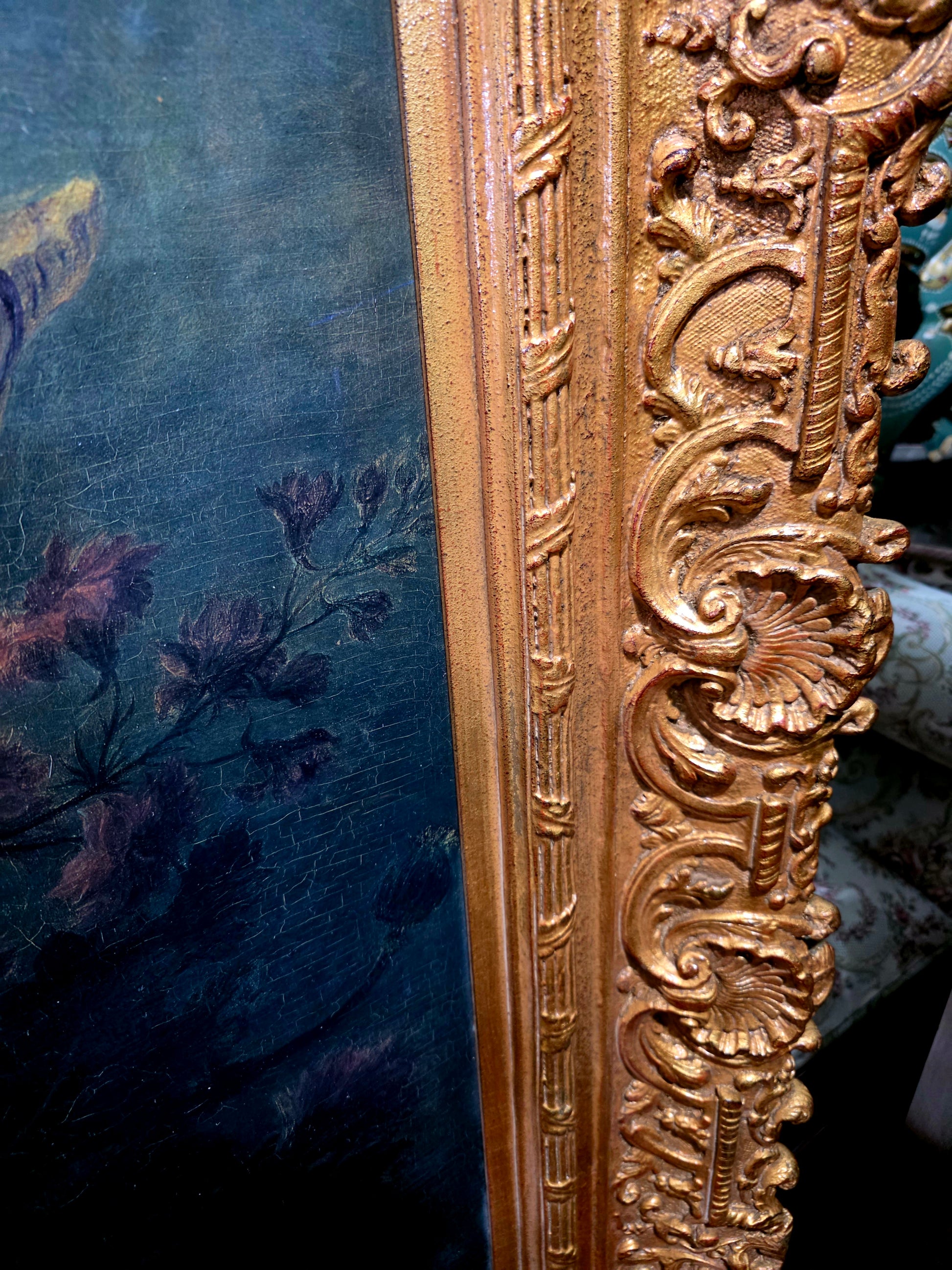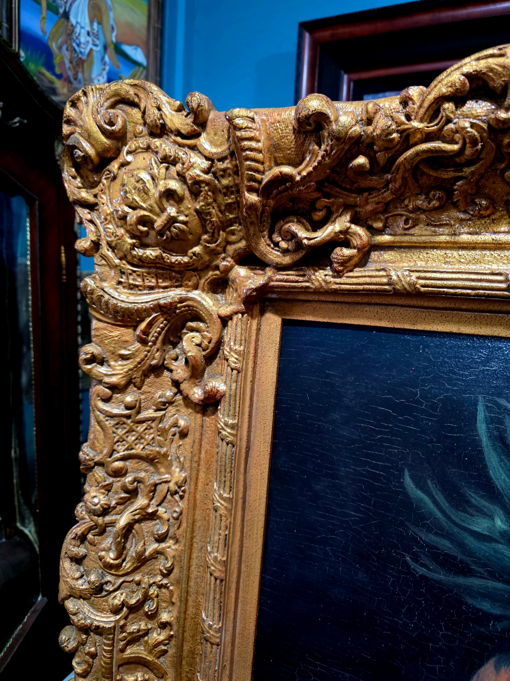 🖼️ El marco, trabajado en doble capa con tallado artesanal en madera y elementos de madera manufacturada con acabado dorado, despliega relieves ornamentales de inspiración rococó. Sus curvas sinuosas, volutas delicadas y motivos florales abrazan la obra como un auténtico tesoro pictórico, realzando su majestuosidad y solemnidad.