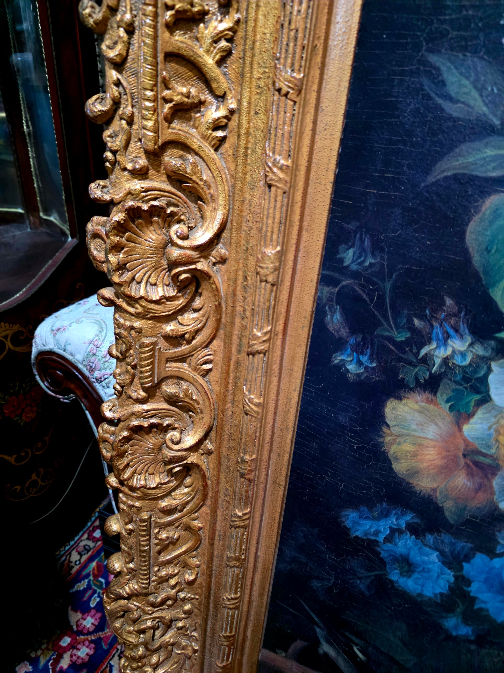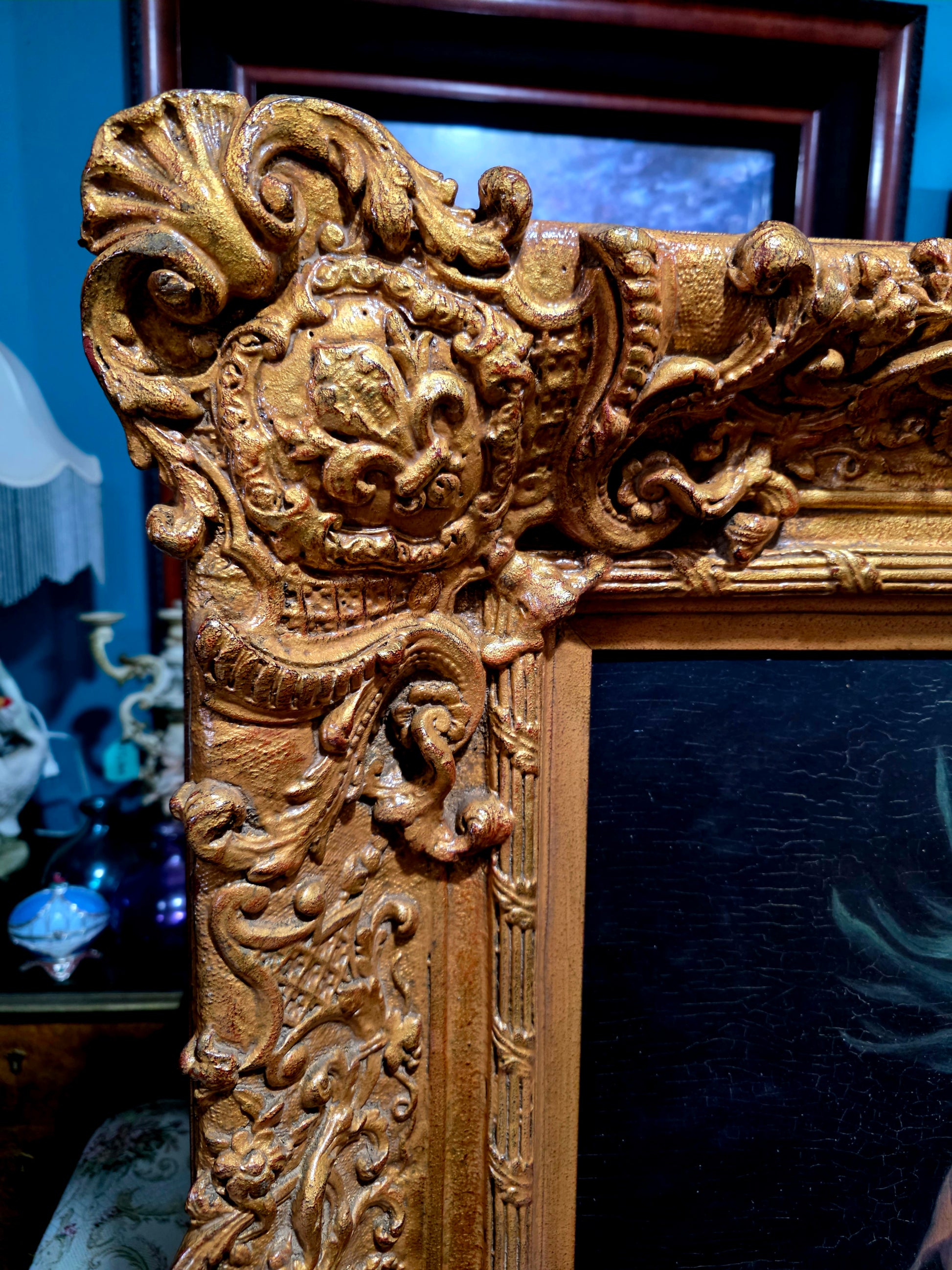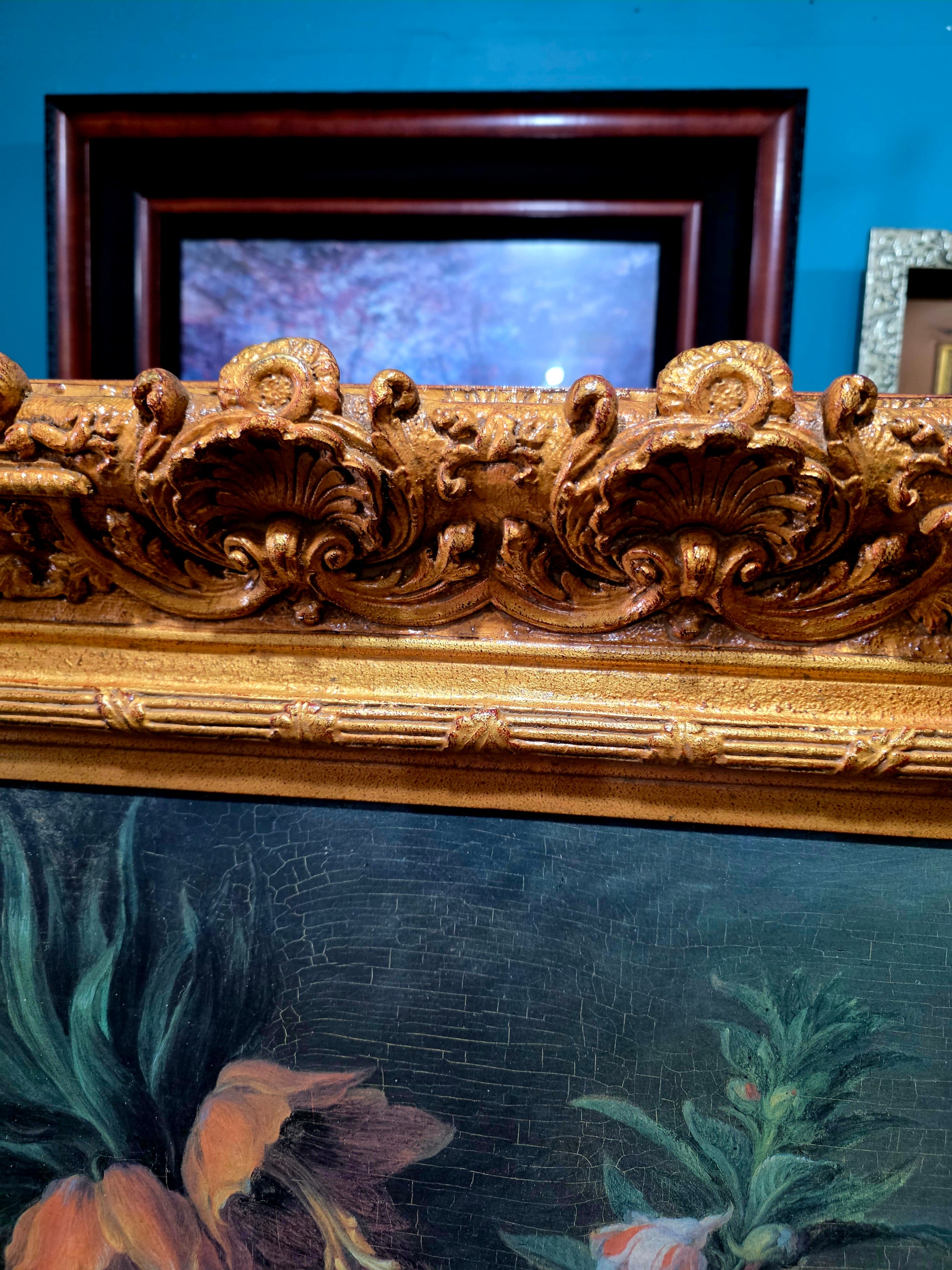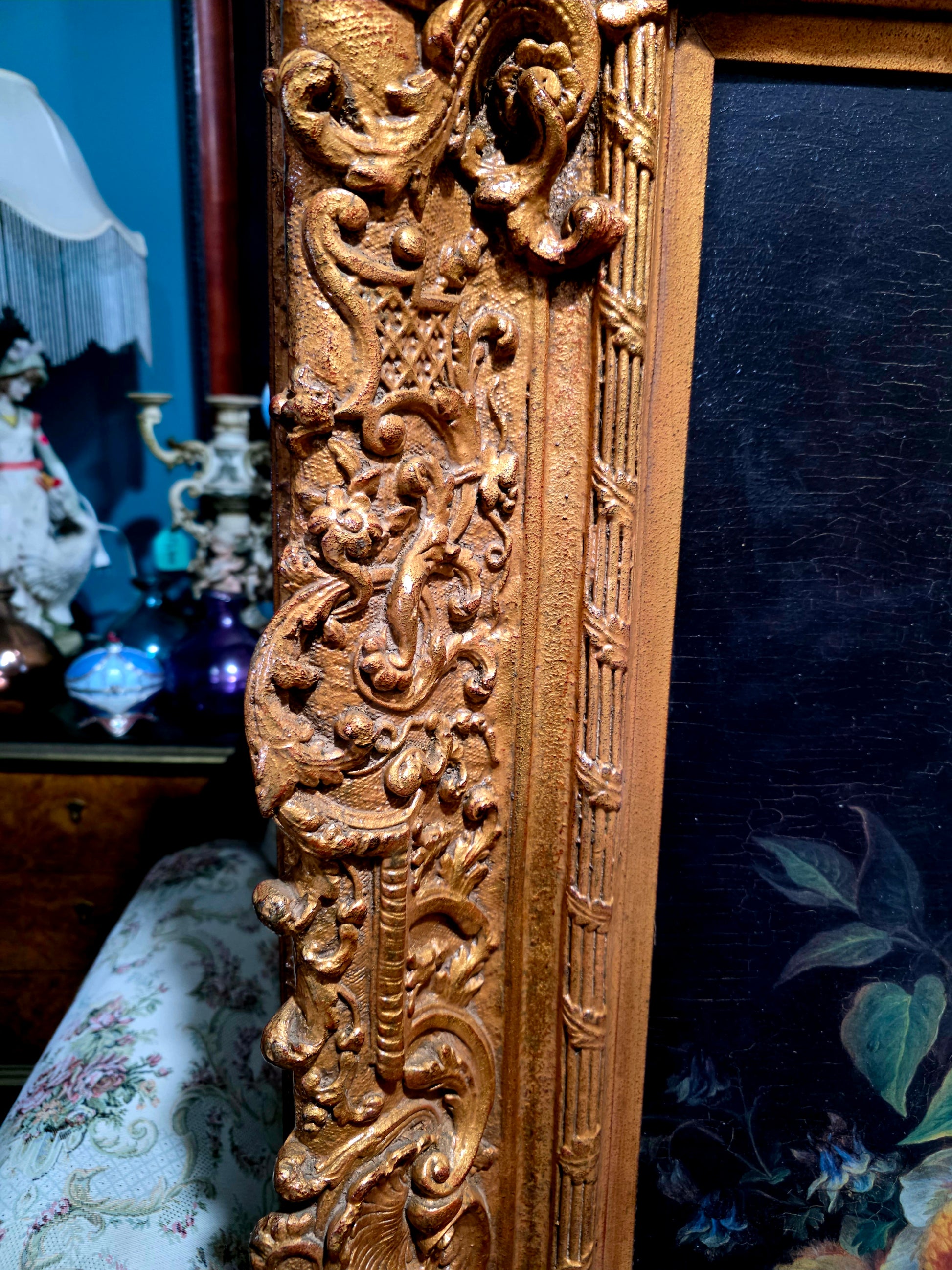 🖼️ El marco, trabajado en doble capa con tallado artesanal en madera y elementos de madera manufacturada con acabado dorado, despliega relieves ornamentales de inspiración rococó. Sus curvas sinuosas, volutas delicadas y motivos florales abrazan la obra como un auténtico tesoro pictórico, realzando su majestuosidad y solemnidad.