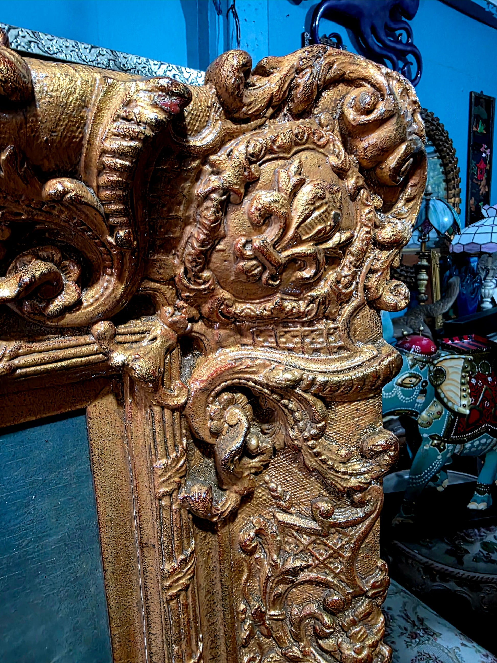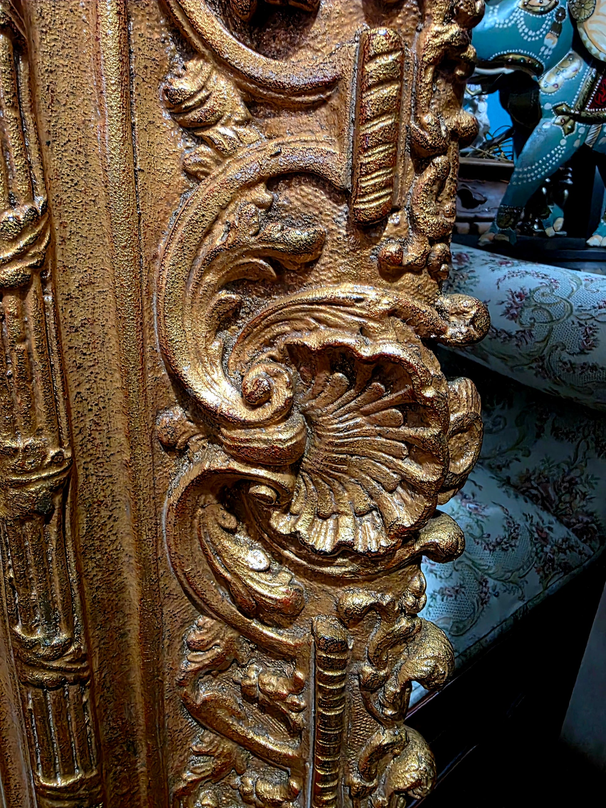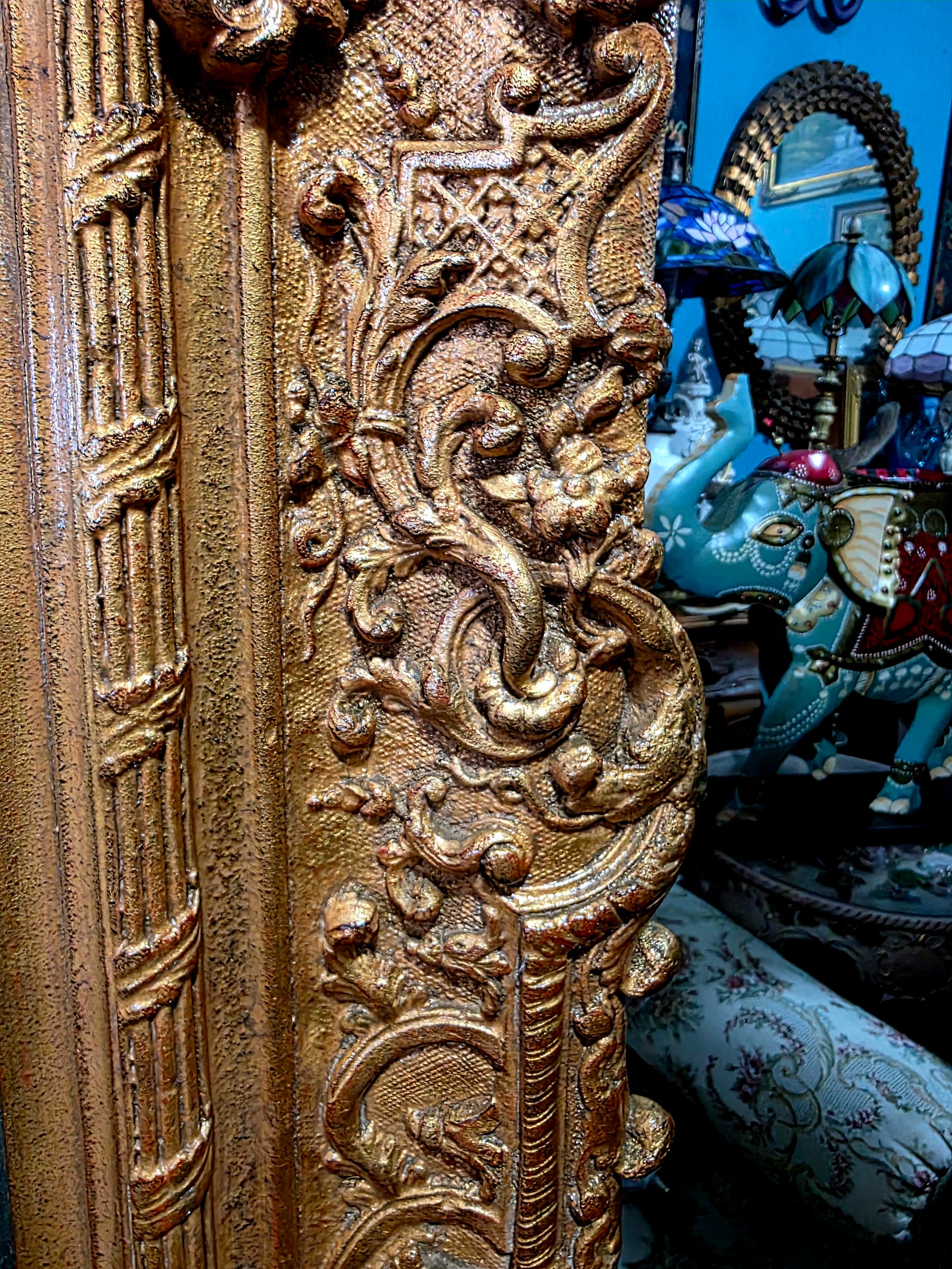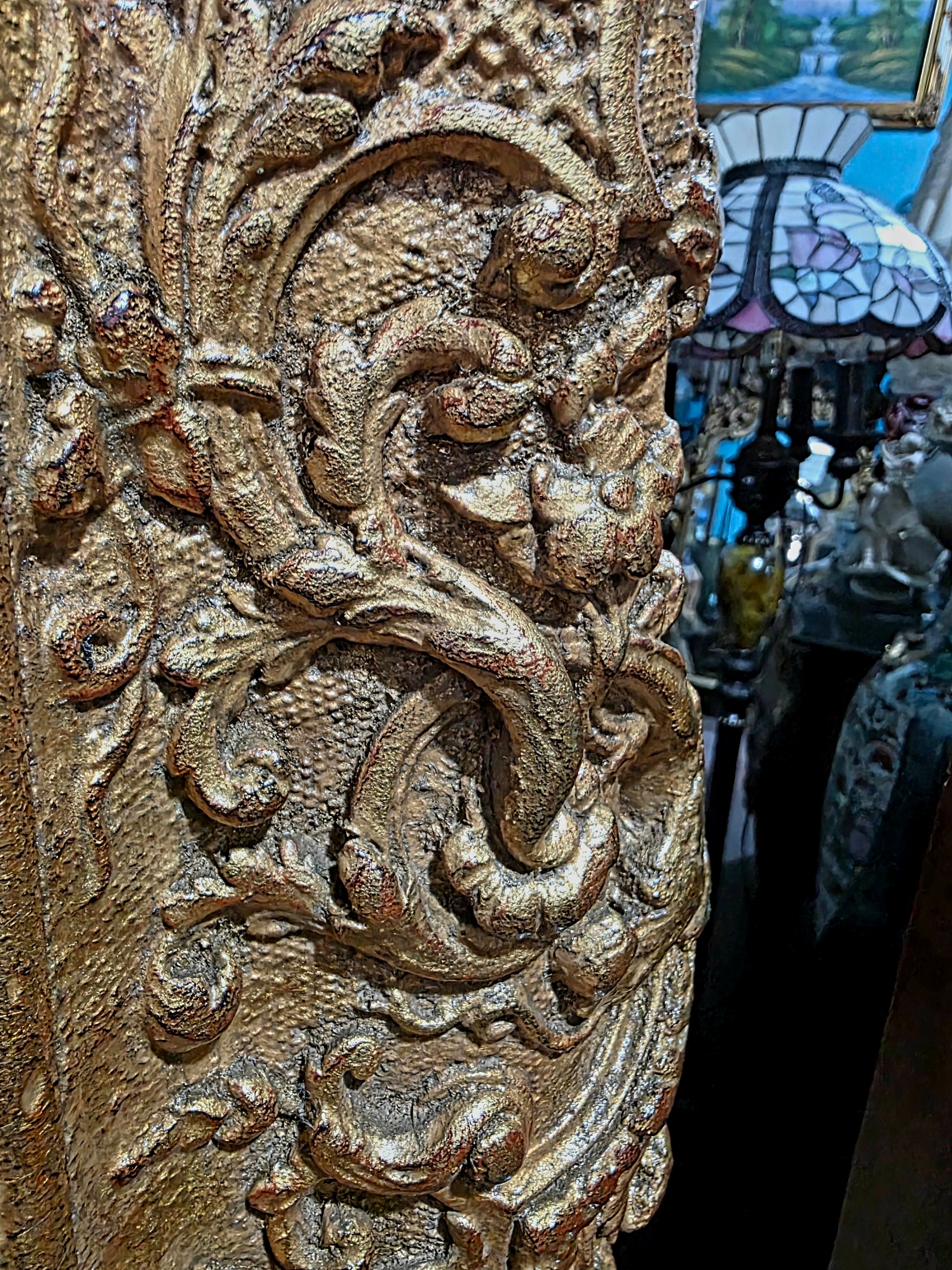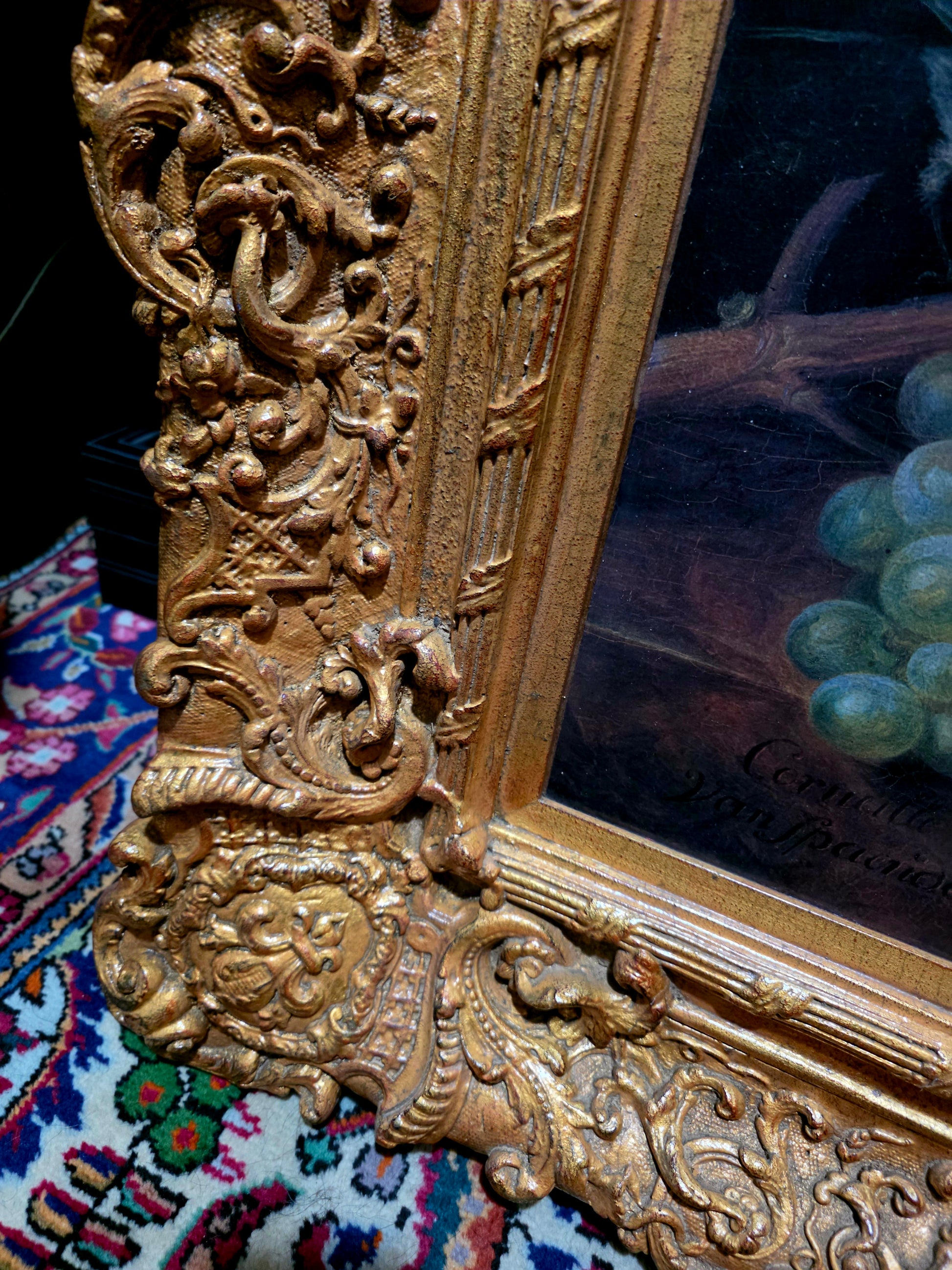 🖼️ El marco, trabajado en doble capa con tallado artesanal en madera y elementos de madera manufacturada con acabado dorado, despliega relieves ornamentales de inspiración rococó. Sus curvas sinuosas, volutas delicadas y motivos florales abrazan la obra como un auténtico tesoro pictórico, realzando su majestuosidad y solemnidad.