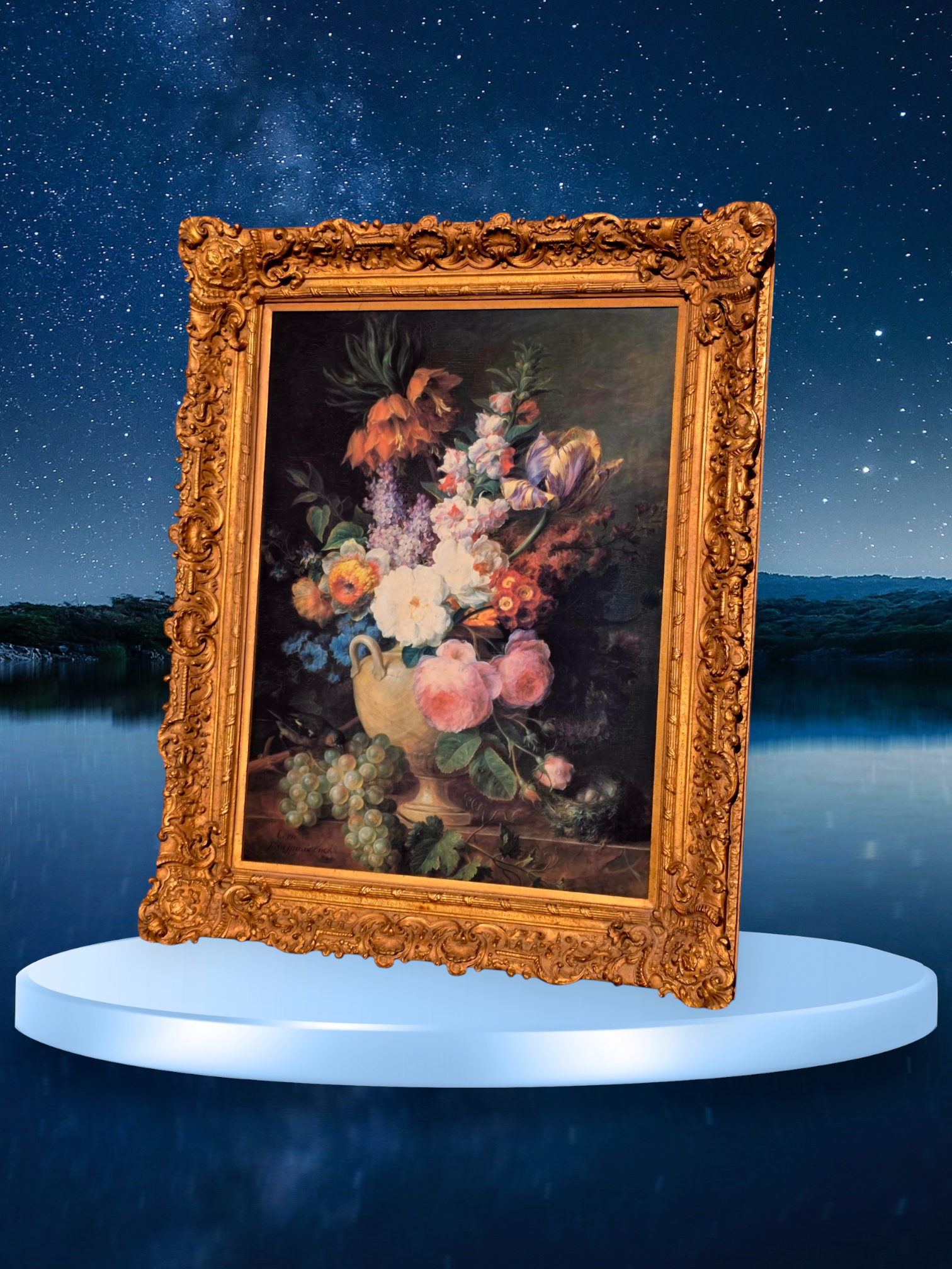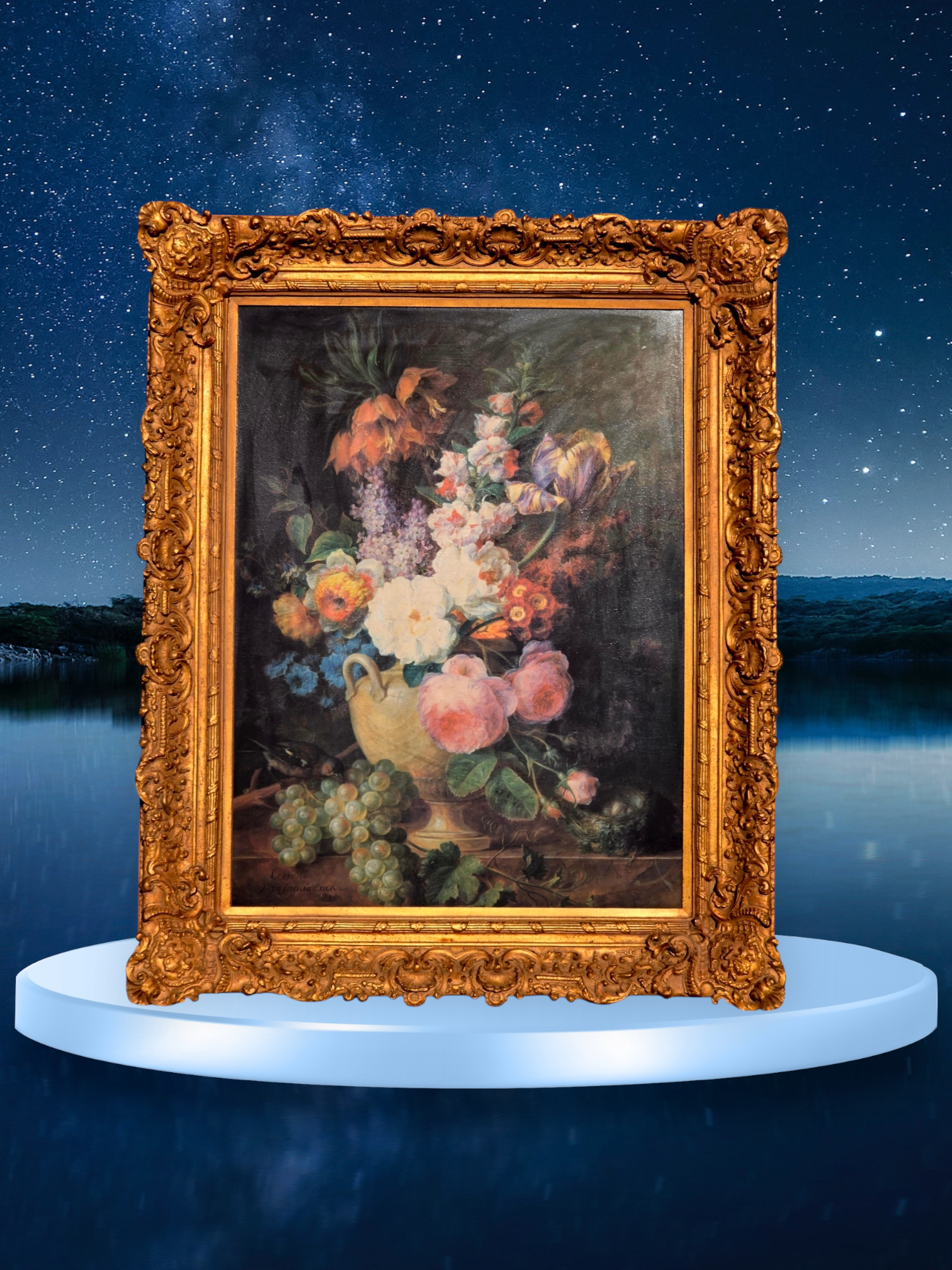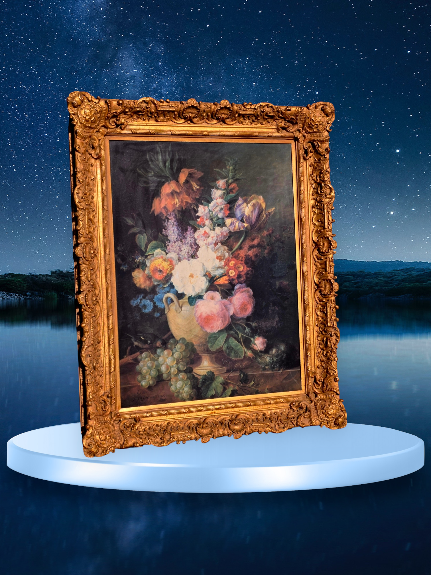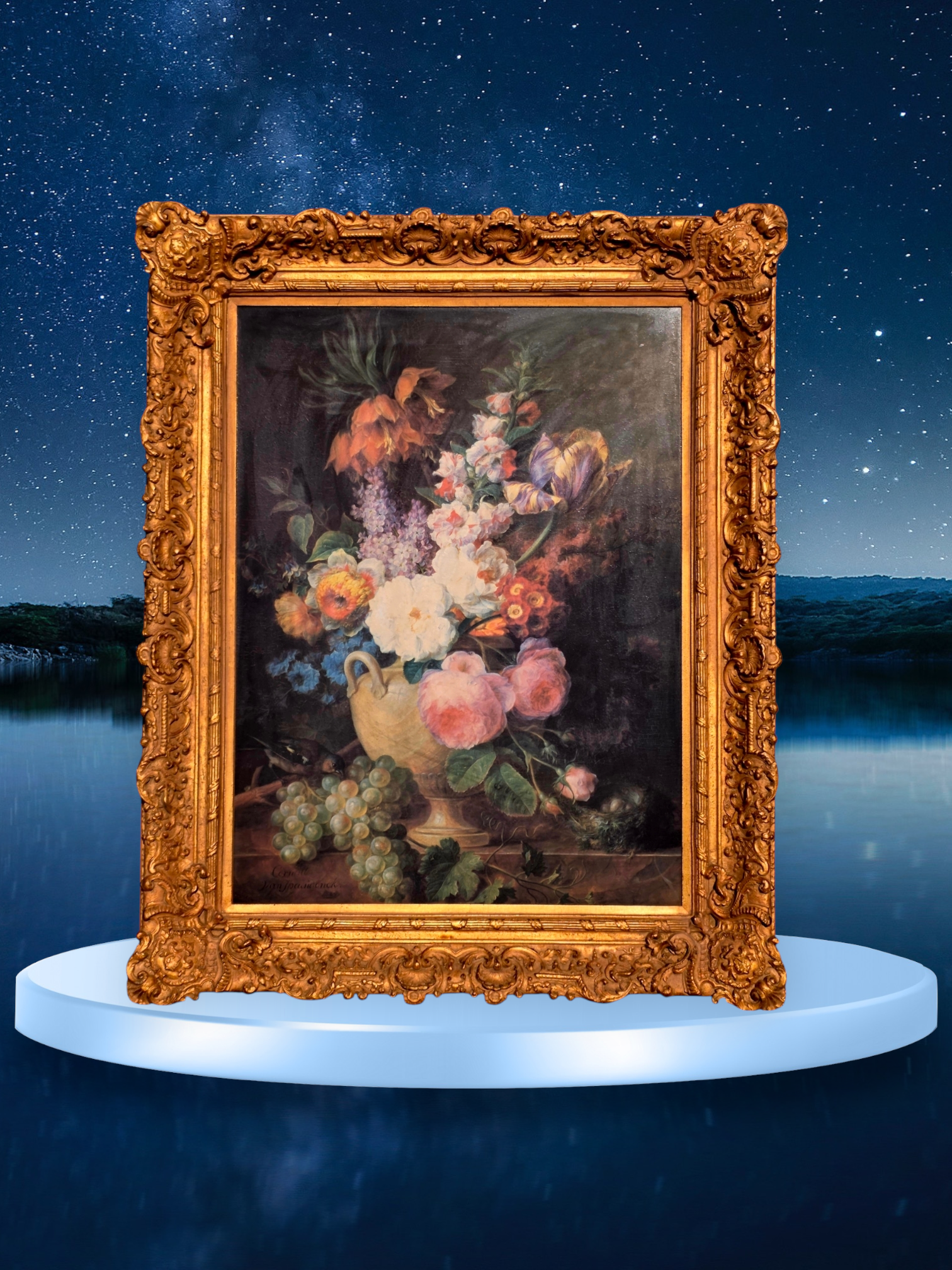 Rosarito Antiques presenta una pintura de gran formato que celebra la abundancia, la belleza y la maestría artística: un cuadro pintado a mano y firmado por el artista, donde cada flor parece respirar color y cada trazo revela intención.