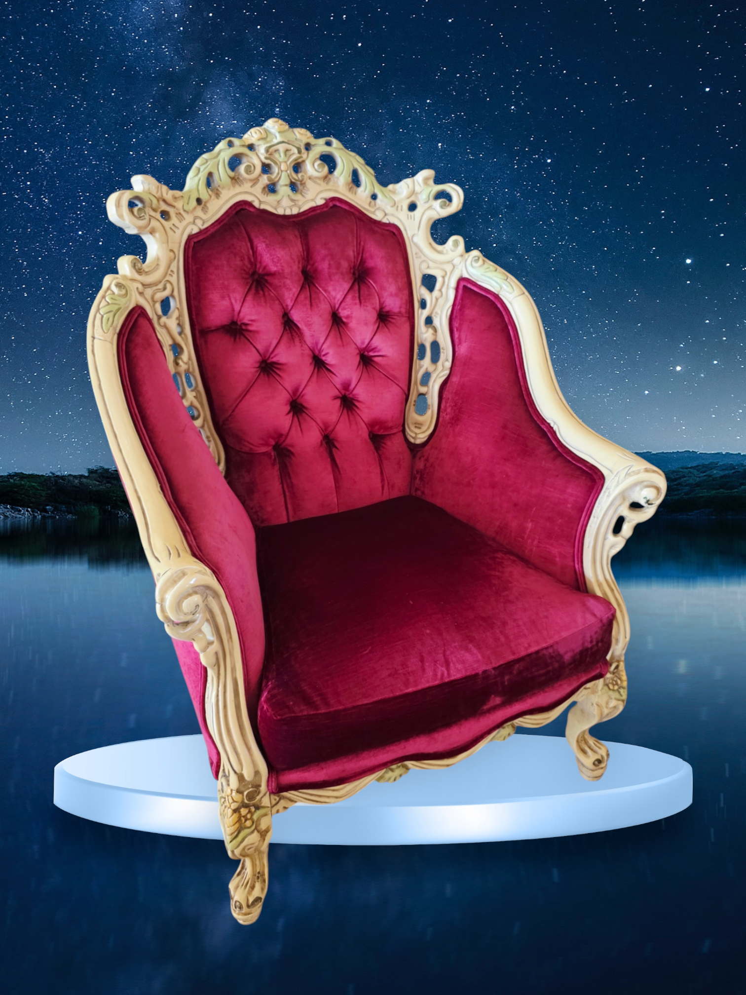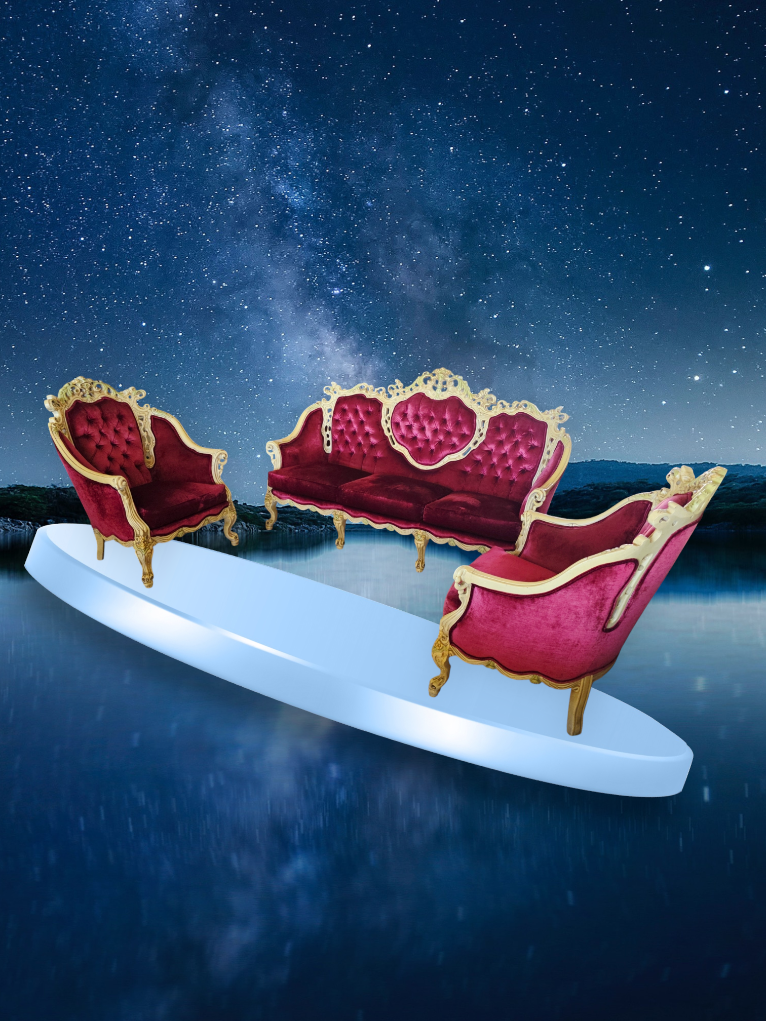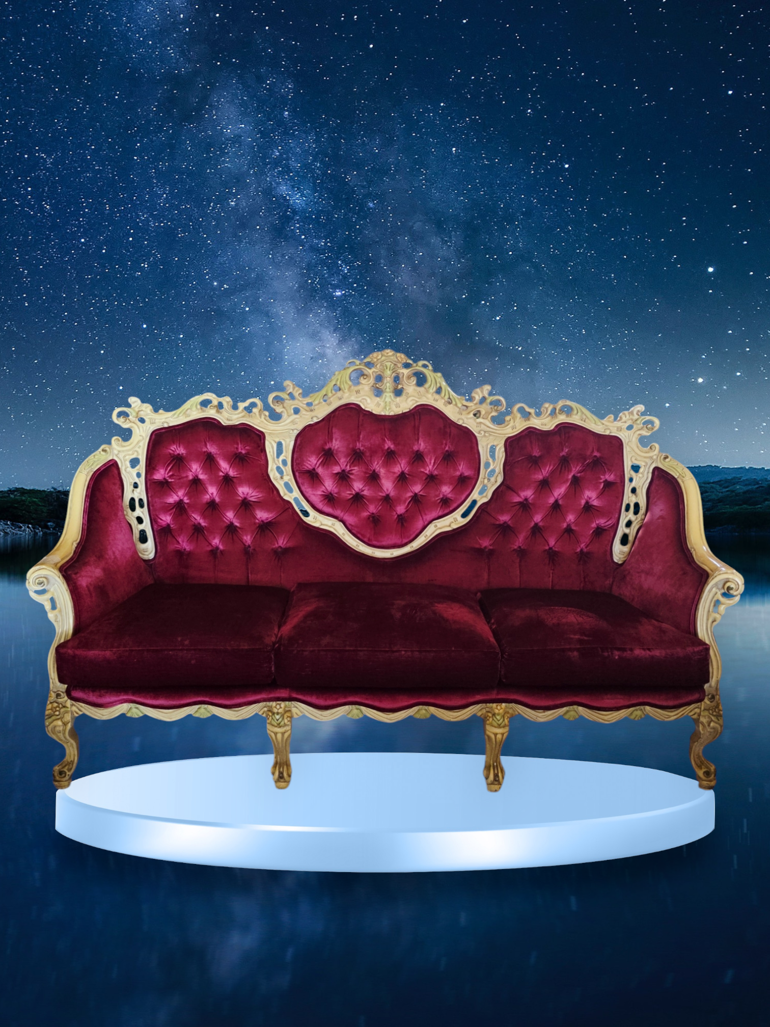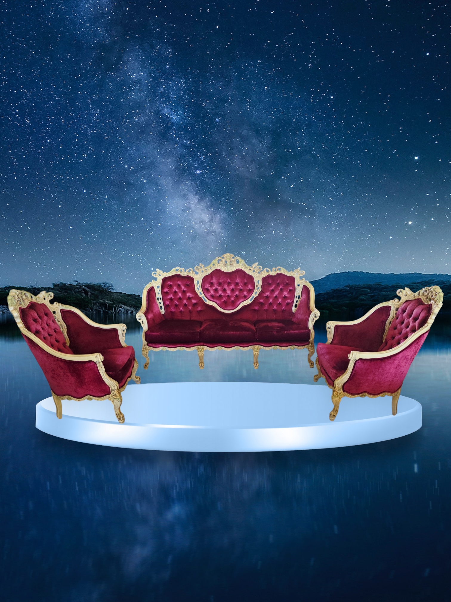 Esta imponente sala de estilo Luis XV está compuesta por un sofá de tres plazas y dos sillones individuales, todos tapizados en terciopelo color vino profundo —una elección textil que resalta por su riqueza visual y su suavidad al tacto.