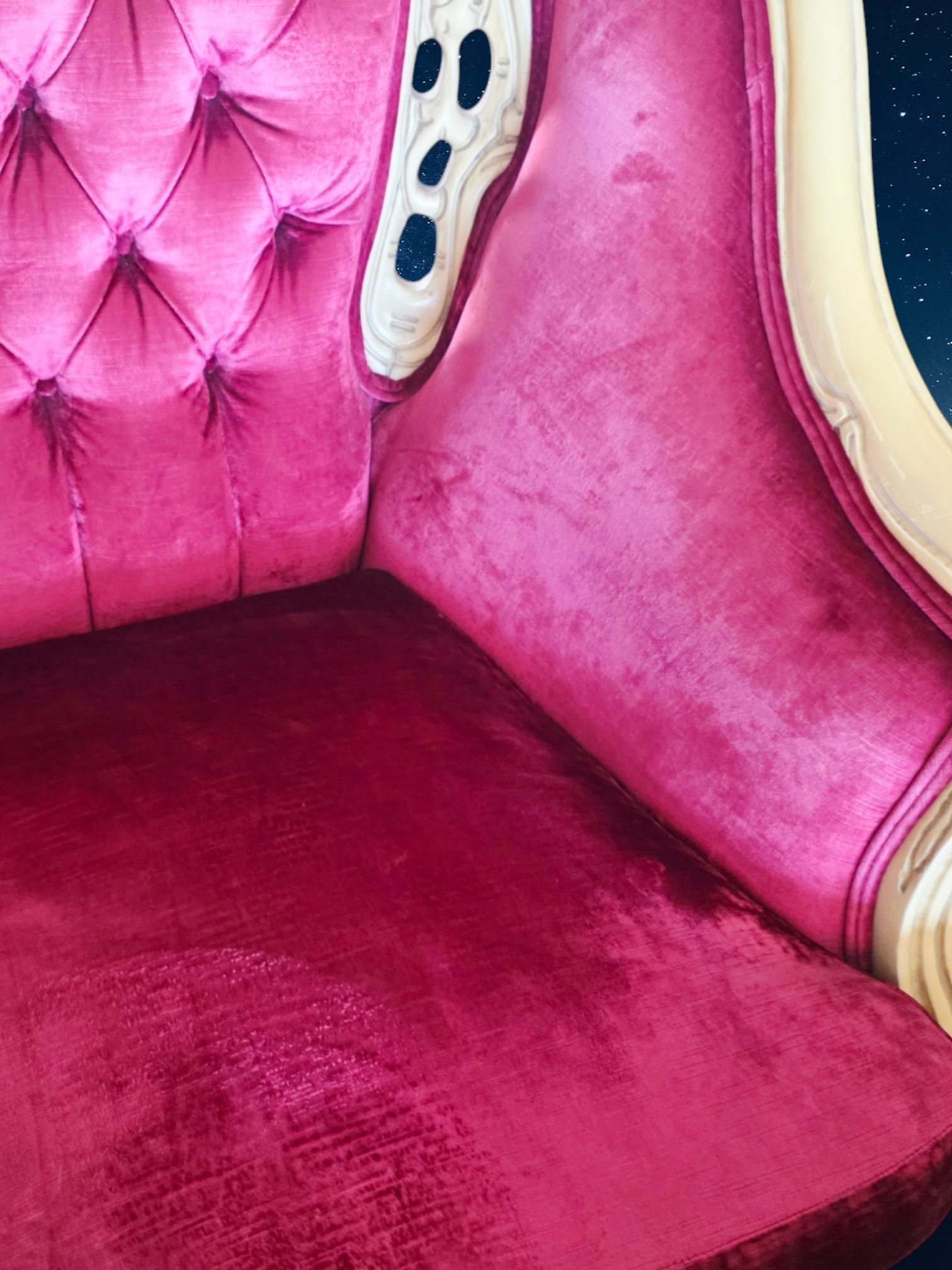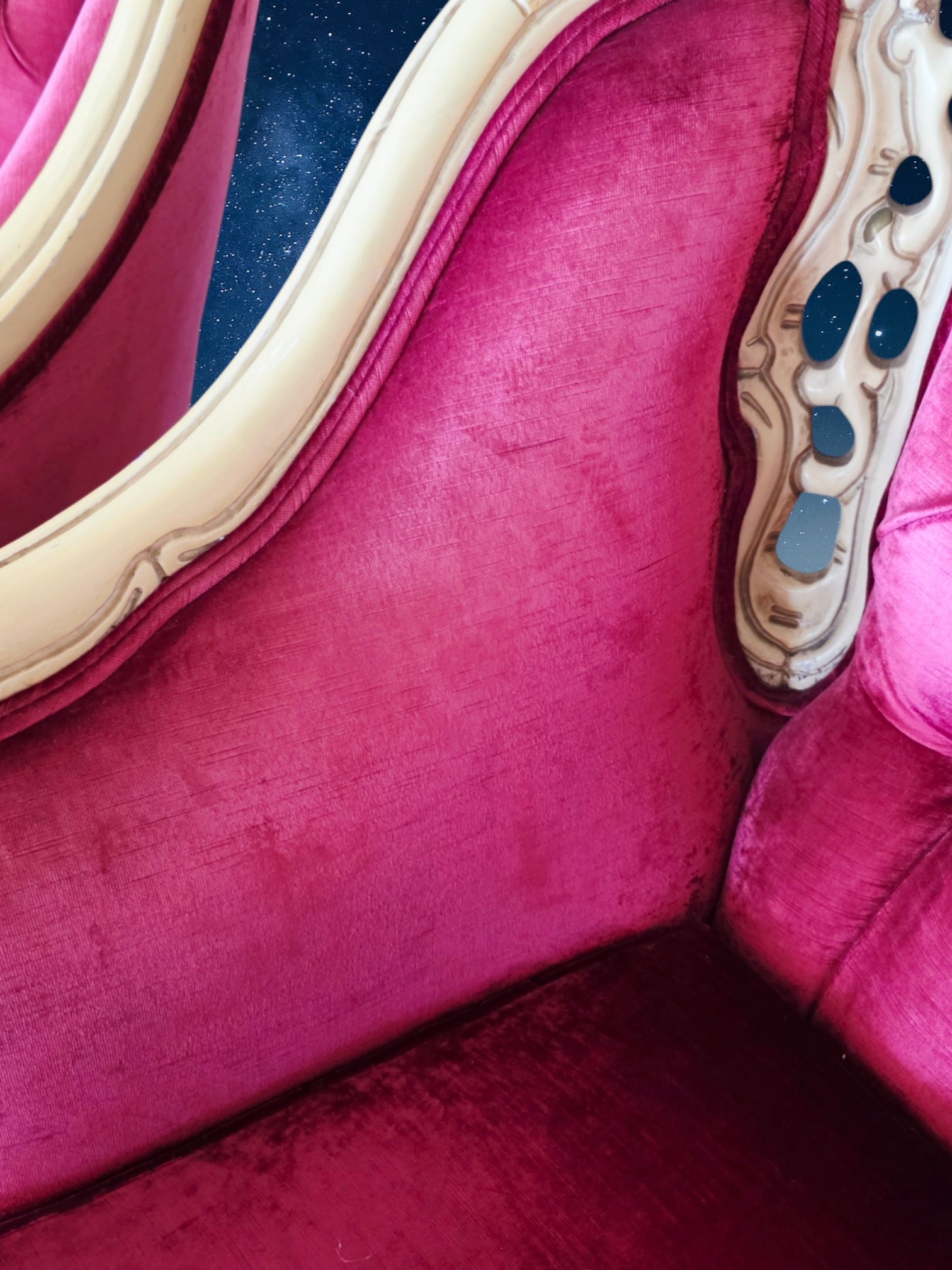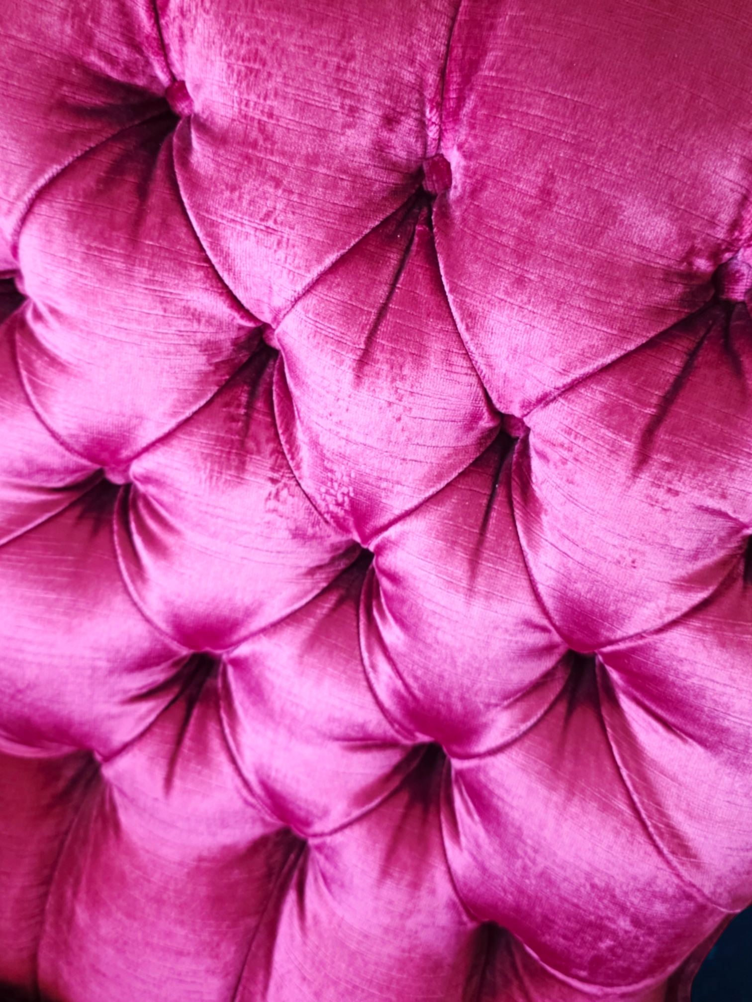 - Tapicería: Terciopelo de alto gramaje en tono vino borgoña, con lustre sedoso y textura envolvente.