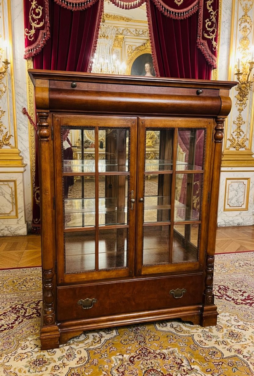 🌿 Una pieza majestuosa que resguarda la historia en su interior. Esta vitrina, con su acabado pulido y detalles tallados, evoca la nobleza de los salones antiguos y la elegancia de la artesanía clásica. Sus puertas de cristal permiten contemplar con claridad cada tesoro, mientras su cresta superior añade un aire ceremonial y distinguido.