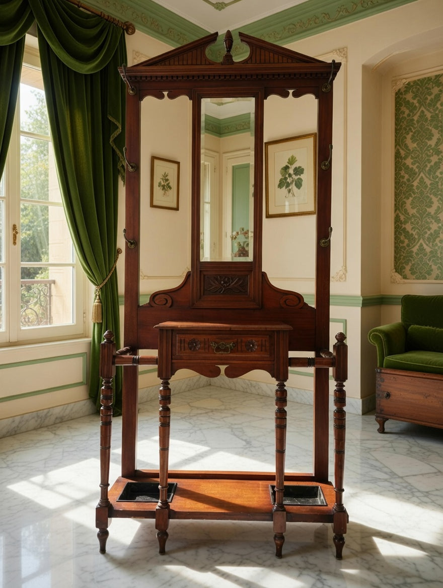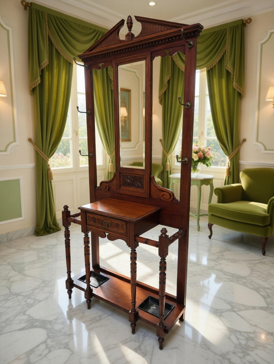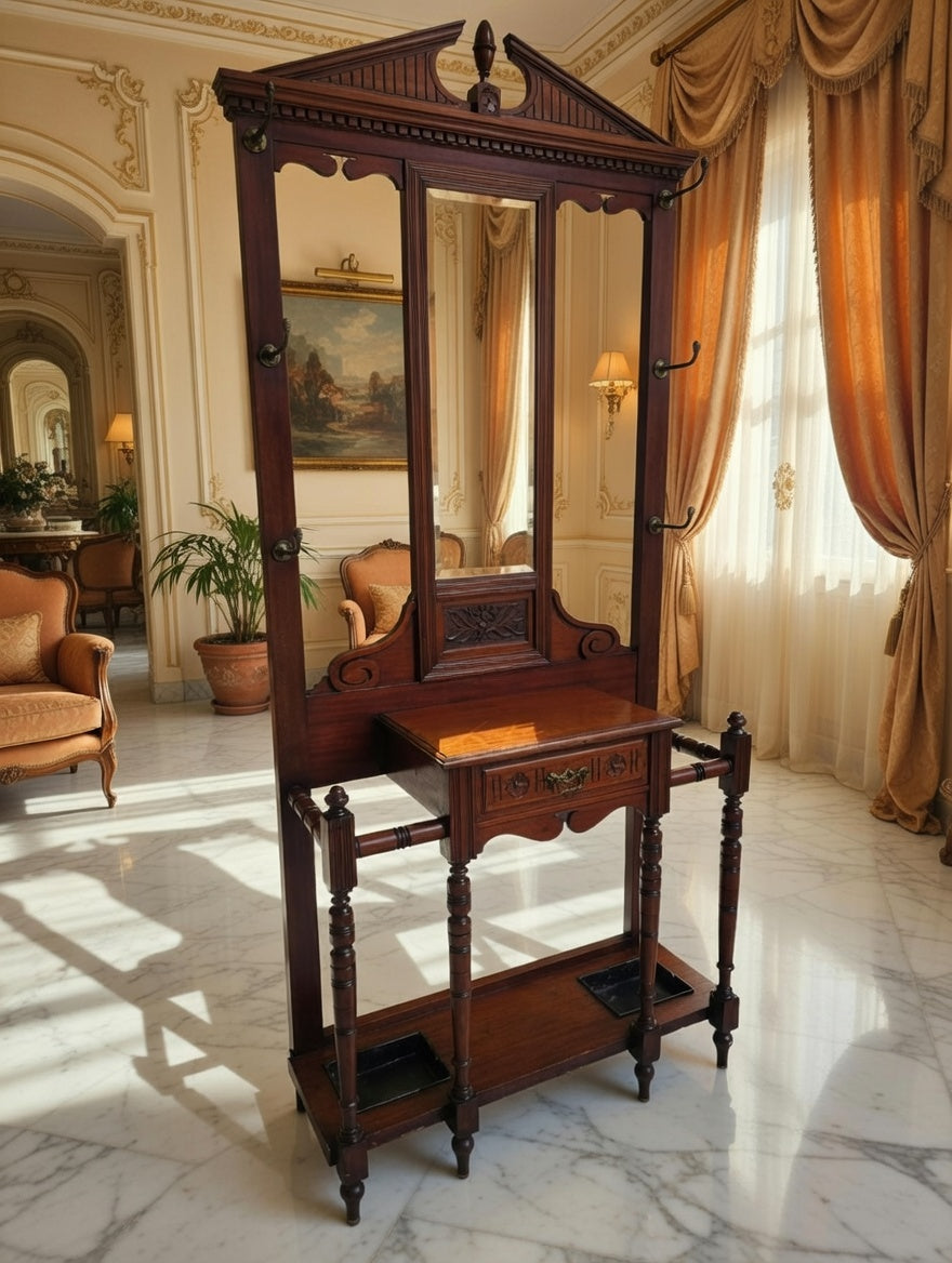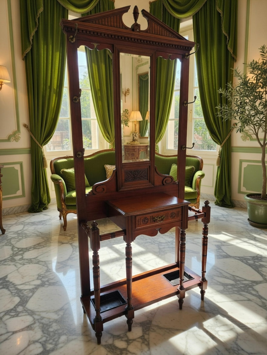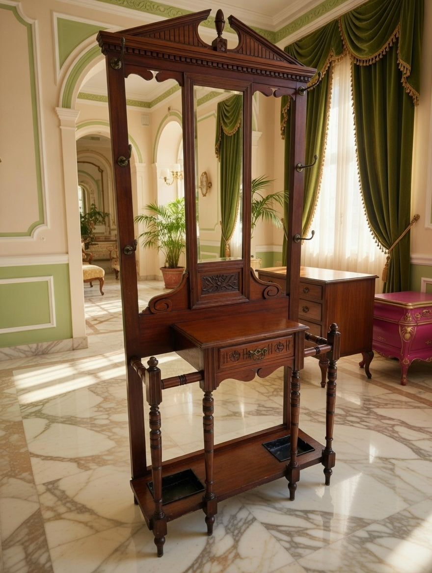 🌿 Una pieza imponente que recibe con distinción. Este perchero, tallado en madera noble y acompañado de espejo central, se convierte en el guardián de la entrada, ofreciendo funcionalidad y belleza en perfecta armonía. Sus detalles artesanales evocan la grandeza de los salones antiguos y la calidez de la tradición.